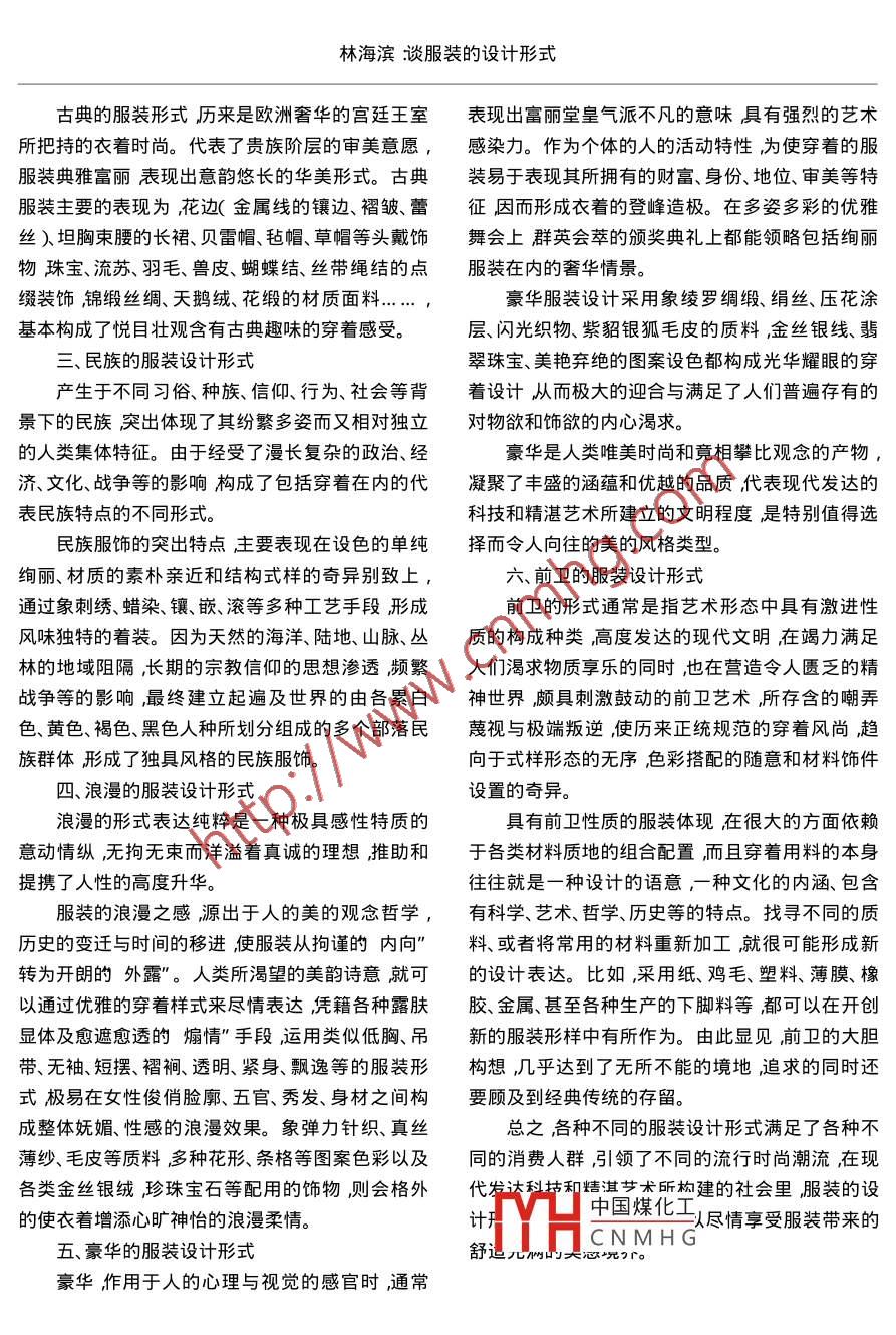 第3期總16期)河北能源職業(yè)技術(shù)學(xué)院學(xué)報(bào)No. 3( SumNo. 16)2005年9月Joumal of Hebei Energy Institute of V ocation and TechnologySep. 2005文章編號(hào):1671 - 3974( 2005 )03 - 0010 -02談服裝的設(shè)計(jì)形式林海濱.(唐山電大河北唐山063000 )摘要:從有關(guān)服裝設(shè)計(jì)主題的構(gòu)思中得到引深發(fā)展,在人類悠久的文化之旅中漸漸形成了傳統(tǒng)與現(xiàn)代、古典與浪漫、質(zhì)樸與華麗的服裝設(shè)計(jì)風(fēng)格,它給人類帶來(lái)豐富想象和生動(dòng)的感官,使服裝的式樣新穎多變緊隨流行時(shí)尚而充滿活力。關(guān)鍵詞:服裝設(shè)計(jì);服裝形式浪漫前衛(wèi)中圖分類號(hào):TS941.3文獻(xiàn)標(biāo)識(shí)碼ADiscussing the Style of Dress DesigningLIN Hai-binAbstract : Developing from the conception of relevant dress designing topics , in the trip of the humanlong culture , came into being gradually the traditional and modern , classic and romantic , simple andgorgeous dress designing style , it brings mankind plentiful imagination and the vivid feeling , making thestyle of the clothing much more novel , closing on the heels of the fashion and with plenty of vigour.Key words : dress designing ; dress style ; romance ; vanguard所謂形式就是物質(zhì)形態(tài)的自然與人為的表現(xiàn)條、色彩、質(zhì)料等因素來(lái)形成的。線條的剛?cè)?、直方?即形”是自然的",式”是人為的,在藝術(shù)的曲、長(zhǎng)短,色彩的素樸、秀麗、單純、華貴,面料質(zhì)感創(chuàng)作及其設(shè)計(jì)中形式的意義在于將-切自然的形的柔軟、細(xì)薄、粗厚,裝飾附件的奇麗別致...無(wú)不式轉(zhuǎn)化為具有獨(dú)特品位的審美物象,從而真正取悅潛 存著久遠(yuǎn)的宗教、文化和哲學(xué)的影響。將鐘形、于人的感官要求。用于服裝設(shè)計(jì)形式作為一種梯形X形、Y形及公主線形的樣式付渚于新的時(shí)“物化工具”常會(huì)營(yíng)造新的視覺(jué)表達(dá)使穿著的式尚之中。優(yōu)雅華貴、艷麗明快,質(zhì)樸凝重的設(shè)色。樣新穎多變,在服裝設(shè)計(jì)領(lǐng)域中,形成了傳統(tǒng)、古質(zhì)地不一的亞麻、棉布、絲綢、織錦等面料,以及皮典、民族、浪漫、豪華、前衛(wèi)、等不同的服裝形式。革繩帶、繡嵌補(bǔ)綴等手段運(yùn)用,匯集成富有傳統(tǒng)意一、傳統(tǒng)的服裝設(shè)計(jì)形式韻的新潮服裝款式。使設(shè)計(jì)不斷呈現(xiàn)生動(dòng)悅目耐傳統(tǒng)是穿越時(shí)空的精髓藝術(shù)歲月的流逝時(shí)人尋思的感覺(jué)。光的移動(dòng),筑成了其歷經(jīng)千年的經(jīng)典模式,作為歷二、古典的服裝設(shè)計(jì)形式史文化的一種延續(xù)傳統(tǒng)始終是在反復(fù)的超越中得古典藝術(shù)的優(yōu)雅精致,可以稱得上完美無(wú)缺的以繼承發(fā)揚(yáng)其表現(xiàn)形式的演化發(fā)展往往伴隨新形絕佳之造,是傳統(tǒng)文化中的精髓部分,極具人性的式的產(chǎn)生成為創(chuàng)造新的人文形態(tài)的有力依托。哲理和睿智的想象.通過(guò)對(duì)客觀世界的獨(dú)特理解中國(guó)煤化工服裝設(shè)計(jì)領(lǐng)域的傳統(tǒng)表達(dá),通常是具體的線引YHCNMHG收稿日期2005 -05 -30.作者簡(jiǎn)介林海濱( 1976- ) 男大學(xué)唐山電視大學(xué)教師。10.林海濱:談服裝的設(shè)計(jì)形式古典的服裝形式歷來(lái)是歐洲奢華的宮廷王室表現(xiàn)出富麗堂皇氣派不凡的意味具有強(qiáng)烈的藝術(shù)所把持的衣著時(shí)尚。代表了貴族階層的審美意愿,感染力。作為個(gè)體的人的活動(dòng)特性為使穿著的服服裝典雅富麗表現(xiàn)出意韻悠長(zhǎng)的華美形式。古典裝易于表現(xiàn)其所擁有的財(cái)富身份、地位、審美等特服裝主要的表現(xiàn)為花邊(金屬線的鑲邊、褶皺、蕾征,因而形成衣著的登峰造極。在多姿多彩的優(yōu)雅絲)坦胸束腰的長(zhǎng)裙、貝雷帽、氈帽、草帽等頭戴飾舞會(huì)上群英會(huì)萃的頒獎(jiǎng)典禮上都能領(lǐng)略包括絢麗物珠寶、流蘇、羽毛、獸皮、蝴蝶結(jié)、絲帶繩結(jié)的點(diǎn)服裝在內(nèi)的奢華情景。綴裝飾錦緞絲綢、天鵝絨、花緞的材質(zhì)面料.....,豪華服裝設(shè)計(jì)采用象綾羅綢緞、絹絲、壓花涂基本構(gòu)成了悅目壯觀含有古典趣味的穿著感受。層、閃光織物、紫貂銀狐毛皮的質(zhì)料,金絲銀線、翡三、民族的服裝設(shè)計(jì)形式翠珠寶、美艷棄絕的圖案設(shè)色都構(gòu)成光華耀眼的穿產(chǎn)生于不同習(xí)俗、種族、信仰、行為、社會(huì)等背著設(shè)計(jì),從而極大的迎合與滿足了人們普遍存有的景下的民族突出體現(xiàn)了其紛繁多姿而又相對(duì)獨(dú)立對(duì)物欲和飾欲的內(nèi)心渴求。的人類集體特征。由于經(jīng)受了漫長(zhǎng)復(fù)雜的政治、經(jīng)豪華是人類唯美時(shí)尚和竟相攀比觀念的產(chǎn)物,濟(jì)、文化、戰(zhàn)爭(zhēng)等的影響構(gòu)成了包括穿著在內(nèi)的代凝聚了豐盛的涵蘊(yùn)和優(yōu)越的品質(zhì)代表現(xiàn)代發(fā)達(dá)的表民族特點(diǎn)的不同形式。科技和精湛藝術(shù)所建立的文明程度是特別值得選民族服飾的突出特點(diǎn)主要表現(xiàn)在設(shè)色的單純擇而令人向往的美的風(fēng)格類型。絢麗、材質(zhì)的素樸親近和結(jié)構(gòu)式樣的奇異別致上,六、前衛(wèi)的服裝設(shè)計(jì