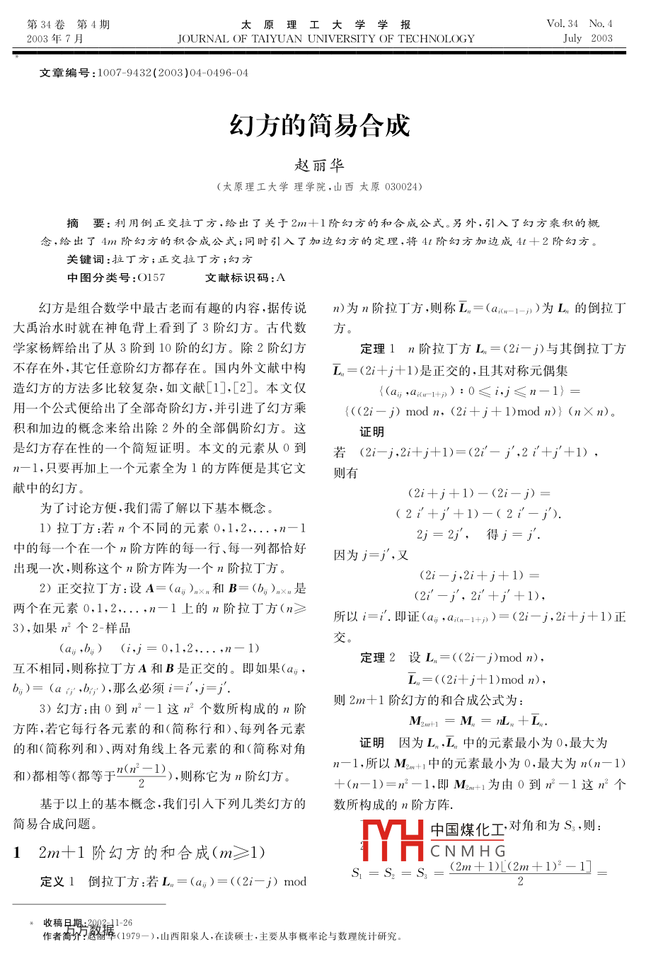 第34卷第4期太原理工大學(xué)學(xué)報(bào)Vol. 34 No. 42003年7月JOURNAL OF TAIYUAN UNIVERSITY OF TECHNOLOGYJuly 2003文章編號(hào): 1007-9432 ( 2003 )04- -0496 -04幻方的簡(jiǎn)易合成趙麗華.(太原理工大學(xué)理學(xué)院.山西太原030024)商要:利用倒正交拉丁方,給出了關(guān)于2m+1階幻方的和合成公式。另外,引入了幻方乘積的概念,給出了4m階幻方的積合成公式;同時(shí)引入了加邊幻方的定理,將4t階幻方加邊成41+2階幻方。關(guān)鍵詞:拉丁方;正交拉丁方;幻方中圖分類號(hào):O157文獻(xiàn)標(biāo)識(shí)碼:A幻方是組合數(shù)學(xué)中最古老而有趣的內(nèi)容,據(jù)傳說(shuō)n)為n階拉丁方,則稱L,=(axn- 1-,)為L(zhǎng),的倒拉丁大禹治水時(shí)就在神龜背上看到了3階幻方。古代數(shù)方。學(xué)家楊輝給出了從3階到10階的幻方。除2階幻方定理1 n階拉丁方 L.=(2i-j)與其倒拉丁方不存在外,其它任意階幻方都存在。國(guó)內(nèi)外文獻(xiàn)中構(gòu)L.=(2i+j+ 1)是正交的,且其對(duì)稱元偶集造幻方的方法多比較復(fù)雜,如文獻(xiàn)[1],[2]。本文僅.({a,wau-+) :0≤i,j≤n-1}=用一個(gè)公式便給出了全部奇階幻方,并引進(jìn)了幻方乘{(lán)((2i- j) mod n, (2i+j+ 1)mod n)} (nXn)。積和加邊的概念來(lái)給出除2外的全部偶階幻方。這證明是幻方存在性的一個(gè)簡(jiǎn)短證明。本文的元素從0到若(2i-j,2i+j+1)=(2i'- j',2i'+j'+1),n-1,只要再加上一個(gè)元素全為1的方陣便是其它文則有獻(xiàn)中的幻方。(2i+j+1)-(2i-j) =為了討論方便,我們需了解以下基本概念。(2i+j'+1)-( 2i-j').1)拉丁方:若n個(gè)不同的元素0,1,2.... ,n- 12j= 2j’, 得j= j'.中的每-一個(gè)在-一個(gè)n階方陣的每一-行、每一列都恰好因?yàn)閖=j',又出現(xiàn)一次,則稱這個(gè)n階方陣為一個(gè)n階拉丁方。(2i-j,2i+j+1) =2)正交拉丁方:設(shè)A=(a;)nxn和B=(b;)x.是(2i'-j', 2i'+j'+1),兩個(gè)在元素0,1.2.... ,n-1上的n階拉丁方(n≥所以i=i.即證(a,,ai(n- 1+;)=(2i-j,2i+j+1)正3),如果n個(gè)2-樣品.交。(a,b;) (i,j = 0,1,2....n- 1)定理2設(shè)L,=((2i- j)mod n),互不相同則稱拉丁方A和B是正交的。即如果(ay,L.=((2i+j+ 1)mod n),b,)= (ar;,b;;),那么必須i=i',j=j'.3)幻方:由0到n2-1這n2個(gè)數(shù)所構(gòu)成的n階則2m+1階幻方的和合成公式為:Mm+1= M, = nL, + L..方陣,若它每行各元素的和(簡(jiǎn)稱行和)、每列各元素的和(簡(jiǎn)稱列和)、兩對(duì)角線上各元素的和(簡(jiǎn)稱對(duì)角證明因?yàn)長(zhǎng),I, 中的元素最小為0,最大為和)都相等(都等于"(n,-共),則稱它為n階幻方。n- 1,所以Mm+1中的元素最小為0,最大為n(n-1)2+(n-1)=n2-1,即Mm+為由0到n-1這n2個(gè)基于以上的基本概念,我們引入下列幾類幻方的數(shù)所構(gòu)成的n階方陣. .簡(jiǎn)易合成問(wèn)題。中國(guó)煤化工對(duì)角和為Ss則: .1 2m+1階幻方的和合成(m≥1)YHCNM HGS=S2=Sg=:(2m土1D[(2m+1)°- 1]。定義1倒拉丁方:若L,=(a;)=(2i-j) mod收稿電期:20011-26作者簡(jiǎn)介?題附幸(1979- ),山西陽(yáng)泉人,在讀碩士,主要從事概率論與數(shù)理統(tǒng)計(jì)研究。第4期趙麗華:幻方的簡(jiǎn)易合成4972m(m+ 1)(2m+ 1).「135702468在nL,+L =(2m+ 1)L2m+1 +L2m+1中,s,=s,=(2m+1) (2m+ 1)[(2m+1)-1]+3572468135702(2m+ 1)[(2m+ 1)- 1]5. 7024681 36813570242m(m+ 1)(2m+ 1),70.24681358 135702 4 6S3=(2m+1)2i+>(3i+1).0. 24681357|9x9在L。及L中,主對(duì)角線和為:則(2i-i)= Zi=!n(n-1)M, =9Lg+Lg =i=121416172113151717次對(duì)角線和為:74133353643234354665253656761535462(2i+j+1)= (3i + 1)mod n.58781728486871838當(dāng)2m+1≠3t時(shí),3i+1=3j+1,則i=j.5070020406080103(2(3:+1)= 2i= n(0-1)4262731232526322234456542444557514當(dāng)2m+1=3t時(shí),263757771627476763←12(3i+1)= 2(3i+1)=92949698193959799x93●((3i+1)) =2 4m階幻方的積合成定理3設(shè)A=(a, ),xw(0≤i,r≤n-1)為一n階3t(3t- 1)_ n(n- 1)幻方,B= (b,)mxm(0≤j,s≤m-1)為一m階幻方,則所以幻方的乘積合成公式為:s3= (2m+ 1)●n(n-1) + n(n-1)_C=AXB= (Cm )wmXmn.其中cu=ar +nb,,k=i+ nj,t=r+ ns,0≤k,t≤mm2m●(m+1)●(2m+1).-1.綜上可知,M2m+1=M,=nL +L,且M2m+為- -證明下證C 為幻方,因?yàn)锳,B均為幻方,顯然幻方。C中元素的行和、列和及對(duì)角和均相等,下面僅需證C例1由定義 1及定理1,我們可構(gòu)造出L及中無(wú)相同元素。L.假使Cn=Cgr ,則有Lg = ((2i- j)mod 9) =ar十n°bj = ar+n2bys.-02.4681357又因a, ,a,r及b,,b;;為被n除所得余數(shù)與商,所以81.3570246須a,= arr,b,= bys.702468135又A,B為幻方,即i=i',r=r';j=j' ,s=s'.6 81357024故C為幻方。中國(guó)煤化工fYHCNMHG)5 10 157357.0246811114142.46813570|A=642=138725 07]x3135702468x963129]x4(2i+j+1) mod9)=498太原理工大學(xué)學(xué)報(bào)第34卷A+0J A+5.3*J A+10.3J A+15.3*J-例3下面給出4階幻方A加邊成6階幻方B.A+11.3J A+14.3J A+1.3J A+4.3J051015-:==A+13.3J A+8.3J A +7.32J A+2.3J14 1_A+6.3*J A+3.34J A+12.34J A+9.32J」 12x128‘2|r A A+45.J A+90J A + 135J-3129A+99J A+126J A+9J A + 14J033323181:A+117J A+72J A+63J A + 36.J51015202530_A+54J A+27J A+108J A + 729J_29212411146由定理3及例2可推知,C又可表示為28231817127C=AXB=91613221926A+ bonrJA +bu1rJA+ bo
