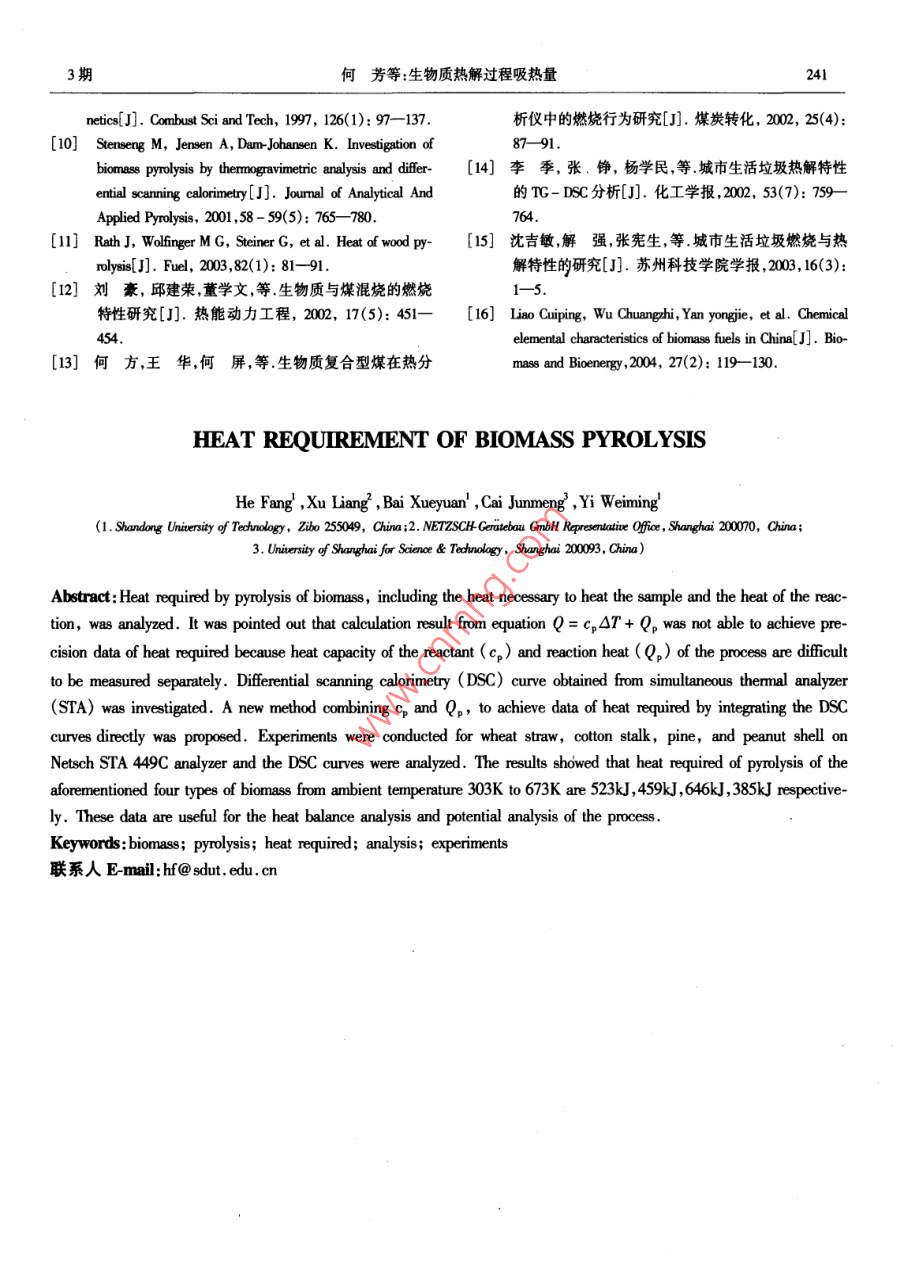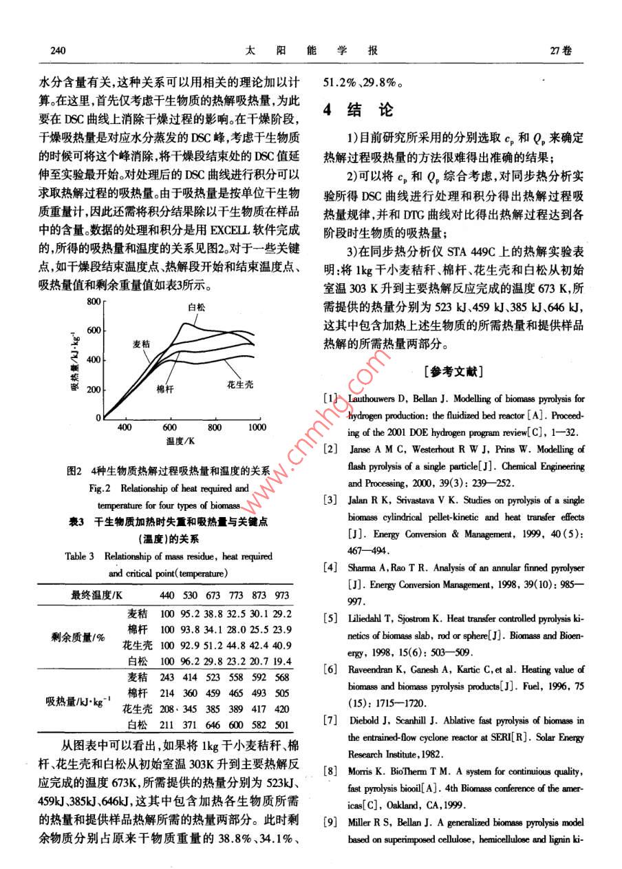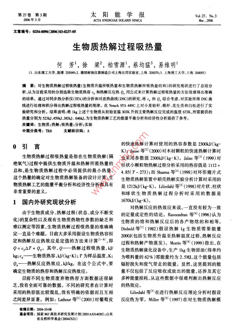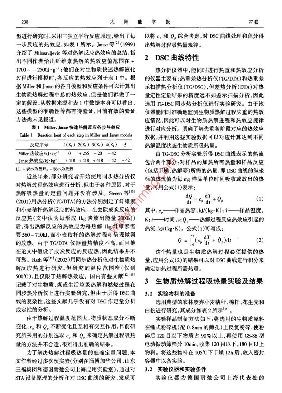第27卷第3期太陽能學(xué)報Vol 27, No. 32006年3月ACTA ENERGLAE SOLARIS SINICAMar,,2006文章編號:0540096(2006)030237-05生物質(zhì)熱解過程吸熱量何芳,徐梁2,柏雪源!,蔡均猛3,易維明(1.山東理工大學(xué)淄博255049;2.德國耐弛儀器制造公司上海應(yīng)用實驗室,上海20003.上海理工大學(xué),上海20003)摘要:對生物質(zhì)熱解過程吸熱量(生物質(zhì)升溫所吸熱量和生物質(zhì)熱解所吸熱量的和)的研究現(xiàn)狀進行了總結(jié)分析認為目前采用的分別選取生物質(zhì)熱容c和熱解反應(yīng)熱Q,用公式來計算熱解過程吸熱量的方法很難得出準確的結(jié)果。通過對同步熱分析儀(STA)的分析和對差熱曲線(DC)的研究將c和Q,綜合考慮對實驗所得DSC曲線進行處理和積分得出熱解過程吸熱量的規(guī)律。在 Netsch STA49C上對小麥秸稈、棉桿、花生殼和白松進行了實驗研究和分析。結(jié)果表明將1kg上述干生物質(zhì)從初始室溫30K升到主要熱解反應(yīng)完成的溫度673K所需提供的熱量分別為523k、459kJ385k、646kJ,為生物質(zhì)熱解工藝的能量平衡分析和經(jīng)濟性分析提供了參考關(guān)鍵詞:生物質(zhì);熱解;吸熱量;分析;實驗中圖分類號:TK文獻標(biāo)識碼:A0引言的快速熱解計算時使用的熱容參數(shù)是2300kJ/(kgK); Janse等2(200對木材顆粒的快速熱解計算時生物質(zhì)熱解過程吸熱量是指在生物質(zhì)熱解(隔也采用參數(shù)值2300J(kgK)。Jmn等(19)對絕氧氣)過程中提供生物質(zhì)升溫和熱解所需熱量的柱狀小顆粒物熱解過程分析采用的熱容值是1+總和,是生物質(zhì)熱解過程中必須提供的最小熱量。4.85(7-273);而Sham等1(198)對環(huán)形翅片式這個熱量的確定對生物質(zhì)熱解裝備的設(shè)計計算、生生物質(zhì)熱解裝置中稻殼熱解實驗分析計算時采用的物質(zhì)熱解工藝的能量平衡分析和經(jīng)濟性分析都具有是12(kgK),Liso等(199對片狀柱狀非常重要的意義和球狀生物質(zhì)熱解過程分析時采用的數(shù)據(jù)是1國內(nèi)外研究現(xiàn)狀分析1670kJ/(kg…K)對熱解反應(yīng)的熱效應(yīng)來說,一直沒有較為一致由于生物質(zhì)成分熱解過程(狀態(tài)、成分不斷變的定量或定性的結(jié)論。 Raveendran等(196)認為化)的復(fù)雜性以及現(xiàn)有生物質(zhì)熱物性參數(shù)的缺乏和生物質(zhì)的焓和熱解反應(yīng)后的各產(chǎn)物焓的和相等。難以測定等因素生物質(zhì)熱解過程吸熱量的準確確 Diebold等(1982)假設(shè)熱解1g生物質(zhì)需要能量定一直是個難題。目前大多采用假設(shè)生物質(zhì)熱容恒200包括生物質(zhì)升溫至熱解溫度過程熱解反應(yīng)定和熱解反應(yīng)熱效應(yīng)是定值的方法來計算”,即過程和熱解產(chǎn)物蒸發(fā))。Momi等”(99)指出,在Q=c2△7+Q。其中,Q—熱解過程吸熱量,kJ/生物質(zhì)熱解液化設(shè)備中,生產(chǎn)1kg生物原油(得率約kg;cp生物質(zhì)熱容kJ/(kgK);T為樣品溫度,K;為喂料量的62%)需能量約為2.5M,這個能量包括Q,—熱解反應(yīng)熱效應(yīng),k/kg。在這個公式中要輻射損失和廢氣帶走的能量。顯然,這里提到的能確定生物質(zhì)的熱容和熱解反應(yīng)熱效應(yīng)。量不僅包括了反應(yīng)吸收或放出的能量,還涉及其它目前不同生物質(zhì)廢棄物熱容方面數(shù)據(jù)還很缺多種能量損耗,從這些數(shù)據(jù)中很難判斷出熱解反應(yīng)乏,沒有全面可靠的數(shù)據(jù)。不同的研究者在計算時的熱效應(yīng)。采用的熱容值比較混亂,沒有明確的依據(jù)而且互相Liliedahl等在進行熱解反應(yīng)理論分析時假設(shè)之間差異顯著。例如: Latour等(2001)對葡萄皮反應(yīng)熱為零。 Miller等(197)在對生物質(zhì)熱解模收稿日期:2004-1008基金項目:國家863高技術(shù)研究發(fā)展計劃(200A514030);山東省自然科學(xué)基金(20042X21)238太陽能學(xué)報27卷型進行研究時,采用三獨立平行反應(yīng)原理給出了每以將cp和Q綜合考慮,對DsC曲線處理和積分得步反應(yīng)的熱效應(yīng),如表1所示。Jawe等(199)出熱解過程吸熱量規(guī)律。介紹了 Milosavljevic等對熱解反應(yīng)熱效應(yīng)的總結(jié),指出不同作者給出纖維素?zé)峤獾臒嵝?yīng)值范圍在+2DSC曲線特性1700-2500J·g;他們在對生物質(zhì)快速熱解液化熱分析儀器中,能同時進行熱重和熱效應(yīng)分析過程進行模擬時,各反應(yīng)的熱效應(yīng)列于表1中。根的儀器主要有:熱重差熱分析儀(TG/DTA)和熱重差據(jù)Mler和 Janse的各自模型和反應(yīng)條件可以計算出示掃描熱分析儀( TG/DSC),但差熱分析(DTA)對熱生物質(zhì)熱解過程中總的熱效應(yīng),但是他們都做了一量定性定量結(jié)果的精度遠不如差示掃描分析,因此定的假設(shè),從數(shù)據(jù)來源和表1中數(shù)據(jù)本身可以看出,選用 TG-DSC同步熱分析儀進行實驗研究。由于該這些模型的準確性等都有待驗證,目前有效的驗證儀器能同時準確地監(jiān)測生物質(zhì)熱解過程失重的熱效方法尚未見報道。應(yīng)情況,因此可以對生物質(zhì)熱解進程和熱效應(yīng)規(guī)律表1 Miller、 Janse快速熱解反應(yīng)各步熱效應(yīng)進行對應(yīng)分析。明確了解失重各階段對應(yīng)的熱效應(yīng)Table 1 Reaction heat of each step in Miller and Janse models數(shù)據(jù),并利用這些實驗數(shù)據(jù)可以對應(yīng)計算達到不同反應(yīng)序號1(K1)2(K2)3(K)4(K)5熱解溫度狀態(tài)生物質(zhì)所吸熱量M