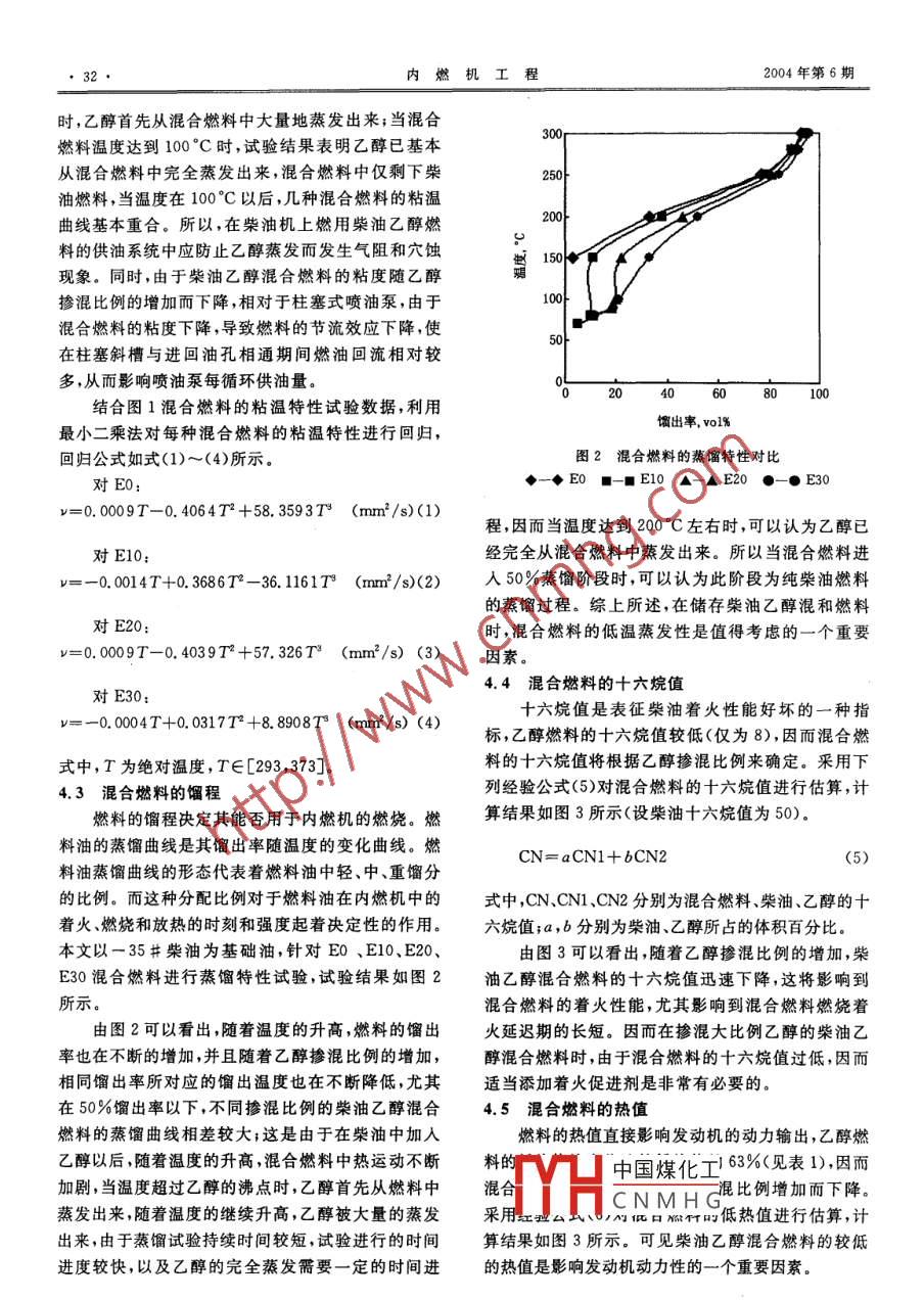 第25卷第6期內(nèi)燃機工程VoL 25 No 62004年12月Chinese Internal Combustion Engine EngineeringDec. 200文章編號:1000-0925(2004)06-030-04250112乙醇-柴油混合燃料的理化特性的研究于世濤,郭英男2,卓斌,劉金山2,楊林(1.上海交通大學汽車電子技術(shù)研究所,上海200030;2.吉林大學內(nèi)燃機研究所)Study on the Physical and Chemical Characteristics of Ethanol-Diesel Blend FuelsYU Shi-tao, GUO Ying-nan, ZHUO Bin', LIU Jin-shan, Yang Lin(1. The Institute of Automotive Electronic Technology, Shanghai Jiaotong University, Shanghai 200030, China;2. The Institute of Internal Combustion Engine, Jilin University)Abstract: In order to help the study of using the ethanol-diesel blend fuel on a diesel engine, the mainphysical and chemical characteristics of ethanol-diesel blend fuel lueve investigated in this paper. The lowheating value, cetane number of the blends with different ethanol fractions are calculated by using the experiential formula, Experiments of distillation and viscosity were done to study the distillation characteristics andviscosity characteristics of different ethanol-diesel blend fuels (E0, E10, E20, E30), and several experientialformulas are formulated based on the results of viscosity experiment: The solubility experiment is done tostudy the solubility of different ethanol-diesel blends(EO-E100), besides, the effects of solvent on the solubility curve of different ethanol-diesel blends are also studied. The studies show that the low heat value, cetane number, viscosity of the blends decrease with the increasing content of ethanol in the blends; The distil-lation characteristics of the blends is very high in the low range of temperature; Solvent can better the solu-bility of ethanol-diesel blend fuels.摘要:為了有助于開展乙醇柴油混合燃料在發(fā)動機上的應用研究,本文開展了不同乙醇摻混比例柴油乙醇混合燃料的主要理化特性的研究。采用數(shù)值計算的方法研究了不同乙醇摻混比例對混合燃料的低熱值、十六烷值的影響;開展燃料的蒸餾特性試驗、粘溫特性試驗,研究了不同乙醇摻混比例(E0,E10,E20,E30)對混合燃料的蒸餾特性、粘溫特性的影響,并對混合燃料的粘溫特性試驗結(jié)果進行數(shù)值回歸;釆用相溶特性試驗研究了不冋乙醇摻混比例的混合燃料(E0-E100的相溶特性,以及助溶劑對混合燃料相溶特性曲線的影響。研究結(jié)果表明:隨著乙醇摻混比例的增加,混合燃料的低熱值、十六烷值、粘度逐漸降低,混合燃料的低溫蒸餾特性較強,助溶劑可有效解決乙醇柴油的相溶問題。關鍵詞:內(nèi)燃機;柴油乙醇混合燃料;粘度;蒸餾特性;助溶劑Key Words: I C Engine; Ethanol-Diesel Blend Fuel; Viscosity; DistillationCharacteristic; Solvent中圖分類號:TK407.9文獻標識碼:A1概述普遍關注的問題。乙醇作為一種可再生含氧生物燃料,被認為是一種比較有前景的代用燃料。隨著汽車保有量的增加,石油短缺及排放污染問題日益突出,尋求清潔的石油替代燃料成為人們yhA中國煤化工、巴西和歐共體等國一汽油(E7.7,E10CNMHG收稿日期:200402-20作者簡介:于世濤(1977-),男,博士生,主要研究方向為內(nèi)燃機代用燃料與排放,Ema: seawave@ sjtu. edu,cn2004年第6期20)多年,然而乙醇在柴油機上的應用技術(shù)還不成3試驗裝量和方法熟,這主要是由于乙醇與柴油之間存在較大理化性質(zhì)的差異。本文針對與發(fā)動機應用相關的柴油乙醇采用GB265型石油產(chǎn)品運動粘度測定儀,按照混合燃料理化特性進行的研究結(jié)果表明:隨著乙醇GB/T265試驗方法進行混合燃料粘溫特性試驗;遵摻混比例的增加,混合燃料的十六烷值、熱值、粘度循GB/T6536試驗方法在蒸餾儀上進行混合燃料蒸逐漸降低;混合燃料的低溫蒸餾特性較強;助溶劑可餾特性試驗;采用水浴、冰柜化學試驗臺進行混合燃有效解決乙醇柴油的相溶問題。料的相溶特性試驗。2醇類燃料的物化特性4混合燃料的理化性質(zhì)醇類是烴基(一R)與羥基(-OH組成的化合4.1冷濾點物,從本質(zhì)上決定了醇類可成為替代石油系燃料的冷濾點是評價燃料油低溫性能的指標。對于柴內(nèi)燃機燃料,而羥基的存在又決定了它有很多不同油乙醇混合燃料,由于乙醇的凝點為-114°C,因而于石油系燃料的特性。燃料在內(nèi)燃機燃燒做功過程混合燃料的冷濾點不會因乙醇的摻人而下降,反而是一個復雜的物理化學變化過程,燃料的著火燃燒還會保持較好的低溫使用性能。特性取決于其揮發(fā)性、沸點、汽化熱、閃點、著火溫4.2混合燃料的粘度度、辛烷值、十六烷值、粘度等一系列物理化學特在柴油機中,燃油在供油系統(tǒng)中起著潤滑和防性漏作用,燃油的粘度是發(fā)動機燃料一個重要的評價指標,燃料的粘溫曲線(粘度隨溫度變化關系)是燃表1幾種燃料的主要理化特性比較料、特別是代用燃料重要的品質(zhì)特性??紤]到發(fā)性質(zhì)汽油柴油動機燃油系統(tǒng)工作溫度范圍,本文以一35#柴油為化學式Cle-23C3HsOH基礎油,在20~100°C的溫度范圍內(nèi),對E0、E10、分子量95~120180~20046E20、E30(符號E后面的數(shù)字表示乙醇在混合燃料含氧量,%0.434.8中的體積百分比)混合燃料進行粘溫特性試驗,試驗比重07~0.780.82~0.880.79結(jié)果如圖1所示。理論空燃比kg/kg14.2~15.114.49.0沸點,C0~200175~36078.5凝點,C114粘度(20C),mPas0.42低熱值,M/kg43.542.526.77汽化潛熱,kJ/k冒L辛烷值RON84~94111十六烷值0~1040~55著火極限,vol%1.4~7.61.58~8.24.3~19自燃溫度,C220~260200~220420閃點,"C20406080100120t,°C表1列出了乙醇燃料與柴油、汽油的理化特性,可以看