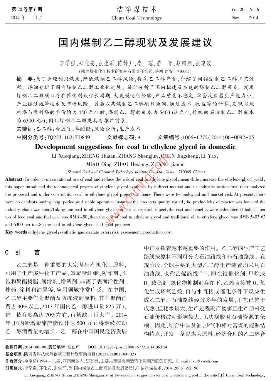 第20卷第6期潔凈煤技術(shù)Vol 20 No 62014年11月Clean Coal Technology國內(nèi)煤制乙二醇現(xiàn)狀及發(fā)展建議李學(xué)強,鄭化安,張生軍,陳靜升,李瑤,苗青,趙鶴翔,張建波(陜西煤業(yè)化工技術(shù)研究院有限責(zé)任公司.陜西西安710065)摘要:為了合理利用煤炭,降低煤制♂二醇風(fēng)險,提高♂二醇產(chǎn)量,介紹了間接法制♂二醇工藝流程。詳細(xì)分析了國內(nèi)煤制♂二醇工業(yè)化進(jìn)展。統(tǒng)計分析了國內(nèi)擬建及在建的煤制♂二醇項目。發(fā)現(xiàn)」煤制廴二醇項目存在催化劑缺少長周期、大規(guī)模運行經(jīng)驗,產(chǎn)品質(zhì)量不穩(wěn)定,單套反應(yīng)器生產(chǎn)能力小產(chǎn)業(yè)鏈過短等技術(shù)及市場風(fēng)險。最后以某煤制乙二醇項目為例,通過成本、收益等的計算,發(fā)現(xiàn)當(dāng)原料煤與燃料煤的單價均為450元/時,煤制乙二醇的成本為5403.62元',傳統(tǒng)的石油制乙二醇成本為6300元/t,因此煤制乙二醇更具有推廣前景關(guān)鍵詞:乙二醇;合成氣;草酸酯;風(fēng)險分析;生產(chǎn)成本中圖分類號:TQ223.162;TD849文獻(xiàn)標(biāo)志碼:A文章編號:1006-672(2014)06-0092-05Development suggestions for coal to ethylene glycol in domesticLI Xueqiang, ZHENG Huaan, ZHANG Shengjun, CHEN Jingsheng, LI YaoMIAo Qing, ZHAO Hexiang, ZHANG JianbShaanxi Coal and Chemical Technology Institute Co., Ltd, Xi'an 710065, China)Abstract: In order to make rational use of coal and reduce the risk of coal to ethylene glycol, meanwhile, increase the ethylene glycol yieldthis paper introduced the technological process of ethylene glycol synthesis by indirect method and its industrialization first, then analyzedthe proposed and under construction coal to ethylene glycol projects at home. There were technological and market risk. At present, therewere no catalysts having long-period and stable operation instance, the products quality varied, the productivity of reactor was low and theindustry chain was short. Taking one coal to ethylene glycol project as research object, the cost and benefits were calculated. If both of peton of feed coal and fuel coal was RMB 450, then the cost of coal to ethylene glycol and traditional oil to ethylene glycol was RMB 5403. 62and 6300 per ton. So the coal to ethylene glycol had good prospectKey words: ethylene glycol; synthetic gas; oxalate ester; risk assessment; production cost0引言中正發(fā)揮著越來越重要的作用。乙二醇的生產(chǎn)工藝路線按原料不同可分為石油路線和非石油路線。在乙二醇是一種重要的大宗基礎(chǔ)有機化工原料,現(xiàn)階段,全球主要的大型乙二醇生產(chǎn)裝置均采用石可用于生產(chǎn)多種化工產(chǎn)品,如聚酯纖維、防凍劑、不油路線,也稱乙烯路線23,即在銀催化劑、甲烷或飽和聚酯樹脂、潤滑劑、增塑劑、非離子表面活性劑、H致穩(wěn)劑、氯化物抑制劑存在下,乙烯直接被O,氧炸藥、涂料和油墨等,應(yīng)用領(lǐng)域非常廣泛。在中國化生成環(huán)氧乙烷,再與水直接或催化條件下反應(yīng)生乙二醇主要作為聚酯及防凍液的原料,其中聚酯消成乙二醇。石油路線經(jīng)過多年的發(fā)展,工藝已趨于費占90%以上,2013年國內(nèi)乙二醇進(jìn)口量825萬t成熟,但耗水量大,生產(chǎn)過程副產(chǎn)物多且生產(chǎn)原料受進(jìn)口依存度高達(dá)70%左右,市場缺口巨大。2014石油價格波動影響較大,無法擺脫對石油資源的依年,國內(nèi)新增聚酯產(chǎn)能預(yù)計達(dá)500萬t,將繼續(xù)拉動賴。因此,結(jié)合中國貧油、少氣和相對富煤的能源結(jié)乙二醇消費量的增長。乙二醇在中國國民經(jīng)濟發(fā)展構(gòu)特點,開發(fā)一條以煤為原料、經(jīng)濟合理的乙二醇合收稿日期:2014-06-06;責(zé)任編輯:宮在芹DOn:10.13226/jisn.1006-6702.2014.06024基金項目:陜西省科技統(tǒng)籌創(chuàng)新工程計劃資助項目(2013KTZB01-04-02)作者簡介:李學(xué)強(1984-),男,河南新鄉(xiāng)人,研發(fā)員,主要從事煤炭清潔轉(zhuǎn)化利用方面的研究。E-mail:linq@sxcctl.com引用格式:李學(xué)強,鄭化安,張生軍,等國內(nèi)煤制乙二醇現(xiàn)狀及發(fā)展建議[J]潔凈煤技術(shù),2014,20(6):92-96LI Xueqiang, ZHENG Huaan, ZHANG Shengjun, et al. Development suggestions for coal to ethylene glycol in domestic[ J ] Clean Coal Technology李學(xué)強等:國內(nèi)煤制乙二醇現(xiàn)狀及發(fā)展建議2014年第6期成工藝路線,符合中國的可持續(xù)發(fā)展戰(zhàn)略。目前,國(乙)醇,催化劑由早期的銅鉻系發(fā)展為現(xiàn)在的銅硅內(nèi)掀起了開發(fā)煤基乙二醇的熱潮,煤制乙二醇技術(shù)系。產(chǎn)物由循環(huán)水冷卻后經(jīng)過多塔精餾得到聚酯級已經(jīng)成為煤化工行業(yè)關(guān)注的焦點。筆者旨在對國內(nèi)乙二醇,尾氣經(jīng)回收有用組分后送人加熱爐或鍋爐煤制乙二醇技術(shù)的工藝路線、工業(yè)化進(jìn)展、技術(shù)風(fēng)險燃燒。甲(乙)醇循環(huán)至亞硝酸酯制備段與羰基化以及經(jīng)濟成本等進(jìn)行總結(jié),以期對煤制乙二醇技術(shù)反應(yīng)段釋放出的NO在O2的作用下生成亞硝酸甲的開發(fā)與投資提供參考。(乙)酯,重新得到草酸酯反應(yīng)的原料,因此該路線煤制乙二醇技術(shù)理論上并不消耗NO和甲(乙)醇。1.2國內(nèi)煤制乙二醇工業(yè)化進(jìn)展煤制乙二醇技術(shù)即以煤為原料經(jīng)過一系列反應(yīng)20世紀(jì)70年代末期,國內(nèi)一批科研機構(gòu)開始得到乙二醇的過程。
