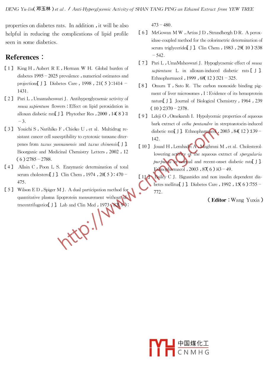 Journal of Beijing Institute of Technology 2005, Vol. 14, No. 3Anti-Hyperglycemic Activity of Shan Tang Ping anEthanol extract from yew tree in diabetic ratsDENG YU-lid(鄧玉林), SHENG Ling-huk盛靈慧), DAI Rongⅸ戴榮繼),XU Xiao-yu(徐曉玉)School of Life Science and Technology Beijing Institute of Technology Beijing 100081, ChinaAbstract: The extracts of yew tree have showed unique anti-tumor and anti-leakematic activities. Taxol ex-tracted from it is effective against a variety of cancers such as ovarian cancer and breast cancer. However thehypoglycemic efficacy of the extract has not been reported yet so the effects of oral administration of yew treextracts on streptozotocin- induced diabetic rats were examined. Administration of shan tang ping( StP),afraction from the column separation of extract(450 mg/kg body weight), for 14 days reduced the serum glucose concentrations of fasted diabetic rats by 52. 4%. In addition, it also decreased the concentrations ofglyceride(Tg), total cholesterol( TC), and low density lipoprotein cholesterol LDL-C ). An oral glucosetolerance test(OGTT)was performed a significant improvement in glucose tolerance was observed in ratstreated with STP. These results suggest that STP has hypoglycemic properties and hypolipidemic action onstreptozotocin-induced diabetic ratsKey words: Jew tree streptozotocin hypoglycemic diabetes mellitusCLC number: R 965 Document code: A Article ID: 1004-057 2005 03-0323-05Diabetes mellitus is a multifactorial disease char- have shown unique anti-tumor and anti-leakematic ac-acterized by hyperglycemia and lipirotein abnormali- tivitieoweverthere is no report available in theties. According to WHo projections the prevalence literature for the anti-diabetic effect of jew tree exof diabetes is likely to increase by 35%,so it will tract. The present study is undertaken to investigatehave been to reach 300 million or more by the year the effect of shan tang ping StP ), an extract of20251. Although there are many drugs managing ew tree, on changes in serum glucose, serum lipiddiabetes they are either expensive( like insulin thia- profile oral glucose tolerance of strepozotocin-inducedzolidinediones )or having adverse effects like sulfonylureas ) Plant drugs are frequently considered toI Materials and methodsbe less toxic and side effects than synthetic ones. Insome countries many traditional practice medicinalThe leaves of vewe tree were obtained from Anplants are used to control diabetes mellitus]hui province in November 2002. The botanical idenAmong the natural plants, jew tree( taxaceae) tity was confirmed by Dr Deng Yu-lin. a dried specihas been used as a cure for cough rheumatism and men was stored in the Lab of Life science and Techintestines verminosis in the ancient times in China. In nology. Streptozotocin( stz) was obstained fromCompany Inc., St Louis, MOChen"and Ben Cao gang, etc. yew tree wasrecorded as a novel medical plant. The extracts of it frorH中國(guó)煤化tic kits were purchasedCNMHGroject High-TechnologyReceived 2004-03-22Sponsored by the National Natural Science Foundation( 20275005 30170336)BiographyDENGYu-linf1962-)professordoctoraladviserdeng(@bit.edu.cnJournal of Beijing Institute of Technology 2005, Vol. 14, No. 3Company Beijing China ) All other chemicals used group 3: diabetic rats STP 400 mg/kgfor this experiment were of analytical gradegroup 4: diabetic rats drug A 400 mg/kg i1.1 Preparation of Plant Extractsgroup 5: diabetic rats drug b 400 mg/kgThe air-dried leaves of yew tree were ground togroup 6: diabetic rats metformin 80 mg/kgAnimals were administeredThe homogenate was extracted with 95% glucose concentration was determined 2 h after theethanol. The solution was concentrated to dryness treatment on the lst 3rd and 5th day. The depenunder reduced pressure at 70 C yielding dark-brown dence of the anti-hyperglycemic effect on Stp dosageextracts, which is used as drug A. Subsequently the was further investigated. Diabetic rats were treatedextracts were subject to stepwise procedures for con- with different dosage of StP, and the treatment lastcentrating the active components. The crude extracts ed for 14 days. The effect of stp on glucose homewere defatted with petroleum and followed by the stasis was studied using normal rats. Twelveextraction with chloroform. The chloroform extracts wistar rats were divided into normal and StP groupswere further separated by the silica-parked column, For the drug-supplemented group, 450 mg/kg bodyand eluted with ethyl acetate/ethanol(9: 1 ). The weight of StP was given for five daysfraction 2, 3 and 4 were pooled as stP, and the frac- 1.5 Estimation of Lipid Profiletion 5, 6 and 7 were merged as drug bThe diabetic groups were fed with 600, 450 and1.2 Animals300 mg/kg of StP for two weeks respectively. TotalAdult female wistar rats( 150-180 g )were used cholesterol TC), low density lipoprotein cholesteroin the experiment. Rats were kept and maintained LDL-C)and triglyceride( tg )were examined on fiunder laboratory conditions 12 h day/dark cycle. Be- nal days for each group to study the hypolipidemic effore injection the animals were allowed to acclimatize fect. tc was determined using a commercial enzy-for four days while being maintained on regular com- matic kit based on CHOD-PAP method 41; LDL-Cmercial rat diet and water ad libitumwas estimated using a commercial enzymatic kit by1.3 Preparation of Diabetic Animal Modelpolyethene sulfuric precipitation method5]; Serumrats were treated with STz TC concentration was measured using a commercialat a dosage of 80intraperitoneal injectionenzymatic kit based on a modification of the lipase-The STz was freshly dissolved in citrate buffer glycerol phosphate oxidase method 6)(0.01 mol, pH 4. 5) and kept on ice prior to use. 1.6 Oral Glucose Tolerance TestThe injection volume was 2 mL/kg. Control rats re-Normal and STz-diabetic rats were fastedceived the buffer as placebo. On the third day after overnight water a
