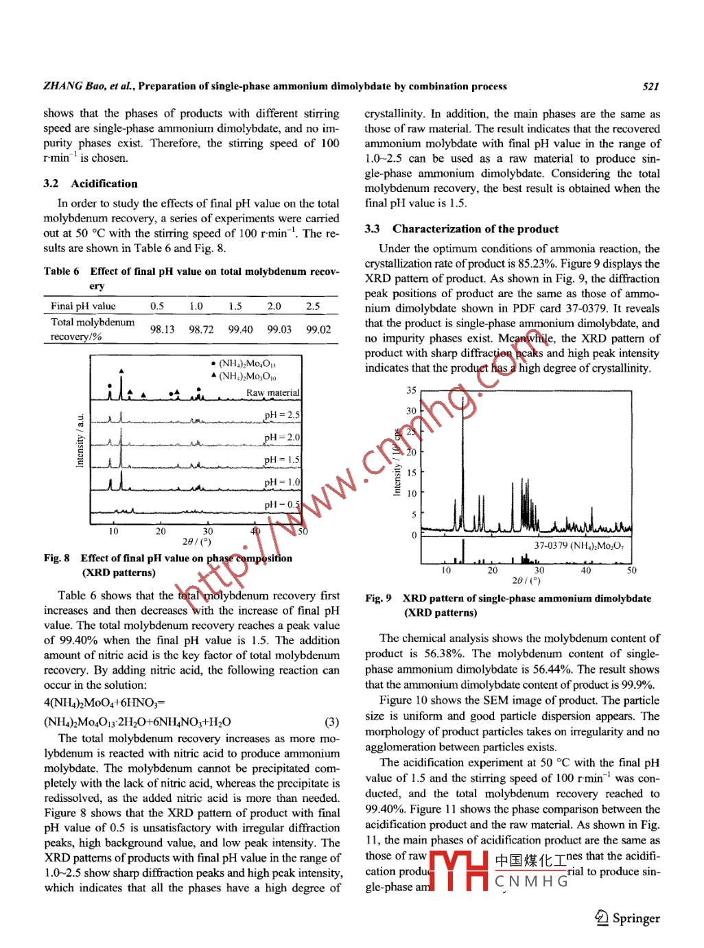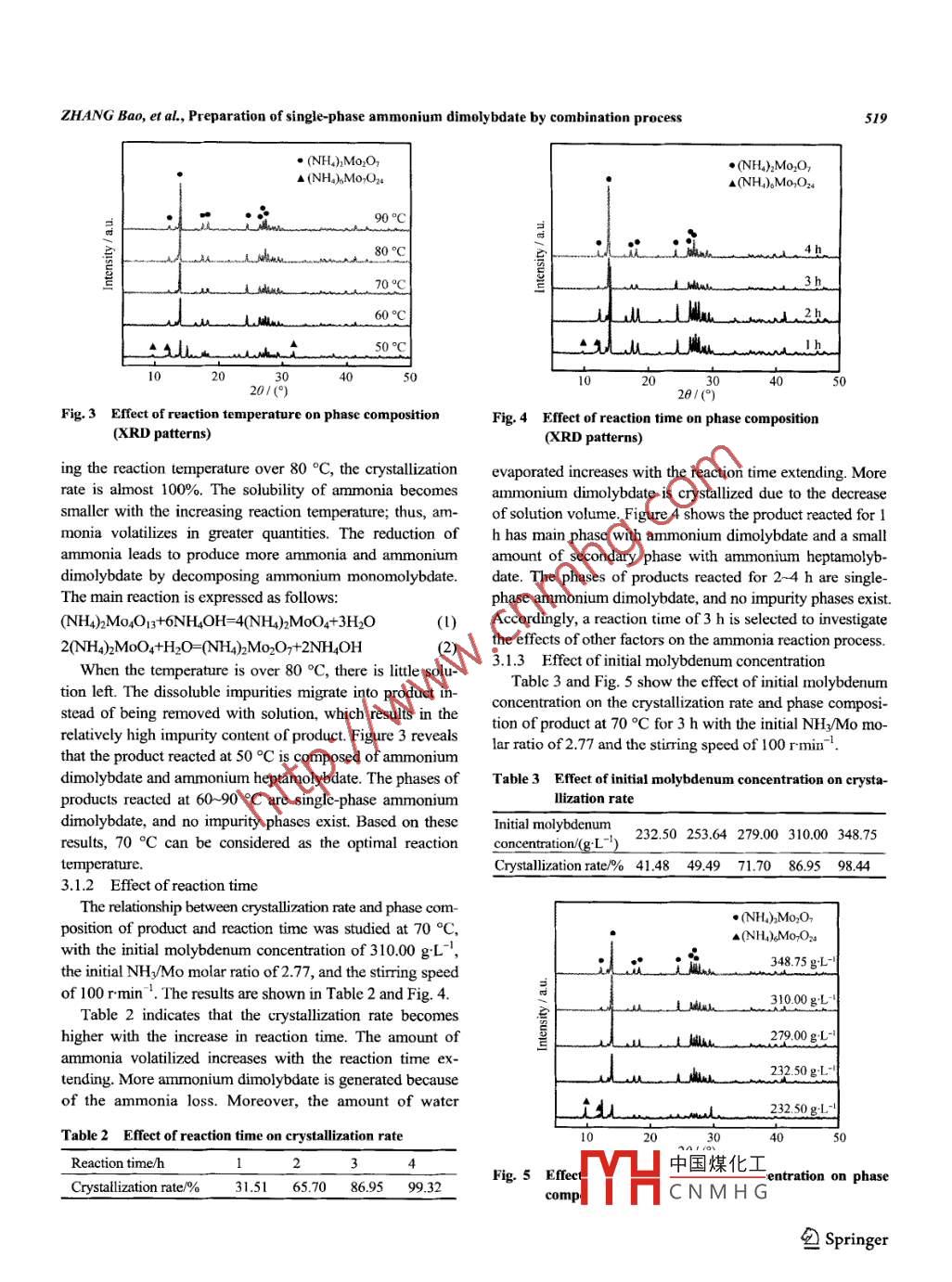 RARE METALSVol. 31, No.5, Oct. 2012, p.517DOI: 10.1007/s12598-012-0550-3Preparation of single-phase ammonium dimolybdate by combination processZHANG Bao,XIA Xiaomei.ancLI OianSchool of Metallurgical Sclence and Engineering, Central South University, Changsha 410083, ChinaReceived 25 October 201 1; received in revised form 12 January 2012; accepted 24 March 2012◎The Nonferrous Metals Socicty of China and Springer-Verlag Berli Heidelberg 2012AbstractA novel method for the preparation of single phase ammonium dimolybdate with industrial ammonium molybdate was studied. Various in-fluential factors were evaluated in the paper, including reaction temperature, reaction time, initial molybdenum concentration, initial NHz/Momolar ratio, and stiring speed. Under the optimum experimental conditions, the crystallization rate of product is 85.23%. The X-ay diffrac-tion XRD) analysis and chemical analysis show that the product is single phase ammonium dimolybdate, and no impurity phases exist. Thescanning electronic microscope (SEM) image reveals uniform particle size, good particle dispersion, and no aggiomeration between particles.Meanwhile, the final pH value of acidification was investigated. The total molybdenum recovery can reach up to 99.40%, and the mainphases of acidification product are the same as those of raw material with the final pH value of 1.5. This determines that the acidificationproduct can be used as a raw material to produce single-phase ammonium dimolybdate.Keywords: single-phase ammonium dimolybdate; combination process; crystallization rate; phase cormposition; total molybdenum recovery1 Introductioncontent of impurities, owing to the dissolved impurities to-gether with the separated filtrate returning to the reactionMetallic molybdenum (Mo) is a refractory metal com-system completely. Moreover, this technology has otherbined with remarkable high temperature strength, highproblems such as low recovery, long production cycle, andthermal and electrical conductivity, high corrosion resis-needing to recrystallize more than twice to increase recoverytance, high elastic modulus, and low coefficient of thermal[15- 16]. Combination process is a relatively new techniqueexpansion [1- 3]. Because of these outstanding properties,to produce ammonium dimolybdate. The improvementmetallic molybdenum is utilized in a variety of applications,comparing to the traditional evaporation crystallization issuch as electronics, metallurgy, aerospace, lighting technol-that after recovering element molybdenum in the form ofogy, and coating technology [4 -7]. The production of me-ammonium molybdate by adding acid into separated filrate,tallic molybdenum is a complicated physical and chemicalthe residual solution with dissolved impurities is not re-process including calcinating, deoxidizing, and so on.turned to the reaction system. The recovered ammoniumTherefore, the raw material plays a key role in the manufac-molybdate can be used as raw material. Consequently, theturing process [8]. Ammonium dimolybdate is the chief rawproduct of combination process is low impurity, and there ismaterial to producc mctallic molybdenum due to low con-no need to recrystallize due to the high total molybdenumtent of impurities, uniform particle size, and good particlerecovery of acidification [17]. In addition, combinationflowability [9- 10]. The production of mtallic molybdenumprocess has other advantages, such as easy control of pro-is mainly accomplished in two ways all over the world [1].duction process, less agglomerated particles, and narrowAmmonium dimolybdate is first reduced to molybdenumgranularity distribution. Although the production of ammo-trioxide and the latter is then reduced in the second step tonium dimolybdate has been widely applied in China onmetallic molybdenum. The other is the direct reduction ofcommercial scale, there are few researches on combinationammonium dimolybdate by a single stage.process. Meanwhile, few literatures have reported the effectUp to now, evaporation crystallization has been the es-of reaction conditions on the crystallization rate and phasetablished method for the production of bulk ammonium di-compoition!中國(guó)煤化工e-phase ammoniummolybdate in China [12- -14]. Recent studies show that theIn this paYHevaporation crystallization with closed cyclc leads to highdimolybdate. CNMH G was ivesigtede.Corresponding author: ZHANG BaoE-mall: csuzb@vip.163.com包Springer518RARE METALS, Vol. 31, No.5, Oct. 2012The effects of reaction temperature, reaction time, initialwere added into the beaker while stirring the content of themolybdenum concentration, initial NH3/Mo molar ratio, andbeaker at a certain speed. Reaction time began from initialstiring speed on the crystallization rate and phase composi-addition of ammonia solution. The supemnatant was vacuumtion of product were studied systematically. Moreover, asfiltered after cooling. The acidification was performed in aacidification was the key of combination process, the total150 ml beaker immersed in a thermostatic water bath. Nitricmolybdenum recovery and the phase composition of acidi-acid was dropped into the beaker containing 100 ml ammo-fication product were studied.nia reaction filtrate with a fixed stiring speed of 100 rmin 'at 50 °C. The pH value was controlled during the reaction.When the required pH value was reached stably, the slurry2 Experimentalwas filtered. The dissolved molybdate of acidification fil2.1 Materials and analysistrate was recycled by solvent extraction or ion exchange,The industrial ammonium molybdate used as raw mate-and the residual solution could be used to produce ammo-rial was procured from Jiangxi Copper Corporation, Jjiangxi,nium nitrate. The filter cakes of ammonia reaction andChina. The X-ray diffraction (XRD) analysis of industrialacidification were dried prior to subsequent ICP and XRDammonium molybdate is shown in Fig. 1. Except for theanalyses. Figure 2 shows the flowsheet of the exp