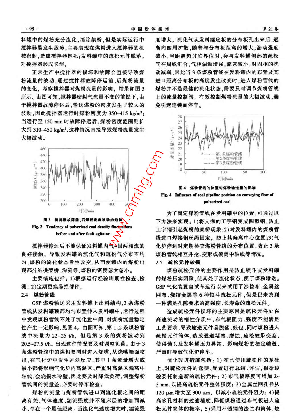 第21卷第3期中國粉體技術(shù) Vol. 21 No.32015年6月 CHINA POWDER SCIENCE AND TECHNOLOGYjun.2015oi:0.2i.0-5482015.03.023GSP氣化煤粉輸送問題及優(yōu)化措施馬銀劍,羅春桃,井云環(huán),吳躍(神華寧夏煤業(yè)集團(tuán)煤炭化學(xué)T業(yè)分公司,寧夏靈武750411)摘要為了實(shí)現(xiàn)S干煤粉氣化工業(yè)裝置煤粉密相送系統(tǒng)的穩(wěn)定輸提高了煤氣品質(zhì)41。在干煤粉加壓氣化裝置中,煤粉送,對(duì)鎖斗與發(fā)料罐容積、鎖斗閥、攪拌器、煤粉管線、疏松元件等影響被高壓二氧化碳或氮?dú)廨斔椭翚饣療?在氣化爐煤粉穩(wěn)定輸送的因素進(jìn)行研究結(jié)果表明,通過調(diào)整鎖斗疏松氣標(biāo)準(zhǔn)內(nèi)發(fā)生部分氧化反應(yīng),氮?dú)饣蚨趸細(xì)怏w最終混狀態(tài)下體積流量為900-1200m3h,在疏松氣管線上設(shè)置旁路,下料潤中設(shè)置吹掃氣,發(fā)料罐上安裝連續(xù)料位計(jì),以及對(duì)發(fā)料罐中的煤粉管合在產(chǎn)出的粗煤氣中,通過低溫甲醇處理又被分離線進(jìn)行固定,輸?shù)?,控制金屬絲網(wǎng)孔隙出去。在大規(guī)模煤粉加壓氣化工藝中殼牌干煤粉氣輸送 -3mm元件的布?xì)獍搴穸仍黾?~3為260μm,實(shí)現(xiàn)了煤粉密相輸送系統(tǒng)質(zhì)量流量波動(dòng)度小于5%化及中國航天干煤粉氣化的煤粉發(fā)料罐均采用下出關(guān)鍵詞:煤氣化;煤粉;氣力輸送料方式氣力輸送供煤,而GSP( gaskombinat schwarze中圖分類號(hào):TQ536文獻(xiàn)標(biāo)志碼:A文章編號(hào):1008-5548(2015)03-0096-04pump)干煤粉氣化技術(shù)中發(fā)料罐則采用上出料方式。GSP干煤粉氣化技術(shù)是20世紀(jì)70年代末,前民主 Conveying Problem of GSP Gasification德國燃料研究所開發(fā)并投入商業(yè)化運(yùn)營的技術(shù)51,神華寧夏煤業(yè)集團(tuán)有限責(zé)任公司于2005年引進(jìn)5臺(tái) Pulverized Coal and Optimizing MeasuresGSP干煤粉氣化爐【6,2008年開工建設(shè),2010年裝置實(shí)現(xiàn)投料運(yùn)行,煤粉的穩(wěn)定輸送一直是影響氣 MA Yinjian, LUO Chuntao, JING Yunhuan, WU Yue化爐穩(wěn)定運(yùn)行的核心問題。本文中通過對(duì)GSP氣化 (Coal Chemical Industry Branch Company, Shenghua Ningxia Coal Industry Group, Lingwu 750411, China)技術(shù)的研究,得出影響煤粉輸送的主要因素及優(yōu)化措施。 Abstract: To realize the steady dense phase conveying of GSP gasification technology in industrial application, the factors affecting pulverized coal1GSP煤粉密相輸送系統(tǒng)簡介 steady conveying were studied such as the volume of lock hopper andGSP干煤粉密相輸送系統(tǒng)主要包括煤倉、煤倉過 feeding tank ock hopper, mixer, pipe line of pulverized coal, show that the gas flow rate in濾器、鎖斗、泄壓過濾器、發(fā)料罐及輸送至燒嘴的3 loose-co lock hopper is 900 to 1 200 m er the standard condition bypass is條煤粉管線。煤粉輸送系統(tǒng)工藝流程如圖1所示。原 added in the loose gas pipe Purge gas is set in the discharge valve.the煤經(jīng)干燥研磨后,水的質(zhì)量分?jǐn)?shù)不超過5%,粒徑不 feeding tank is provided with continuous material level meter The超過200m,經(jīng)低壓氮?dú)庀∠噍斔椭撩簜}。煤粉進(jìn) pulverized coal pipeline in the middle is fixed. The thickness of the plate nemi入煤倉后與氮?dú)夥蛛x,在重力作用下,分配到煤粉倉 transmission element is increased by to mm. The meta mesh4個(gè)隔室,4個(gè)隔室的錐形出口分別對(duì)應(yīng)4個(gè)煤鎖 regulated at 260 um. Thus the changing range of pulverized coal mass flow in the pulverized coal dense phase conveying system is less than 5%.斗,當(dāng)鎖斗泄壓至常壓時(shí),煤倉出口閥打開,煤粉進(jìn) Keywords: gasification of coal; pulverized coal; pneumatic conveying入鎖斗。煤粉充滿鎖斗后,關(guān)閉所有進(jìn)、出口閥,開始對(duì)鎖斗進(jìn)行充壓,當(dāng)發(fā)料罐生產(chǎn)壓力約為4.4MPa粉體氣力輸送是一項(xiàng)利用惰性氣體能量輸送固時(shí),開始向發(fā)料罐供煤粉,4個(gè)鎖斗依次分別進(jìn)行,體顆粒的古老而有效的技術(shù),迄今為止已有00多實(shí)現(xiàn)鎖斗向給發(fā)料罐連續(xù)輸送煤粉,進(jìn)而實(shí)現(xiàn)氣化年的歷史。煤粉加壓密相氣力輸送則是大規(guī)模煤粉爐運(yùn)行。加壓后的煤粉進(jìn)入發(fā)料罐,發(fā)料罐內(nèi)置攪氣化中的關(guān)鍵技術(shù)之1-31。煤粉通過密相氣力輸送拌器使煤粉呈流化狀態(tài),依靠發(fā)料罐與氣化爐之間裝置運(yùn)輸,不僅降低輸送成本,提高輸送效率,而且的壓差提供動(dòng)力,煤粉通過3條煤粉管線,速度為7~10m/s,密度為300~500kg/m3,輸送至氣化爐的組收稿日期:2014-06-11修回日期:2014-06-27合燒嘴進(jìn)行化學(xué)反應(yīng),煤粉管線上分別設(shè)置密度計(jì)、基金項(xiàng)目:寧夏回族自治區(qū)重大科技攻關(guān)項(xiàng)目。第一作者簡:馬銀(19),硬士,工程師,研究方向?yàn)槊簹饣娝俣扔?jì)、控制閥及吹掃氣,確保輸送平穩(wěn)控制和氣化話:0951-6963723,-mai:18995052120@126.com爐的安全運(yùn)行。第3期馬銀劍,等:GSP氣化煤粉輸送問題及優(yōu)化措施97氮?dú)庵幸粔毫σ?一質(zhì)量流量76過濾器煤粉7并聯(lián)鎖斗煤倉7068去鎖斗泄壓50100150200250300350660100150二氧化碳時(shí)間/min斗圖2鎖斗壓力對(duì)煤粉流量的影響煤粉去燒嘴 Fig. 2 Effect of lock hopper pressure on pulverized coal flow發(fā)二氧化碳料料發(fā)完,鎖斗個(gè)數(shù)減少,動(dòng)作時(shí)間延
