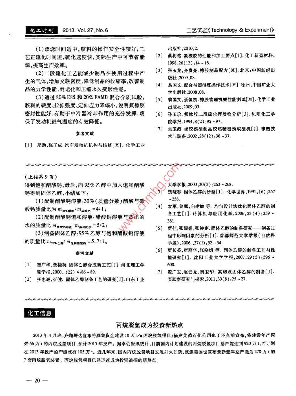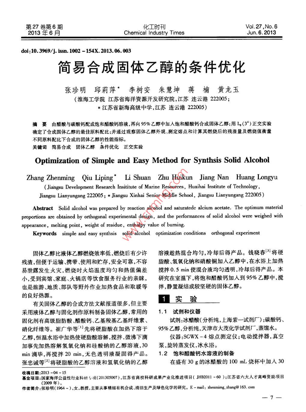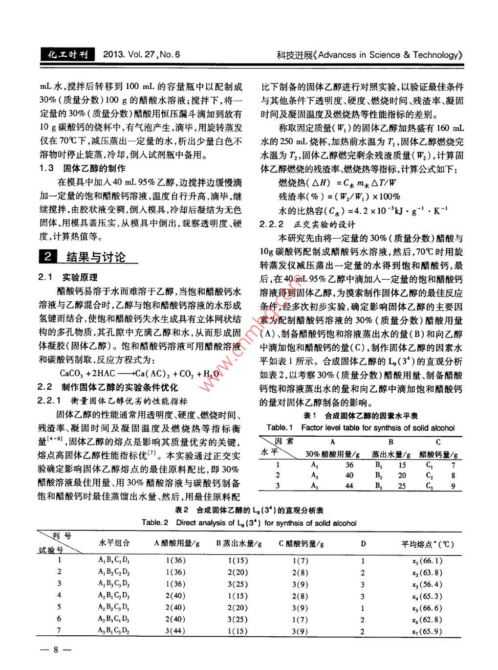 第27卷第6期化工時(shí)刊Vo.27,No.62013年6月Chemical Industry TimesJun.6.2013doi:10.3969/jisn.1002-154X2013.06.003簡(jiǎn)易合成固體乙醇的條件優(yōu)化張珍明邱莉萍′李樹安朱慧坤蔣楠黃龍玉(淮海工學(xué)院江蘇省海洋資源開發(fā)研究院,江蘇連云港222005;*江蘇省新海高級(jí)中學(xué),江蘇連云港222005)摘要由醋酸與碳酸鈣配成飽和醋酸鈣溶液再向95%乙醇中加入飽和醋酸鈣合成固體乙醇;用L(3)正交實(shí)驗(yàn)確定了合成固體乙醇的最佳原料配比;并通過觀察固體乙醇外觀測(cè)定熔點(diǎn)和計(jì)算其燃燒后的殘?jiān)考叭紵岛饬坎煌吓浔认潞铣傻墓腆w乙醇的性能指標(biāo)。關(guān)鍵詞簡(jiǎn)易合成固體乙醇條件優(yōu)化正交實(shí)驗(yàn)Optimization of Simple and Easy Method for Synthsis Solid AlcoholZhang Zhenming Qiu Liping Li Shuan Zhu Huikun Jiang Nan Huang Longyu( Jiangsu Development Research Insititute of Marine Resources, Huaihai Institute of TechnologyJiangsu Lianyungang 222005;* Jiangsu Xinhai Senior Middle School, Jiangsu Lianyungang 222005)proportions are obtained by orthogonal experimental design, and the performances of solid alcohol , pomum materialAbstract Solid alcohol was prepared by reaction alcohol and saturated alcium acetate. Theappearance, melting point, weight of residue, enthalpy value of burningKeywords simple and easy synthsis solid alcohol optimization conditions orthogonal experiment固體乙醇比液體乙醇燃燒效率低,燃燒后有少許溶液趁熱混合均勻,冷卻后得產(chǎn)品。錢曉春將硬殘?jiān)?但便于運(yùn)輸、攜帶、使用和貯存,安全可靠不容脂酸、氫氧化鈉和硝酸銅加入乙醇中,在水浴上加熱易泄露發(fā)生火災(zāi),燃燒時(shí)火焰溫度均勻和熱值偏差攪拌O.5min使混合液均勻透明,冷卻后得產(chǎn)品。本小,受到賓館、家庭、火鍋店等飲食服務(wù)行業(yè)的親睞,研究在室溫下,將飽和醋酸鈣加入到95%乙醇中,攪也是旅游、地質(zhì)、部隊(duì)等野外作業(yè)加熱食品和取暖等拌,靜置凝結(jié)成較堅(jiān)硬的固體乙醇。的良好熱源。有關(guān)固體乙醇的合成方法文獻(xiàn)報(bào)道很多,但主要11實(shí)驗(yàn)采用液體乙醇與固化劑作原料制備固體乙醇常用的1.1試劑和儀器固化劑有高級(jí)脂肪酸、醋酸鈣、乙基羧基乙基纖維素、試劑:冰醋酸(分析純,上海紫一試劑廠);碳酸鈣硝化纖維等。崔廣華等先將硬脂酸在加熱下溶于95%乙醇分析純天津市大茂化學(xué)試劑廠,蒸餾水。乙醇,恒溫水浴中加熱使硬脂酸溶解攪拌,微沸下滴儀器:SGWX-4熔點(diǎn)測(cè)定儀;電動(dòng)攪拌器,真空加事先加熱溶解氫氧化鈉和硅酸鈉的乙醇溶液,30泵,旋轉(zhuǎn)蒸發(fā)儀冰水浴min滴畢,再攪拌20min,無色透明液凝固得產(chǎn)品。1.2飽和醋酸鈣水溶液的制備張忠誠(chéng)等2將硬脂酸的乙醇溶液和氫氧化鈉的乙醇在盛有30g的冰醋酸的100mL燒杯中加入30收稿日期:2013-04-15基金項(xiàng)目:國(guó)家海洋公益性行業(yè)科餅填(201305007),江蘇省高??蒲谐晒a(chǎn)業(yè)化推進(jìn)項(xiàng)日(JHB2011-60);江蘇省六大人才高峰資助項(xiàng)(2009年)。作者簡(jiǎn)介:張珍明(1964-),女,教授,主要從事精細(xì)有機(jī)合成、清潔生產(chǎn)及綠色化學(xué)的研究。E-mal:zhenmingzhang163.com7化工葉刊2013.Vo.27,No.6科技進(jìn)展《 Advances in Science& TechnologymL水,攪拌后轉(zhuǎn)移到100mL的容量瓶中以配制成比下制備的固體乙醇進(jìn)行對(duì)照實(shí)驗(yàn),以驗(yàn)證最佳條件30%(質(zhì)量分?jǐn)?shù))100g的醋酸水溶液;攪拌下,將一與其他條件下透明度、硬度、燃燒時(shí)間殘?jiān)?、凝固定量?0%(質(zhì)量分?jǐn)?shù))醋酸用恒壓漏斗滴加到放有時(shí)間及凝固溫度及燃燒熱等性能指標(biāo)的差別。10g碳酸鈣的燒杯中,有氣泡產(chǎn)生,滴畢,用旋轉(zhuǎn)蒸發(fā)稱取固定質(zhì)量(W1)的固體乙醇加熱盛有160mL儀在70℃下,減壓蒸出一定量的水析出少量白色不水的250mL燒杯加熱前水溫為T,固體乙醇燃燒完溶物時(shí)停止旋蒸,冷卻,倒入試劑瓶中備用。水溫為T2,固體乙醇燃完剩余殘?jiān)|(zhì)量(W2),計(jì)算固1.3固體乙醇的制作體乙醇燃燒的殘?jiān)?、燃燒熱等指?biāo),計(jì)算公式如下:在模具中加入40mL%5%乙醇,邊攪拌邊緩慢滴燃燒熱(△H)=C水m水△T/W加一定量的飽和醋酸鈣溶液溫度自行升高滴畢,繼殘?jiān)?%)=(W2W1)×100%續(xù)攪拌,由膠狀液變稠倒入模具,冷卻后凝結(jié)為無色水的比熱容(C水)=4.2×10訂·g1·K1固體,用模具蓋壓實(shí),從模具中倒出,觀察透明度、硬2.2.2正交實(shí)驗(yàn)的設(shè)計(jì)度,計(jì)算熱值等。本研究先由將一定量的30%(質(zhì)量分?jǐn)?shù))醋酸與2l結(jié)果與討論10g碳酸鈣配制成醋酸鈣水溶液,然后,70℃時(shí)用旋轉(zhuǎn)蒸發(fā)儀減壓蒸出一定量的水得到飽和醋酸鈣,最2.1實(shí)驗(yàn)原理后,在40mL95%乙醇中滴加入一定量的飽和醋酸鈣醋酸鈣易溶于水而難溶于乙醇當(dāng)飽和醋酸鈣水溶液得到固體乙醇,為摸索制作固體乙醇的最佳反應(yīng)溶液與乙醇混合時(shí),乙醇與飽和醋酸鈣溶液的水形成條件,經(jīng)多次初步實(shí)驗(yàn)確定影響固體乙醇的主要因氫鍵而結(jié)合使飽和醋酸鈣失水生成具有立體網(wǎng)狀結(jié)素為配制醋酸鈣溶液的30%(質(zhì)量分?jǐn)?shù))醋酸用量構(gòu)的多孔物質(zhì),其孔隙中充滿乙醇和水,從而形成固(A)制備醋酸鈣飽和溶液蒸出水的量(B)和向乙醇體凝膠(固體乙醇)。飽和醋酸