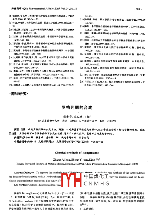 齊魯藥事.Qilu Pharmacutical Affairs 2005 Vl. 24 sNo.11.685.[8]錢虐叢,宇文葬.構(gòu)杞于的化學(xué)成分及藥理研究新進(jìn)慶.中醫(yī)藥(2):63. .[9]付繞,李春陶.杜仲的研究進(jìn)展.黑龍江中醫(yī)藥2002,21(2)157~學(xué)報(bào)2000,32 (4):34-36.[19]徐亞體,孫樣.調(diào)五臟治療老年癡呆盛.陜酉中醫(yī),198. I9(9);423.59.[20]韓旭.中醫(yī)辨還分型治療老年性癡呆病60例.遼寧中醫(yī)雜志,[10]劉孟期,劉惠純.益智中草藥的研究概況.中國中西醫(yī)績合雜1998.25(12)2557~-559.志,2002.15(1);59~61.[21]詢?nèi)A.本觚主任醫(yī)師檢療老年癡呆病的經(jīng)臉.河南中醫(yī),1998,[11]正鐘.丹參有效成分的研究避辰.中國醫(yī)學(xué)科學(xué)院學(xué)報(bào)199,18(2):39.16(2);140- 142.[22]健剛.健脾活血開竅益智法治療老年冀血管性癡呆52創(chuàng)臨床[12]唐洪梅,李銳,周藥玲.石曹精對(duì)中樞神經(jīng)系統(tǒng)作用研兗進(jìn)展.觀寨.新中醫(yī)19,31(6);57.廣州中醫(yī)藥大學(xué)學(xué)報(bào)000.(2):21.[23]謝美玲. 補(bǔ)督活血化瘀陸治療老年性翻星40例.新中醫(yī),[13]黃兆勝.中藥對(duì)老年性癡呆中樞神經(jīng)通質(zhì)改變調(diào)節(jié).時(shí)珍團(tuán)醫(yī)1997,29(11);60.回藥199,10(9):699 -700[24]余恒旺.補(bǔ)腎活直化竇墊治療老年性癡呆32鋼.新中醫(yī),[14]比畫霞,張丹參,張力,等.蛇床子素對(duì)學(xué)習(xí)記憶的膨響及其機(jī)197,29(5)55.制分析.莉孝學(xué)揠攛1999,346):6~ 10.[25]李貴發(fā).腦靈鋦治療腦血管物呆的臨床研究.中醫(yī)藥信息。{15]段文貞,強(qiáng)均田.黃皮脫膠對(duì)鼠腦內(nèi)NMDA受體的影響,藥學(xué)1997, 14(6):20.[16]李莉,吳若.五睞子酯對(duì)氧自由基引起大鼠腦突觸體和線粒體學(xué)報(bào).197,32(4);20~2.[26)|陳民。肖數(shù)儋.夏翔治療老年癡呆的經(jīng)驗(yàn).翻北中區(qū)雜志,1999,21(3);102.損傷的保護(hù)作用.藥學(xué)學(xué)報(bào), 19,33(2):178- 182.[27]楊丁左,李士林.離腦湯加減治療老年癡呆盛臨床研究.安徽[17]聶純.治療老年性后呆的天然藥物成分.中草藥2000.30(7);中國學(xué)院呼報(bào),198.17(1);67-9.90-92.[28]同樂法.劉百波,鄰文君.智靈湯治療老年癱呆的臨床研究.申[18]謝德高.從腦著不足談對(duì)老年癡呆病的認(rèn)識(shí)。新中醫(yī)1998.30醫(yī)雜志。198.39(9):542 -544.●藥物研究.羅格列酮的合成張愛華,沈義鵬,丁婭'(江蘇省藥物研究所南京10009;1. 中國藥科大學(xué)南京210009)摘要:目的改進(jìn)羅格列酮的合成方法。 方法以對(duì)羥基蘋甲醛為起始原料,經(jīng)S步反應(yīng)合成冒 標(biāo)化合物的路線。結(jié)果.及結(jié)論用該路線 可以在溫和條件下合成出該藥,適用于工業(yè)化生產(chǎn)。最終產(chǎn)品純度大于99%。關(guān)鍵詞:羅格列酮糠尿病噻哇坑二酮胰島素增教制化學(xué)合成中國分類號(hào):R914.5文獻(xiàn)標(biāo)識(shí)碼:A文章編號(hào):1672- 73<200501-1 0685-03Chenical synthesis of RosigitazoneZhang Ai hua, Sheng Yi-pen,Ding Ya'(jingsu Provincsl Insitute ol Materia Media, Nningn210009:1.China Pharmacevtical UnviyNningn210000Abstract:Otyet've To improve the syothesibhas been perfomed saring with P -Hydroxybenzal中國煤化工wy w modeale and can be明plied in idurialization prodution. The purity olKey wrsrscioiionidiabetis mlis:thiaMYHCNMHG羅格列翻(nmigiaune)化學(xué)名為:5-[[4-[2- (甲基(IR)和改善B細(xì)胞功能,優(yōu)于鹽酸二甲雙胍緩釋片及阿卡-2-吡啶氨基)乙氧基]苯基]甲基]-2,4-吻唑燒二酮,是波糖["。 羅格列酮有很好的降糖作用,并能改善胰島素抵由Sonithkline Beechumn公司開發(fā)的胰島素增敏削,1999年首抗、降低血壓,調(diào)節(jié)血脂,是一種安全.療效確切的降糖新次在關(guān)國上市.應(yīng)用于2型糖尿病的治療。臨床資料顯示,.藥12.)。羅格列酮能有效降低中老年人I型糖尿病患者胰島索抵抗1工藝研究.686●齊魯藥事Qilu Pharmeorutial Affair 2005 VW.24.No.11羅格列酮的合成已有文獻(xiàn)報(bào)道(4.5.5),比較可行的有以蠟狀固體28g.即化合物4.收率78%(以對(duì)羥基苯甲醒計(jì)),下兩條路線。含量98%(HPLC歸-化法) .質(zhì)譜:m/z=365(M+ 1)。路線1:2.35-[[4-(2-甲燕氨基乙氧基)笨基]甲烯基]-2,4-噻唑烷二酮(化合物5)的制備o.→肝將上一步所得化合物4(10g,0.0274mol)溶解于80ml95%乙醇中,空溫下向反應(yīng)液中海加SNN&OH20mil,漓加完事,反應(yīng)液在60七攪拌反應(yīng)12h。反應(yīng)結(jié)束,將反應(yīng)液倒人冰水中,氧仿提取兩次,提取液水洗.干雄。氧仿液減壓蒸去培劑,得黃色抽狀物5.5g,收事73%,含量97%(HPLC歸- -化法),質(zhì)譜:m/z=275(M+ 1)。2.4 5- [4-[2-(甲基2-毗啶氨基)乙氨基]苯基]甲烯基]-2.4-1唯唑烷二酮(化合物6)的制備期1將上步所得化合物5 (Sg.0.0182md)與2-氧吡啶躋線2:(3.1g.0.027mo)混和,在氮?dú)獗Wo(hù)下于130C規(guī)拌反應(yīng)18hr。 反應(yīng)液自然冷卻后.倒人冰水中,加人乙釀乙酯提取、r好o兩次。合并提取層,依次用IN HO.IN NHOO及飽和食鹽水洗康,無水硫酸的干燥。減壓蒸去溶劑得翔化合物6.~oroo5.9g,收率93% ,mp194~- 196比(文獻(xiàn)(:收率95%,mpl96~197C)。HPLC測法會(huì)最為99% ,質(zhì)譜:m/e= 353(M+1)。2.55-[[4-[2-(甲基-2-晚啶氨基)乙氧基]苯基]甲基]-2,4-唱唑烷二酮(步格列酮)的制備我們從原料、反應(yīng)殺件.對(duì)設(shè)備的要求等方面對(duì)這兩條將上步所得化合物6(5g,0.0142mo)靜解于30nl 甲醇路線進(jìn)行研究,綜合文獻(xiàn)資料,按路線1所示的工藝路線合中,向反應(yīng)液中