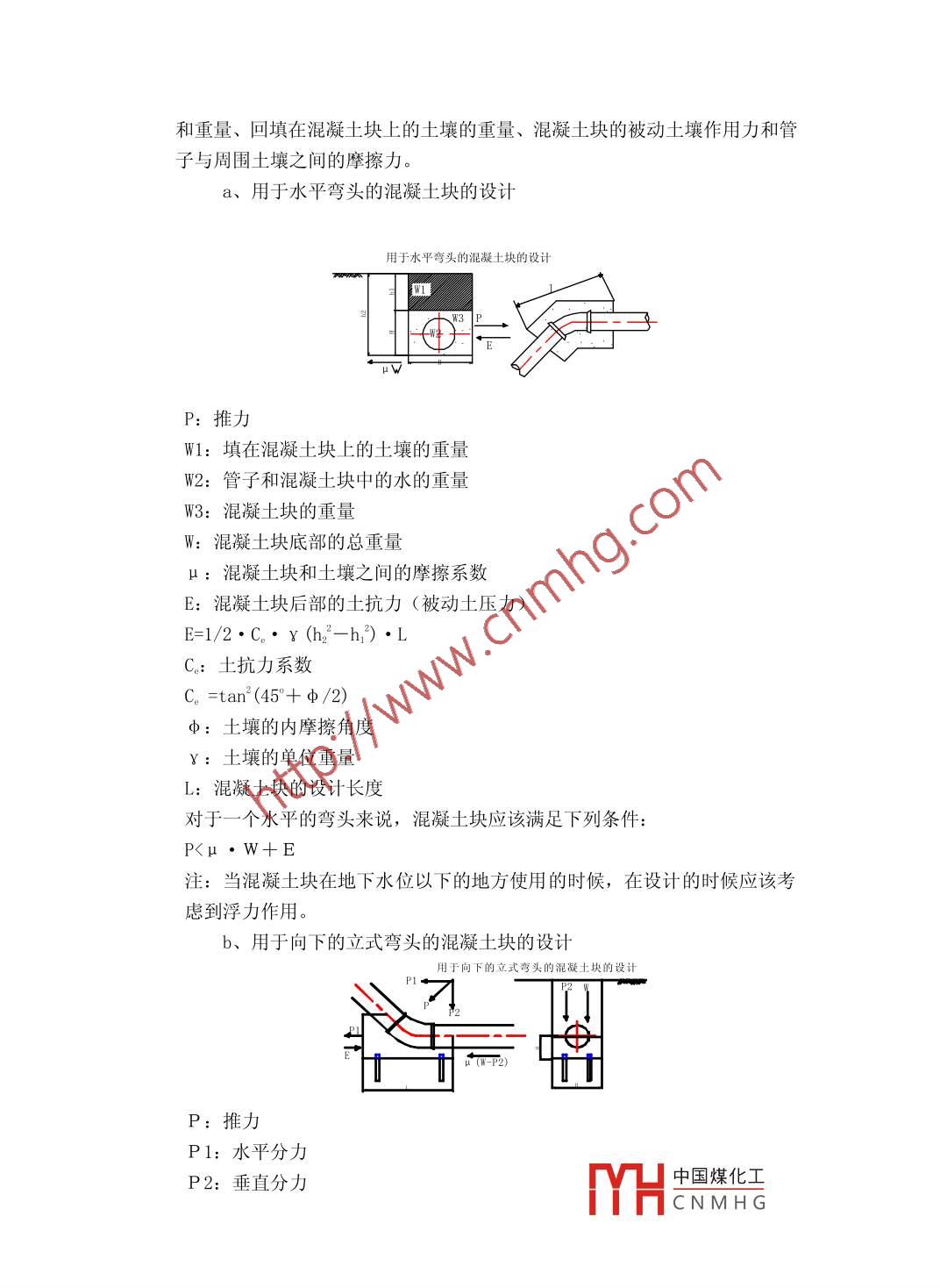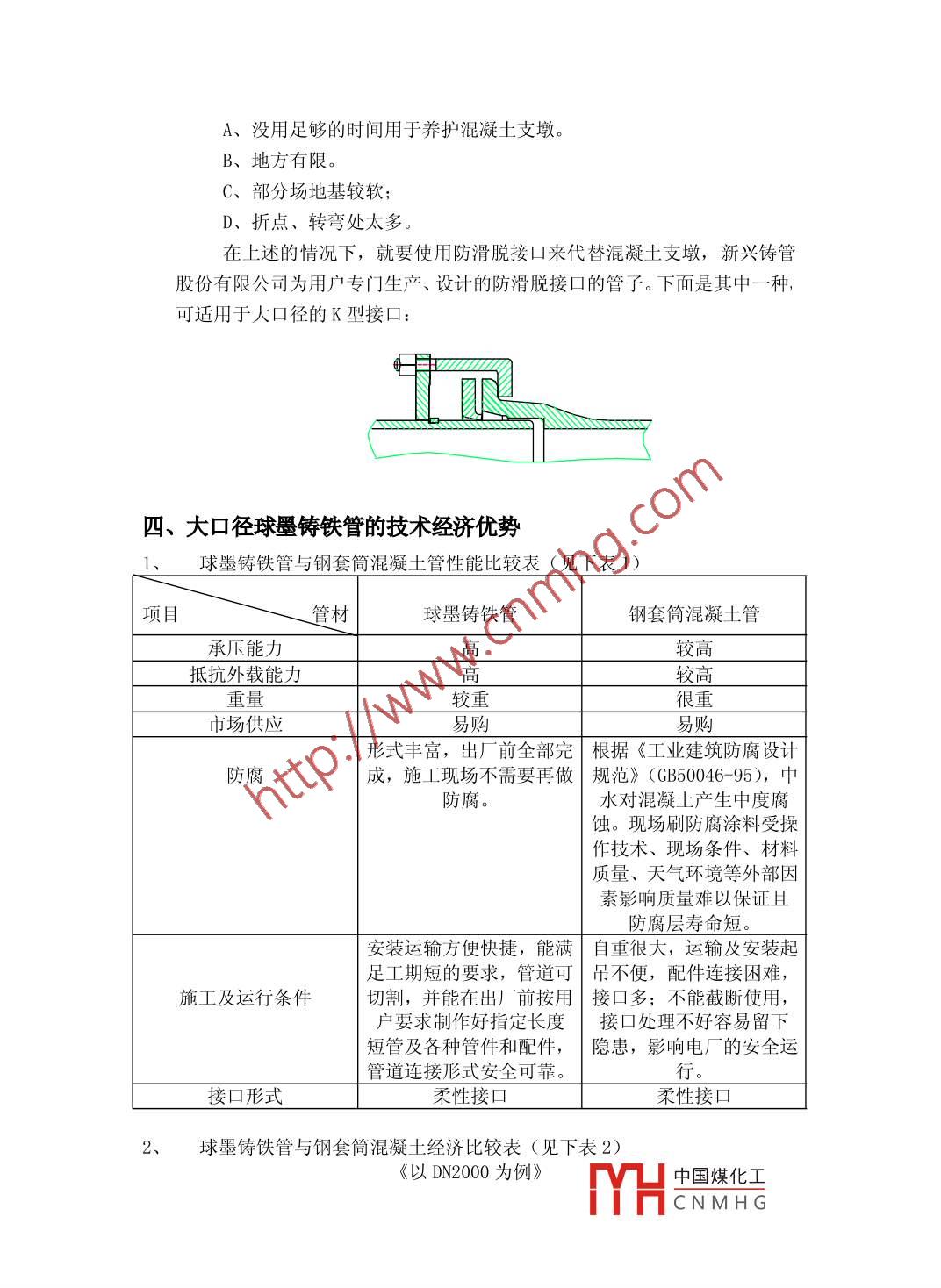 大口徑球墨鑄鐵管應(yīng)用于火力發(fā)電廠循環(huán)水系統(tǒng)技術(shù)初探.1史俊龍2祁虎生(1中新聯(lián)進(jìn)出口有限公司) (2 新興鑄管股份有限公司)摘要:火力發(fā)電廠蒸汽機組循環(huán)水管道安全性能要求高,維修及改造困難,且費用高昂。因此循環(huán)水管道的選材問題會直接影響到電廠機組本身供水系統(tǒng)的安全可靠性及工程的整體投資。本文從大口徑球墨鑄鐵管的工作原理、機械性能、設(shè)計、應(yīng)用等幾個方面較全面地論證了大口徑球墨鑄鐵管在火力發(fā)電廠蒸汽機組循環(huán)水管道中實際優(yōu)勢并提出在此領(lǐng)域應(yīng)用的重要意義。關(guān)鍵詞:大口徑循環(huán)水管道安裝 經(jīng)濟技術(shù)引言火力發(fā)電廠蒸汽機組循環(huán)水管道安全性能要求高,維修及改造困難,且費用高昂。因此循環(huán)水管道的選材問題會直接影響到電廠機組本身供水系統(tǒng)的安全可靠性及工程的整體投資。近幾年來,各大、中型火力發(fā)電廠600MW以下機組的循環(huán)水管道一般選用鋼套筒混凝土管(PCCP) 做為最佳的輸水管材。規(guī)格為DN1800---3000。鋼套筒混凝土管主要具備以下特點:承壓能力較高,具備較強的抵抗外部荷載能力。2、柔性接口連接,能滿足不同地質(zhì)條件的要求。3、造價低廉,材料各地易購,并具有較長的使用壽命。行業(yè)內(nèi)部技術(shù)成熟,施工工藝簡單。但是,隨著當(dāng)前人類水資源的嚴(yán)重匱乏和對環(huán)保的重視,凈水將不再應(yīng)用于電廠的循環(huán)水系統(tǒng),絕大多數(shù)的工程中已逐步推廣使用污水處理廠的中水,中水在電廠內(nèi)經(jīng)加酸、緩蝕劑及阻垢劑后補充至循環(huán)水系統(tǒng),循環(huán)水的經(jīng)電廠內(nèi)的加工處理,水質(zhì)指標(biāo)發(fā)生了明顯的變化,具體指標(biāo)如下:硫酸根: 680- 1620mg/L氯離子: 221-500mg/L溶解固形物: 1295-2420mg/LPH:7.2- -7.8-一、大口徑球墨鑄鐵管的主要工作原理DN1600以上的大口徑球墨鑄鐵管的連接方式推薦采用K型接口,這種接口是由球墨鑄鐵管、壓蘭、膠圈及螺栓組成的機械接口,具有-定的柔性,能偏轉(zhuǎn).一定的角度。 當(dāng)壓蘭的前部將膠圈壓緊時,膠圈受到擠壓變形。這種變形在膠圈上引起初始應(yīng)力(Po)。 當(dāng)施加內(nèi)壓時,膠圈的應(yīng)力也隨之增加,與內(nèi)壓的關(guān)系.成正比。由于膠圈總應(yīng)力(P=Ps+P0) 總是大于內(nèi)部壓力(P;), 因此在管子爆裂之前在接口處不會發(fā)生泄漏現(xiàn)象。該膠圈由角形尾部和圓形頭部組成,硬度不同,該膠圈形式在日本被認(rèn)為是最好的膠圈之-?!?”型膠圈 由于受壓后橢圓長軸兩中國煤化工的狀YHCNMHG況,而在實際使用過程中增加了滲漏的可能性。保證在內(nèi)外壓力條件下,即使在最不利的鑄造公差即最小插口與最大承口連接和接頭運動條件下,如偏角1. 5°接頭受大于30倍公稱直徑的剪切力的條件下,保證接頭密封良好。具有偏轉(zhuǎn)的特性使管線能吸收因地基沉降而產(chǎn)生的應(yīng)力,避免管道事故,因此也能滿足地質(zhì)條件不良的工程施工。( 見圖1、2)K型摟口型式(圖1)二、大口徑球墨鑄鐵管的機械性能1、機械性能IS02531中規(guī)定的球鐵管的機械性能直徑DN抗拉強度Rm屈服強度Rp0. 2延伸率A硬度MmN/mm2%HBDN80-1000≥420> 300≥10DN1200-2600≥300≥7≤230注:當(dāng)延伸率大于或等于10%時,允許最小屈服強度值Rp0.2為270N/mm22、尺寸和重量尺寸: IS02531 只規(guī)定管和管件插口尺寸及公差,規(guī)定用環(huán)形卷尺測量:適用于所有壁厚等級管,也適用于盤插類管件。負(fù)公差取決于管子接口類型,在國家標(biāo)準(zhǔn)中有規(guī)定。管與管件插口橢圓度應(yīng)為: DN>600, 不超過DE的2%。內(nèi)徑:球墨鑄鐵管內(nèi)徑標(biāo)準(zhǔn)值,單位mm,等于公稱直徑DN;.壁厚:管與管件的標(biāo)準(zhǔn)壁厚是根據(jù)公稱直徑DN的函數(shù)來計算的。公式如下:e=K (0.5+0. 001DN)式中: e-標(biāo)準(zhǔn)壁厚,mm;DN一公稱直徑,mm中國煤化工K---壁厚級別系數(shù):.MHCNMH G長度見下表單位:米DN標(biāo)準(zhǔn)長度Lμ80-- 26006或8.15注:不是所有的標(biāo)準(zhǔn)長度在所有的國家都適用對壁厚等級為K9的DN2000的管,e=22. 5mm公差為: - (1. 3+0.001DN) =- 3.3mmDN1800以上大口徑球鐵管長度一般為8. 15m在廠方提供的管總數(shù)中,短尺管比例不超過10%。管的平直度:管子應(yīng)平直,其最大偏差為長度的0. 125%。.三、大口徑球墨鑄鐵管設(shè)計及應(yīng)用1、推力錨固(1)由水壓產(chǎn)生的推力:40N◆xf = 2pAsin號=2p"D-sin號4同樣的在三通處產(chǎn)生的推力為:.在三通處由水壓引起的推力f=pa=pndπd12在漸縮處產(chǎn)生的推力為:中國煤化工YHCNMH G在減縮處由水壓引起的推力二f= p(A-a)= p("01--門)在管道末端產(chǎn)生的推力為:在管道末端由水壓引起的推力.-二三二三→f= pA= prDI1上式中:f為推力;p為內(nèi)壓力;A為主管的截面積;a為支管的截面積;θ為彎頭的角度;在水壓為1Kgf/cm2時管件處的推力如下表: _公稱直徑管線末端45°22.5°11.25°200034045260571328466742200408283124915930800424004745236318185159302260056579433082207611092注: (1)、要決定實際壓力條件下的推力,可用表中的推力數(shù)乘實際壓力在計算;(2)、. 上表中的數(shù)值由實際管子的外徑計算得來。2、使用混凝土塊固定中國煤化工在設(shè)計混凝土塊時,主要考慮敷