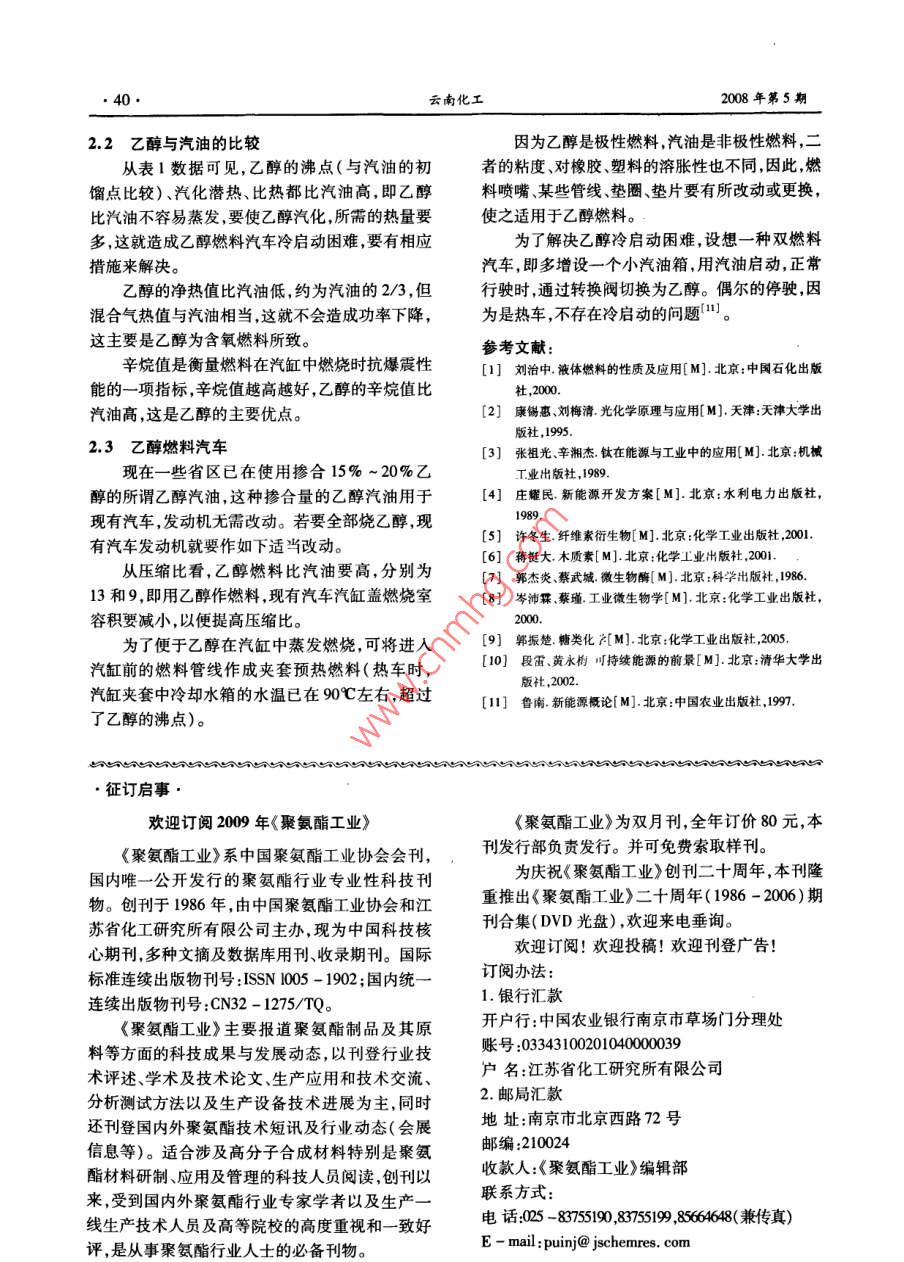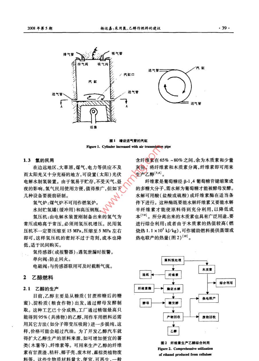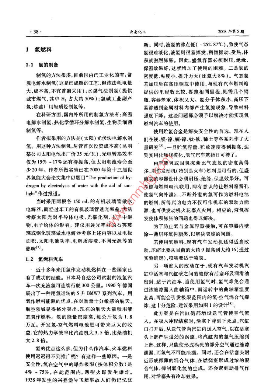2008年10月云南化工Oct.2008第35卷第5期 Yunnan Chemical Technology Vol.35, No.5采用氫、乙醇作燃料的建議楊運(yùn)嘉(云南師范大學(xué)化學(xué)化工學(xué)院,云南昆明650092摘要:就清潔、可再生能源氫、乙醇的制備和作燃料使用簡(jiǎn)略敘述。氫擬用(太陽)光伏法電解水制、可再生備,乙醇擬用便宜的原料如甘蔗渣、秸桿等含纖維素的有機(jī)質(zhì)通過纖維素酶水解后發(fā)酵制備。二者作為汽車燃料使用,現(xiàn)有汽車發(fā)動(dòng)機(jī)僅需作適當(dāng)改動(dòng)。關(guān)鍵詞:氫燃料;乙醇燃料;太陽電池;電解中圖分類號(hào):TK91,TK01文獻(xiàn)標(biāo)識(shí)碼:A文章編號(hào):1004-275X(2008)0500704 Suggestion on Hydrogen and Ethanol as Fuel Yang Yun-jia (School of Chemistry and Chemical Engineering, Yunnan Normal University, Kunming 650092) Abstract: Preparation of hydrogen and ethanol as clean and renewable energy was introduced. Hydrogen could be epared by electrolysis of water by photoltaic method, and ethanol could be prepared by hydrolysis of cheap celulose- rich biomasses such as bagasse and straw with cellulase and then fermentation. Both could be used as automobile fuel, and the engine was just needed to improve properly. Key words: hydrogen fuel; ethanol fuel: solar cell; electrolysis當(dāng)前,世界范圍氣候異常,氣溫普遍升高,皆子的烴類的復(fù)雜混合物。就燃燒產(chǎn)生的CO2比由“溫室效應(yīng)”引起。溫室效應(yīng)是由溫室氣體產(chǎn)生較,乙醇燃燒產(chǎn)生的CO2約為汽油的四分之一,從的,CO2是主要的溫室氣體。人們?cè)谑褂贸R?guī)能這個(gè)意義上看,乙醇也算是一種清潔燃料源——化石燃料(煤、石油及其產(chǎn)品)時(shí),其燃燒產(chǎn)表1是氫、乙醇、汽油的理化數(shù)據(jù)比較。物會(huì)產(chǎn)生大量的CO2,化石燃料或多或少還含氮和表1、乙醇汽油的某些理化數(shù)據(jù)硫,其燃燒產(chǎn)生的NO2和SO2也是大氣的污染源。 Table 1. Some physical and chemical property城市空氣污染有60%來自汽車尾氣排放。因此, of hydrogen, ethanol and gasoline要防止和減弱溫室效應(yīng)的影響,降低空氣污染,就項(xiàng)氫乙醇汽油要采取有效措施來減少CO2和有毒氣體的排放。含碳原子數(shù)/個(gè)26-12使用清潔能源作為化石燃料的替代能源是最有效沸點(diǎn)(程)/℃-252.8778.335-210措施之一。密度(g/cm3)0.070.7890.72-0.75在燃料中,氫最清潔,它的燃燒產(chǎn)物是H2O,汽化潛熱/(k/kg)862290~315H2O可通過太陽電池轉(zhuǎn)化為氫氣,這是自然界中比熱/(kJ/kg·℃)2.722.43最合理、最良性的循環(huán)。若在城市中使用氫氧燃凈熱值k)1210032711043963料電池電動(dòng)汽車則可實(shí)現(xiàn)真正意義的“零排放”。混合氣熱值/(k/kg)29752937氫的熱值高,按重量計(jì)其熱值是汽油的三倍。在辛烷值106-110即牌號(hào)使用中,氫的連續(xù)性、可貯性、可輸性、可轉(zhuǎn)化性也壓縮比~1613-14-9空燃比914.9是其它燃料不具備的。燃燒極限%上限4.04.31.3乙醇含兩個(gè)碳原子,汽油是含6~12個(gè)碳原下限75197.2收稿日期:2008-08-14稿件修回日期:2008-09-11作者簡(jiǎn)介:楊運(yùn)嘉(1941-),男,副教授,研究方向:清潔、可再生能源。38云南化工2008年第5期新。同時(shí),液氫的沸點(diǎn)低(-252.87℃),致使氣態(tài)1氫燃料氫很難液化,液氫則很易揮發(fā),稍微振動(dòng)、受熱,體積就激烈膨脹。因此,盛氫容器必須耐壓、絕緣、1.1氫的制備保溫效果好,這就增加了使用的困難。二是氫的制氫的方法很多,目前國(guó)內(nèi)已工業(yè)化的有:常密度低、粘度小提升力大(比氦大8%)。氣態(tài)氫規(guī)電解水制氫(這是已成熟的工藝,但該法耗電量若加壓后在高壓鋼瓶中使用,與現(xiàn)有汽車燃料箱大,成本高,不宜普遍采用);水煤氣法制氫(提供提供的里程數(shù)比較,要跑相同里程,則需幾個(gè)鋼城市煤氣,其中H2占大約50%);氯堿工業(yè)副產(chǎn)瓶,容器笨重,體積又大。氫分子體積小,高壓下氫;煉油廠用輕質(zhì)烴制氫等。易滲透到金屬材料內(nèi)部產(chǎn)生氫脆現(xiàn)象,導(dǎo)致材料在科研方面,國(guó)內(nèi)外所用的制氫方法有:高溫強(qiáng)度下。這些問題都必須予以解決才能實(shí)現(xiàn)氫電解水制氫、熱化學(xué)循環(huán)分解水制氫、生物質(zhì)細(xì)菌燃料汽車的使用。制氫等。使用貯氫合金是解決安全性的首選?,F(xiàn)在人作者擬采用的方法是(太陽)光伏法電解水制們?cè)阪V、鎂鎳、鑭鎳、鈦鐵、稀土等各系列作了大氫。用這種方法制氫,盡管首次投資成本高(昆明量研究,一旦貯氫容量、貯放速度得到提高,達(dá)某公司太陽電池出廠價(jià)35元/瓦),光電轉(zhuǎn)換效率到實(shí)用化和規(guī)?;?氫氣汽車就指日可待了。僅為15%~17%還有待提高,但太陽電池壽命至由于液氫或固氫凍膏比氣態(tài)氫的密度高得少20年。作者所做實(shí)驗(yàn)已在2000年第十三屆世多,用作發(fā)動(dòng)機(jī)(特別是火車)燃料是可行的但盛界氫能大會(huì)論文集中以題目“The production of hy液氫的容器設(shè)計(jì)必須耐壓、絕緣保溫效果好???drogen by electrolysis of water with the aid of sun考慮與燃料電池聯(lián)用,即有意識(shí)的讓燃料箱留孔 light作過報(bào)道。使氫氣向外泄,不斷外泄的氫可作為燃料電池當(dāng)時(shí)采用兩根各150mL的有機(jī)玻璃管做水的燃料,所得到的電力不僅可作機(jī)車的雙動(dòng)力能電解器,而經(jīng)過車工的有機(jī)玻璃管透光