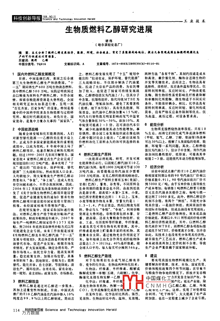 科技創(chuàng)新導報 ence and technology innovation Her工業(yè)技術生物質燃料乙醇研究進展胡偉哈爾濱輕化總廠)摘要:本文分新了艦料乙醇發(fā)展經(jīng)濟,能源、環(huán)境、社會數(shù)益,肯定了其能源戰(zhàn)略地位,提出幾條實現(xiàn)我國生物羈稈規(guī)?;a(chǎn)的可行性建議以資借鑒關鍵詞:料乙蓐中圖分類號:TQ016文獻標識碼:A文章編號:1674-098X(2008)04(b)-0114-01國內(nèi)外燃料乙醇發(fā)展概況之,燃料乙醇發(fā)展實現(xiàn)了“十五”規(guī)劃中兩種方法“各有千秋”,其制約因秦是成本目前,中國是繼巴西、美國之后全球提出的“拉動農(nóng)業(yè)、保護環(huán)境、替代能源”和高效、廉價催化劑、酶和合適微生物的第三大生物燃料乙醇生產(chǎn)和消費國?!笆髴?zhàn)略目標,不僅部分解決了汽油緊開發(fā)等關健技術??偠灾?生物法具有五”期間將生產(chǎn)600萬噸生物液態(tài)燃料拉動了大宗農(nóng)產(chǎn)品的消費,為農(nóng)民增選擇性、活性好、反應條件溫和等優(yōu)點,但其中燃料乙醇500萬噸。實踐證明我國過加了收入,也促進了國家可持續(xù)發(fā)展戰(zhàn)原料利用率低、反應時間長、產(chǎn)物濃度低去以糧食為原料生產(chǎn)燃料乙醇,不符合國略。乙醇燃燒值僅為汽油2/3,但其分子及酶、微生物活性易受影響且纖維素降解情,探索非糧能源資源是大勢所趨。全國中含氧,抗爆性能好,取代傳統(tǒng)MTBE為和單糖轉化所需酶、微生物適于不同反應相關研究正如火如荼進行著,呈現(xiàn)一派汽油抗爆、增氧添加劑,避免了其毒害性條件,不能很好耦合。相比,化學法具有“百花齊放,百家爭鳴”的景象。特別是籌(致癌,地下水污染),具有優(yōu)良能源,環(huán)原料利用率高、反應時間短、催化劑構成建中的中國科學院青島生物能源與過程研保效益。如汽油中乙醇添加量≤15%時,簡單、沒有嚴格反應條件限制等優(yōu)點,但究所,順應時代潮流而生,肩負歷史,國對汽車行駛性能無明顯影響而尾氣中溫室為高溫、高壓過程,對設備要求高家使命,是集中力量辦大事的“國家隊”。氣體含量降低30%-50%。添加10%,其辛烷值可提高2-3倍,還可清潔汽車引6能效分析中國能源戰(zhàn)略擎,減少機油替換使其動力性能增加。事生物質直接燃燒熱效率很低,只有I0隨著全球變暖和化石能源消耗,人們非偶然,聯(lián)合國工業(yè)發(fā)展組織就在維也納%左右,而將它們轉化成氣體或液體燃料對新型替代能源——乙醇的關注度日益上乙醇專題討論會上提出:“乙醇應該被當(甲烷、氫氣、乙醇、丁醇、柴油等)熱效率升,正成為許多國家新能源政策的重要組作燃料和化工原料永久的和可供選擇的來可達30%以上,緩解了人類面臨的資源,能成部分。以此為契機,8年前中國上馬了源源、環(huán)境等一系列問題。其次,乙醇燃燒燃料乙醇項目,也意在解決過剩陳化糧問值僅為汽油2/3,但分子中含氧,用作汽油題。經(jīng)過1999-2005幾年閫不懈努力,國4燃料乙醇生產(chǎn)原料添加劑抗暴性能好、低排放,可提高其辛家首批4家燃料乙醇定點生產(chǎn)企業(yè)完成了次能源必將耗竭,研究、開發(fā)可再烷值2~3倍,還能使汽車動力性能增加等。規(guī)劃建設的102萬噸產(chǎn)能,基本實現(xiàn)了“十生能源勢在必行。以混配乙醇汽油(E10乙五”提出的“拉動農(nóng)業(yè)、保護環(huán)境、替代醇汽油)為例,每用1000萬噸就可節(jié)省1007經(jīng)濟分析能源”三大戰(zhàn)略目標。然而我國人口眾多,萬噸汽油,而要提煉這些汽油至少需要目前中國試點推廣的E10乙醇汽油價人均耕地少,用大量糧食生產(chǎn)燃料乙醇必300萬噸原油,足見乙醇的能源戰(zhàn)略地位。格按國家同期公布的90號汽油出廠價乘以然要和人“爭食”、“爭土地”,造成人類生燃料L醇生產(chǎn)原料主要有玉米(美國)、價格系數(shù)0.911。90號汽油目前出廠價不存空間越來越小,不符合我國國情。因此,甘蔗(巴西)、薯類、谷類等。不同原料全到5000元/噸。由于玉米價格上漲導致生2006年12月國家發(fā)改委和財政部聯(lián)合下生命周期的能量效益也不同,由高到低依產(chǎn)成本增加,每銷售1噸燃料乙醇耍虧損數(shù)發(fā)了《關于加強生物燃料乙醇項目建設管次是甜甘蔗、甜高梁>木薯>玉米、小麥。百元且在汽油多次提價之前,每噸虧損理、促進產(chǎn)業(yè)健康發(fā)展的通知》要求生物如巴西甘蔗能鬟比達到1:8以上,玉米、度達到了1000多元。此外,燃料乙醇定價燃料乙醇項目建設需經(jīng)國家投資主管部門小麥等糧食作物及木薯、甘薯大約是1:機制不合理,有兩個“倒掛”,不能充分體核準,未經(jīng)國家核誰不得增加產(chǎn)能。1.3-1.4,產(chǎn)生正效益。然而以糧食為原現(xiàn)其價值:一是油價倒掛,我國原油價格在規(guī)劃實施中,國家采取國際通行儆料,勢必與人“爭糧"、“爭地”,利用非糧和國際市場接軌,但成品油沒有實現(xiàn)接軌法,對燃料乙醇生產(chǎn)給予財政補貼和產(chǎn)業(yè)資源是大勢所趨。非糧資源包括木薯、甘二是燃料乙醇產(chǎn)品價格倒掛。原本成品油每生產(chǎn)一噸燃料乙醇國家給予1373元補業(yè)、工業(yè)、生活廢料等纖維素、半纖維素、料乙醇經(jīng)濟性就很差。另外,以燃料乙醇到2008年底將采取彈性補貼方式以盡木素及其它可用生物有機質資源。其中,取代高價MTBE,而燃料乙醇各