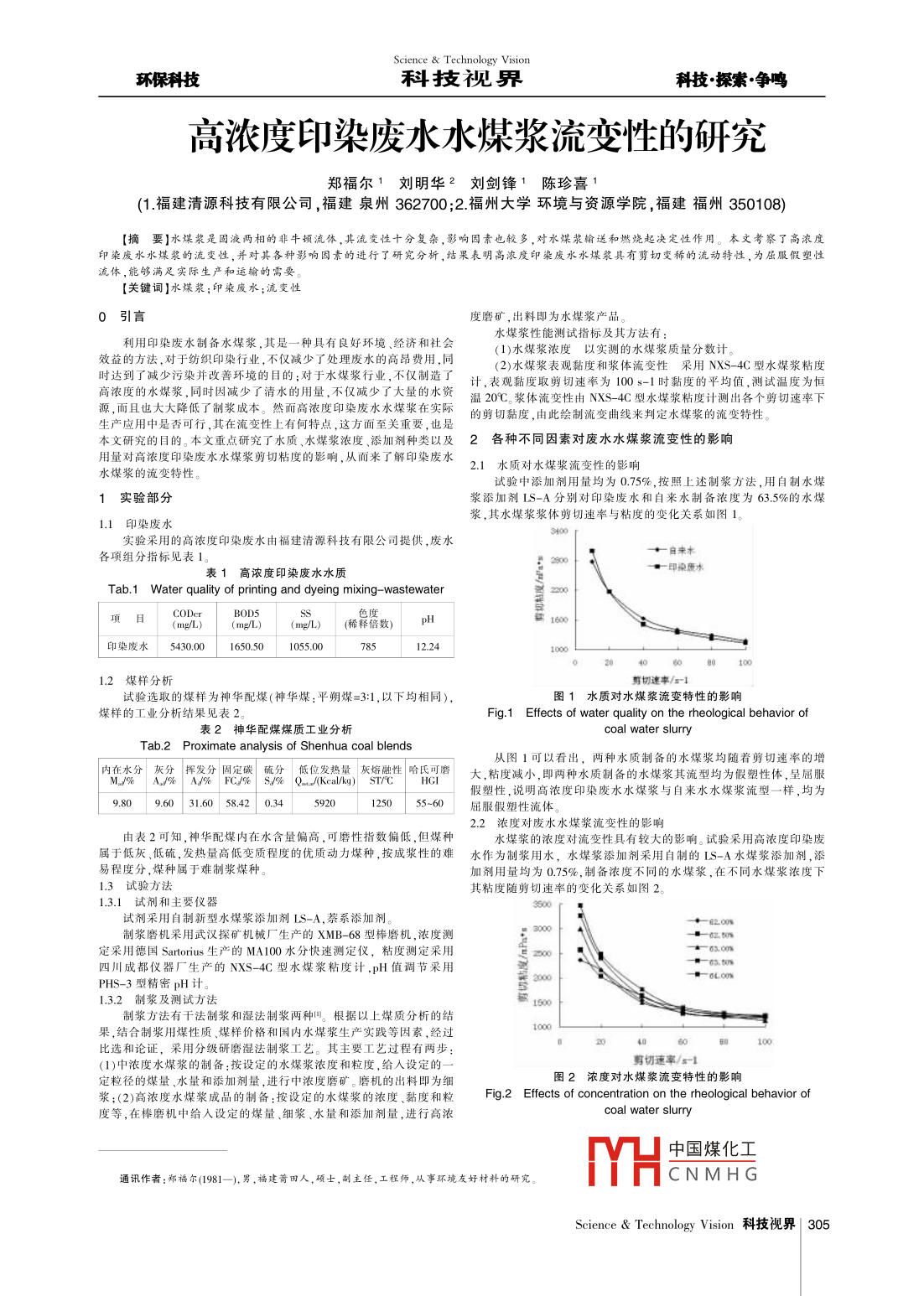 Science Technology vision環(huán)??萍伎萍家暯缈萍继剿鳡?zhēng)鳴高濃度印染廢水水煤漿流變性的研究鄭福爾1劉明華2劉劍鋒1陳珍喜1(1福建淸源科技有限公司,福建泉州362700;2福州大學(xué)環(huán)境與資源學(xué)院,福建福州350108)【摘要】水煤漿是固液兩相的非牛頓流烋,其流變性十分復(fù)雜,影響因素也較多,對(duì)水煤漿蝓送和燃燒起決定性作用。本文考察了高濃度印染廢水水煤漿的流變性,并對(duì)其各種影響因素的進(jìn)行了研究分析,結(jié)果表明高濃度印染廢水水煤漿具冇剪切變稀的流動(dòng)特性,為屈服假塑性流體,能夠滿足實(shí)際生產(chǎn)和運(yùn)輸?shù)男枰??!娟P(guān)鍵詞】水煤漿;印染廢水;流0引言度磨礦,出料即為水煤漿產(chǎn)品水煤漿性能測(cè)試指標(biāo)及其方法有利用印染廢水制備水煤漿,其是一種具有良好環(huán)境、經(jīng)濟(jì)和社會(huì)益的方法,對(duì)于紡織印染行業(yè),不僅減少了處理廢水的高昂費(fèi)用,同1)水煤漿濃度以實(shí)測(cè)的水煤漿質(zhì)量分?jǐn)?shù)計(jì)。(2)水煤漿表觀黏度和漿體流變性采用NXS-4C型水煤漿粘度時(shí)達(dá)到了減少污染并改善環(huán)境的目的;對(duì)于水煤漿行業(yè),不僅制造了計(jì),表觀黏度取剪切速率為1001時(shí)黏度的平均值,測(cè)試溫度為恒高濃度的水煤漿,同時(shí)因減少了清水的用量,不僅減少了大量的水資溫20℃漿體流變性由NXS4C型水煤漿粘度計(jì)測(cè)出各個(gè)剪切速率下源,而且也大大降低了制漿成本。然而高濃度印染廢水水煤漿在實(shí)際的剪切黏度,由此繪制流變曲線來判定水煤漿的流變特性產(chǎn)應(yīng)用中是否可行,其在流變性上有何特點(diǎn),這方面至關(guān)重要,也是本文研究的目的。本文重點(diǎn)研究了水質(zhì)、水煤漿濃度、添加劑種類以及2各種不同因素對(duì)廢水水煤漿流變性的影響用量對(duì)高濃度印染廢水水煤漿剪切粘度的影響,從而來了解印染廢水水煤漿的流變特性。2.1水質(zhì)對(duì)水煤漿流變性的影響試驗(yàn)中添加劑用量均為0.75%,按照上述制漿方法,用自制水煤1實(shí)驗(yàn)部分漿添加劑LS-A分別對(duì)印染廢水和自來水制備濃度為63.5%的水煤漿,其水煤漿漿體剪切速率與粘度的變化關(guān)系如圖1。1.1印染廢水實(shí)驗(yàn)采用的高濃度印染廢水由福建清源科技有限公司提供,廢水各項(xiàng)組分指標(biāo)見表1一自來水表1高濃度印染廢水水質(zhì)印乘廢水Tab 1 Water quality of printing and dyeing mixing-wastewaterODerBODS印染廢水5430.0016505010550012.2412煤樣分析剪切速率/x1試驗(yàn)選取的煤樣為神華配煤(神華煤:平朔煤=3:1,以下均相同)1水質(zhì)對(duì)水煤漿流變特性的影響煤樣的工業(yè)分析結(jié)果見表2Fig 1 Effects of water quality on the rheological behavior of表2神華配煤煤質(zhì)工業(yè)分析Tab2 Proximate anof shenhua coal blends從圖1可以看出,兩種水質(zhì)制備的水煤漿均隨著剪切速率的增內(nèi)在水分灰分揮發(fā)分CS/% Qot/(Kcal/ky低位發(fā)熱量灰倍性哈氏可大,粘度減小,即兩種水質(zhì)制備的水煤漿其流型均為假塑性體,呈屈服假塑性,說明高濃度印染廢水水煤漿與自來水水煤漿流型一樣,均為9809.60316058.42034125055-60屈服假塑性流體2.2濃度對(duì)廢水水煤漿流變性的影響由表2可知,神華配煤內(nèi)在水含量偏高,可磨性指數(shù)偏低,但煤種水煤漿的濃度對(duì)流變性具有較大的影響。試驗(yàn)采用高濃度印染廢屬于低灰、低硫,發(fā)熱量高低變質(zhì)程度的優(yōu)質(zhì)動(dòng)力煤種,按成漿性的難水作為制漿用水,水煤漿添加劑采用自制的IS-A水煤漿添加劑,添易程度分,煤種屬于難制漿煤種。加劑用量均為0.75%,制備濃度不同的水煤漿,在不同水煤漿濃度下13試驗(yàn)方法其粘度隨剪切速率的變化關(guān)系如圖2。13.1試劑和主要儀器3500試劑采用自制新型水煤漿添加劑LS-A,萘系添加劑一E200制漿磨機(jī)采用武漢探礦機(jī)械廠生產(chǎn)的MB-68型棒磨機(jī),濃度測(cè)3000《2定采用德國 Sartorius生產(chǎn)的MA100水分快速測(cè)定儀,粘度測(cè)定采用四川成都儀器廠生產(chǎn)的NXS-4C型水煤漿粘度計(jì),pH值調(diào)節(jié)采用一63N一640PHS-3型精密pH計(jì)。1.3,2制漿及測(cè)試方法制漿方法有干法制漿和濕法制漿兩種叫。根據(jù)以上煤質(zhì)分析的結(jié)果,結(jié)合制漿用煤性質(zhì)、煤樣價(jià)格和國內(nèi)水煤漿生產(chǎn)實(shí)踐等因素,經(jīng)過匕選和論證,采用分級(jí)研磨濕法制漿工藝。其主要工藝過程有兩步(1)中濃度水煤漿的制備:按設(shè)定的水煤漿濃度和粒度,給入設(shè)定的剪切速率/s1定粒徑的煤量、水量和添加劑量,進(jìn)行中濃度磨礦。磨機(jī)的出料即為細(xì)圖2濃度對(duì)水煤漿流變特性的影響漿;(2)高濃度水煤漿成品的制備:按設(shè)定的水煤漿的濃度、黏度和粒Fg2 Effects of concentration on the rheological behavior of度等,在棒磨機(jī)中給入設(shè)定的煤量、細(xì)漿、水量和添加劑量,進(jìn)行高濃coal water slur中國煤化工通訊作者:鄭福爾(1981—),男,福建箭田人,頤士,副主任,工程師,從事環(huán)境友好材料的研究CNMHGScience& Technology Vision科技視界305Science Technology vision科技探紫爭(zhēng)鳴科技視界環(huán)保利技從圖2可以看出,濃度對(duì)高濃度印染廢水水煤漿的流變性也有影2.3.2添加劑用量對(duì)廢水水煤漿流