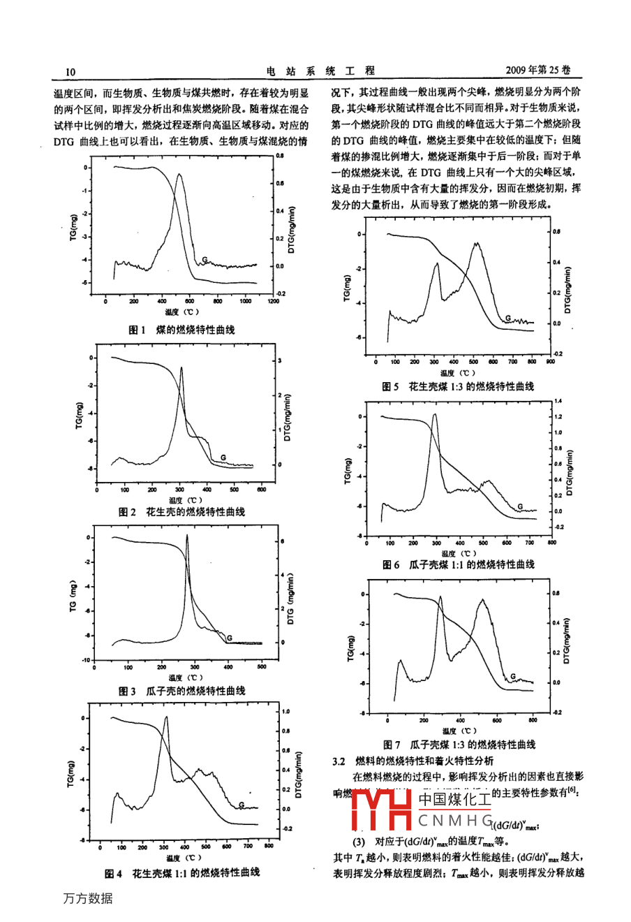 第25卷第4期站系統(tǒng)工程VoL25 No 42009年7月System Engineering文章編號:1005-006X(200904000904生物質(zhì)與煤的混合燃燒實驗研究程樹仁1劉亮2(1.山西電力職業(yè)技術(shù)學(xué)院,2長沙理工大學(xué))摘要:為了解生物質(zhì)和煤的混燃特性,利用熱天平對生物質(zhì)、煤及其混合試樣進行了熱重實驗研究,考察各種試樣的著火溫度、燃燒速率最大時溫度、燃盡溫度和最大燃燒速率等燃燒特征參數(shù),并對實驗數(shù)據(jù)進行了分析處理,求出了反應(yīng)的動力學(xué)參數(shù)活化能E和頻率因子A.結(jié)果表明,同煙煤比較,生物質(zhì)有較低的燃燒特征溫度和較快的燃燒速率·在煙煤中加入生物質(zhì)共燃后,著火燃燒提前時可以獲得更好的燃盡特性關(guān)鍵詞:生物質(zhì);煤;熱重實驗;動力學(xué)參數(shù);實驗研究中圖分類號:TK16.文獻標(biāo)識碼:AExperimental Research on Co-combustion of Biomass and CoalCHENG Xu-ren, LIU LiangAbstract: In order to obtain the co-combustion properties of biomass and coal, the thermalgravimetric analyses wereused to study the properties of blended samples, the combustibility characteristic parameters such as ignition temperature,peak temperature at maximum weight loss rate, burnout temperature, maximum rate of combustion would be investigatedAfter dealing with experimental data, the kinetics parameter E and A were obtained. The experimental results show thatthe lower ignition temperature and better burnout property can be achieved for the biomass than coalKey words: biomass; coal; thermal analysis; kinetics parameters; experimental research能源與環(huán)境是當(dāng)今世界發(fā)展的兩大主題,是人們關(guān)注的焦點,隨著全球工業(yè)進程不斷加快,經(jīng)濟發(fā)展飛速增長,化1樣品采集石能源消耗不斷增加,而化石能源的過度開采和使用給環(huán)境本次實驗用生物質(zhì)為花生殼與瓜子殼,干燥后研磨并篩保護帶來了巨大的壓力,人們深刻地認識到化石能源的有限分,采集140目花生殼粉和瓜子殼粉作為實驗的分析樣品性和環(huán)境污染問題。這就要求開發(fā)出有利于改善環(huán)境的可再煤樣采用寧鄉(xiāng)煤碳壩煙煤,140目。生能源,而在各種可再生能源中生物質(zhì)能是唯一可有效存儲太陽能的可再生能源,對其的合理開發(fā)和高效利用將有助2生物質(zhì)與煤的工業(yè)分析實驗緩解國民經(jīng)濟快速發(fā)展對能源需求的壓力另外,生物質(zhì)對煤樣、花生殼、瓜子殼試樣及其混合試樣(按1:1、是一種清潔的可再生能源,它的硫、氮含量均較低,灰分也13的質(zhì)量比例混合)進行工業(yè)分析,工業(yè)分析結(jié)果見表很少,所以燃燒后SO2、NO2和灰塵的排放量比化石燃料小表1試樣工業(yè)分析得多。同時,生物質(zhì)對生態(tài)環(huán)境具有CO2零排放的特點,這工業(yè)分析對減輕日益嚴(yán)重的大氣煙塵、酸雨現(xiàn)象、溫室效應(yīng)必將有著分析樣品發(fā)分固定碳非常重要的作用口煤24.5594426271053930.282花生殼725538387156372017.2027我國是農(nóng)業(yè)大國,生物質(zhì)資源十分豐富,我國生物質(zhì)能7479552338673484155175占一次能源總量的33%,是僅次于煤的第二大能源,生物花生殼煤=1:150.063424.0704687421.9788花生殼煤-1335.164833406022618291674質(zhì)在我國能源消耗中占有舉足輕重的地位,在全部能源消耗瓜子殼煤=1:15156702330094471920.6602中約占20%,在農(nóng)村能源消費中約占生活用能的70%,我巫子殼煤133516723893258362384國生物質(zhì)資源大部分是單獨燃燒,利用效率低,能量損失嚴(yán)3生物質(zhì)與煤混合燃燒的熱重分析實驗重,不僅造成大氣污染,還嚴(yán)重破壞生態(tài)環(huán)境,因此采用生物質(zhì)與煤混燒的方法提高利用效率具有重要意義在大型的實驗在空氣氣氛中進行,升溫速率:20℃/min;試樣燃煤電廠中使用生物質(zhì)與煤混合作為原料,不僅提高了生物質(zhì)量:10mg;溫度變化范圍:20-1000℃質(zhì)的利用效率,同時設(shè)備不需要進行太大的改動,降低了投資費用。所以對生物質(zhì)與煤混燒進行深入的理論研究具有中國煤化工樣的To曲線,對TG十分重要的現(xiàn)實意義曲線CNMH〔微分熱重曲線DTG收稿日期:200903-19如圖1~圖7所示程樹仁(1967,男,講師。太原,030021從TG曲線上可以看出,煤的燃燒過程基本集中在一個電站系統(tǒng)工程第25卷溫度區(qū)間,而生物質(zhì)、生物質(zhì)與煤共燃時,存在著較為明顯況下,其過程曲線一般出現(xiàn)兩個尖峰,燃燒明顯分為兩個階的兩個區(qū)間,即揮發(fā)分析出和焦炭燃燒階段。隨著煤在混合段,其尖峰形狀隨試樣混合比不同而相異。對于生物質(zhì)來說,試樣中比例的增大,燃燒過程逐漸向高溫區(qū)域移動。對應(yīng)的第一個燃燒階段的DrG曲線的峰值遠大于第二個燃燒階段DTG曲線上也可以看出,在生物質(zhì)、生物質(zhì)與煤混燒的情的DTG曲線的峰值,燃燒主要集中在較低的溫度下;但隨著煤的摻混比例增大,燃燒逐漸集中于后一階段:而對于單的煤燃燒來說,在DTG曲線上只有一個大的尖峰區(qū)域這是由于生物質(zhì)中含有大量的揮發(fā)分,因而在燃燒初期,揮發(fā)分的大量析出,從而導(dǎo)致了燃燒的第一階段形成。溫度(c)圖1煤的燃燒特性曲線圖5花生殼煤1:3的燃燒特性曲線圖2花生殼的燃燒特性曲線溫度(℃圖6瓜子殼煤1:1的燃燒特性曲線度(℃)圖3瓜子殼的燃燒特性曲線溫度(℃)圖7瓜子殼煤1:3的燃燒特性曲線3.2燃料的燃燒特性和著