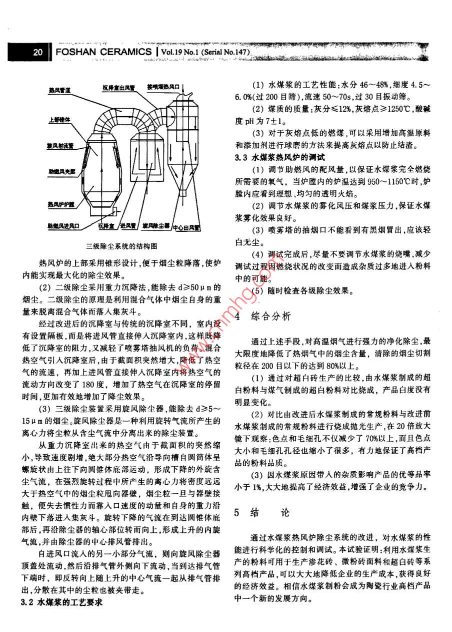 ,4,如地小品,,她把動瀏與孫t200年第1期(第147期)|佛山陶瓷水煤漿在高檔拋光磚制粉生產(chǎn)中的應用夏維煌(九江諾貝爾陶瓷有限公司江西九江332000摘要本文對水煤漿作為燃料,在陶瓷廠噴霧塔制粉中對粉料造成污染的過程及機理作了闡述和分析,并從熱風爐的除塵系統(tǒng)、水煤漿的工藝控制和調(diào)試手段三個方面介紹了相應的解決方法,使利用水煤漿生產(chǎn)的粉料能夠用于生產(chǎn)滲花磚、微粉磚面料和超白磚等系列高檔產(chǎn)品成為現(xiàn)實,大大地降低了企業(yè)的生產(chǎn)成本,取得了良好的經(jīng)濟效益。關鍵詞水煤漿,熱風爐,除塵系統(tǒng)1前言點,降低了產(chǎn)品的白度;嚴重時,由于鐵質(zhì)溫度低,使產(chǎn)品拋光后產(chǎn)生熔洞,從而大大影響了產(chǎn)品品質(zhì)。由于這些雜隨著資源的不斷短缺能源的價格在飛速上漲,為了質(zhì)的粒徑尺寸在75μm以下的達80%以上,而工藝要求提高市場的競爭力,陶瓷行業(yè)對生產(chǎn)成本的控制越來越嚴進噴霧塔的溫度又必須保證在650℃以上,所以給除去格。水煤漿作為一種價廉的燃料,其在熱風爐中燃燒后產(chǎn)這些雜質(zhì)帶來了極大的困難。如何將這些雜質(zhì)在進行噴生的熱煙氣和配風空氣形成的混合熱氣體作為噴霧塔的霧造粒熱交換之前除去(高溫除塵),成為水煤漿熱風爐熱源一直被生產(chǎn)低檔磚的噴霧塔所使用,近年來被陶瓷生制造商和陶瓷生產(chǎn)廠家亟待解決的難題。產(chǎn)廠家用作拋光磚制粉的燃料而越來越受到重視。在利用過程中盡管燃料成本得到大大降低,但由于水煤漿燃燒后3解決方式帶入了雜質(zhì),對粉料造成了污染,使產(chǎn)品的白度明顯下降,降低了產(chǎn)品的品質(zhì);再加上水煤漿熱風爐的操作困難,造筆者憑著多年對水煤漿在噴霧塔制粉中的生產(chǎn)經(jīng)成粉料質(zhì)量的不穩(wěn)定,影響了產(chǎn)品的優(yōu)等品率,這就大大驗再結(jié)合理論從水煤漿熱風爐的除塵系統(tǒng)、水煤漿的性制約了水煤漿在高檔拋光磚制粉生產(chǎn)中的應用。能和熱風爐的調(diào)試手段三個方面來加以闡述,以達到生因此,目前生產(chǎn)高檔拋光磚系列產(chǎn)品的企業(yè),僅僅將產(chǎn)高檔拋光磚的目的。其用作微粉拋光磚底料的制粉生產(chǎn)工序,而無法將其用3.1水煤漿熱風爐的除塵系統(tǒng)于微粉拋光磚面料、滲花磚坯料和超白磚坯料等高檔系除塵系統(tǒng)采用三級除塵設計,即:熱風爐上部錐體為列產(chǎn)品的制粉生產(chǎn)中。級除塵;重力沉降室為二級除塵;旋風除塵器為三級除塵(結(jié)構(gòu)見下圖)。2粉料污染的過程和機理(1)一級除塵采用熱風爐的上部錐體設計和助燃風相結(jié)合的旋風除塵原理能除去d≥100μm的煙塵。改進水煤漿在水煤漿熱風爐中燃燒產(chǎn)生的熱煙氣,在噴霧后的熱風爐將以前的單層金屬爐殼內(nèi)襯保溫材料改為雙塔抽風機強大的抽力作用下將未完全燃燒的煤灰、微小的層金屬夾層熱風爐,雙層金屬夾層達100m厚的空氣層,鐵質(zhì)和不能燃燒的高溫微顆粒帶進了噴霧塔中,在與泥漿既降低了爐內(nèi)壁的溫度,又可充分利用夾層預熱助燃風。進行熱交換的過程中又混進了粉料造成了粉料的污染爐內(nèi)壁設置旋風射流助燃風管,這些旋風射流助燃風管這些粉料在壓制成形后經(jīng)窯爐高溫燒成,雜質(zhì)中的在助燃風機的作用下形成比較強的旋流,既延長了水煤鐵呈現(xiàn)多種價態(tài)的混合物(Fe"、Fe”等),形成紅色、黃色、漿在爐內(nèi)的停留時間保證了燃料的充分燃燒又讓旋流淺黃色褐色和黑色等顏色,經(jīng)拋光機拋光后在20倍放風產(chǎn)生的離心力將煙氣中的大顆粒煙塵甩向爐內(nèi)壁起大鏡下觀察,會看到大大小小的針孔,以及顏色各異的色到除塵作用FOSHAN CERAMICS I VoL19 No. 1(Serial No 147)熱風道抗降室出鳳管嘴熱風日(1)水煤漿的工藝性能:水分46~48%,細度45~6.0%(過200目篩),流速50~70s,過30目振動篩。(2)煤質(zhì)的質(zhì)量:灰分≤12%,灰熔點≥1250℃,酸堿上部健體度pH為7±1。3)對于灰熔點低的燃煤,可以采用增加高溫原料變風射和添加劑進行球磨的方法來提高灰熔點以防止結(jié)渣。3.3水煤漿熱風爐的調(diào)試風亮顯(1)調(diào)節(jié)助燃風的配風量,以保證水煤漿完全燃燒所需要的氧氣,當爐膛內(nèi)的爐溫達到950~1150℃時,爐膛內(nèi)應看到理想、均勻的透明火焰熱風爐爐黑2)調(diào)節(jié)水煤漿的霧化風壓和煤漿壓力,保證水煤漿霧化效果良好。助覺民進風口抗室進風管/旋風塵器/心出(3)噴霧塔的抽煙口不能看到有黑煙冒出,應該輕三級除塵系統(tǒng)的結(jié)構(gòu)圖白無塵。(4)調(diào)試完成后,盡量不要調(diào)節(jié)水煤漿的燒嘴,減少熱風爐的上部釆用錐形設計,便于煙塵粒降落使爐調(diào)試過程因燃燒狀況的改變而造成雜質(zhì)過多地進入粉料內(nèi)能實現(xiàn)最大化的除塵效果。(2)二級除塵釆用重力沉降法能除去d≥50m的中的可能。(5)隨時檢查各級除塵效果。煙塵。二級除塵的原理是利用混合氣體中煙塵自身的重量來脫離混合氣體而落入集灰斗。4綜合分析經(jīng)過改進后的沉降室與傳統(tǒng)的沉降室不同,室內(nèi)沒有設置隔板,而是將進風管直接伸入沉降室內(nèi),這樣既降通過上述手段,對高溫煙氣進行強力的凈化除塵,最低了沉降室的阻力,又減輕了噴霧塔抽風