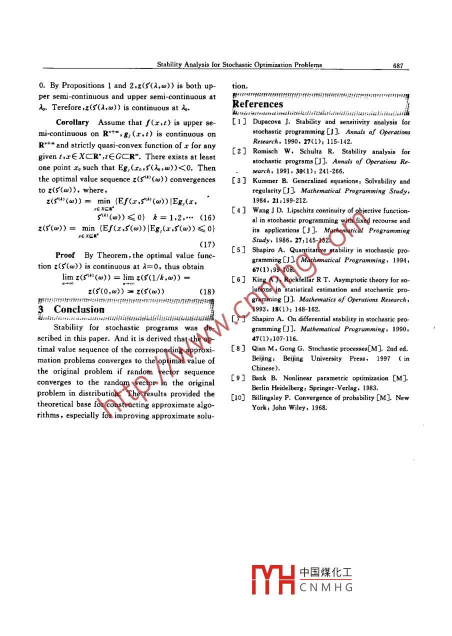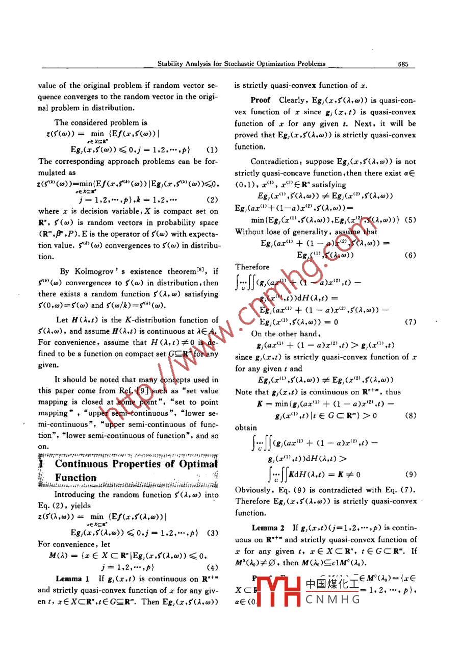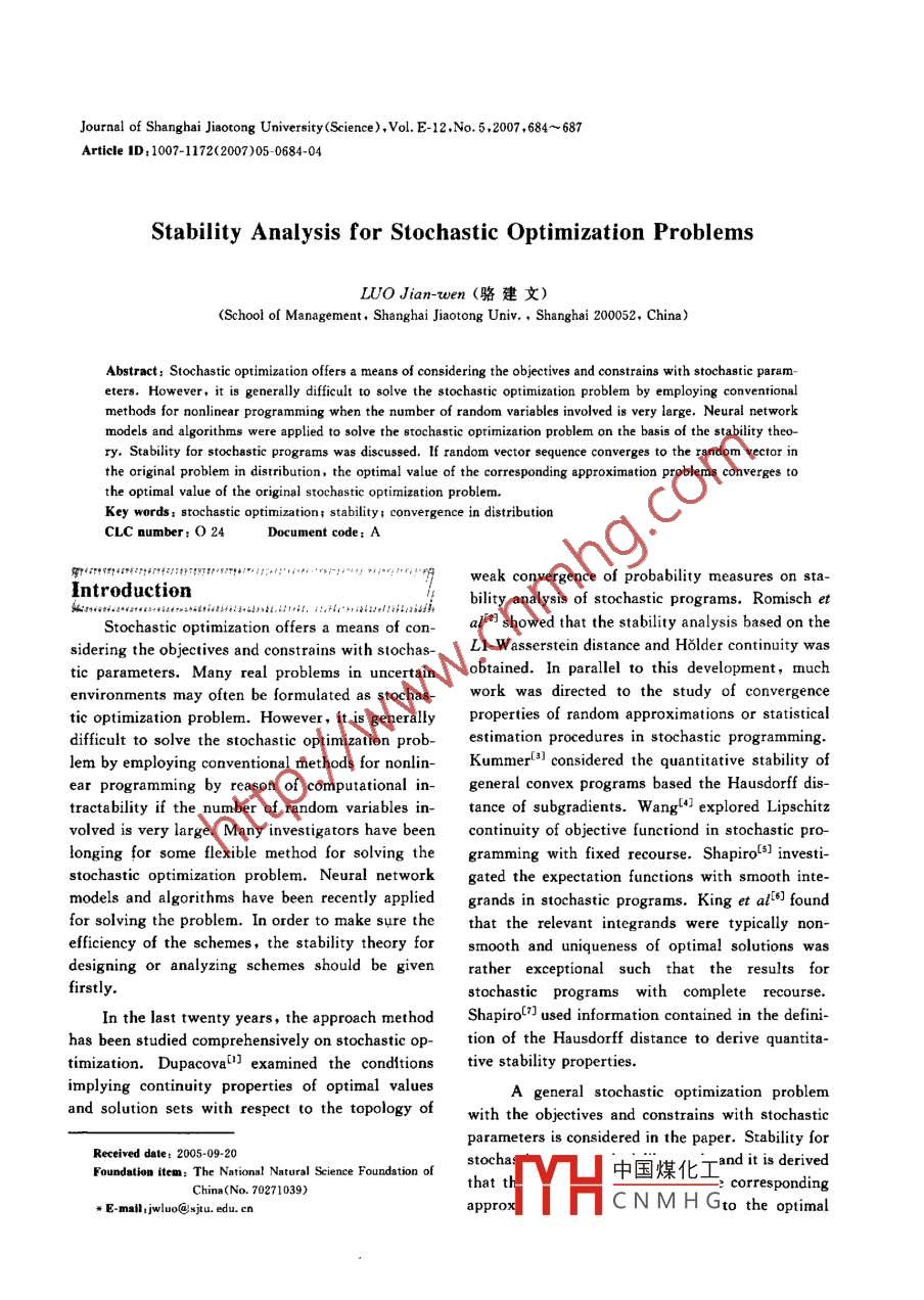 Journal of Shanghai Jiaotong University(Science) , Vol. E-12.No. 5,2007 ,684~ 687Article ID: 1007-1172(2007)05 0684-04Stability Analysis for Stochastic Optimization ProblemsLUO Jian-wen (駱建文)(School of Management,Shanghai Jiaotong Univ. , Shanghai 200052. China)Abstract: Stochastic optimization offers a means of considering the objectives and constrains with stochastic param-eters. However, it is generally difficult to solve the stochastic optimization problem by employing conventionalmethods for nonlinear programming when the number of random variables involved is very large. Neural networksmodels and algorithms were applied to solve the stochastic optimization problem on the basis of the stability theo-ry. Stability for stochastic programs was discussed. If random vector sequence converges to the random vector inthe original problem in distribution, the optimal value of the corresponding approximation problems converges tothe optimal value of the original stochastic optimization problem.Key words: stochastic optimization; stability; convergence in distributionCLC number: O 24Document code: Aweak convergence of probability measures on sta-Introductionbility analysis of stochastic programs. Romisch etStochastic optimization offers a means of con-al[2] showed that the stability analysis based on thesidering the objectives and constrains with stochas-L1-W asserstein distance and Holder continuity wastic parameters. Many real problems in uncertainobtained. In parallel to this development, muchenvironments may often be formulated as stochas-work was directed to the study of convergencetic optimization problem. However, it is generallyproperties of random approximations or statisticaldifficult to solve the stochastic optimization prob-estimation procedures in stochastic programming.lem by employing conventional methods for nonlin-Kummer[3] considered the quantitative stability ofear programming by reason of computational in-general convex programs based the Hausdorff dis-tractability if the number of random variables in-tance of subgradients. Wang[41] explored Lipschitzvolved is very large. Many investigators have beencontinuity of objective functiond in stochastic pro-longing for some flexible method for solving thegramming with fixed recourse.Shapiro-s] investi-stochastic optimization problem. Neural networkgated the expectation functions with smooth inte-models and algorithms have been recently appliedgrands in stochastic programs. King et ali6] foundfor solving the problem. In order to make sure thethat the relevant integrands were typically non-efficiency of the schemes, the stability theory forsmooth and uniqueness of optimal solutions wasdesigning or analyzing schemes should be givenrather exceptional such that the results forfirstly.stochastic programs with complete recourse.In the last twenty years, the approach methodShapirolJ used information contained in the defini-has been studied comprehensively on stochastic op-tion of the Hausdorff distance to derive quantita-timization. DupacovaCexamined the conditionstive stability properties.implying continuity properties of optimal valuesA general stochastic optimization problemand solution sets with respect to the topology 0with the objectives and constrains with stochasticparameters is considered in the paper. Stability forReceived date: 2005-09-20Foundation item: The National Natural Science Foundation ofstochas-and it is derived中國(guó)煤化工China(No. 70271039)that th? correspponding# E-mall: jwluo@xju. edu. cnapproxYHCNMHGtotheoptimalStability Analysis lor Stochastic Optimization Problems685value of the original problem if random vector se-is strictly quasi-convex function of x.quence converges to the random vector in the origi-Proot Clearly, Eg,(x,$(A,w)) is quasi-con-nal problem in distribution.vex function of x since g;(x,t) is quasi-convexThe considered problem isfunction of x for any given t. Next, it will bez(5(w)) = min {Ef(x,S(w))|proved that Eg,(r ,$(A,w)) is strictly quasi-convexEg,(x,$(w))≤0,j= 1,2...,p} (1)function.The corresponding approach problems can be for-Contradiction: suppose Eg,(x,S(A,w)) is notmulated asstrictly quasi-concave function ,then there exist a∈z(s'4)(w))=min{Ef(x ,5"*(w))|Eg;(x ,$"(如))≤0,(0,1), x1', x°'∈R* satisfyingEg,(r" ,$(X,w))≠Eg,(x<2) ,$(A,w))j= 1,2**,p},k= 1,2,..(2)where x is decision variable,X is compact set onEg,(ax["'+(1-a)x'2) ,$(A,u))=R", 5(w) is random vectors in probility spacemin (Eg(x") ,5(,u)),Eg,(x(2) ,s(),w))} (5)(R" ,β" ,P). E is the operator of $(w) with expecta-Without lose of generality , assume thattion value. s"(w) convergences to $(w) in distribu-Eg,(ax")+ (1一a)x(2),$(),w)) =tion.Eg,("' ,5(A,w))(6)By Kolmogrov' s existence theorem[8], ifTherefore5*)(w) convergences to $(w) in distribution, thenf8;(ax"" +(1-2>x*9.1)-there exists a random function $ (λ, w) satisfying8g,{("',I))dH(A,t) =5(0,w)=5(w) and $(w/k)= 5")(w).Eg(aI)+ (1一a)x(2) ,5(A,w))一Let H(A,t) is the K-distribution function ofEg;(x[) ,5(),w))= 0(7)5(A,w), and assume H(A,t) is continuous at λ∈A.On the other hand,For convenience, assume that H(A,t)≠0 is de-g,(a1'+ (1 - a)x<2,t)> g,(x'I',t)fined to be a function on compact set GCR" for anysince g,(x,t) is strictly quasi-convex function of xgiven.for any givent andIt should be noted that many concepts used inE,(x ,5(A,w))≠Eg,(x2) ,s(A,w))his paper come from Ref. [9] such as“set valueNote that g,(x,t) is continuous on R*+", thusmapping is closed at some point"," set to pointK = min{g,(ax") + (1一a)x(2),t) -mapping”,“upper semi-continuous"," lower se-g;{(x"',t)|t∈GCR"}> 0(8)mi-continuous”,“upper semi-continuous of func-obtaintion”, "lower semi- continuous of function", and soon.Ff:(ax"*+(. -a)x*", -五Continuous Properties of Optimatg,(x1). ,t))dH(A,t)>F unction_.KdH(.)=K≠0(9)Introducing the random function 5(A,w) intoObviously, Eq. (9) is contradicted with Eq. (7).Therefore Eg, (x,S(A,w)) is strictly quasi-convexEq.