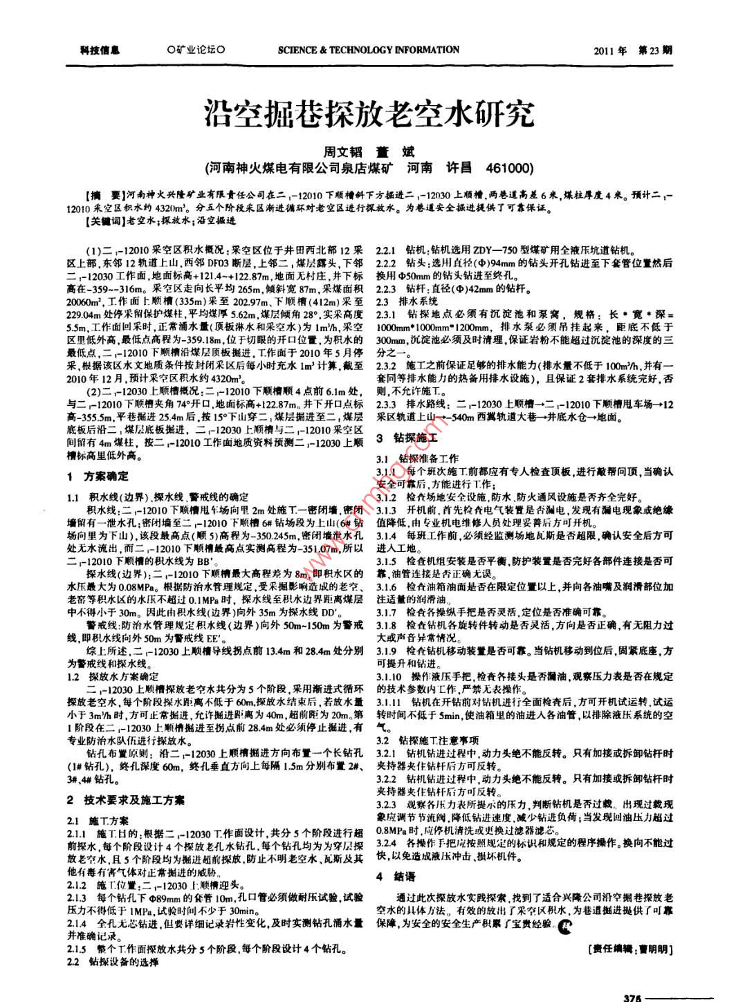 科技信息Q礦業(yè)論壇OSCIENCE TECHNOLOGY INFORMATION2011年第23期沿空掘巷探放老空水研究周文镅董斌(河南神火煤電有限公司泉店煤礦河南許昌461000)【摘要】河南神火興隆礦業(yè)有限貴任公司在二;-12010下順槽斜下方掘進(jìn)二;-12030上順檜兩巷道高差6米煤柱厚度4米。預(yù)計二12010禾空區(qū)積水約432m3。分五個階段采區(qū)漸進(jìn)循環(huán)對老空區(qū)進(jìn)行探放水。為巷道安全攝進(jìn)提供了可靠保證【關(guān)鑣詞】老空水;探放水;沿空極進(jìn)(1)二;-1200采空區(qū)積水概況:采空區(qū)位于井田西北部12采221鉆機(jī):鉆機(jī)選用zDY-750型煤礦用全液壓坑道鉆機(jī)區(qū)上部東鄰12軌道上山,西鄰DF3斷層,上鄰二,煤層露頭,下鄰222鉆頭:選用直徑(中)4mm的鉆頭開孔鉆進(jìn)至下套管位置然后二;-12030工作面地面標(biāo)高+1214-+122.87m,地面無村莊,井下標(biāo)換用φ50mm的鉆頭鉆進(jìn)至終孔高在-359~-316m。采空區(qū)走向長平均265m,傾斜寬87m,釆煤面積22.3鉆桿:直徑(φ)42mm的鉆桿。20060m,工作面上順槽(335m)采至20297m、下順槽(412m)采至2.3排水系統(tǒng)22904m處停采留保護(hù)煤桂,平均煤厚562m,煤層傾角28°,實采高度2.31鉆探地點必須有沉淀池和泵窩,規(guī)格:長·寬·深=55m,工作面回采時,正常浦水量(頂板淋水和采空水)為1mh,采空1000m10m*1200mm,排水泵必須吊掛起來,距底不低于區(qū)里低外高,最低點高程為-359.18m,位于切眼的開口位置,為積水的300mm,沉淀池必須及時清理,保證巖粉不能超過沉淀池的深度的三最低點,二;-12010下順櫝沿煤層頂板掘進(jìn),T作面于2010年5月停分之采根據(jù)該區(qū)水文地質(zhì)條件按封閉采區(qū)后每小時充水1m3計算截至2.32施工之前保證足夠的排水能力(排水量不低于100mh,并有(2)二;-12030上順槽概況:二:-12010下順楨順4點前6lm處,則,不允許施T。與二r-12010下順槽夾角74開口,地面標(biāo)高+12287m。井下開口點標(biāo)23.3排水路線:二r-12030上順檀→二:-12010下順槽甩車場→12高-355.5m,平巷掘進(jìn)254m后,按15°下山穿二,煤層掘進(jìn)至二,煤層采區(qū)軌道上山→540m西冀軌道大巷→井底水倉→地面。底板后沿二,煤層底板掘進(jìn),二r12030上順槽與二-12010采空區(qū)間留有4m煤柱,按二12010工作面地質(zhì)資料預(yù)測二;-1200上順3鉆探施工槽標(biāo)高里低外高。31鉆探準(zhǔn)備工作1方案確定311每個班次施T前都應(yīng)有專人檢查頂板進(jìn)行敲幫問頂,當(dāng)確認(rèn)安全可靠后,方能進(jìn)行T作1.1積水線(邊界)探水線警戒線的確定312檢査場地安全設(shè)施防水防火通風(fēng)設(shè)施是否齊全完好積水線:二-12010下順檀甩钅場向里2m處施T一密閉墻密閉3.1.3開機(jī)前,首先檢査電氣裝置是否漏電,發(fā)現(xiàn)有漏電現(xiàn)象或絕緣墻留有一泄水孔;密閉墻至二r-12010下順檀6#鉆場段為上山(6排鉆值降低,由專業(yè)機(jī)電維修人員處理妥苒后方可開機(jī)場向里為下山),該段最高點(順5)高程為-350245m,密閉墻泄水孔314每班工作前,必須經(jīng)監(jiān)測場地瓦斯是否超限確認(rèn)安全后方可處無水流出,而二;-12010下順槽最高點實測高程為-35107m,所以進(jìn)人工地。二-12010下順槽的積水線為BB'。315檢查機(jī)組安裝是否平衡防護(hù)裝置是否完好各部件連接是否可探水線(邊界):二;-12010下順最大高程差為8m,即積水區(qū)的靠,油管連接是否正確無誤。水壓最大為008MPa。根據(jù)防治水管理規(guī)定,受采掘影響造成的老空、3.1.6檢食油箱油面是否在限定位置以上,并向各油嘴及潤滑部位加老窯等積水區(qū)的水壓不超過0.1MPa時,探水線至積水邊界距離煤層注適量的潤滑油中不得小于30m。因此由積水線(邊界)向外35m為探水線DD'。317檢食各操縱手把是否靈活定位是否準(zhǔn)確可靠警戒線防治水管理規(guī)定積水線(邊界)向外50m-150m為警戒31.8檢查鉆機(jī)各旋轉(zhuǎn)件轉(zhuǎn)動是否靈活,方向是否正確,有無阻力過線即積水線向外50m為警戒線EE。大或聲音異常情況綜上所述,二:12030上順檀導(dǎo)線拐點前134m和284m處分別319檢查鉆機(jī)移動裝置是否可靠。當(dāng)鉆機(jī)移動到位后固緊底座,方為警戒線和探水線可提升和鉆進(jìn)12探放水方案確定310操作液壓手把檢查各接頭是否漏油觀察壓力表是否在規(guī)定二;-12030上順槽探放老空水共分為5個階段采用漸進(jìn)式循環(huán)的技術(shù)參數(shù)內(nèi)工作,嚴(yán)禁無表操作。探放老空水,每個階段探水距離不低于60m,探放水結(jié)束后,若放水量31.1鉆機(jī)在開鉆前對鉆機(jī)進(jìn)行全面檢查后,方可開機(jī)試運轉(zhuǎn)試運小于3mh時,方可正常掘進(jìn),允許掘進(jìn)即離為40m,超前距為20m。第轉(zhuǎn)時間不低于5min,使油箱里的油進(jìn)入各油管,以排除液壓系統(tǒng)的空1階段在二;-12030上順槽掘進(jìn)至拐點前284m處必須停止掘進(jìn),有氣專業(yè)防治水隊伍進(jìn)行探放水。32鉆探施T注意事項鉆孔布置原則:沿二1-12030上順槽掘進(jìn)方向布置一個長鉆孔32鉆機(jī)鉆進(jìn)過程中,動力頭絕不能反轉(zhuǎn)。只有加接或拆卸鉆桿時(1鉆孔),終孔深度60m,終孔垂直方向上每隔15m分別布置2#、夾持器夾住鉆桿后方可反轉(zhuǎn)3排、4#鉆孔。322鉆機(jī)鉆進(jìn)過程中,動力頭絕不能反轉(zhuǎn)。只有加接或拆卸鉆桿時夾持器夾住鉆桿后方可反轉(zhuǎn)2技術(shù)要求及施工方案323觀察各壓力表所提小的壓
