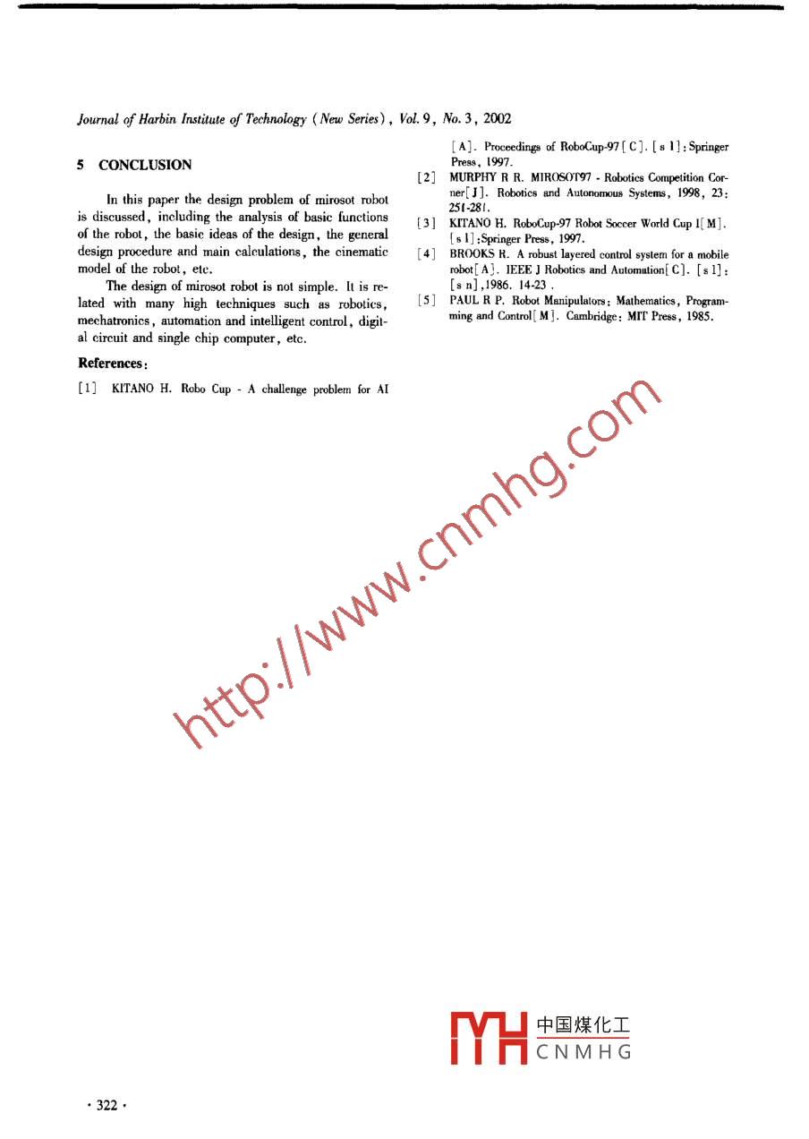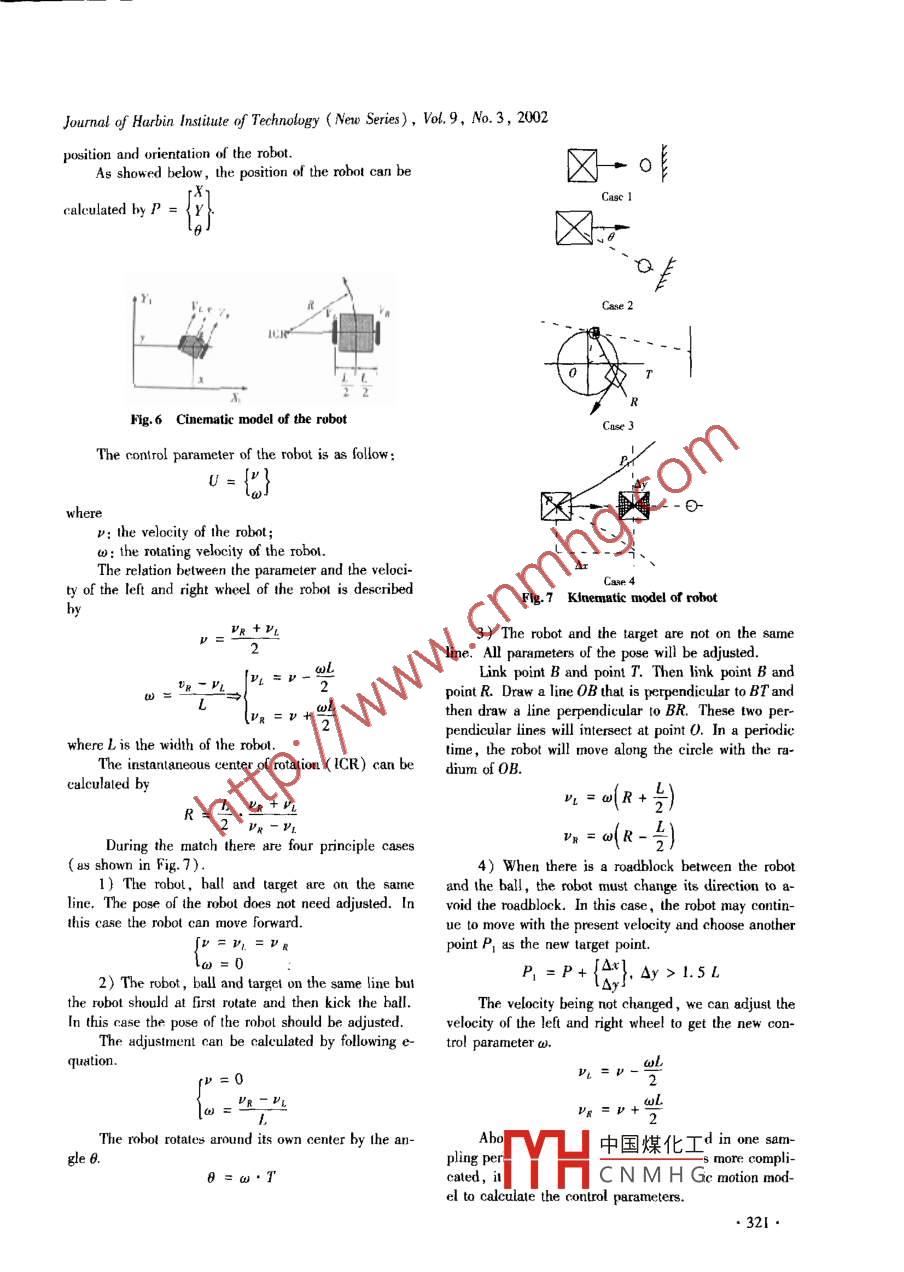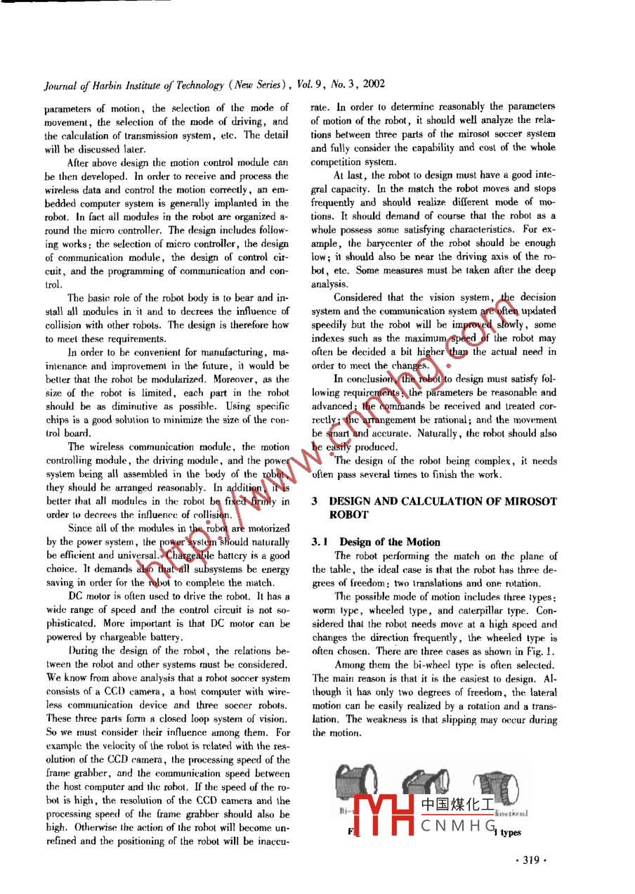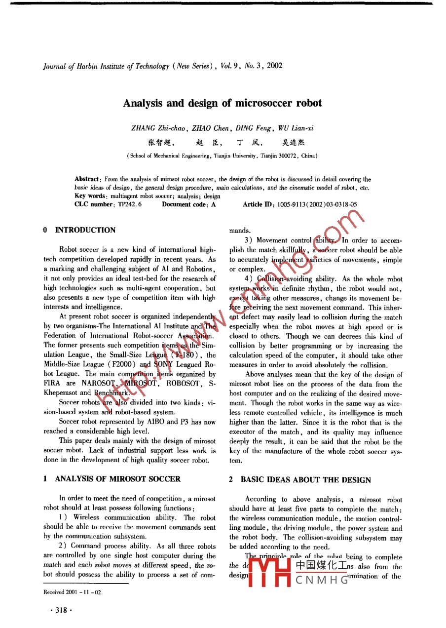 Journal of Harbin Insitute of Technology (New Series), Vol.9, No.3, 2002Analysis and design of microsoccer robotZHANG Zhi-chao, ZHAO Chen, DING Feng, WU Lian-xi張智超,趙臣,丁鳳,昊連熙( School of Mechanical Engineeing, Tianjin University , Tianjin 300072, China)Abstract: Frum the analysis of mirosot robot soccer, the design of the robot is discussed in detail covering thebasic ideas of design, the general design procedure, main calculations, and the cinematic model of robot, elc.Key words: multiagent robot soccer; analysis; designCLC number: TP242.6 Docunent code: AArticle ID: 1005-9113(2002)03-0318-050 INTRODUCTION3) Movement control ability. In order to accom-Robot soccer is a new kind of intemational high- plish the match silly,a socer robot should be abletech competition developed rapidly in recent years. Asto accurately implement varieties of movements , simplea marking and challenging subject of AI and Robotics,or complex.it not only provides an ideal lest-bed for the research of4) Collision-avoiding ability. As the whole robothigh technologies such 8 muli-agent cooperation, butsystem works in definite rhythm, the robot would not ,also presents a new type of competition item with highexcept taking other measures , change its movement be-interests and intelligence.fore receiving the next movement command. This inher-At present robot soccer is organized independentlyent defect may easily lead to cllision during the matchby two organisms -The International Al Intitute and The especially when the robol moves at high speed or isFederation of Intermational Robol-soccer Association.closed 10 others. Though we can decrees this kind ofThe former presents such competition items as the Sim-collision by better progranning σr by increasing thulation League, the Small-Size League (F-180), thecalculation speed of the computer, it should take otherMiddle-Size League (F2000) and SONY Leagued Ro- measures in order to avoid absolutely the cllision.bot League. The main competition items organized by :Above analyses mean that the key of the design ofFIRA are NAROSOT, MIROSOT, ROBOSOT, S-mirosot robot lies on the process of the data from theKheperasot and Benchmark.host computer and on the realizing of the desired move-Soccer robots are also divided into two kinds: vi- ment. Though the robot works in the same way as wire-sion-based system and robot-based system.less remole controlled vehicle, its intelligence is muchSoccer robot represented by AIBO and P3 has now higher than the ltter. Since it is the robot that is thereached a considerable high level.executor of the match, and its quality may influenceThis paper deals mainly with the design of mirosot deeply the result, it can be said that the robol be thesoccer robot. Lack of industrial support less work is key of the manufacture of the whole robol soccer sys-done in the development of high quality soccer robot,1 ANALYSIS OF MIROSOT SOCCER2 BASIC IDEAS ABOUT THE DESIGNIn order to meet the need of competition, a mirosotAccording to above analysis, a mirosot robotrobot should at least possess following functions:should have at least five parts to complete the match:1) Wireless conmunication ability. The trobut the wireless communication module , the motion control-should be able to rereive the movement commands sentling module , the driving module, the power system andby the communication subsystem.the robot body. The ollision-avoiding subsystem may2) Conmand process ability. As all three robols be added according to the need.are controlled by one single host computer during theThe prininle. mnle nf the. rmnhrut being to completemaltch and each robot moves at different speed, the ro-the d中國煤化Ins also from thebot should possess the ability to process a set of com- design:fYHCNMHGermination of theReceived 2001 -11 -02..318●Journal of Harbin Institute of Technology (New Series), Vol. 9, No.3, 2002paraneters of motion, the selection of the mode ofate. In order to determine reasonably the pararneltersmovement, the selection of the mode of driving, andof notion of the robot, it should well analyze the rela-the calculation of transmission system, etc. The detailtions between three parts of the mirosot soccer systemwill be discussed laler.and fully consider the capability and cost of the wholeAfter above design the motion control module cancompetition system.be then developed. In order to receive and process theAt last, the robot to design must have a good inte-wireless data and control the motion correctly, an em-gral capacity. In the match the robot moves and stopsbedded computer system is generally implanted in thefrequently and should realize different mode of mo~robot. In fact all modules in the robot are organized a-tions. It should demand of course that the robot as around the micro controller. The design includes follow-whole possess some satisfying characteristics. For ex-ing works: the selection of micro contoller, the designample, the barycenter of the robot should be enoughof communication module, the design of control cirlow; it should also be near the driving axis of the ro-cuit, and the programming of communication and con-bot, etc. Some measures must be taken after the deepanalysis.The basie role of the robot body is to bear and in-Considered that the vision system, the decisionstall all modules in it and to decrees the influence ofsystem and the communication system are often updatedcollision with other robols. The design is therefore howspeedily but the robol will be improved slowly, someto meet these requirements.indexes such as the maximum speed of the robot mayIn order to be convenienl for manufacturing, ma-oflen be decided a bit higher than the actual need inintenance and improvememt in the future, it would beorder to meel the changes.belter that the robol be modularized. Moreover, as theIn conclusion, the robot to design must satisfy fol-size of the robot is limited, each part in the robotlowing requirements : the para