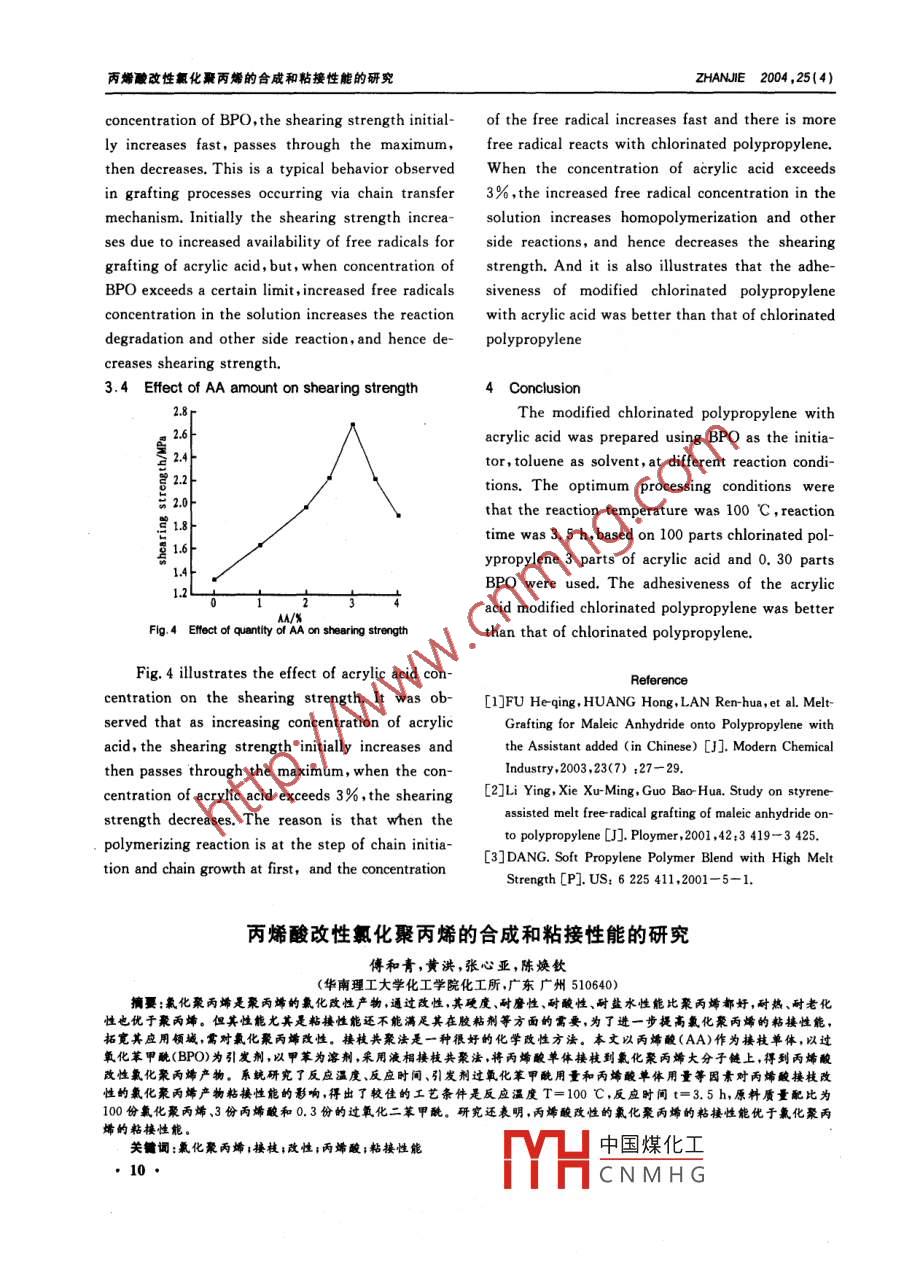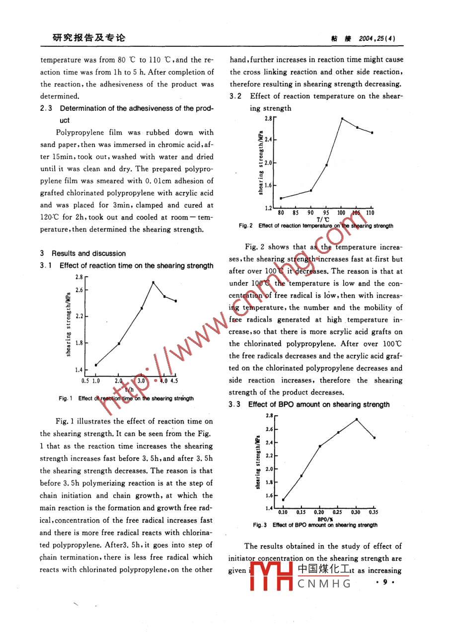 丙酸改性氯化聚丙烯的合成和粘接性能的研究zHAN∥E2004,25(4)Study on synthesis and adhesiveness of modifiedchlorinated polypropylene with acrylic acidFU He-qing, HUANG Hong, ZHANG Xin-ya, CHEN Huan-qin(Research Institute of Chemical Engineering, South China University of Technology, Guangzhou, Guangdong 510640)Abstract: Grafting of acrylic acid(AA) on chlorinated polypropylene (CPP) by free radical processwas carried out at different temperatures and hours using toluene as solvent. The effect of temperature,time, initiator concentration and the ratio of chlorinated polypropylene and acrylic acid on the adhesivenesswas studied. The optimum processing conditions were that the reaction temperature was 100 C, reactiontime was 3. 5 h, based on 100 parts chlorinated polypropylene 3 parts of acrylic acid and 0. 30 parts benzoperoxide(BPO)were used. The adhesiveness of modified chlorinated polypropylene with acrylic acid wasbetter than that of chlorinated polypropylene.Key words: chlorinated polypropylene; grafting; modification; acrylic acid; adhesiveness中圖分類號(hào):TQ325.1+4文獻(xiàn)標(biāo)識(shí)碼:A文章編號(hào):1001-5922(2004)03-0008-03pylene by free radical process was carried out.Due to the low cost, versatile properties, poly- Effect of reaction temperature, time and initiatorpropylene is one of the most important polymer concentration on adhesiveness was systematicallyidely used in household and industrial fields. studied. The adhesiveness of grafting modified ofof dyeing, low impact strength, poor compatibility better than that of chlorinated polypropylenesHowever, lack of chemical functionalities, difficulty chlorinated polypropylene with acrylic acid wwith other polymers, poor adhesion and non-polarity of the polypropylene its further application 2 Experimentalhas been restricted in the field of adhesive, printing 2. 1 Materials and instrumentationink and coating. This can be overcome thiCPP, toluene (CP grade ), benzoyl peroxideChemical modification of(BPO)(CP grade), acrylic acid(AA)(CP gradepropylene through grafting copolymerization offers were purchased from Guangzhou Jinzhujiangthe polarity of polytd, Hengyang Chemical Agent Faory, Guangzhou Xingang Chemical Co, LtdChlorinated polypropylene is the product of Guangzhou Donghong Chemical Agent Factory, re-polypropylene's chlorination modification, but its spectivelyadhesion can't suit for special need in adhesive and2 Experimental procedurecoating field. In order to improve its property,100 g CPP was dissolved in toluene in a four-grafting of acrylic acid on the chlorinated polypro- neck reactive flask with mechanical stirrer, drop-ng funnel, and thermo pocket. The initiator收稿日期:2004-02-作者簡(jiǎn)介:傅和青(1968-),男,發(fā)表論文20多篇,主要研究項(xiàng)目solved in為改性聚合物m中國(guó)煤化工ixture. The reactionCNMHG研究報(bào)告及專論粘接2004,25(4)temperature was from 80 C to 110 C, and the re- hand, further increases in reaction time might causeaction time was from lh to 5 h After completion of the cross linking reaction and other side reactionthe reaction, the adhesiveness of the product was therefore resulting in shearing strength decreasing.determined3.2 Effect of reaction temperature on the shear-2.3 Determination of the adhesiveness of the prod-ing strengthPolypropylene film was rubbed down withsand paper, then was immersed in chromic acid, after 15min, took out, washed with water and drieduntil it was clean and dry. The prepared polypropylene film was smeared with 0. 0lcm adhesion of日and was placed for 3min, clamped and cured at120.C for 2h, took out and cooled at room-tem-perature, then determined the shearing strengthFig 2 Effect of reaction temperature on the shearing strengthFig 2 shows that as the temperature increa-3 Results and discussionses, the shearing strength increases fast at first but3. 1 Effect of reaction time on the shearing strengthafter over 100C it decreases. The reason is that atunder 100c the temperature is low and the con-centration of free radical is low, then with increas-ing temperature, the number and the mobility offree radicals generated at high temperature in-crease, so that there is more acrylic acid grafts on1.8the chlorinated polypropylene After over 100Cthe free radicals decreases and the acrylic acid graf-ted on the chlorinated polypropylene decreases and4.04.5side reaction increases, therefore the shearingFig. 1 Effect of reaction time on the shearing strengthstrength of the product decreases.3. 3 Effect of BPO amount on shearing strengthFig. l illustrates the effect of reaction time onhe shearing strength. It can be seen from the fig.222l that as the reaction time increases the shearingstrength increases fast before 3. 5h, and after 3. 5hthe shearing strength decreases. The reason is thatbefore 3. 5h polymerizing reaction is at the step ofchain initiation and chain growth, at which themain reaction is the formation and growth free rad-0100.150.20025030035I concentration of the free radical increases fastBP0/%Fig 3 Effect of BPO amount on shearing strengthand there is more free radical reacts with chlorinated polypropylene. After3. 5h, it goes into step ofThe results obtained in the study of effect ofhain termination, there is less free radical which initiator concentration on the shearing strength arereacts with chlorinated polypropylene, on the other given中國(guó)煤化工 t as increasingCNMHG丙烯酸改性氯化聚丙烯的合成和粘接性能的研究ZHANJIE2004,25(4)concentration of BPO, the shearing strength initial- of the free radical increases fast and there is morely increases fast, passes through the maximum, free radical reacts with chlorinated polypropylenehen decreases. This is a typical behavior observed When the concentration of acrylic acid exceedsin grafting processes occurring via chain transfer 3%, the increased free radical concentration in themechanism. Initially