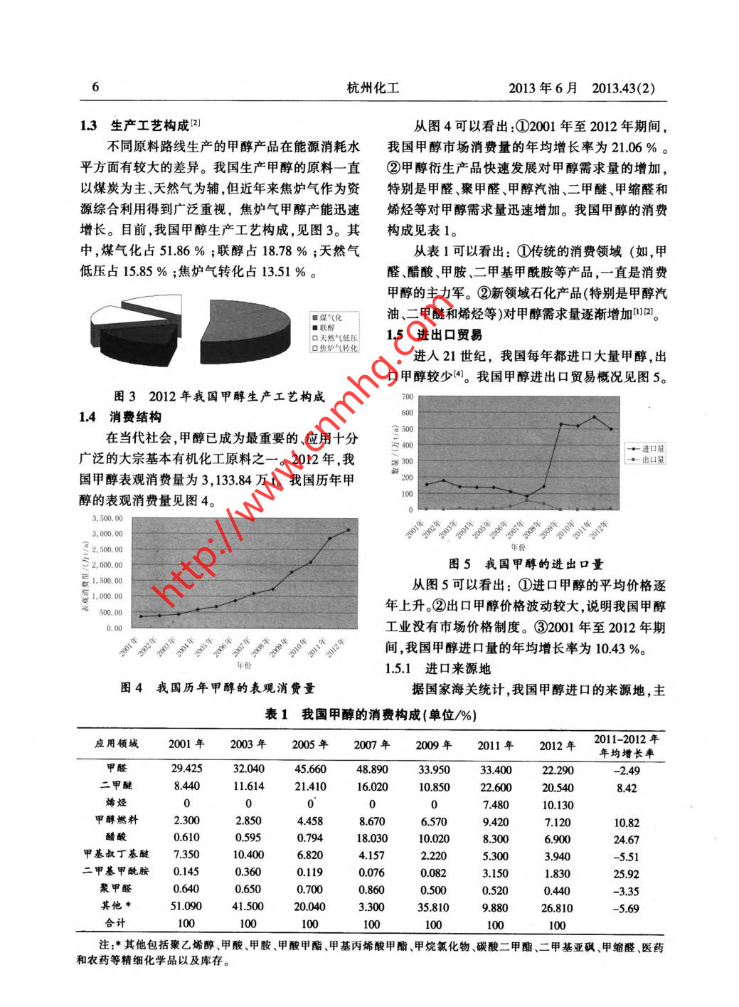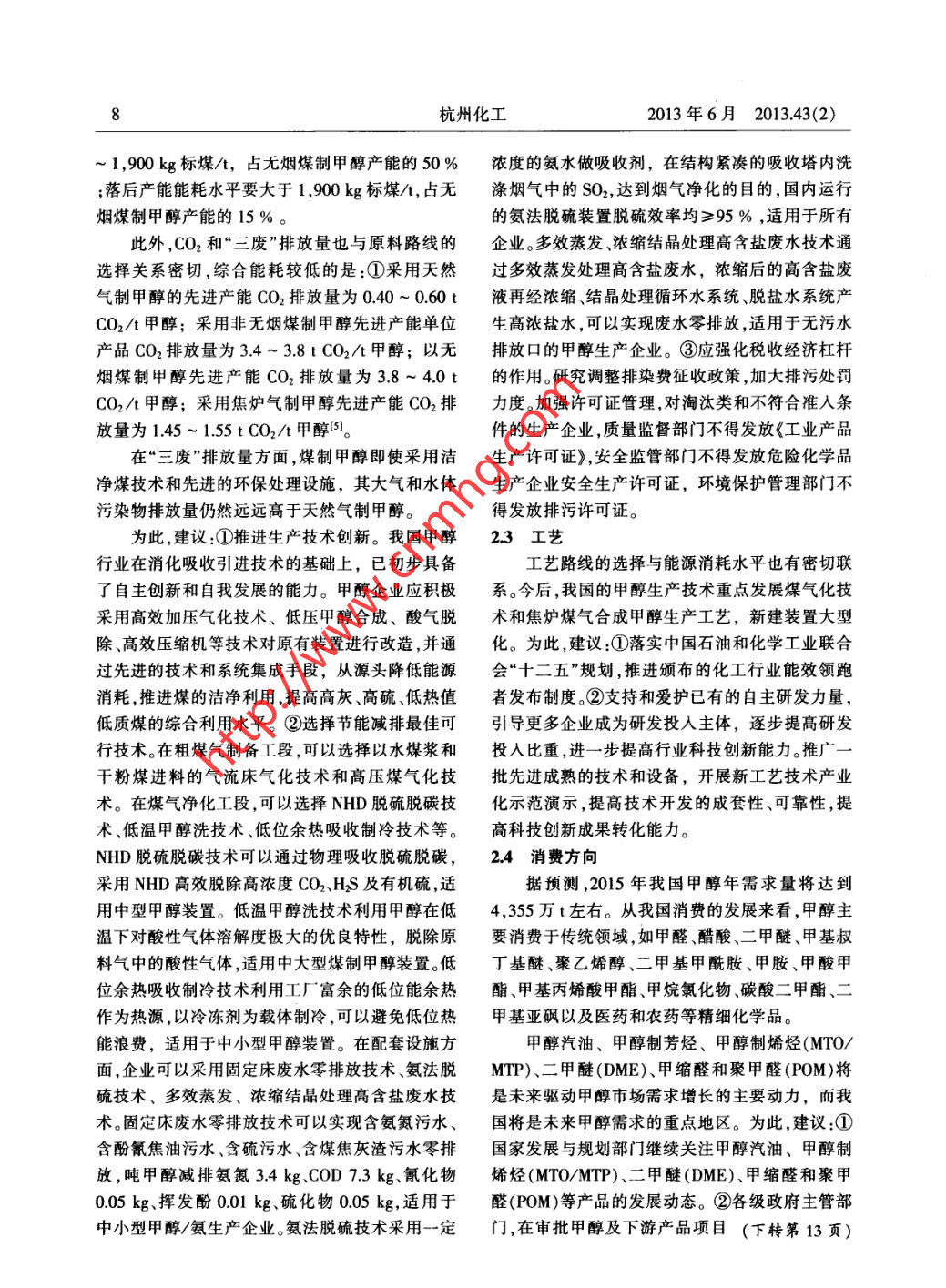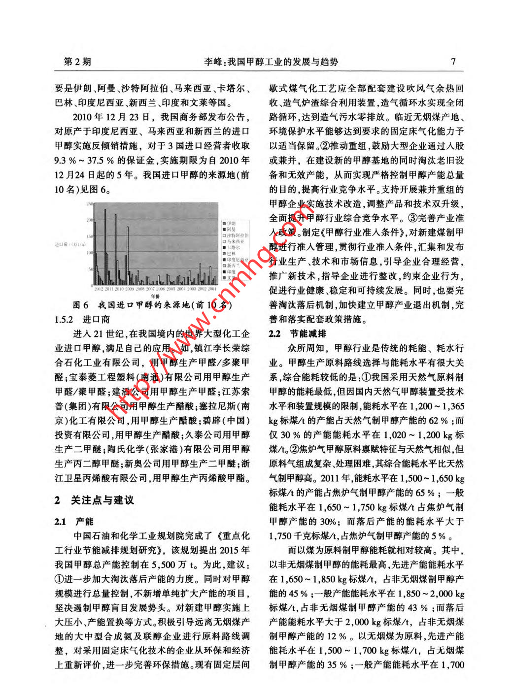 第2期李峰:我國(guó)甲醇工業(yè)的發(fā)展與趨勢(shì)5我國(guó)甲醇工業(yè)的發(fā)展與趨勢(shì)李峰.(北京蘇佳惠豐化工技術(shù)咨詢有限公司, 100085)摘要:對(duì)2001- -2012年期間我國(guó)甲醇工業(yè)的發(fā)展進(jìn)行了總結(jié),并提出了關(guān)注點(diǎn)與建議。關(guān)鍵詞:甲醇;發(fā)展;趨勢(shì);建議doi: 10.3969/j. issn. 1007 -2217. 2013. 02. 002甲醇是一-種重要的、需求量大的基本有機(jī)化工原料,也是一種新型的清潔能源。在工業(yè)發(fā)達(dá)國(guó)00家,它是僅次于烯烴和芳烴的基礎(chǔ)有機(jī)化工原料,400其消費(fèi)量?jī)H次于乙烯、丙烯和苯,居第四位。甲醇3000+產(chǎn)能應(yīng)用十分廣泛,在石油化工、醫(yī)藥、輕紡、生物化工以及能源、交通運(yùn)輸?shù)刃袠I(yè)均有廣泛用途,在國(guó)民經(jīng)濟(jì)中占有十分重要的地位。1發(fā)展現(xiàn)狀圖1我國(guó)甲醇工業(yè)的發(fā)展情況1.1發(fā)展概況1.2 地區(qū)產(chǎn)能分布進(jìn)入21世紀(jì),我國(guó)甲醇工業(yè)進(jìn)人快速發(fā)展時(shí)據(jù)調(diào)查,2012年我國(guó)甲醇總產(chǎn)能達(dá)5068萬(wàn)t。期。2001至2012年期間我國(guó)甲醇工業(yè)發(fā)展呈現(xiàn)2009年至2012年期間,我國(guó)甲醇產(chǎn)能的年均增出如下特點(diǎn):①西方國(guó)家慢慢地將甲醇的投資目光長(zhǎng)率為19.16 %[1][2]。2009 年和2012年,我國(guó)甲轉(zhuǎn)向我國(guó)這塊沃土。如,美國(guó)的陶氏化學(xué)在寧夏與醇產(chǎn)能的地區(qū)分布見圖2。神華集團(tuán)合作,建立300萬(wàn)Va甲醇生產(chǎn)裝置。②900煤氣化、天然氣低壓合成、聯(lián)醇和焦?fàn)t氣轉(zhuǎn)化等生產(chǎn)工藝共存,同時(shí),聯(lián)醇生產(chǎn)工藝將逐步被淘汰。③s 500甲醇進(jìn)口量逐年上升。④新增產(chǎn)能向資源地(煤和焦化廠)集中。⑤2011年我國(guó)甲醇產(chǎn)量占全球總產(chǎn)量的38.11 % ,已成為全球甲醇生產(chǎn)大國(guó)(1][2]。2001年至2012年期間,我國(guó)甲醇產(chǎn)能年均增長(zhǎng)率為23.83 % ,甲醇產(chǎn)量年均增長(zhǎng)率為23.66 %。圖2我國(guó)甲醇產(chǎn)能的地區(qū)分布拉動(dòng)我國(guó)甲醇工業(yè)快速發(fā)展的主要因素是:①新從圖2可以看出:①山東省、河南省、山西省、型的清潔能源(如,甲醇燃料和二甲醚)的快速發(fā)陜西省和寧夏等地新增甲醇產(chǎn)能最多,內(nèi)蒙古新展,有效地拉動(dòng)了甲醇工業(yè)的發(fā)展.②甲醇制烯烴增甲醇產(chǎn)能最大。②新增的甲醇產(chǎn)能向煤資源地的開發(fā)。③傳統(tǒng)的消費(fèi)領(lǐng)域(如,甲醛、醋酸、甲胺集中,焦?fàn)t氣制甲醇也得到較快發(fā)展。等產(chǎn)品),也保持了較好的發(fā)展。同時(shí),還應(yīng)看到:2012年我國(guó)甲醇產(chǎn)能排名前10位的省區(qū)分①甲醇產(chǎn)能開工率偏低,無(wú)效產(chǎn)能過(guò)剩。②甲醇裝別是內(nèi)蒙古,山東、河南、山西、陜西、寧夏、河北、置規(guī)模小,能耗物耗高,資源利用不盡合理,單位重慶、貴州和安徽),它們合計(jì)占全國(guó)總產(chǎn)能的產(chǎn)能投資高,導(dǎo)致生產(chǎn)成本偏高。21世紀(jì)以來(lái)我73.38%,其余省區(qū)產(chǎn)能所占比例僅為26.62%,國(guó)甲醇工業(yè)的發(fā)展情況,見圖1。甲醇產(chǎn)能區(qū)域聚集分布特點(diǎn)明顯。收稿日期:2013-02-256杭州化工2013年6月2013.43(2)1.3 生產(chǎn)工藝構(gòu)成2]從圖4可以看出:①2001年至2012年期間,不同原料路線生產(chǎn)的甲醇產(chǎn)品在能源消耗水我國(guó)甲醇市場(chǎng)消費(fèi)量的年均增長(zhǎng)率為21.06%。平方面有較大的差異。我國(guó)生產(chǎn)甲醇的原料- -直②甲醇衍生產(chǎn)品快速發(fā)展對(duì)甲醇需求量的增加,以煤炭為主、天然氣為輔,但近年來(lái)焦?fàn)t氣作為資特別是甲醛、聚甲醛、甲醇汽油、二甲醚、甲縮醛和源綜合利用得到廣泛重視,焦?fàn)t氣甲醇產(chǎn)能迅速烯烴等對(duì)甲醇需求量迅速增加。我國(guó)甲醇的消費(fèi)增長(zhǎng)。目前,我國(guó)甲醇生產(chǎn)工藝構(gòu)成,見圖3。其構(gòu)成見表1。中,煤氣化占51.86% ;聯(lián)醇占18.78% ;天然氣從表1可以看出:①傳統(tǒng)的消費(fèi)領(lǐng)域(如,甲低壓占15.85 % ;焦?fàn)t氣轉(zhuǎn)化占13.51 %。醛、醋酸、甲胺、二甲基甲酰胺等產(chǎn)品,一直是消費(fèi)甲醇的主力軍。②新領(lǐng)域石化產(chǎn)品(特別是甲醇汽煤^化油、二甲醚和烯烴等)對(duì)甲醇需求量逐漸增加112]?!雎?lián)醇,1.5進(jìn)出口貿(mào)易|口天然氣低壓口焦?fàn)t氣轉(zhuǎn)化進(jìn)入21世紀(jì),我國(guó)每年都進(jìn)口大量甲醇,出口甲醇較少4。我國(guó)甲醇進(jìn)出口貿(mào)易概況見圖5。圖3 2012 年我國(guó)甲醇生產(chǎn)工藝構(gòu)成70.4 消費(fèi)結(jié)構(gòu)60倉(cāng)500在當(dāng)代社會(huì),甲醇已成為最重要的、應(yīng)用十分5400+進(jìn)口量廣泛的大宗基本有機(jī)化工原料之一。2012年,我,出口政20國(guó)甲醇表觀消費(fèi)量為3, 133.84萬(wàn)t。我國(guó)歷年甲2010醇的表觀消費(fèi)量見圖4。3. 50.003, 00.00s 2, 500.00? 2, 00.00圖5我國(guó)甲醇的進(jìn)出口量家1,500.00從圖5可以看出:①進(jìn)口甲醇的平均價(jià)格逐年上升.②出口甲醇價(jià)格波動(dòng)較大,說(shuō)明我國(guó)甲醇500. 00.00工業(yè)沒(méi)有市場(chǎng)價(jià)格制度。③2001