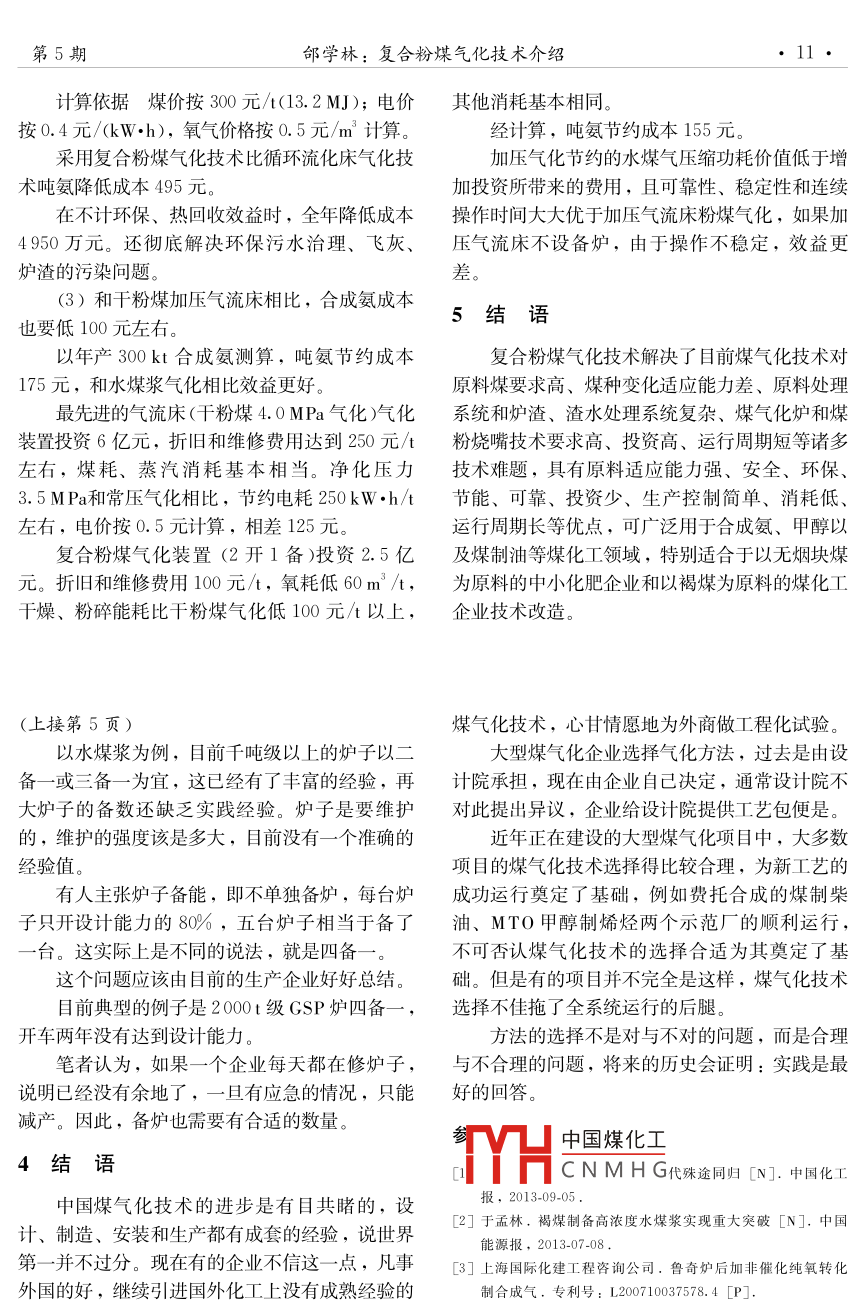 第39卷第5期化工設(shè)計通訊2013年10月Chemical engineering design communications專論與綜述煤氣化技術(shù)發(fā)展動向唐宏青(北京中科合成油工程有限公司,北京101407)摘要:介紹煤氣化技術(shù)概況。論述近期煤氣化技術(shù)發(fā)展的六大特點,即從裝備國產(chǎn)化走向工藝技術(shù)國產(chǎn)化,單元技術(shù)進步引導(dǎo)全生產(chǎn)線“安穩(wěn)長滿”運行,單爐規(guī)模大型化,氣化爐內(nèi)操作壓力提高,原料向褐煤發(fā)展,氣化后兩種流程可以組合。提岀選用煤氣化技術(shù)的七項原則:以煤定爐,優(yōu)先考慮氣流床,氣化爐規(guī)模適中,力求技術(shù)成熟、投資低、環(huán)保,超大型煤化工裝置需要備爐。煤氣化技術(shù)的選擇決定了全裝置運行狀況的好壞。關(guān)鍵詞:煤氣化;技術(shù)動向;選擇依據(jù)中圖分類號:TQ546文獻標志碼:B文章編號:1003-6490(2013)5-0001-05Development of Coal gasification TechnologyTANG Hong-qingSynfuels China Engineering Co, Ltd. Beijing 101407, China)Abstract Generally describe status of coal gasification technology. And discuss six characteristicsrecent coal gasification technology development, w hich including developing process technologylocalization from equipment localization, unit technological progress guiding whole production lineoperation in the condition of safety stability, long period and full load single gasifier being developedtowards large scale one, gasifier operating pressure being increased, lignite tending to be used as theraw coal, both processes would be combined after gasification process. Propose seven principles oselecting gasification technology as follows: selecting gasifier type according to coal ty pe; firstconsidering selection of the entrained-flow coal gasifier the size of gasifier should be moderatesecuring gasification technology to be mature; reducing investment: environmental protection; largecoal chemical plant needs standby gasifier Gasification technology is key factor in determining w holeplant operation in good conditionKey words :coal gasification; technology development trend technology selection principle煤氣化技術(shù)現(xiàn)狀段爐技術(shù)、清華爐技術(shù)、多元料漿技術(shù)等煤氣化技術(shù),并且在工業(yè)中應(yīng)用眾所周知,煤氣化是煤化工的關(guān)鍵技術(shù),是煤氣化就是把煤變成容易進一步加工的合成決定煤化工產(chǎn)品是否能夠工業(yè)化的基礎(chǔ)。因此,氣,煤氣化工藝可以分為三個工序:備煤、氣煤氣化技術(shù)受到化工行業(yè)的廣泛關(guān)注。一百多年化、粗煤氣和炭黑水處理。最終出口應(yīng)該是含有來,國內(nèi)外開發(fā)的煤氣化技術(shù)有上百種,目前在中國煤化工心圖工業(yè)上能夠立腳的大約有十幾種CNMH,學(xué)術(shù)界和工業(yè)界有近年來我國在煤氣化技術(shù)的開發(fā)上有所建所不同,工業(yè)界從進料形態(tài)出發(fā),基本上分為水樹,開發(fā)了多噴嘴水煤漿技術(shù)、航夭爐技術(shù)、兩煤漿氣化、粉煤氣化和碎煤氣化三類。而學(xué)術(shù)界收稿日期:2013-09-09作者簡介:唐宏青(1941-),男,上海人,教授級高工,中科合成油工程有限公司顧問化工設(shè)計通訊第39卷則根據(jù)物料流動機理分為氣流床、固定床和流化根據(jù)進料的位置,每一種方法可以分為向上床三類。噴射(上行)和向下噴射(下行)兩種形式這些方法歸結(jié)起來,可以用圖2來表示,圖備煤卩媒粉合成氣碎煤氣氣化洗滌的走向為自左至右,圖的左邊是各類方法的集水煤漿黑水合,右邊則是后續(xù)的氣化工藝,有廢熱鍋爐和水激冷兩大類,圖中列舉的技術(shù)包括了目前絕大部圖1煤氣化原則流程圖分新技術(shù)Shell廢熱鍋爐段爐(熱工院)、一[廢熱鍋爐五環(huán)爐(四院)航天爐(航天部)GSP, CHORENShell-惠生東方爐(華理)粉煤灰融聚(煤化所)流SES床噴廢熱鍋爐恩德爐合成氣處理工藝KBRGE-Texaco四噴嘴(華理)激冷水煤漿氣流床一噴非熔渣熔渣(清華多元料漿(西北院噴E-GAS廢熱鍋爐固廢熱鍋爐煤BGL. YM圖2各種方法氣化煤氣化流程圖2近期煤氣化技術(shù)發(fā)展的特點藝技術(shù)采用國外的,設(shè)備由國內(nèi)自己制造。經(jīng)過二十年的努力,許多復(fù)雜的化工非標設(shè)備可以在盡管開發(fā)煤氣化工藝是很困難的,但由于國國肉庫別昱反應(yīng)嬰,包括現(xiàn)場組裝技術(shù)內(nèi)外研究機構(gòu)在國家和企業(yè)的支持下,經(jīng)過長期例中國煤化工8001的費托合成反應(yīng)堅韌不拔的努力,開發(fā)了不少煤氣化工藝,其中器CNMH〈反應(yīng)器等。有一些工藝已經(jīng)比較成熟,有的方法很有成效由于國內(nèi)煤氣化技術(shù)的發(fā)展,國內(nèi)開發(fā)的煤(1)從裝備國產(chǎn)化走向工藝技術(shù)國產(chǎn)化氣化技術(shù),如航天爐干煤粉氣化、多嘖嘴水煤漿上世紀80年代國家提出的“化工裝備國產(chǎn)氣化、兩段爐干煤粉氣化、清華爐水煤漿氣化化”已經(jīng)基本實現(xiàn)。當時提出這個目標時認為工(熱壁和冷壁)等等,均在煤化工企業(yè)成功應(yīng)用第5期唐宏青:煤氣化技術(shù)發(fā)展動向現(xiàn)代煤化工工藝中的煤氣化技術(shù)可以采用國內(nèi)技對于氣化后合成氣加工壓力較高的工藝,氣化壓術(shù),從而實現(xiàn)“工藝技術(shù)國產(chǎn)化”。這是一個很力高自然能夠節(jié)能。以甲醇為例,壓力提高到大的飛躍,是化工技術(shù)的巨大進步,帶動了國內(nèi)8.7MPa后,有可能實現(xiàn)等壓合成。但是氣化