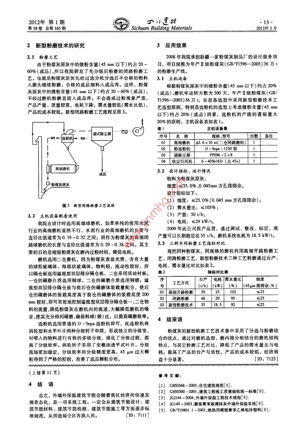 H材2012年第1期2012年2月Sichuan Building Materials第38卷總第165期粉煤灰的粉磨技術(shù)史杰(新疆建筑材料研究院,新疆烏魯木齊8300000摘要:粉煤灰的新型粉磨工藝采用了分選與新型粉重,產(chǎn)品產(chǎn)量、質(zhì)量下降,電耗上升;微粉產(chǎn)品比表面積磨結(jié)合,通過(guò)對(duì)磨機(jī)選型、磨內(nèi)篩分相結(jié)合的特點(diǎn),降低過(guò)高,需水量過(guò)髙(需水比高),就導(dǎo)致了粉煤灰細(xì)粉的產(chǎn)品了產(chǎn)品的需水量比與電耗;提高了產(chǎn)品的臺(tái)產(chǎn)與活性,產(chǎn)性能降低,產(chǎn)品的成本增加。高細(xì)開路粉磨工藝流程見圖品的成本較低,經(jīng)濟(jì)效益十分顯著。關(guān)鍵詞:分選;粉磨;節(jié)能中圖分類號(hào):TQ1724·3文獻(xiàn)標(biāo)識(shí)碼:B文章編號(hào):1672-4011(2012)01-0012-02袋式除塵器0前言粉煤灰是我國(guó)當(dāng)前排量較大的工業(yè)廢渣之一,現(xiàn)階段我國(guó)年排渣量已達(dá)3000t隨著電力工業(yè)的發(fā)展,燃煤電廠的粉煤灰排放量逐年增加。大量的粉煤灰不加處理,粉煤灰原灰就會(huì)產(chǎn)生揚(yáng)塵,污染大氣;若排入水系會(huì)造成河流淤塞,高細(xì)磨機(jī)而其中的有毒化學(xué)物質(zhì)還會(huì)對(duì)人體和生物造成危害。因此,粉煤灰的處理和利用問(wèn)題引起人們廣泛的注意。隨著我國(guó)粉煤灰綜合利用技術(shù)的日益成熟和推廣,粉煤灰綜合利用已經(jīng)不僅限于環(huán)保的要求,粉煤灰綜合利用的巨大的經(jīng)濟(jì)效益已經(jīng)得以體現(xiàn)?,F(xiàn)國(guó)內(nèi)大量燃煤電廠所圖1高細(xì)開珞粉磨工藝流程排放的粉煤灰原灰,其細(xì)度值一般在20~50%之間變化(325目篩余),達(dá)不到國(guó)家標(biāo)準(zhǔn)(GBT196-2005)中規(guī)定1.2閉路粉磨工藝的一級(jí)灰和二級(jí)灰要求。各電廠一般采用粉煤灰干法分選由于粉煤灰粉磨在國(guó)內(nèi)起步較晚,人們對(duì)它的粉磨規(guī)技術(shù)將原灰進(jìn)行粗細(xì)分離以獲得成品細(xì)灰,獲得一定經(jīng)濟(jì)律認(rèn)識(shí)是由水泥磨機(jī)轉(zhuǎn)變而來(lái),即粉煤灰原灰從磨機(jī)頭部效益。但分選后的粗灰(一般細(xì)度值65%左右),并未得到入料,由磨尾卸料,經(jīng)提升機(jī)送入選粉機(jī)進(jìn)行分選,不合充分利用,一般低價(jià)售出。如果將粉煤灰用磨機(jī)粉磨成細(xì)格的粗料人磨頭繼續(xù)粉磨,合格的成品細(xì)料入成品庫(kù)。大灰(細(xì)度:≤25.0%,0.045mm方孔篩篩余)后,使之具有一部分閉路粉磨工藝套用水泥粉磨閉路系統(tǒng)是不科學(xué)的;因定的水硬活性,生產(chǎn)出能配制高性能混凝土的高級(jí)摻合細(xì)為粉煤灰比表面積較大,約為2150~3900cm2/克。粉煤灰,達(dá)到粉煤灰完全利用的目的,創(chuàng)造更大的經(jīng)濟(jì)效益?;业臍堄喟l(fā)熱量,不同煤種、不同機(jī)組,同一煤種、同一1粉煤灰的粉磨技術(shù)現(xiàn)狀分析機(jī)組的不同時(shí)期都有較大變化;所以電廠所收集的粉煤灰的細(xì)度是不同的,大多電廠粉煤灰中的微粉含量(45mm以目前,粉煤灰微粉的制備方式主要有利用高細(xì)球磨機(jī)下)約占20~60%,如果單純的使用此工藝勢(shì)必會(huì)造成過(guò)進(jìn)行開路或閉路粉磨,其優(yōu)點(diǎn)是工藝簡(jiǎn)單、維護(hù)管理方便,粉現(xiàn)象嚴(yán)重,產(chǎn)品產(chǎn)量、質(zhì)量下降,電耗上升;微粉產(chǎn)品并能夠快捷地實(shí)現(xiàn)超細(xì)產(chǎn)品的多元化。該技術(shù)是在成熟的比表面積過(guò)高,需水量過(guò)高(需水比高),就導(dǎo)致了粉煤灰細(xì)球磨機(jī)粉磨系統(tǒng)上進(jìn)行的優(yōu)化改進(jìn),因此系統(tǒng)投資較小,粉的產(chǎn)品性能降低,產(chǎn)品的成本增加。閉路粉磨工藝流程生產(chǎn)控制簡(jiǎn)單。但由于受其粉磨機(jī)理的局限,導(dǎo)致存在能見圖2。量利用率低,單位成品電耗高,無(wú)法大規(guī)模生產(chǎn)等問(wèn)題。1.1高細(xì)開路粉磨工藝高細(xì)開路粉磨工藝因?yàn)樗耐顿Y較少、工藝簡(jiǎn)單、是袋式除塵器粉煤灰加工廠常采用的粉磨方式之一。由于粉煤灰顆粒為多孔結(jié)構(gòu),有許多玻璃質(zhì),孔隙率可達(dá)60~75%,對(duì)水的吸附能力很大,往往含水率達(dá)30%時(shí)仍呈松散狀態(tài);所以粉煤灰原灰用常規(guī)的開路高細(xì)磨機(jī)對(duì)粉煤灰進(jìn)行粉磨加工時(shí)易造成過(guò)粉現(xiàn)象嚴(yán)重,細(xì)度及其不均勻,通過(guò)化驗(yàn),成品微粉中45高細(xì)磨機(jī)mm以下占70%以上,但同時(shí)也存在一定量細(xì)度嚴(yán)重超標(biāo)的粗物料,如果要使物料完全達(dá)到細(xì)度要求,那么就要延長(zhǎng)粉磨時(shí)間。這樣高細(xì)開路粉磨工藝必然產(chǎn)生過(guò)粉現(xiàn)象嚴(yán)作者簡(jiǎn)介:史杰(1971-),男,大學(xué)本科,研究方向:建材工藝與設(shè)計(jì)圖2閉路粉磨工藝流程2012年第1期f第38卷總第165期Sichuan Building Materials2012年2月2新型粉磨技術(shù)的研究3應(yīng)用效果2.1粉磨工藝2008年我院承擔(dān)新疆一家粉煤灰制品廠的設(shè)計(jì)服務(wù)項(xiàng)由于粉煤灰原灰中的微粉含量(45mm以下)約占20~目,項(xiàng)目規(guī)模為年產(chǎn)Ⅱ級(jí)粉煤灰(GB/T1962005)36萬(wàn)t60%(成品),所以我院研發(fā)了先分級(jí)后粉磨的閉路粉磨工的粉磨生產(chǎn)線。藝,也就是粉煤灰原灰先經(jī