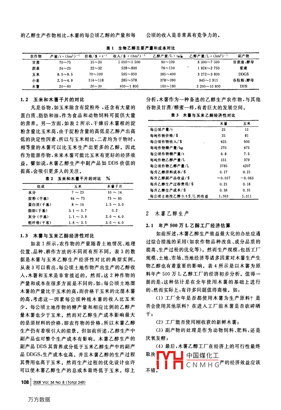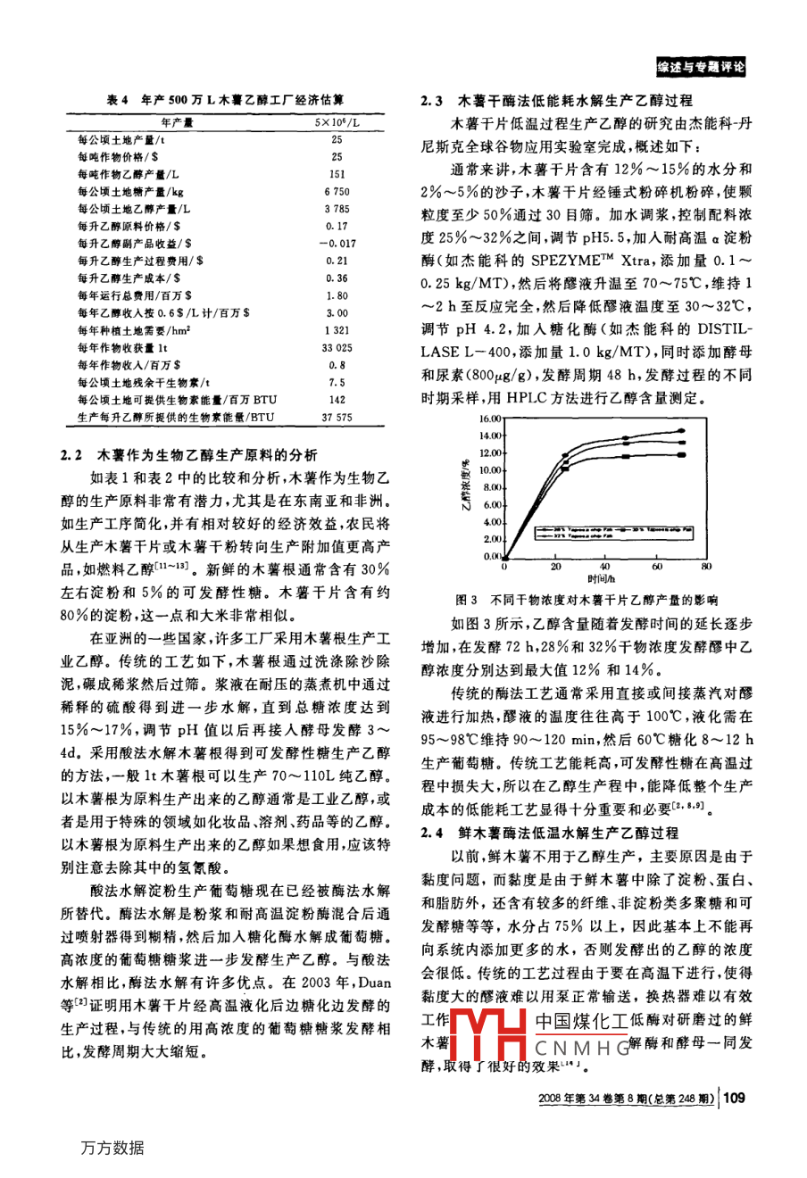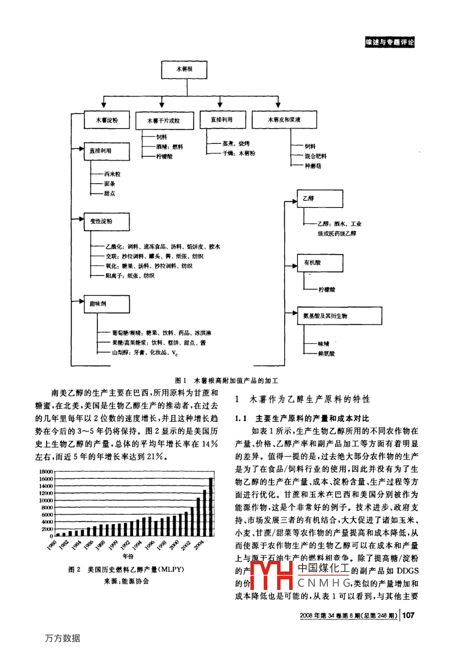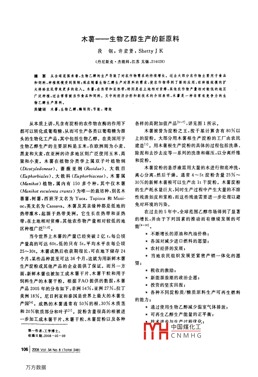 木薯——生物乙醇生產(chǎn)的新原料段鋼,許宏賢, Shetty JK(丹尼斯克·杰能科,江蘇無錫,214028)摘要從全球范圍來看,生物乙醇的生產(chǎn)導致了對農(nóng)作物需求的持續(xù)增長。過去大部分農(nóng)作物主要用于食品和飼料,種植規(guī)模受到隈制;現(xiàn)在隨著生物乙醇生產(chǎn)對原料的需求,使農(nóng)作物得到了新的應用,而種植規(guī)模的擴大將給農(nóng)民帶來更多的收入。木薯,在熱帶和亞熱帶,特別是在土地相對貧瘠,其他農(nóng)作物產(chǎn)量相對較低的地區(qū)廣泛種植,過去常常被當作食品和飼料。文中的經(jīng)濟分析和新技術的介紹表明,木暮是一種非常有竟爭力的生物乙醇生產(chǎn)原料關鍵詞木暮,生物乙醇,晦制劑,節(jié)能,增效從本質上講,凡含有淀粉的農(nóng)作物在酶的作用下各樣的高附加值產(chǎn)品5n,詳見圖1所示。都可以轉化成葡萄糖,從而可生產(chǎn)各類以葡萄糖為源木薯被譽為淀粉之王,按干基計算含有80%以頭的生物化工產(chǎn)品,其中包括生物乙醇。在美國用于上的淀粉。大部分用木薯根生產(chǎn)淀粉的工廠由農(nóng)民生物乙醇生產(chǎn)的主要原料是玉米,在歐洲則為小麥、建造。用木薯根生產(chǎn)淀粉的具體的過程包括洗滌、黑麥和大麥,在亞洲的許多地區(qū)則廣泛使用玉米、高除泥和去沙去皮等一系列的洗滌和碾壓,以分離纖維粲和小麥。木薯在植物分類學上屬雙子葉植物綱和淀粉( Dicotyledoneae)、薔薇亞綱( rosidae)、大戟目木薯淀粉的懸浮液需用大量的水進行徹底沖洗( Euphorbiales)、大戟科( Euphorbiaceae)、木薯屬離心分離,然后干燥。通常4~5t淀粉含量25%(Mnio)植物,屬內(nèi)有150多個種,其中僅木薯30%的新鮮木薯根可以生產(chǎn)出1t干淀粉。木薯淀粉( Manihot esculenta crantz)為唯一的栽培種,別名木的生產(chǎn)耗水量巨大,同時生產(chǎn)過程中產(chǎn)生大量的不溶蕃薯,樹薯,西班牙文名為Yuca, Tapioca和Mani-性殘渣如皮和漿柏,而這些殘渣需要進一步處理以避oc,英文名為 Cassava.木薯及其親緣種都是低地的免對環(huán)境的污染熱帶灌木,起源于熱帶美洲。它生長在熱帶和亞熱在過去的5年中,全球范圍乙醇市場得到了顯著帶,在土地相對貧瘠,其他農(nóng)作物產(chǎn)量相對較低的地的增長,并由于下列因素的推動而有繼續(xù)發(fā)展的可區(qū)種植廣泛[1,0能-10。當今世界上木薯的產(chǎn)量已經(jīng)突破2億t,每公頃不斷增長的原油和汽油價格;產(chǎn)量高的可達60t低的只有5t,平均水平在每公頃各國對減少進口燃料的愿望;25~30t。木薯成熟后收獲期很長,可在地下儲存24農(nóng)村經(jīng)濟的發(fā)展;生產(chǎn)淀粉或其他產(chǎn)品的企業(yè)提供了保證。而另一方多當?shù)剞r(nóng)民組織發(fā)展更緊密產(chǎn)銷一體化的愿個月,某些品種甚至可達36個月,這就為用新鮮木薯面,新鮮木薯也被加工成木薯干片、木薯干粒和用于舞稅收的激勵;飼料生產(chǎn)的木薯干粉。根據(jù)FAO提供的數(shù)據(jù),木薯新能源浪潮的政治企愿;產(chǎn)品2005年的分布如下:非洲54%亞洲27%,拉丁投資的堅實回報;各種不同淀粉質/糖質原料生產(chǎn)可再生燃料美洲18%。尼日利亞和泰國是世界上最大的木薯生的能力產(chǎn)國。成熟的木薯通常有50%的根、30%木質莖*通過使用生物乙醇減少溫室氣體排放;和20%軟質部分和葉子1。淀粉含量很高的根被進可再生乙醇生產(chǎn)能量的正平衡一步加工成木薯干片、木薯干粒、木薯淀粉以及各種He生產(chǎn)討程伏化;中國煤化工第一作者:工學博士收稿日期:2008-05-09NMHG106|2o0o4No8(oa2綜逵與專題評木蕃淀粉薯于片或粒直接利用木萼皮和漿液蒸煮,燒烤直接利用酒精:燃料檸檬酸干燥:木薯籽混合肥料種彰菇甜點變性淀粉乙醇:酒水,工業(yè)級或醫(yī)藥級乙醇乙?;?調料、速凍食品、湯料、餡餅皮、膠水聯(lián):沙拉調料、頭、青、紙張、紡織氧化:糖果、湯料、沙拉調料、紡織有機酸陽離子:紙張、紡織檸檬酸甜味劑氛基酸及其行生物葡萄糖欄精:糖果、飲料,藥品、冰淇淋山梨醇:牙新賴氨酸圖1木薯根高附加值產(chǎn)品的加工南美乙醇的生產(chǎn)主要在巴西,所用原料為甘蔗和糖蜜在北美美國是生物乙醇生產(chǎn)的推動者在過去1木薯作為乙醇生產(chǎn)原料的特性的幾年里每年以2位數(shù)的速度增長,并且這種增長趨1.1主要生產(chǎn)原料的產(chǎn)量和成本對比勢在今后的3~5年仍將保持。圖2顯示的是美國歷如表1所示,生產(chǎn)生物乙醇所用的不同農(nóng)作物在史上生物乙醇的產(chǎn)量,總體的平均年增長率在14%產(chǎn)量、價格、乙醇產(chǎn)率和副產(chǎn)品加工等方面有著明顯左右,而近5年的年增長率達到21%。的差異。值得一提的是,過去絕大部分農(nóng)作物的生產(chǎn)800是為了在食品/飼料行業(yè)的使用,因此并沒有為了生物乙醇的生產(chǎn)在產(chǎn)量、成本、淀粉含量生產(chǎn)過程等方聯(lián)o0oo000面進行優(yōu)化。甘蔗和玉米在巴西和美國分別被作為能源作物,這是個非常好的例子。技術進步、政府支HULl持、市場發(fā)展三者的有機結合,大大促進了諸如玉米小麥、甘蔗/甜菜等農(nóng)作物的產(chǎn)量提高和成本降低,從∮押∮φ∮押∮小小心而使源于農(nóng)作物生產(chǎn)的生物乙醇可以在成本和產(chǎn)量上與漫千有沖牛產(chǎn)的燃料相音學,除了提高糖淀粉圖2美國歷史燃料乙醇產