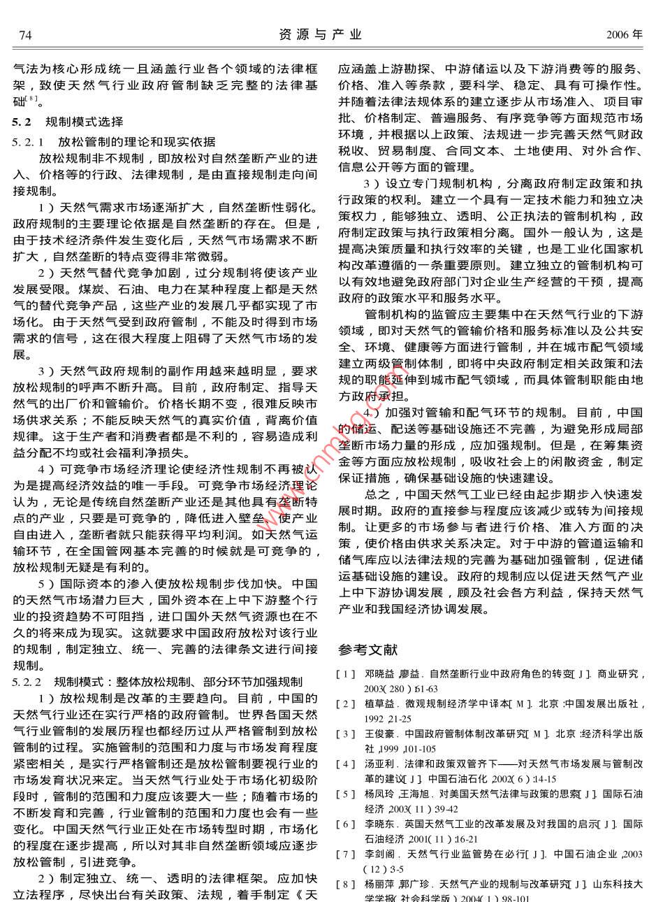 第8卷第4期資源與產(chǎn)業(yè)Vol 8 No. 42006年8月RESOURCeS IndustriesAug.2006資源產(chǎn)業(yè)中國天然氣產(chǎn)業(yè)規(guī)制問題研究許月潮中國地質(zhì)大學人文經(jīng)管學院,北京100083)摘要:我國目前正處于由計劃經(jīng)濟向市場經(jīng)濟過渡的經(jīng)濟轉(zhuǎn)軌階段,一些自然壟斷行業(yè)為了順應經(jīng)濟制度的轉(zhuǎn)變進行了拆分、引進競爭等方式以適應經(jīng)濟發(fā)展和提高資源配置效率,如電信、航空業(yè)等。天然氣行業(yè)作為公共事業(yè)同樣具有自然壟斷特點,在進入大發(fā)展時期和經(jīng)濟轉(zhuǎn)型期的雙重機遇和挑戰(zhàn)面前,其規(guī)制模式應該向著哪個方向傾斜已是當前的重大課題。本文通過運用自然壟斷和規(guī)制經(jīng)濟學的理論,借鑒國外天然氣產(chǎn)業(yè)規(guī)制模式,分析了天然氣行業(yè)的技術經(jīng)濟特點,提岀了放松規(guī)制是中國現(xiàn)階段天然氣產(chǎn)業(yè)的規(guī)制改革取向。關鍵詞天然氣產(chǎn)業(yè);規(guī)制模式;中國中圖分類號:F416.22文獻標識碼:A文章編號:1673-2464(2006)04-0071-04STUDY ON REGULATION OF NATURAL GAS INDUSTRY OF CHIINAXU Yue-chaoSchool of Humanities and Economic Mangement, China University of Geosciences, Beijing 100083, ChinaAbstract: Recently our country has been undergoing the phase from planned economy to market economy. Somenatural monopolization industries such as telecom and aviation industry have made theompetition to improve the efficiency of collocating resources. The natural gas industry, considered as governmentutility has the feature of natural monopolization. Faced with the choice and challenge of rapid development andeconomic transformation the development direction of industry regulation system model is an important project. Byapplying the theory of natural monopolization and regulation economy and using the regulation system models of foreignnatural gas industry for reference, this paper concludes the techno-economic characteristics of gas industry, putsforward that easing regulations is the future regulatory orientation concerning the reformation of Chinese natural gasndustryKey words: natural gas industry regulation model China近20年來,放松管制、引入競爭、產(chǎn)權私有化要針對具有自然壟斷特點的公共事業(yè),如準入、價已成為世界各國對自然壟斷產(chǎn)業(yè)市場化改革的主導取格、服務質(zhì)量等方面。產(chǎn)業(yè)規(guī)制是對市場失靈的治向。與此同時,中國處于經(jīng)濟轉(zhuǎn)型期,為適應經(jīng)濟發(fā)理,目的在于維持正常的社會經(jīng)濟運行秩序。限制壟展趨勢,在電信、航空、電力、鐵路等相關領堿旳改斷市場力量,提高資源配置效率,保護大多數(shù)社會公革已經(jīng)展開1。天然氣產(chǎn)業(yè)作為國家的公共事業(yè)行眾的利益,使之不受少數(shù)人的侵犯2業(yè),已經(jīng)進入快速發(fā)展時期。為促進該行業(yè)的順利發(fā)從規(guī)制實施主體的不同可以分為政府規(guī)制、社會展,一些舊的規(guī)制方式方法已不能適應天然氣發(fā)展新規(guī)制和行業(yè)自律。階段的特點。天然氣具有自然壟斷特性,規(guī)制要適產(chǎn)業(yè)規(guī)制理論的產(chǎn)生有一定的社會經(jīng)濟發(fā)展背景當、適時,宜引進競爭的業(yè)務或時期實行充分競爭,以及某些行業(yè)的自身特點,而且隨著經(jīng)濟和行業(yè)的快壟斷業(yè)務實行嚴格監(jiān)管。速發(fā)展,規(guī)制的強度會放松以至于解除。電力、有線通信、鐵路運輸、管道燃氣和自來水供應等產(chǎn)業(yè)的顯1產(chǎn)業(yè)規(guī)制理論著特點就是需要巨額投資,投資回報期較長,投資形產(chǎn)業(yè)規(guī)制是產(chǎn)業(yè)經(jīng)濟學范疇的概念,其實質(zhì)是政成的資產(chǎn)專用性較強,規(guī)模經(jīng)濟和網(wǎng)絡經(jīng)濟非常顯府或社會為實現(xiàn)某些社會經(jīng)濟目標,通過法律或行政著,最重要的是屬于公共產(chǎn)品或服務,涉及大多數(shù)社手段對市場中的經(jīng)濟主體進行直接或間接的管制,主會公眾的利益。為有效配置社會資源,在某一地區(qū)或資源與產(chǎn)業(yè)2006年領域通常有一家廠商或企業(yè)經(jīng)營運作這些產(chǎn)業(yè)。但的發(fā)展,壟斷性可能會演化為競爭性??偟膩碚f,天是,由于這些企業(yè)擁有相當大的市場壟斷力量,如果然氣行業(yè)是競爭性行業(yè),部分環(huán)節(jié)具有自然壟斷性。不存在任何外部約束機制,它們就成為價格制定者,3.1壟斷性而不是價格接受者,就有可能通過制定大大高于成本的壟斷價格,把一部分消費者剩余轉(zhuǎn)化為生產(chǎn)者剩點考慮1認為天然氣行業(yè)具有自然壟斷性主要基于以下幾余,以取得壟斷利潤,其結(jié)果必然扭曲社會分配效率,損害消費者利益。所以,世界各國都在不同程度1)天然氣資源是不可再生資源,隨著勘探開發(fā)上對自然壟斷產(chǎn)業(yè)實行管制。但在管制者(政府)和的不斷深入,總有一天天然氣會從地球上消失。另被管制者(企業(yè))之間存在嚴重的“信息不對殄冖外,天然氣的地理分布極不均衡;2)天然氣的運輸狀況,如何科學地進行規(guī)制,一直是世界各國政府在和配送依賴管道網(wǎng)絡。隨著需求和規(guī)模的不斷擴大,產(chǎn)業(yè)規(guī)制實踐中的難題單位成本不斷下降,具有網(wǎng)絡規(guī)模經(jīng)濟效應;3)天隨著產(chǎn)業(yè)的發(fā)展,自然壟斷特點逐漸消失,規(guī)