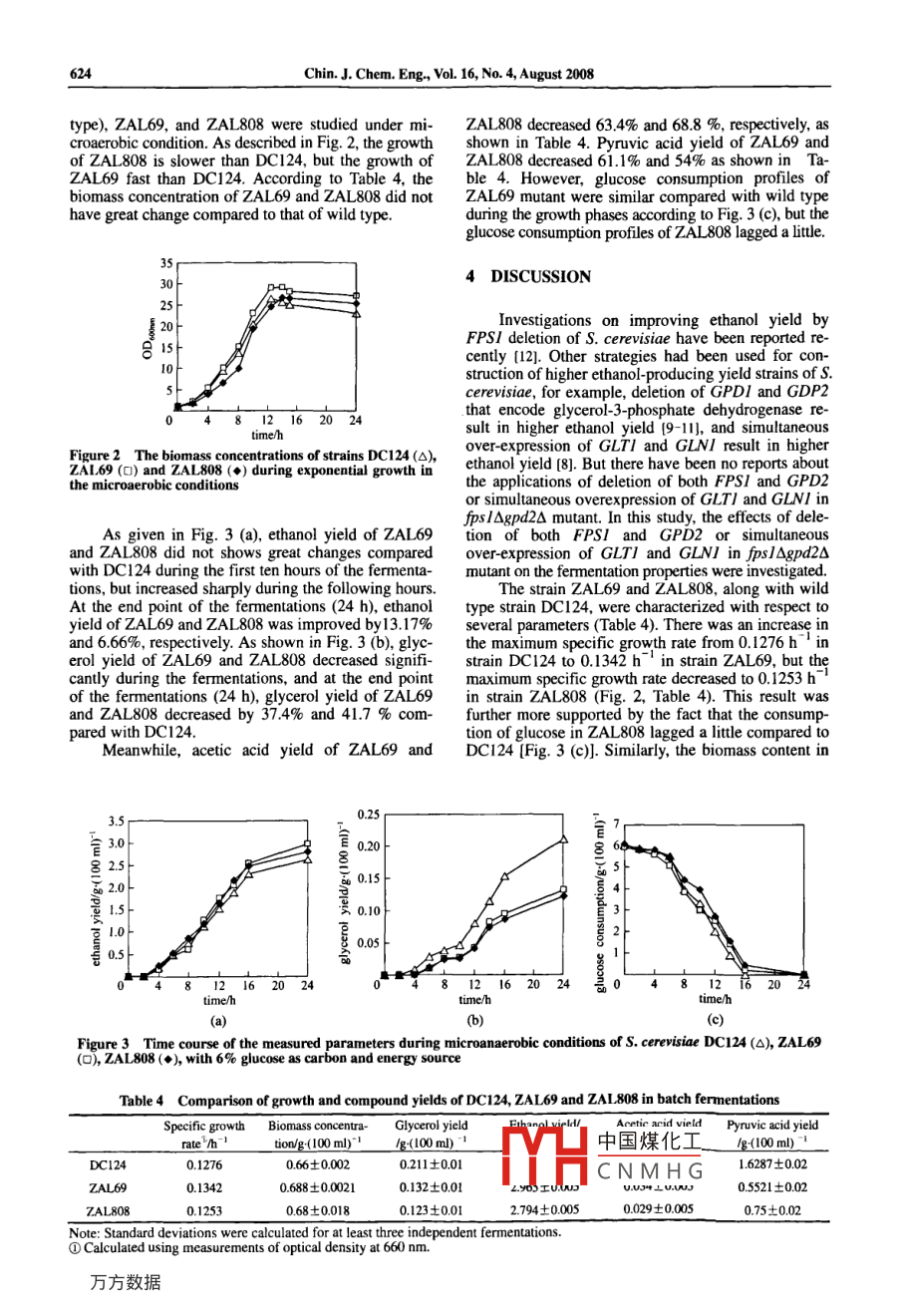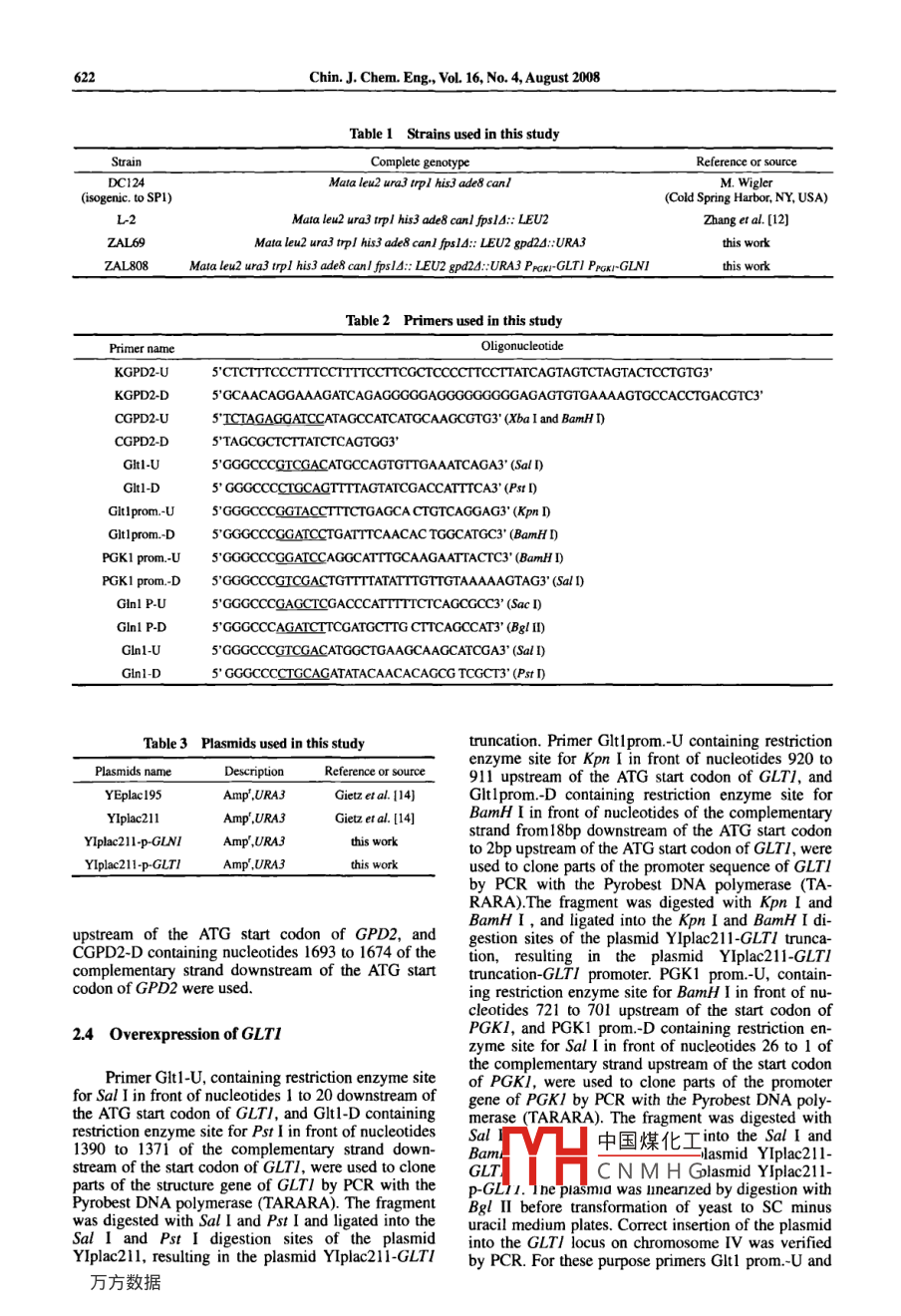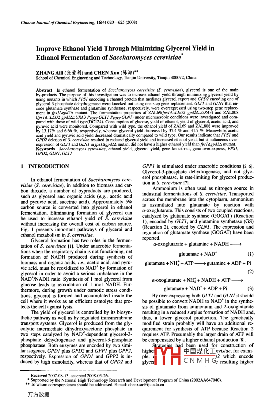 Chinese Joumal of Chemical Engineering, 16(4)620--625(2008)Improve ethanol Yield Through Minimizing glycerol Yield inEthanol Fermentation of Saccharomyces cerevisiaeZHANG Aili(張愛利) and CHEN Xun(陳洶)School of Chemical Engineering and Technology, Tianjin University. Tianjin 300072, ChinaAbstract In ethanol fermentation of Saccharomyces cerevisiae (S. cerevisiae), glycerol is one of the mainby-products. The purpose of this investigation was to increase ethanol yield through minimizing glycerol yieldn which FPS/ encoding a channel protein that mediates glycerol export and gPD2 encoding oneglycerol-3-phosphate dehydrogenase were knocked-out using one-step gene replacement. GLTI and GLNI that en-code glutamate synthase and glutamine synthetase, respectively, werement in psl△gpd2△ mutant. The fermentation properties of ZAL69sl△:EU2gpd2△:URA3)andupsLND)under miared with those of wild type(DC124) Consumption of glucose, yield of ethanol, yield of glycerol, acetic acid, andpyruvic acid were monitored. Compared with wild type, the ethanol yield of ZAL69 and ZAL808 were improved13. 17%and 6.66 %, respectively, whereas glycerol yield decreased by 37. 4 and 41.7 %. Meanwhile, aceticacid yield and pyruvic acid yield decreased dramatically compared to wild type. Our results indicate that FPS/ andGPD2 deletion of S. cerevisiae resulted in reduced glycerol yield and increased ethanol yield, but simultaneous over-expression of GLTI and GLNI in fps lAgpd2A mutant did not have a higher ethanol yield than fps / Agpd2A mutant.Keywords Saccharomyces cerevisiae, ethanol yield, glycerol yield, gene knock-out, gene over-express, FPSIGPD2, GLNI GLTI1 INTRODUCTIONGPPI is stimulated under anaerobicns[2-6Glycerol-3-Phosphate dehydrogenaseot glycIn ethanol fermentation of Saccharomyces cereerol phosphatase, is rate-limiting forvisiae(S cerevisiae), in addition to biomass and cartion in S cerevisiae (71bon dioxide, a number of byproducts are produced,Ammonium is often used as nitrogen source insuch as glycerol and organic acids (e.g, acetic acid industrial fermentations of S. cerevisand pyruvic acid, succinic acid). Approximately 5% across the membrane into the cytoplasm, ammoniumcarbon source is converted into glycerol in ethanols assimilated into glutamate by reaction withfermentation. Eliminating formation of glycerol can a-oxoglutarate This consists of two coupled reactionsbe used to increase ethanol yield of S. cerevisiae catalyzed by glutamate synthase(GOGAT)(Reactionwithout increasing the overall cost of carbon source. I), encoded by GLTI, and glutamine synthetase(GS)Fig. 1 presents important pathways of glycerol and (Reaction 2), encoded by GLNI. The expression andethanol metabolism in S cerevisiaeregulation of glutamate synthase (GoGAT) have beenGlycerol formation has two roles in the fermerreportedtation of S. cerevisiae [1]. Under anaerobic fermenta-a-oxoglutarate glutamine +NADH-tions when the respiratory chain is not functioning, netlutamate +NADformation of NADH produced during synthesis ofglycerol in order to avoid a serious imbue ormation of glutamate +NH4+ATP-gutamine ADP + Pibiomass and organic acids, i.e., acetic acid, and pyruvic acid, must be reoxidized to nad balance in theNAD/NADH ratio. Synthesis of I mol glycerol froma-oxoglutarate+NH4+NADH+ATP→→glucose leads to reoxidation of 1 mol NADH. Fur-thermore, during growth under osmotic stress condiglutamate NAD+ ADP + Pitions, glycerol is formed and accumulated inside theBy over-expressing both GLTI and GLNI it shouldcell where it works as an efficient osmolyte that pro- be possible to convert NADH to NAD in the synthe-tects the cell against lysis.sis of glutamate from ammonium and 2-oxoglutarateThe yield of glycerol is controlled by its biosyn- resulting in a reduced surplus formation of NADH andthetic pathway as well as by regulated transmembrane thus, a lower glycerol production. The geneticallycolytic intermediate dihydroxyacetone phosphate in quirement for synthesis of ATP because Reaction 2two steps catalyzed by NAD-dependent glycerol-3- requires ATP. Presumably the larger drain of ATP willphosphate dehydrogenase and glycerol-3-phosphate be compensated by a higher ethanol production[8].phosphatase. Both enzymes are encoded by two simibeen used for construction oflar isogenes, GPDI plus GPD2 and GPPI plus GPP2, high中國煤化工 violae, for examively. Expression of GPDIiPPduced by high osmolarity, whereas that of GPDZ and glycerCNMH Ge resulting higherReceived 2007-08-13, accepted 2008-03-26supported by the National High Technology Research and Development Program of China(2002AA647040)Towhomcorrespondenceshouldbeaddressed.E-mail:chenxun@tju.edu.cnChin J. Chem Eng, Vol. 16, No. 4, August 200621mass部fructose-1. 6BPbiomass eglyceraldenhvde- 3P+ dihydroxyacetone-PNADH GPDIGPD212NADGUT2phosphoglyceratebiomass +3-phosphoglycerateFPS/2-phosphoglyceratephosphNADH NADNADHTCAFigure 1 Important pathways of glycerol and ethanol metabolism in S cerevisiaeimportant enzyme: I--hexokinase(glucokinase); 2- phosphoglucose isomerase: 3-phasphofructokinase 4--aldolase5-triose phosphate isomerase: 6--NAD-dependent glycerol-3-phosphate dehydrogenase; 7--glycerol-3-phosphatase8-glycerolaldehyd-3-phosphate dehydrogenase; 9- phosphoglycerate kinase; I0--phosphoglycerate mutase: 11enolase: 12- pyruvate kinase; 13- pyruvate decarboxylase; 14--alcohol dehydrogenase: 15--aldehyde dehydrogenase16-glycerol kinase: 17--FAD-dependent glycerol-3-phosphate dehydrogenasethanol yield [9-11], deletion of FPSI to increase 2.2 Plasmids and strains constructionsethanol yield [12], and simultaneous overexpression ofGLTI and GLNI resulting in higher ethanol yield [8]he primers and plasmids used in this study wereBut there have been no reports about the applications described in Table 2 and Table 3, respectivelyof deletion of both fpsi and gPd or simultaneousoverexpression of GLT/ and GLNI in fps/△gpd2△mutant. Hence, the purpose of this study was to inves2.3 D