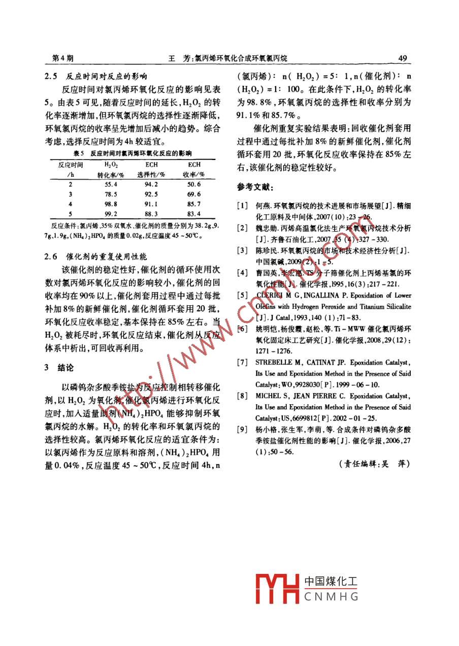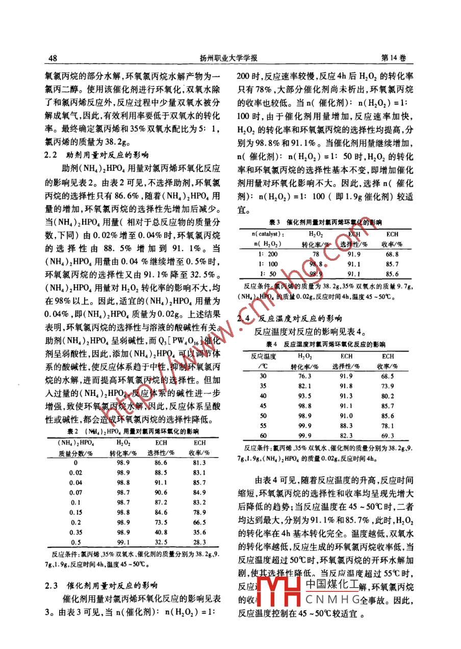 第14卷第4期揚(yáng)州職業(yè)大學(xué)學(xué)報(bào)Vol. 14 No 42010年12月Journal of Yangzhou Polytechnic CollegeDec.2010氯丙烯環(huán)氧化合成環(huán)氧氯丙烷王芳(揚(yáng)州工業(yè)職業(yè)技術(shù)學(xué)院,江蘇揚(yáng)州225127)摘要:用合成的復(fù)合季銨磷鎢酸鹽為催化劑,35%雙氧水溶液為氧源,催化氧丙烯合成環(huán)氧氯丙烷,并考察了反應(yīng)條件對(duì)反應(yīng)的影響。結(jié)果表明,加入適量的磷酸二氫銨能抑制環(huán)氧氣丙烷的水解,從而提高反應(yīng)的選擇性。反應(yīng)的適宜條件為:氯丙烯為原料和反應(yīng)溶劑,磷酸氫二銨用量(相對(duì)于總反應(yīng)物的質(zhì)量分?jǐn)?shù))0.04%,反應(yīng)溫度45~50℃,反應(yīng)時(shí)間4h,n(氧丙烯):n(H2O2)=5:1,n(催化劑):n(H2O2)=1:100。H2O2的轉(zhuǎn)化率為98.8%,環(huán)氧氯丙烷的選擇性和收率分別為91.1%和85.7%。該催化劑的穩(wěn)定性好,回收的催化劑性能接近新鮮催化劑關(guān)鍵詞:復(fù)合季銨磷鎢酸鹽;氯丙烯;環(huán)氧化;環(huán)氧氯丙烷;雙氧水中圖分類號(hào):TQ223.2文獻(xiàn)標(biāo)識(shí)碼:A文章編號(hào):1008-3693(2010)04-0046-04Synthesis of Epichlorohydrin by Epoxidation of Allyl ChlorideWANG Fang(Yangzhou Vocational Institute of Technology, Yangzhou 225127, ChinaAbstract: With 35% hydrogen peroxide as oxidant and synthesized compound quaternary ammonium phospho-tungstates as catalyst, epichlorohydrin( ECH is synthesized from allyl chloride. during this experimenteffects of additives, catalyst dosage, mole ratio of hydrogen peroxide of allyl chloride, reaction time and temper-ature of reaction are studied. The result indicates that addition of( NH4)2 HPO, can improve selectivity of ECHdue to inhibition of ECH hydrolysis. Optimal conditions of the epoxidation of allyl chloride are as follows: n(allyl chloride ) n(H202)=5: 1, n( catalyst): n(H,02)=1: 100, reaction temperature is 45-50C andtime is 4h, 0. 04%(w/w)(NH4)2 HPO4 as additives and allyl chloride as solvent, H, 02 conversion is 988%, selectivity to ECH is 91. 1%and yield to ECH is 85. 7%. When the catalyst, which possesses high stabil-ty, is recycled, it can still keep similar catalytic activity to fresh catalystKey words: compound quaternary ammonium phosphotungstates; allyl chloride; epoxidation; epichlorohydrin;hydrogen peroxide環(huán)氧氯丙烷是一種重要的有機(jī)化工中間體和含鹵素廢水同時(shí)設(shè)備腐蝕嚴(yán)重,能耗高。另精細(xì)化工產(chǎn)品,用途十分廣泛。目前,其工業(yè)生產(chǎn)一種制備環(huán)氧氯丙烷的方法是以雙氧水為氧化主要有丙烯高溫氯化法和醋酸烯丙酯法,這兩種劑、鈦硅分子篩(TS1)或T-MwW2為催化方法雖各有特點(diǎn)但其中的環(huán)氧化反應(yīng)均采用氯劑6,通過氯丙烯環(huán)氧化來生產(chǎn),該方法雖然克醇法和皂化過程可產(chǎn)生大量的氯化鈣副產(chǎn)物和服了氫醇法的缺點(diǎn)但T1催化劑價(jià)格昂貴需中國(guó)煤化工收稿日期:2010-06-12CNMHG作者簡(jiǎn)介:王芳(1981一),女,揚(yáng)州工業(yè)職業(yè)技術(shù)學(xué)院化學(xué)工程系勳教,碩士研究生第4期王芳:氯丙烯環(huán)氟化合成環(huán)氧氯丙烷要引人醇或腈等作為反應(yīng)溶劑,分離難度大,反應(yīng)過程中催化劑溶解,反應(yīng)4h催化劑析出,靜反應(yīng)穩(wěn)定性差,制約著該方法的工業(yè)化。置后體系分為油、水、固三相,油層通過精餾分離用磷鎢雜多酸季銨鹽作為反應(yīng)控制相轉(zhuǎn)移催得到含量大于99.8%的環(huán)氧氯丙烷(ECH),過量化劑,催化氯丙烯進(jìn)行環(huán)氧化反應(yīng)制備環(huán)氧氯丙的氯丙烯循環(huán)套用,水層中環(huán)氧氯丙烷通過共沸烷,是一種生產(chǎn)環(huán)氧氯丙烷的綠色新工藝。本研汽提分離出少量的環(huán)氧氯丙烷,析出的催化劑在究采用廉價(jià)的季銨鹽[C16H3(CH3)3(X%)+C1補(bǔ)加一定量的新鮮催化劑后循環(huán)套用。Hx(CH3)3(1-X%)]Ncl-(簡(jiǎn)記為Qcl)作1.4分析測(cè)試為相轉(zhuǎn)移劑,制備了一種新型的Q3[PW4016]復(fù)環(huán)氧化反應(yīng)產(chǎn)物用島津GC-14C氣譜儀分合磷鎢酸季銨鹽為反應(yīng)挖制相轉(zhuǎn)移催化劑催化析,FID檢測(cè)器,N000色譜數(shù)據(jù)工作站色譜柱氯丙烯進(jìn)行環(huán)氧化反應(yīng)合成環(huán)氧氯丙烷,同時(shí)考Rt-1701,30mx0.53mmx1.0μm。H2O2的含量察了反應(yīng)條件對(duì)反應(yīng)的影響采用碘量法進(jìn)行測(cè)定。反應(yīng)過程中分解的氧氣采1實(shí)驗(yàn)部分用便攜式數(shù)字測(cè)氧儀RSS-5100測(cè)定。H2O2轉(zhuǎn)化率=1-(反應(yīng)前H2O2物質(zhì)的量1.1試劑反應(yīng)后H2O2物質(zhì)的量)/反應(yīng)前H2O2物質(zhì)的鎢酸鈉:分析純,浙江菱湖精細(xì)化工廠;H2O2量;H2O2有效利用率=1-H2O2分解的物質(zhì)的水溶液W(H2O2)分別為27.5%和35%,江蘇揚(yáng)量/(反應(yīng)前H2O2物質(zhì)的量-反應(yīng)后H2O2物質(zhì)農(nóng)化工集團(tuán);十六烷基三甲基氯化銨十八烷基三的量);ECH選擇性=ECH物質(zhì)的量/氯丙烯反應(yīng)甲基氯化銨:國(guó)藥集團(tuán)上海化學(xué)試劑有限公司;后總產(chǎn)物物質(zhì)的量;ECH收率=H2O2有效利用85%H3PO4、35%HCl、氯丙烯、(NH4)2HPO4:分率xECH選擇性析純,國(guó)藥集團(tuán)上?;瘜W(xué)試劑有限公司。1.2催化劑的合成2結(jié)果與討論100mL燒瓶中加人332g(10mm)9.5%2.1原料配比對(duì)反應(yīng)的影響的鎢酸鈉,用20mL去離子水溶解,然后滴加表1原料摩爾比與氯化反應(yīng)的關(guān)系97g(20mmo)36-38%濃鹽酸立即