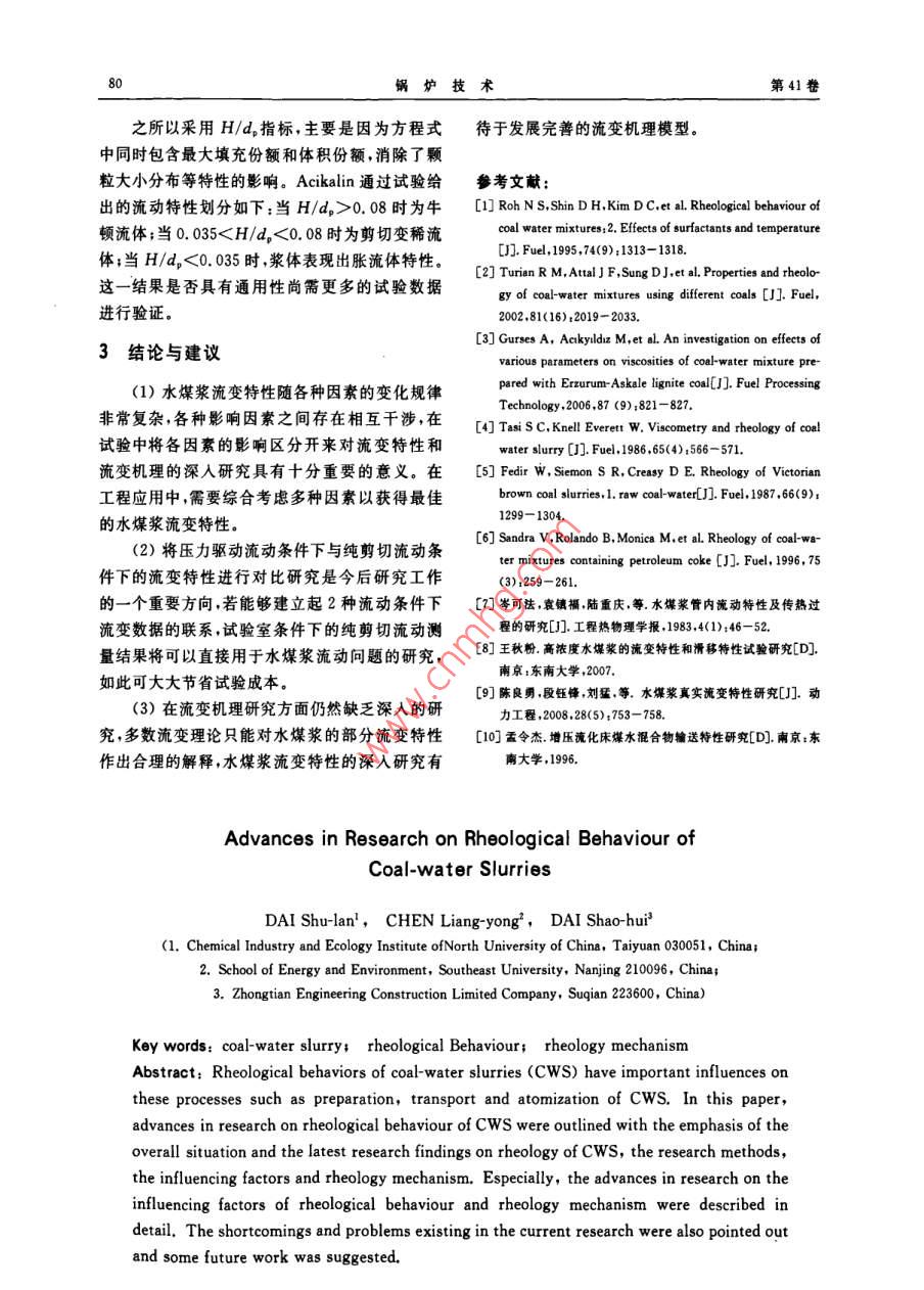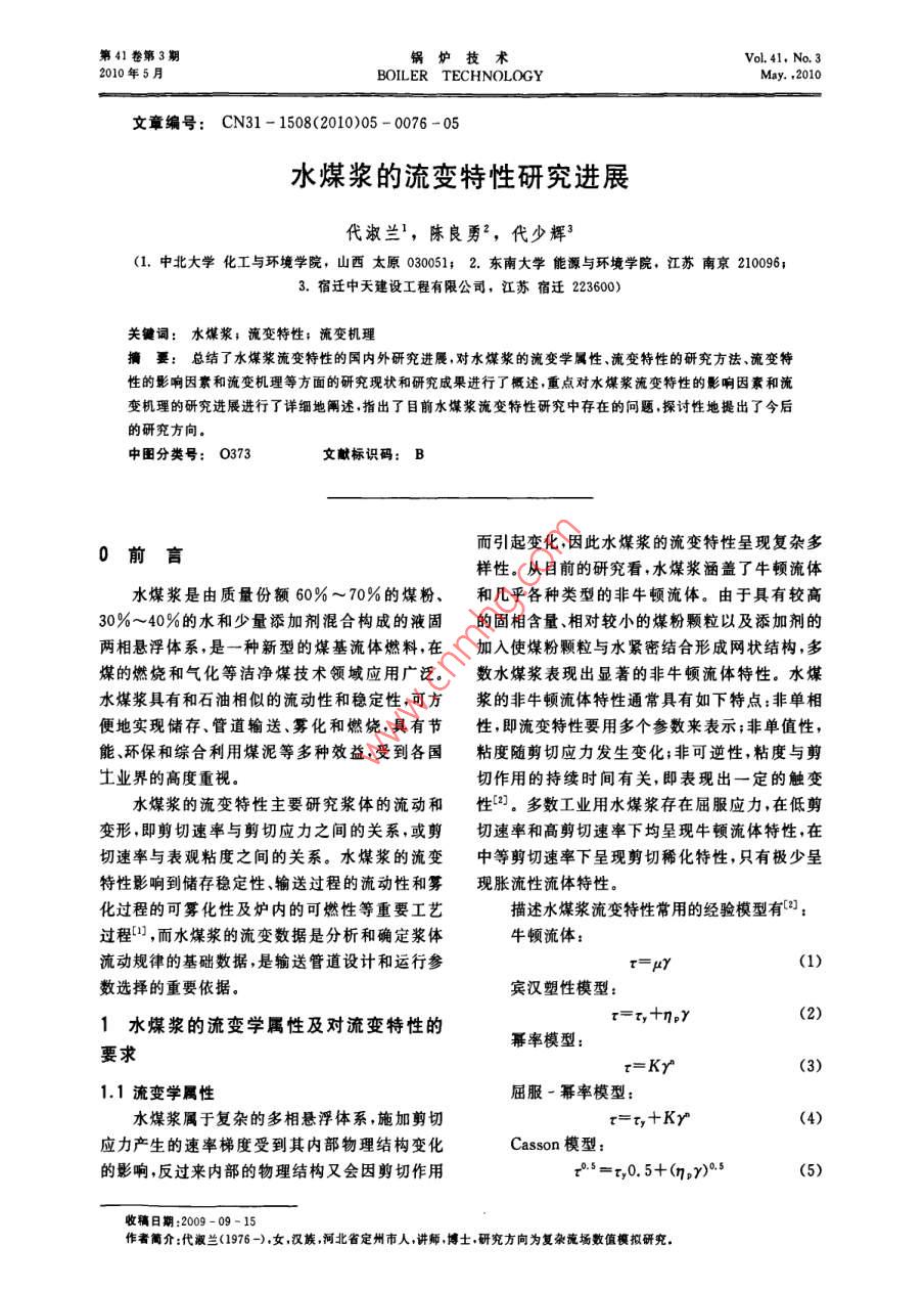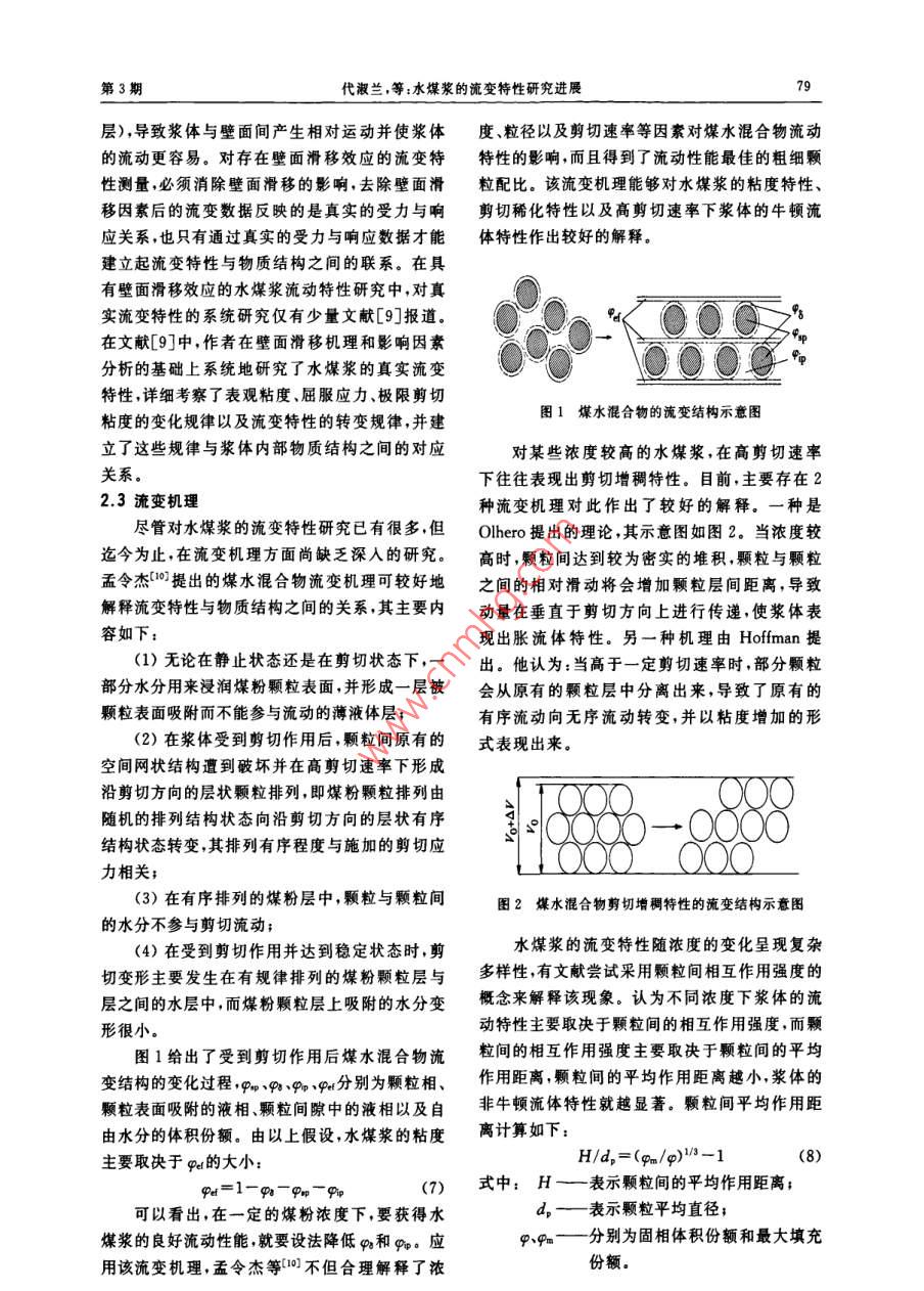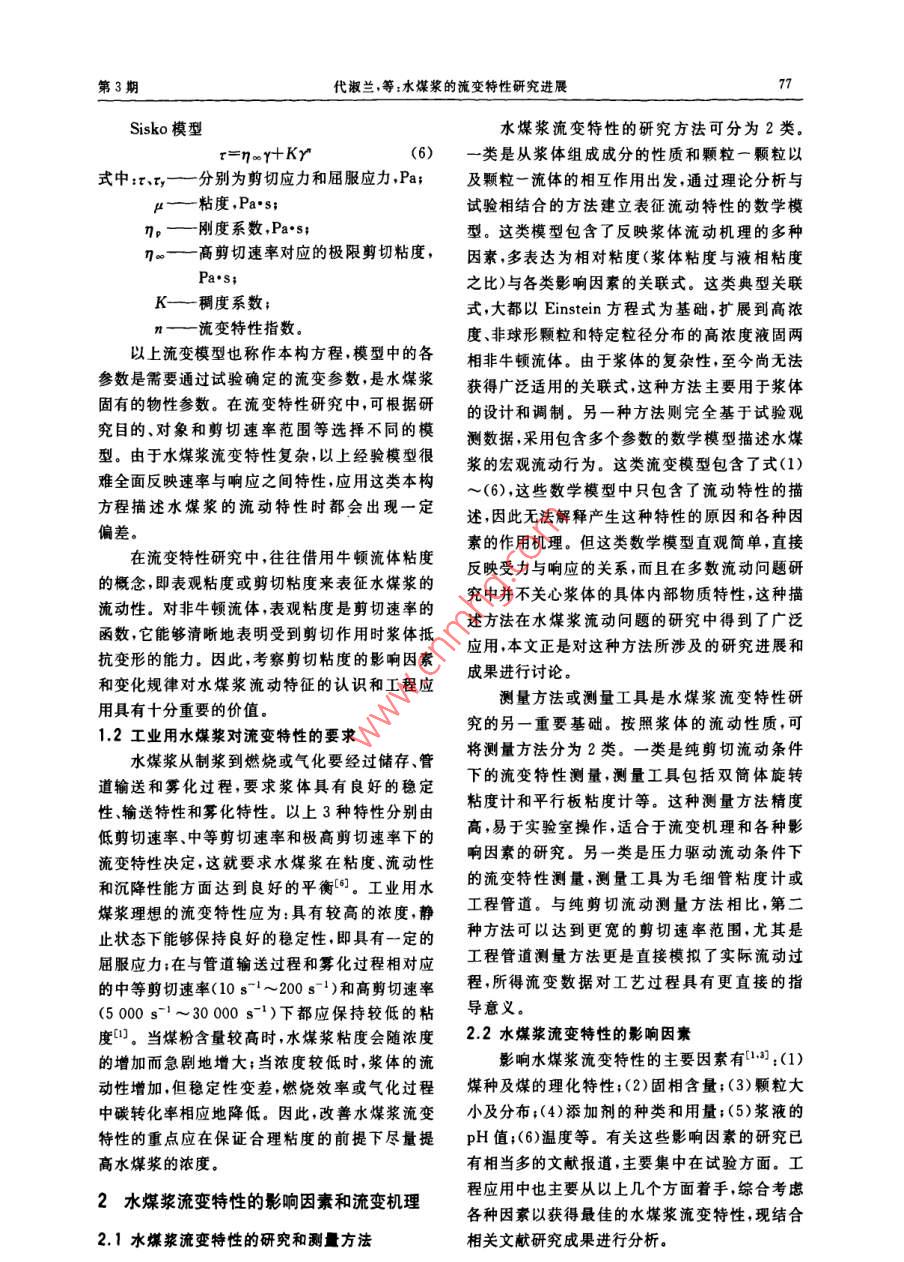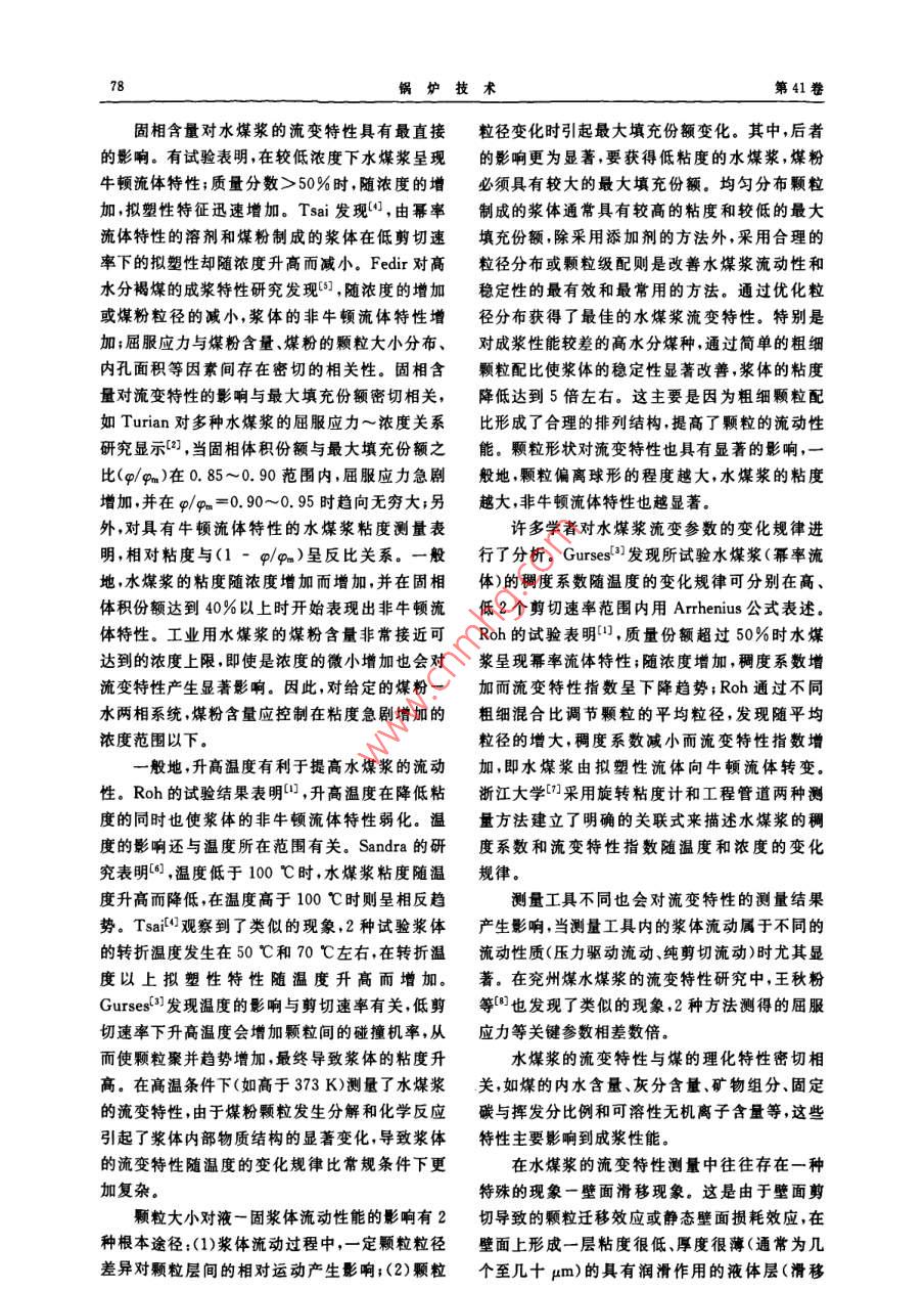 第41卷第3期鍋爐技術(shù)Vol 41. No. 32010年5月BOILER TECHNOLOGYlay.,2010文章編號(hào):CN31-1508(2010)05-0076-05水煤漿的流變特性研究進(jìn)展代淑蘭1,陳良勇2,代少輝3(1,中北大學(xué)化工與環(huán)境學(xué)院,山西太原030051;2.東南大學(xué)能源與環(huán)境學(xué)院,江蘇南京210096;3.宿遷中天建設(shè)工程有限公司,江蘇宿遷223600關(guān)鍵詞:水煤漿;流變特性;流變機(jī)理擴(kuò)要:總結(jié)了水煤漿流變特性的國(guó)內(nèi)外研究進(jìn)展,對(duì)水煤漿的流變學(xué)屬性、流變特性的研究方法、流變特性的影響因素和流變機(jī)理等方面的研究現(xiàn)狀和研究成果進(jìn)行了概述,重點(diǎn)對(duì)水煤漿流變特性的影響因素和流變機(jī)理的研究進(jìn)展進(jìn)行了詳細(xì)地闡述,指出了目前水煤漿流變特性研究中存在的問題探討性地提出了今后的研究方向中圖分類號(hào):O373文獻(xiàn)標(biāo)識(shí)碼:B0前言而引起變化,因此水煤漿的流變特性呈現(xiàn)復(fù)雜多樣性。從目前的研究看,水煤漿涵蓋了牛頓流體水煤漿是由質(zhì)量份額60%~70%的煤粉、和幾乎各種類型的非牛頓流體。由于具有較高30%~40%的水和少量添加劑混合構(gòu)成的液固的固相含量、相對(duì)較小的煤粉顆粒以及添加劑的兩相懸浮體系,是一種新型的煤基流體燃料,在加入使煤粉顆粒與水緊密結(jié)合形成網(wǎng)狀結(jié)構(gòu),多煤的燃燒和氣化等潔凈煤技術(shù)領(lǐng)域應(yīng)用廣泛。數(shù)水煤漿表現(xiàn)出顯著的非牛頓流體特性。水煤水煤漿具有和石油相似的流動(dòng)性和穩(wěn)定性,可方漿的非牛頓流體特性通常具有如下特點(diǎn):非單相便地實(shí)現(xiàn)儲(chǔ)存、管道輸送、霧化和燃燒,具有節(jié)性,即流變特性要用多個(gè)參數(shù)來(lái)表示;非單值性,能、環(huán)保和綜合利用煤泥等多種效益,受到各國(guó)粘度隨剪切應(yīng)力發(fā)生變化;非可逆性,粘度與剪士業(yè)界的高度重視切作用的持續(xù)時(shí)間有關(guān),即表現(xiàn)出一定的觸變水煤漿的流變特性主要研究漿體的流動(dòng)和性(2。多數(shù)工業(yè)用水煤漿存在屈服應(yīng)力,在低剪變形,即剪切速率與剪切應(yīng)力之間的關(guān)系,或剪切速率和高剪切速率下均呈現(xiàn)牛頓流體特性,在切速率與表觀粘度之間的關(guān)系。水煤漿的流變中等剪切速率下呈現(xiàn)剪切稀化特性,只有極少呈特性影響到儲(chǔ)存穩(wěn)定性、輸送過程的流動(dòng)性和霧現(xiàn)脹流性流體特性。化過程的可霧化性及爐內(nèi)的可燃性等重要工藝描述水煤漿流變特性常用的經(jīng)驗(yàn)?zāi)P陀羞^程,而水煤漿的流變數(shù)據(jù)是分析和確定漿體牛頓流體:流動(dòng)規(guī)律的基礎(chǔ)數(shù)據(jù),是輸送管道設(shè)計(jì)和運(yùn)行參(1)數(shù)選擇的重要依據(jù)賓漢塑性模型:水煤漿的流變學(xué)屬性及對(duì)流變特性的y(2)冪率模型:要求Kr(3)1.1流變學(xué)屬性屈服一冪率模型:水煤漿屬于復(fù)雜的多相懸浮體系,施加剪切tky應(yīng)力產(chǎn)生的速率梯度受到其內(nèi)部物理結(jié)構(gòu)變化Casson模型:的影響,反過來(lái)內(nèi)部的物理結(jié)構(gòu)又會(huì)因剪切作用(5)收稿日期:2009-09-15作者簡(jiǎn)介:代淑蘭(1976-),女漢族河北省定州市人,講師博士研究方向?yàn)閺?fù)雜流場(chǎng)數(shù)值模擬研究第3期代淑蘭,等:水煤漿的流變特性研究進(jìn)展Sisko模型水煤漿流變特性的研究方法可分為2類r=n∞y+Ky)一類是從漿體組成成分的性質(zhì)和顆粒一顆粒以式中:、r,—分別為剪切應(yīng)力和屈服應(yīng)力,Pa;及顆粒一流體的相互作用出發(fā),通過理論分析與粘度,Pa試驗(yàn)相結(jié)合的方法建立表征流動(dòng)特性的數(shù)學(xué)模n,—?jiǎng)偠认禂?shù),Pa·s;型。這類模型包含了反映漿體流動(dòng)機(jī)理的多種7∞高剪切速率對(duì)應(yīng)的極限剪切粘度,因素多表達(dá)為相對(duì)粘度(漿體粘度與液相粘度之比)與各類影響因素的關(guān)聯(lián)式。這類典型關(guān)聯(lián)K—稠度系數(shù);式,大都以 Einstein方程式為基礎(chǔ)擴(kuò)展到高濃流變特性指數(shù)度、非球形顆粒和特定粒徑分布的高濃度液固兩以上流變模型也稱作本構(gòu)方程,模型中的各相非牛頓流體。由于漿體的復(fù)雜性,至今尚無(wú)法參數(shù)是需要通過試驗(yàn)確定的流變參數(shù),是水煤漿獲得廣泛適用的關(guān)聯(lián)式,這種方法主要用于漿體固有的物性參數(shù)。在流變特性研究中,可根據(jù)研的設(shè)計(jì)和調(diào)制。另一種方法則完全基于試驗(yàn)觀究目的,對(duì)象和剪切速率范圍等選擇不同的模測(cè)數(shù)據(jù),采用包含多個(gè)參數(shù)的數(shù)學(xué)模型描述水煤型。由于水爆漿流變特性復(fù)雜,以上經(jīng)驗(yàn)?zāi)P秃軡{的宏觀流動(dòng)行為。這類流變模型包含了式(1)難全面反映速率與響應(yīng)之間特性,應(yīng)用這類本構(gòu)(6),這些數(shù)學(xué)模型中只包含了流動(dòng)特性的描方程描述水煤漿的流動(dòng)特性時(shí)都會(huì)出現(xiàn)一定述,因此無(wú)法解釋產(chǎn)生這種特性的原因和各種因偏差。素的作用機(jī)理。但這類數(shù)學(xué)模型直觀簡(jiǎn)單,直接在流變特性研究中,往往借用牛頓流體粘度反映受力與響應(yīng)的關(guān)系,而且在多數(shù)流動(dòng)