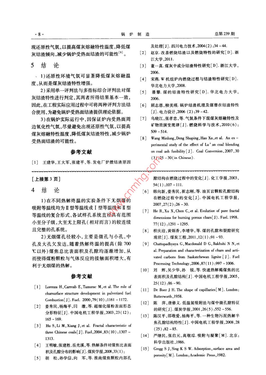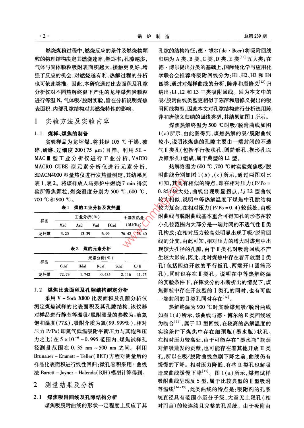 第3期鍋爐制造2013年5月BOILER MANUFACTURINGMay,2013文章編號:CN23-1249(2013)03-0001-04煤熱解的孔隙結(jié)構(gòu)特性劉亮,朱超,原滿,楊哲,肖波(長沙理工大學(xué)可再生能源電力技術(shù)湖南省重點(diǎn)實(shí)驗(yàn)室,湖南長沙410076)摘要:在同熱解時間與相同粒度,不同熱解終溫的實(shí)驗(yàn)條件下,利用馬弗爐熱解龍坪煤獲得煤焦試樣;用№2氣體吸附/脫附方法進(jìn)行實(shí)驗(yàn)研究。實(shí)驗(yàn)結(jié)果表明:在此實(shí)驗(yàn)條件下,不同熱解終溫下煤焦顆粒試樣大體上均是Ⅱ型等溫線(或包含Ⅱ型等溫線);煤焦的孔徑較小,主要是微孔與小孔,且含有少量的中孔及大孔。在熱解終溫不斷提高的實(shí)驗(yàn)條件下,孔的結(jié)構(gòu)及種類變得復(fù)雜多樣化孔的比表面積及孔容積總體上呈現(xiàn)增加上升的趨勢,表明提高熱解終溫有助于龍坪煤的熱解。關(guān)鍵詞:龍坪煤;熱解終溫;煤焦試樣;比表面積;孔隙結(jié)構(gòu)中圖分類號:TKl1+1文獻(xiàn)標(biāo)識碼:APore Structure Properties of CoalLiu liang, Zhu Chao, Yuan Man, Yang Zhe, Xiao BoKey Laboratory of Regenerative Energy Electric-Technologyin in Hunan ProvinceChangsha University of Science and Technology, Changsha 410076, China)Abstract: In a muffle furmace pyrolysis Long Ping coal with the same time, the same particle size,different pyrolysis final temperature of the coal tar sample. Experimental study and theoretical analy-sis shows that the adsorption isothermal curves obtained from the samples were adsorption isothermalcurves of type I or contain it. Mainly microporous with small holes of coking. The results indicatethat total pore volume and specific surface area increase with the increasing of final pyrolysis temper-ature on the experimental conditions, which is beneficial to pyrolysisKey words: long ping coal final pyrolysis temperature; coal tar sample; pecific surface area; pore structure0引言煤粉的吸附特性、反應(yīng)速率6”。因此,要掌握煤粉燃燒、熱解、燃燼特性及其反應(yīng)過程中的變化規(guī)煤粉的熱分解及燃燒均發(fā)生在其表面及孔隙律,研究煤焦的比表積、孔隙結(jié)構(gòu)具有重要意義。之中,它是一個多相反應(yīng)過程。煤焦物理結(jié)構(gòu)的對于煤焦比表面積、孔隙結(jié)構(gòu)對煤粉燃燒特主要部分是孔隙結(jié)構(gòu)煤粉及其煤焦中揮發(fā)分析性的影響,目前,國內(nèi)諸多學(xué)者進(jìn)行了比較深入的出、反應(yīng)介質(zhì)進(jìn)入其孔隙,而后吸附在孔隙表面發(fā)研究。如哈爾濱工業(yè)大學(xué)劉輝等人在特定的高生化學(xué)反應(yīng)、反應(yīng)后的產(chǎn)物在其表面上的解吸然溫,不同粒度、不同熱解時間的實(shí)驗(yàn)條件下,制取了后向空間擴(kuò)散等,其與這一系列物理化學(xué)反應(yīng)過程煤焦試樣,對其進(jìn)行比表面積及孔徑分析,得出了有顯著的聯(lián)系-)。比表面積及孔隙結(jié)構(gòu)的大小煤焦的孔系統(tǒng)直徑范圍小至分子級大至無上限孔對熱解以及燃燒過程都有顯著影響,直接決定了(相對而言)較連續(xù)且完整的孔結(jié)構(gòu)的結(jié)論。收稿日期:2013-01-18基金項(xiàng)目:長沙理工大學(xué)博士啟動基金項(xiàng)目(20110609);省重點(diǎn)實(shí)驗(yàn)室資助。作者簡介:劉亮(1967-),男,湖南臨湘人,博士,教授,主要從事燃燒理論及污染物生成機(jī)理及控制技術(shù)方面的研究。鍋爐制造總第239期燃燒煤粉過程中,燃燒反應(yīng)的條件及燃燒物顆孔隙的結(jié)構(gòu)特征:德·博爾(de·Boer)將吸附回線粒的物理結(jié)構(gòu)決定其燃燒速率、燃燼率;孔隙越多,歸納為A類、B類、C類、D類、E類五大類;在氣體與固體顆粒吸附表面積越大,接觸更良好,增德·博爾提出分類的基礎(chǔ)上,國際純化學(xué)與應(yīng)用化強(qiáng)了反應(yīng)的機(jī)會,對燃燒越有利,熱解過程的分析學(xué)聯(lián)合會推薦將吸附回線分為:田、丑2、H和H4也可依此類推。因此,本研究通過比表面積及孔隙四類;通過對煤樣曲線的分析陳萍和唐修義2歸分析儀對不同熱解終溫下產(chǎn)生的龍坪煤焦炭顆粒納出:L1、12和13三類吸附回線。因?yàn)楸疚闹械倪M(jìn)行等溫N2氣體吸/脫附實(shí)驗(yàn),旨在分析說明煤焦吸/脫附曲線類型更相似于陳萍和唐修義提出的吸表面積、內(nèi)部孔隙結(jié)構(gòu)對其燃燒特性的影響附回線類型,因此本文對孔隙結(jié)構(gòu)進(jìn)行分析選用陳實(shí)驗(yàn)方法及實(shí)驗(yàn)內(nèi)容萍和唐修義歸納的回線類型,其結(jié)果如圖1所示。煤焦熱解終溫為500℃時吸/脫附曲線如圖1.1煤樣、煤焦的制備l(a)所示,由此圖得到,煤焦熱解的吸/脫附曲線實(shí)驗(yàn)樣品為龍坪煤,將其經(jīng)105℃千燥、破較小,說明該煤焦的孔隙主要由一端封閉的不透碎、研磨、過細(xì)度200(75μm)目篩。利用5E-氣Ⅱ類孔(包括平行板狀孔、圓筒形孔、楔形孔以MACⅢ型工業(yè)分析儀進(jìn)行工業(yè)分析、 VARIO及錐形孔)組成,屬于典型的L型。MACRO CUBE型元素分析儀進(jìn)行元素分析熱解終溫為600℃、700℃時實(shí)驗(yàn)煤焦吸/脫SDACM4000型量熱儀進(jìn)行發(fā)熱量測定,其結(jié)果見附曲線分別如圖1(b)、(c)所示,通過兩圖對比表1、表2。將煤樣放入馬弗爐中燃燒7min得實(shí)可知,其具有相似的特點(diǎn),即在相對壓力(P/P=驗(yàn)所需焦顆粒,燃燒溫度分別為500℃、600℃、0.85)較大處,曲線出現(xiàn)明顯拐點(diǎn),與L2型曲線700℃