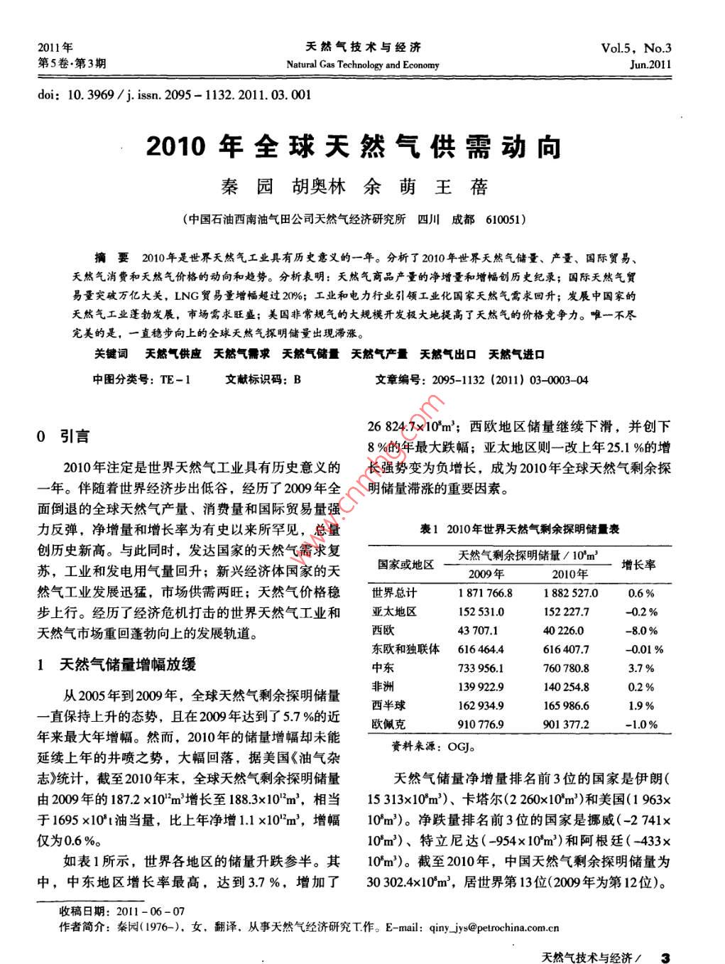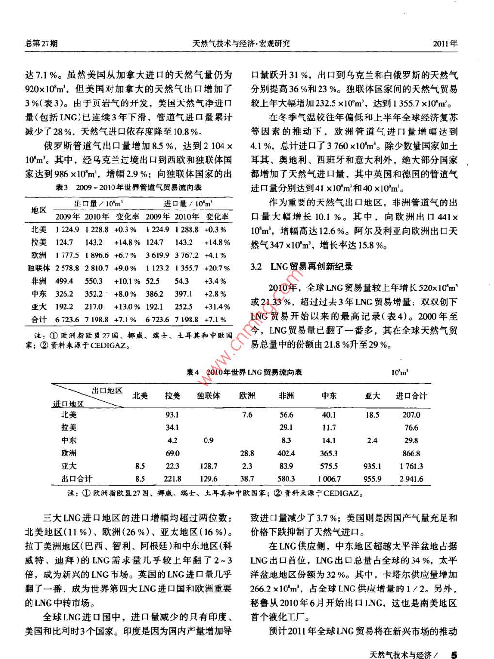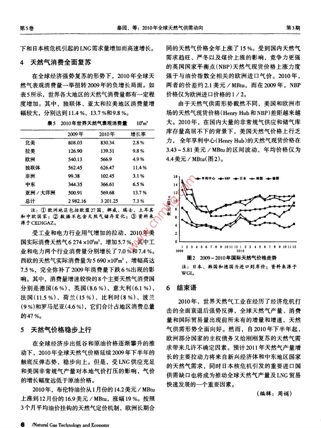 2011年天然氣技術(shù)與經(jīng)濟(jì)Vol5, No. 3第5卷·第3期Natural Gas Technology and EconomyJun.2011doi:10.3969/j.isn.2095-1132.2011.03.0012010年全球天然氣供需動(dòng)向秦園胡奧林余萌王蓓(中國石油西南油氣田公司天然氣經(jīng)濟(jì)研究所四川成都610051)摘要2010年是世界天然氣工業(yè)具有歷史意義的一年。分析了2010年世界天然氣儲(chǔ)量、產(chǎn)量、國際貿(mào)易、天然氣消費(fèi)和天然氣價(jià)格的動(dòng)向和趨勢(shì)。分析表明:天然氣商品產(chǎn)量的凈增量和增幅創(chuàng)歷史紀(jì)錄;國際天然氣貿(mào)易量突破萬億大關(guān),LNG貿(mào)易量增幅超過20%;工業(yè)和電力行業(yè)引領(lǐng)工業(yè)化國家天然氣需求回升;發(fā)展中國家的夭然氣工業(yè)蓬勃發(fā)展,市場(chǎng)需求旺盛;美國非常規(guī)氣的大規(guī)模開發(fā)極大地提高了天然氣的價(jià)格競(jìng)爭(zhēng)力。唯一不盡完美的是,一直穩(wěn)步向上的全球天然氣探明儲(chǔ)量出現(xiàn)滯漲。關(guān)鍵詞天懿氣供應(yīng)天然氣需求天然氣儲(chǔ)量天然氣產(chǎn)量天然氣出囗天然氣進(jìn)口中圖分類號(hào):TE-1文獻(xiàn)標(biāo)識(shí)碼:B文章編號(hào):2095-1132(2011)03-0003040引言268247×10m3;西歐地區(qū)儲(chǔ)量繼續(xù)下滑,并創(chuàng)下8%的年最大跌幅;亞太地區(qū)則一改上年25.1%的增2010年注定是世界天然氣工業(yè)具有歷史意義的長(zhǎng)強(qiáng)勢(shì)變?yōu)樨?fù)增長(zhǎng),成為2010年全球天然氣剩余探一年。伴隨著世界經(jīng)濟(jì)步出低谷,經(jīng)歷了2009年全明儲(chǔ)量滯漲的重要因素。面倒退的全球天然氣產(chǎn)量、消費(fèi)量和國際貿(mào)易量強(qiáng)力反彈,凈增量和增長(zhǎng)率為有史以來所罕見,總量表12010年世界天然氣剩余探明儲(chǔ)量表創(chuàng)歷史新高。與此同時(shí),發(fā)達(dá)國家的天然氣需求復(fù)天然氣剩余探明儲(chǔ)量/10m蘇,工業(yè)和發(fā)電用氣量回升;新興經(jīng)濟(jì)體國家的天增長(zhǎng)率200年2010年然氣工業(yè)發(fā)展迅猛,市場(chǎng)供需兩旺;天然氣價(jià)格穩(wěn)世界總計(jì)187176681882527006%步上行。經(jīng)歷了經(jīng)濟(jì)危機(jī)打擊的世界天然氣工業(yè)和亞太地區(qū)152531.01522277-0.2%天然氣市場(chǎng)重回蓬勃向上的發(fā)展軌道。西歐402260東歐和獨(dú)聯(lián)體616464461640770011天然氣儲(chǔ)量增幅放緩中東733956.13.7%從2005年到2009年,全球天然氣剩余探明儲(chǔ)量非洲1399229140254.802%西半球1629349165986.619%直保持上升的態(tài)勢(shì),且在2009年達(dá)到了57%的近歐佩克年來最大年增幅。然而,2010年的儲(chǔ)量增幅卻未能9107769901372-10%資料來源:OGJ。延續(xù)上年的井噴之勢(shì),大幅回落,據(jù)美國《油氣雜志》統(tǒng)計(jì),截至2010年末,全球天然氣剩余探明儲(chǔ)量天然氣儲(chǔ)量?jī)粼隽颗琶?位的國家是伊朗(由200年的1872×10m3增長(zhǎng)至1883×102m3,相當(dāng)15313×10m3)、卡塔爾(2260×10m3)和美國(1963x于1695×10t油當(dāng)量,比上年凈增1.1×10"m3,增幅10ym3)。凈跌量排名前3位的國家是挪威(-2741x僅為06%。10m3)、特立尼達(dá)(-954×10m3)和阿根廷(-433如表1所示,世界各地區(qū)的儲(chǔ)量升跌參半。其10m3)。截至2010年,中國天然氣剩余探明儲(chǔ)量為中,中東地區(qū)增長(zhǎng)率最高,達(dá)到37%,增加了303024×10m3,居世界第13位(2009年為第12位)收稿日期:2011-06-07作者簡(jiǎn)介:秦園(1976-),女,翻譯,從事天然氣經(jīng)濟(jì)研究T作。E-mail:qin_jys@petrochina.com.cn天然第5卷秦園,等:2010年全球天然氣供需動(dòng)向第3期2天然氣商品產(chǎn)量強(qiáng)勢(shì)反彈,增量和增幅均最高水平。另外兩個(gè)主要產(chǎn)氣國土庫曼斯坦和阿塞創(chuàng)歷史最高拜疆的產(chǎn)量也分別大增165%和11.6%在經(jīng)歷200年的大衰退后,2010年世界天然氣2北美:非常規(guī)氣推動(dòng)天然氣產(chǎn)量穩(wěn)定增長(zhǎng)商品產(chǎn)量以過去40年從未有過的力度反彈沖高。據(jù)雖然北美仍然保持世界各地區(qū)產(chǎn)量排名第一的國際天然氣信息中心( CEDIGAZ)統(tǒng)計(jì),2010年全球地位,但26%的增幅與其它地區(qū)相比顯得疲軟,其天然氣商品量達(dá)到320125×10m3,比2009年凈增占全球天然氣總產(chǎn)量的比重由20年的265%降至21909×10m3,增幅高達(dá)7.3%,甚至比金融危機(jī)前253%。美國天然氣產(chǎn)量較上年增長(zhǎng)48%,主要?jiǎng)拥?008年提高了約4%,創(chuàng)下歷史最高水平(圖1和力源自美國非常規(guī)天然氣產(chǎn)量的持續(xù)增加。其中表2)。頁巖氣產(chǎn)量的年增幅超過15%,占當(dāng)年全國干氣總世界主要天然氣產(chǎn)區(qū)的生產(chǎn)特點(diǎn)如下。產(chǎn)量的20%。但是,區(qū)域內(nèi)墨西哥和加拿大的產(chǎn)量繼續(xù)下降,其中,加拿大的產(chǎn)量下跌了45%,由上+2.9/8年的15953×10m3跌至15235×10m3。23歐洲:產(chǎn)量窄幅回升整個(gè)地區(qū)的天然氣商品量?jī)H較上年提高了2.1%,列倒數(shù)第一位。盡管產(chǎn)氣大國挪威和荷蘭的天然氣商品量分別增長(zhǎng)12%和25%,但英國、德國、丹麥、羅馬尼亞和匈牙利等國的產(chǎn)量仍表現(xiàn)為持續(xù)下跌。圖11975-2010年全球天然氣商品量圖24亞大地區(qū):中國和印度為產(chǎn)量增長(zhǎng)的主要力量資料來源: CEDIGAZ2010年,中國和印度的天然氣產(chǎn)量分別增加了表22010年全世界天然氣商品產(chǎn)量