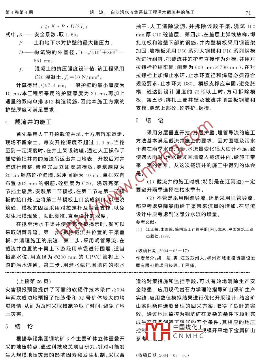 ISSN 1671 - 2900采礦技術(shù)第4卷第4期2004年12月CN 43- 1347/TDMining Technology, Vol., 4,No, 4Dec. 2004白沙污水收集系統(tǒng)工程污水截流井的施工胡波(柳州市城市投資建設(shè)發(fā)展有限公司, 廣西柳州市545000)摘要:介紹柳州市城市污水截流系統(tǒng)中污水截流井的施工方案設(shè)計(jì)與施工步驟。關(guān)鍵詞:污水截流井;方案設(shè)計(jì);施工步驟白沙污水收集系統(tǒng)中截流井的主要作用是順著采用分層垂直開(kāi)挖、分層護(hù)壁的施工方法。分層澆截流干管將柳州市區(qū)的生產(chǎn)、生活污水和初期雨水筑砼護(hù)壁的厚度的計(jì)算,一般按地下最深處護(hù)壁所截流收集到白沙污水處理廠, 經(jīng)過(guò)處理達(dá)標(biāo)后排放承受的土壓力及地下水的側(cè)壓力考慮。截流井規(guī)格到柳江。該污水收集處理系統(tǒng)的建成,結(jié)束了柳州有3種(長(zhǎng)X寬X深):3.9 mX2.65 mX11.2 m;3.市長(zhǎng)達(dá)幾十年來(lái)的生產(chǎn)、生活污水直排柳江河的局9 mX2.6 mX8.7 m;4.1 mX3.68 mX8.93m。按面,改善了柳州的水環(huán)境質(zhì)量。本文介紹柳州市河最不利的情況選取:長(zhǎng)X寬X深=4.1 mX3. 68 m北環(huán)島污水截流系統(tǒng)工程中部分截流井的施工。X11.2m的截流井規(guī)格進(jìn)行驗(yàn)算。假定護(hù)壁的厚度為l cm,其受力分析如圖11污水截流井工程概況所示:柳州市河北環(huán)島污水截流系統(tǒng)工程中的截流井原地面D42 -座落在河北環(huán)島城市生活污水干渠上,共有20個(gè),截流井本身結(jié)構(gòu)并不復(fù)雜,通常采用常規(guī)方法施工,地下水面然而,由于部分截流井是位于柳州市濱江路人行道,上,緊挨著民居,井的深度均在9~11m之間,周圍工土質(zhì)均為砂性土,大開(kāi)挖的施工方案根本行不通,如p/果在技術(shù).上不采取措施,不但施工難度大,成本高,施工工期長(zhǎng),而且還會(huì)存在一定的安全隱患。2截流井圍堰的設(shè)計(jì)與施工圖1截流井護(hù)壁分力分析污水截流井處在污水處理工藝的首端,設(shè)計(jì)截當(dāng)存在地下水時(shí):斷原污水干渠,在截?cái)嗵幗ㄔ旖亓骶?將城市污水引P= γ. htg2(45°-φ/2)+(γ-r.)(H-h)●進(jìn)截流井,然后通過(guò)截污干管從截流井將污水抽排tg2 (45°-φ/2)+(H-h) Y到污水處理廠。截流井所截?cái)辔鬯汕拈L(zhǎng)度≥3.式中:P---土和地下水對(duì)護(hù)壁的最大側(cè)壓900 m,截?cái)嗵幥w全部拆除,拆除后向下開(kāi)挖0.7力,N/m2 ;m深至截流井基面。故施工之前必須完成施工導(dǎo)r土的容重,取γ=19.5 kN/m3 ;流,維持原來(lái)干渠排水的運(yùn)行,為截流施工創(chuàng)造條.φ_土的內(nèi)摩擦角,參觀有關(guān)資料,為安全件。施工導(dǎo)流有明渠導(dǎo)流、水泵排水、埋管導(dǎo)流等3起見(jiàn),取φ=15° ,tg2 (45°一p/2)=0.589;個(gè)方案可供選擇。從工期、造價(jià)、導(dǎo)流的可能性和可中國(guó)煤化工勺深度.根據(jù)本工程的靠性3個(gè)方面進(jìn)行方案比較.經(jīng)綜合分析,截流井施YHCNMHG3m;工導(dǎo)流宜采用埋管導(dǎo)流方案。Y水的重度,..=10 kN/m3 ;H護(hù)壁的最大深度,H=11.2 m。3截流井開(kāi)挖和支護(hù)方案的設(shè)計(jì)計(jì)算得出P= 162.3396 kN/m2。由于地理環(huán)境的限制,截流井的開(kāi)挖和支護(hù)擬護(hù)壁的厚度:第4卷第4期胡波:白沙污水收集系統(tǒng)工程污水截流井的施工71t≥K.P.D/2f;抽干,人工清除淤泥,并拆除該段干渠,澆筑100式中:K-安全系數(shù),取1. 65;mm厚C10砼墊層。第四步,在墊層上彈線放樣,綁P-土和地下水對(duì)護(hù)壁的最大側(cè)壓力;扎底板和池壁下部的鋼筋,井內(nèi)壁模板采用鋼管架D--- 構(gòu)筑物的外直徑,D=V410+368* =加固,墻模板采用F60系列大鋼模和F10系列鋼模板進(jìn)行組拼,把截流井的護(hù)壁直接作為外模,并用對(duì)551 cm;f.-一混凝土的抗壓強(qiáng)度設(shè)計(jì)值,該工程采用拉螺栓拉結(jié)牢固(間距為600mmX700mm),在對(duì)C20混凝土,f.= 10 N/ mm2。拉螺栓.上加焊止水環(huán),止水環(huán)直徑和焊縫必須符合計(jì)算得出:t≥7.4cm。--般護(hù)壁的最小厚度為規(guī)范要求,止水環(huán)為D80。模板支撐應(yīng)牢固,避免脹10 cm,本工程所采用的護(hù)壁厚度為20 cm,再加上模。砼達(dá)到設(shè)計(jì)強(qiáng)度的75%以上時(shí),方可拆除模適量的雙向單排φ12構(gòu)造鋼筋.因此本施工方案的板。第五步,綁扎上部井壁及截流井頂蓋板鋼筋和支模,澆筑上部砼,砼養(yǎng)護(hù)、拆模。護(hù)壁厚度可滿足要求。4截流井的施工5結(jié)語(yǔ)首先采用人工開(kāi)挖截流井坑.士方用汽車運(yùn)走,采用分層垂直開(kāi)挖、分層護(hù)壁、埋管導(dǎo)流的施工現(xiàn)場(chǎng)不留余土。每次開(kāi)挖深度不超過(guò)1.0 m,當(dāng)挖方法基本滿足截流井施工的要求。因?qū)呒拔鬯恋揭欢ㄉ疃葧r(shí),在井上架設(shè)轱轆,通過(guò)人工操作手干渠在雨季水位涌高、水流量變化很大估計(jì)不足,致?lián)u轱轆把井內(nèi)的廢渣吊運(yùn)出井口地表。開(kāi)挖后對(duì)井使遇大雨時(shí),污水越過(guò)圍堰流入截流井內(nèi),給施工帶壁進(jìn)行修整,修整完后立即安裝模板,澆筑厚度為來(lái)一定的困難。從這次截流井的施工中得到的體會(huì)20cm鋼筋砼護(hù)壁墻,采用間距為40cm、單排雙向是:布置φ12 mm的鋼筋,砼強(qiáng)度為C20。澆筑完第-(1)截流井的施工時(shí)機(jī)(特