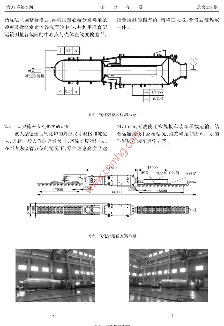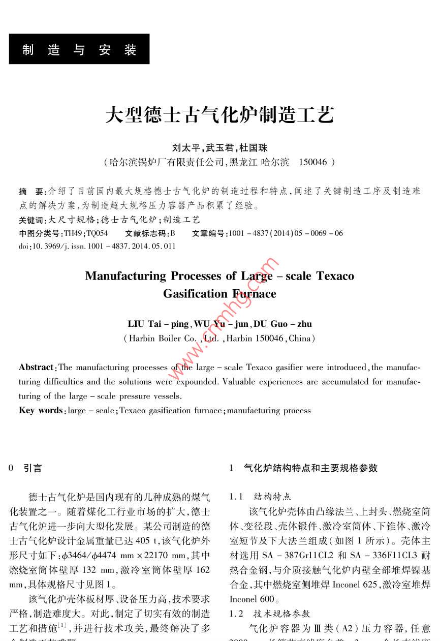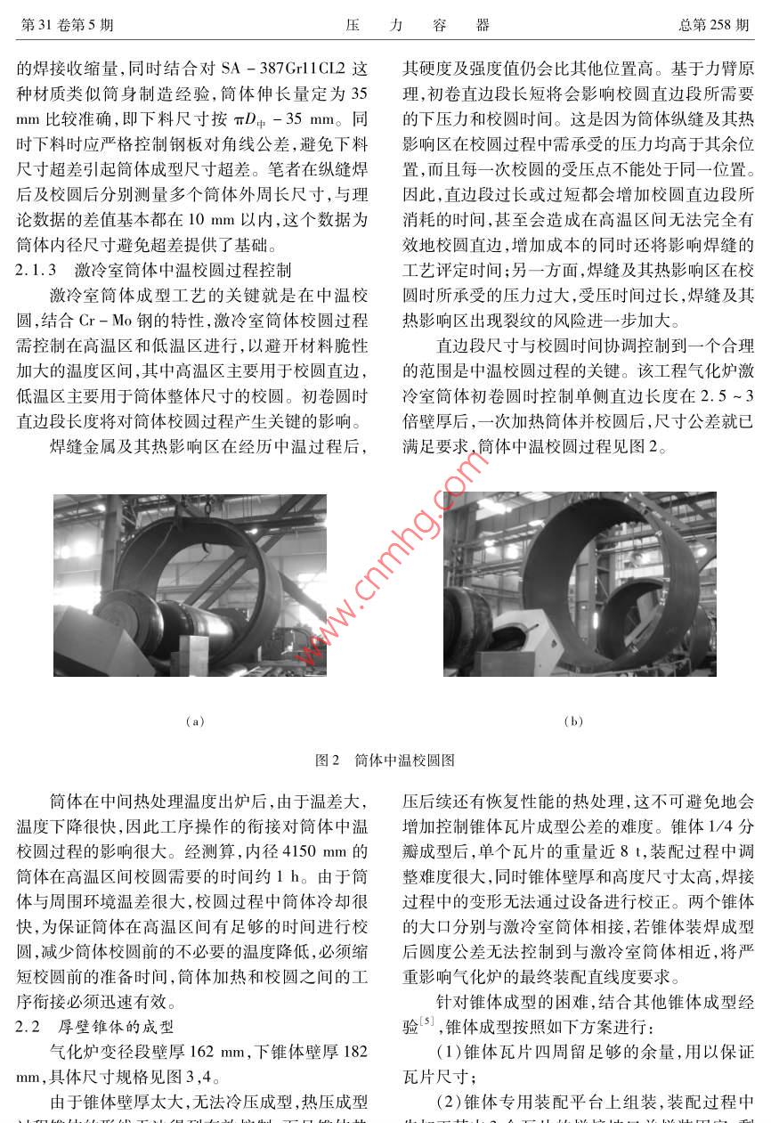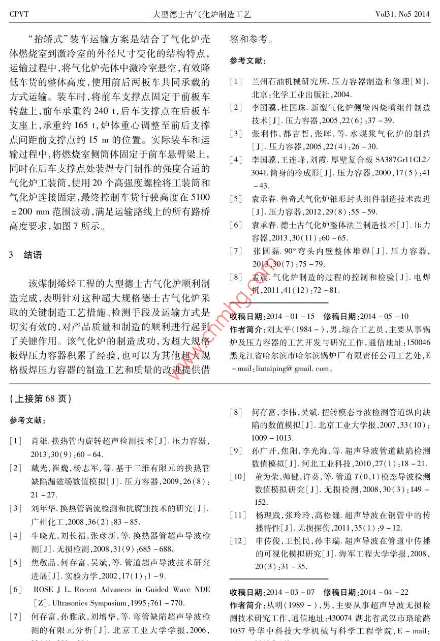 制造與安裝大型德士古氣化爐制造工藝劉太平,武玉君,杜國珠(哈爾濱鍋爐廠有限責(zé)任公司,黑龍江哈爾濱150046 )商要:介紹了目前國內(nèi)最大規(guī)格德士古氣化爐的制造過程和特點,闡述了關(guān)鍵制造工序及制造難點的解決方案,為制造超大規(guī)格壓力容器產(chǎn)品積累了經(jīng)驗。關(guān)鍵詞:大尺寸規(guī)格;德士古氣化爐;制造工藝中圖分類號:TH49 ;TQ054文獻(xiàn)標(biāo)志碼:B文章編號:1001 - 4837(2014)05 - 0069 - 06doi: 10.3969/j. issn. 1001 - 4837.2014.05. 011Manufacturing Processes of Large - scale TexacoGasification FurnaceLIUTai-ping,WUYu-jun,DUGuo-zhu( Harbin Boiler Co. , Ld. , Harbin 150046, China)Abstract:The manufacturing processes of the large - scale Texaco gasifier were introduced , the manufac-turing difficulties and the solutions were expounded. Valuable experiences are accumulated for manufac-turing of the large - scale pressure vessels.Key words :large - scale ; Texaco gasification furmace ;manufacturing process0引言1氣化爐結(jié)構(gòu)特 點和主要規(guī)格參數(shù)德士古氣化爐是國內(nèi)現(xiàn)有的幾種成熟的煤氣1.1 結(jié)構(gòu)特點化裝置之- -。隨著煤化工行業(yè)市場的擴大,德士該氣化爐殼體由凸緣法蘭、上封頭、燃燒室筒古氣化爐進(jìn)- -步向大型化發(fā)展。某公司制造的德體、變徑段、殼體鍛件、激冷室筒體、下錐體、激冷士古氣化爐設(shè)計金屬重量已達(dá)405 t, 該氣化爐外室短節(jié)及下大法蘭組成(如圖1所示)。殼體主形尺寸如下:$3464/ φ4474 mm x22170 mm,其中材選用SA - 387Gr11CL2和SA - 336F11CL3耐燃燒室簡體壁厚132 mm,激冷室筒體壁厚162熱合金鋼,與介質(zhì)接觸氣化爐內(nèi)壁全部堆焊鎳基mm,具體規(guī)格尺寸見圖1。合金,其中燃燒室側(cè)堆焊Inconel 625 ,激冷室堆焊該氣化爐殼體板材厚、設(shè)備壓力高,技術(shù)要求Inconel 600。嚴(yán)格,制造難度大。對此,制定了切實有效的制造1.2 技術(shù)規(guī)格參數(shù)工藝和措施,并進(jìn)行技術(shù)攻關(guān),最終解決了多氣化爐容器為II類(A2)壓力容器,任意CPVT大型德士古氣化爐制造工藝Vol31. No5 2014允差+6mm。制造完成后,氣化爐全長范圍內(nèi)設(shè)備中心線垂直度公差不大于16 mm;殼體圓度允2關(guān)鍵部件的制造難點及控制措施差+6mm;氣化爐頂凸緣法蘭中心線與爐體中心線間的同軸度允差不大于+6 mm,其與激冷環(huán)安2.1激冷室簡體成型裝中心線之間同軸度允差士3 mm;凸緣法蘭中心激冷室筒體材質(zhì)為SA - 387Gr11CI2,內(nèi)徑為線與殼體中心線的角度允差+0. 5°,氣化爐托磚4150 mm,設(shè)計厚度160 mm,考慮到工藝減薄量,板水平度偏差不大于+3 mm。簡體取用厚度162 mm, 簡體分4節(jié),單節(jié)長度L=2055 mm。由于技術(shù)文件要求筒體圓度允差不大于+6mm,如此厚壁大直徑的筒體成型尺寸公差上封頭、中S一沙控制難度很大。為保證簡體尺寸公差滿足技術(shù)文件要求,利于后續(xù)工序?qū)嵤?,結(jié)合以往厚壁筒體卷制經(jīng)燃燒室簡身、130+6古驗2-4,從以下幾個方面進(jìn)一步優(yōu)化簡體成型工i 63200.00藝,最終將簡體內(nèi)徑尺寸控制在4147 ~4154 mm燃燒室短節(jié)、范圍內(nèi),完全滿足了圖紙尺寸要求。變徑段、160+32.1.1激冷室筒 體成型工序流程的確定常規(guī)情況下,激冷室簡體的成型應(yīng)按照以下N工序進(jìn)行:預(yù)彎-→卷圓-→切除直邊段-→二次合口激冷室內(nèi)件激冷室簡體、->焊接縱縫->中間熱處理-→校圓;但按照卷板機#規(guī)格書中提供的技術(shù)要求,該厚度直邊段長度約為2倍的壁厚,將不可避免地造成不必要的原材04150料浪費。下錐體結(jié)合多年厚璧筒體卷制經(jīng)驗,考慮到SA -激冷室短節(jié)I 30+387Gr11CL2材料在中間熱處理溫度區(qū)間左右的抗拉強度較室溫狀態(tài)降幅很大,將縱縫中間熱處下大法蘭一01800理與校圓合并,將激冷室簡體成型工藝作出如下優(yōu)化:預(yù)彎- +卷圓→焊接縱縫- >中溫校圓。圖1氣化爐結(jié)構(gòu)示意2.1.2簡體下料尺寸的確定鋼板下料長度決定了筒體卷成后的周長πD1.3 主要設(shè)計參數(shù)是否超差;由于影響鋼板周長伸長量的因素很多,該氣化爐主要設(shè)計參數(shù)見表1。如卷校圓時卷制圈數(shù)、卷制時間溫度、鋼板受力大小、卷制速度、鋼板材質(zhì)屈服強度等,很難準(zhǔn)確表1主要設(shè)計參數(shù)地計算出來。對此,- -般通過理論估算確定范圍,項目燃燒室/激冷室然后參考制造廠以往制造經(jīng)驗進(jìn)行修正。根據(jù)周長伸長量估算公式":設(shè)計壓力/ MPa .9.3△L=KπS(1 +S/D。)式中0L--周長伸長量,mm.設(shè)計溫度/C455K一卷制條件系數(shù)水壓試驗壓力/MPa12. 7S一板厚,mmD,一內(nèi)徑,mm.總長/m≈22由于熱卷時K=0. 10 ~0.12,冷卷時K =0.03 ,因此按冷卷計算時△L= 16 mm,按熱卷計算爐體設(shè)計凈重/t≈405第31卷第5期壓力器總第258期的焊接收縮量,同時結(jié)合對SA - 387Gr11CL2這其硬度 及強度值仍會比其他位置高。基于力臂原種材質(zhì)類似筒身制造經(jīng)驗,筒體伸長量定為35理,初卷直邊段長短將會影響校圓直邊段所需要mm比較準(zhǔn)確,即下料尺寸按πDφ -35 mm。同的下壓力和校圓時間。這是因為簡體縱縫及其熱時下料時應(yīng)嚴(yán)格控制鋼板對角線公差,避免下料影響區(qū) 在校圓過程中需承受的壓力均高于其余位尺寸超差引起筒體成型尺寸超差。筆者在縱縫焊置 ,而且每一-次校圓的受壓
