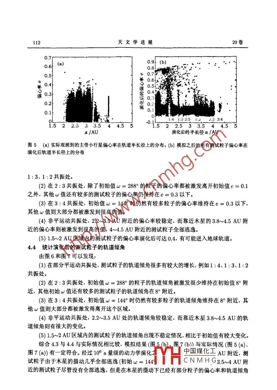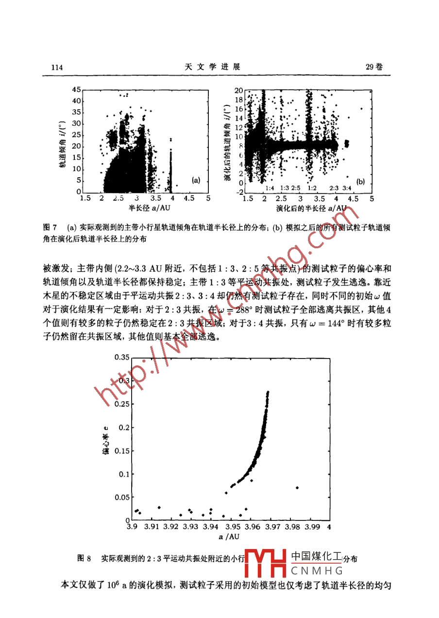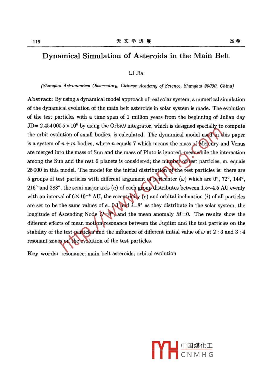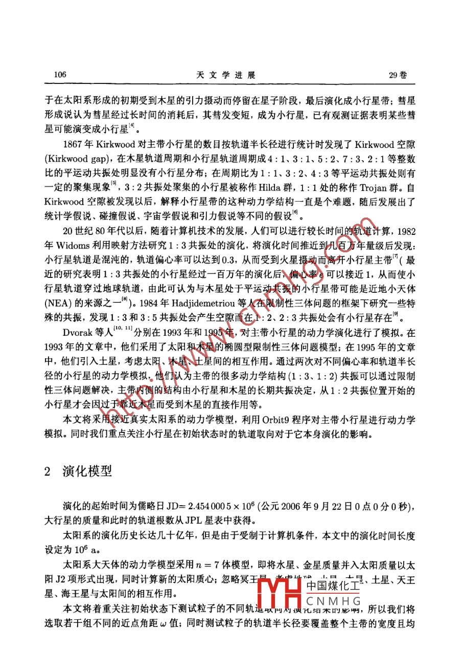 第29卷第1期天文學(xué)進(jìn)展VoL 29, No. 12011年1月PROGRESS IN ASTRONOMY文章編號:10008349(2011)01010512主帶小行星的動(dòng)力學(xué)模擬李嘉中國科學(xué)院上海天文臺,上海200030)摘要:采用接近真實(shí)太陽系的動(dòng)力學(xué)模型,對主帶小行星的動(dòng)力學(xué)演化進(jìn)行了數(shù)值模擬。計(jì)算的起始時(shí)間是儒略日J(rèn)D=24540005×10°,計(jì)算的時(shí)間長度為100萬年。力學(xué)模型采用n+m體模型,計(jì)算程序基于小行星軌道演化的軟件 Orbit9。對演化結(jié)果進(jìn)行分析可以發(fā)現(xiàn)測試粒子與木星的平運(yùn)動(dòng)共振對測試粒子穩(wěn)定性的不同作用,以及在2:3、3:4共振處不同初始值對測試粒子演化結(jié)果的影響關(guān)鍵詞:共振;主帶小行星;軌道演化中圖分類號:P181引言1766年 Johann titius提出 Titius-Bode法則,即以天文單位(AU)計(jì)算6顆當(dāng)時(shí)已知的大行星到太陽的距離,存在下面的經(jīng)驗(yàn)公式d≈0.4+0.3×22,i=-0,0,1,2,4,5分析上面的公式,Bode指出在火星和木星中間的i=3處應(yīng)該存在一個(gè)尚未被發(fā)現(xiàn)的大行星。1801年意大利人 Piazzi在火星和木星之間發(fā)現(xiàn)第一顆小行星谷神星,在隨后200多年時(shí)間里人類在這個(gè)區(qū)域陸續(xù)發(fā)現(xiàn)的小行星多達(dá)37萬余顆,其中已經(jīng)被編號的有23萬顆左右。這些小行星間軌道半長徑95%集中在217~364AU內(nèi),平均偏心率大約015,平均軌道傾角大約8.6°,被稱為主帶小行星。因?yàn)樾⌒行侵鲙Э赡鼙A袅颂栂敌纬沙跗诘囊恍┬畔?所以研究它的化學(xué)組成和動(dòng)力學(xué)演化對于了解太陽系的形成和演化很有意義。而小行星帶的起源至今沒有統(tǒng)一的說法,主要有三種假設(shè):大行星爆炸說,半成品說和彗星形成說。大行星爆炸學(xué)說認(rèn)為小行星是顆爆炸了的行星所留下的殘片;半成品說則認(rèn)為小H中國煤化工星的前身,由CNMHG收稿日期:2010-03-19;修回日期:2010-04-15資助項(xiàng)目:國家自然科學(xué)基金(10633030)天文學(xué)進(jìn)展卷于在太陽系形成的初期受到木星的引力攝動(dòng)而停留在星子階段,最后演化成小行星帶;彗星形成說認(rèn)為彗星經(jīng)過長時(shí)間的消耗后,其彗發(fā)變短,成為小行星,已有觀測證據(jù)表明某些彗星可能演變成小行星。1867年 Kirkwood對主帶小行星的數(shù)目按軌道半長徑進(jìn)行統(tǒng)計(jì)時(shí)發(fā)現(xiàn)了 Kirkwood空隙( Kirkwood gap),在木星軌道周期和小行星軌道周期成4:1、3:1、5:2、7:3、2:1等整數(shù)比的平運(yùn)動(dòng)共振處明顯沒有小行星分布;在周期比為1:1、3:2、4:3等平運(yùn)動(dòng)共振處則有一定的聚集現(xiàn)象,3:2共振處聚集的小行星被稱作Hlda群,1:1處的稱作 Trojan群。自Kirkwood空隙被發(fā)現(xiàn)以后,解釋小行星帶的這種動(dòng)力學(xué)結(jié)構(gòu)一直是個(gè)難題,隨后發(fā)展出了統(tǒng)計(jì)學(xué)假說、碰撞假說、宇宙學(xué)假說和引力假說等不同的假設(shè)。20世紀(jì)80年代以后,隨著計(jì)算機(jī)技術(shù)的發(fā)展,人們可以進(jìn)行較長時(shí)間的軌道計(jì)算,1982年 Widows利用映射方法研究1:3共振處的演化,將演化時(shí)間推近到幾百萬年量級后發(fā)現(xiàn)小行星軌道是混沌的,軌道偏心率可以達(dá)到03,從而受到火星攝動(dòng)而離開小行星主帶(最近的研究表明1:3共振處的小行星經(jīng)過一百萬年的演化后,偏心率e可以接近1,從而使小行星軌道穿過地球軌道,由此可認(rèn)為與木星處于平運(yùn)動(dòng)共振的小行星帶可能是近地小天體(NEA)的來源之-)。1984年 Hadjidemetriou等人在限制性三體問題的框架下研究一些特殊的共振,發(fā)現(xiàn)1:3和3:5共振處會(huì)產(chǎn)生空隙而在1:2、2:3共振處會(huì)有小行星存在Dvorak等人分別在199年和1995年,對主帶小行星的動(dòng)力學(xué)演化進(jìn)行了模擬。在1993年的文章中,他們采用了太陽和木星的橢圓型限制性三體問題模型;在1995年的文章中,他們引入土星,考慮太陽、木星、土星間的相互作用。通過兩次對不同偏心率和軌道半長徑的小行星的動(dòng)力學(xué)模擬,他們認(rèn)為主帶的很多動(dòng)力學(xué)結(jié)構(gòu)(1:3、1:2)共振可以通過限制性三體問題解決,主帶內(nèi)側(cè)的結(jié)構(gòu)由小行星和木星的長期共振決定,從1:2共振位置開始的小行星才會(huì)因過于靠近木星而受到木星的直接作用等本文將.用接近真實(shí)太陽系的動(dòng)力學(xué)模型,利用Orb9程序?qū)χ鲙⌒行沁M(jìn)行動(dòng)力學(xué)模擬。同時(shí)我們重點(diǎn)關(guān)注小行星在初始狀態(tài)時(shí)的軌道取向?qū)τ谒旧硌莼挠绊憽?演化模型演化的起始時(shí)間為儒略日J(rèn)D=24540005×10°(公元2006年9月22日0點(diǎn)0分0秒),大行星的質(zhì)量和此時(shí)的軌道根數(shù)從JPL星表中獲得。太陽系的演化歷史長達(dá)幾十億年,但是由于受制于計(jì)算機(jī)條件,本文中的演化時(shí)間長度沒定為10°a太陽系大天體的動(dòng)力學(xué)模型采用n=7體模型,即將水星、金星質(zhì)量并入太陽質(zhì)量以太陽2項(xiàng)形式出現(xiàn),同時(shí)計(jì)算新的太聞質(zhì)心;氫略亡中國煤化量、土星、天王星、海王星與太陽間的相互作用。本文將著重關(guān)注初始狀態(tài)下測試粒子的不同軌追對化紹影啊,所以我們將選取若干組不同