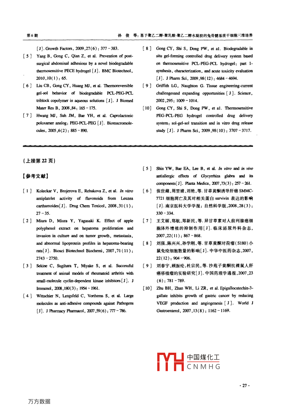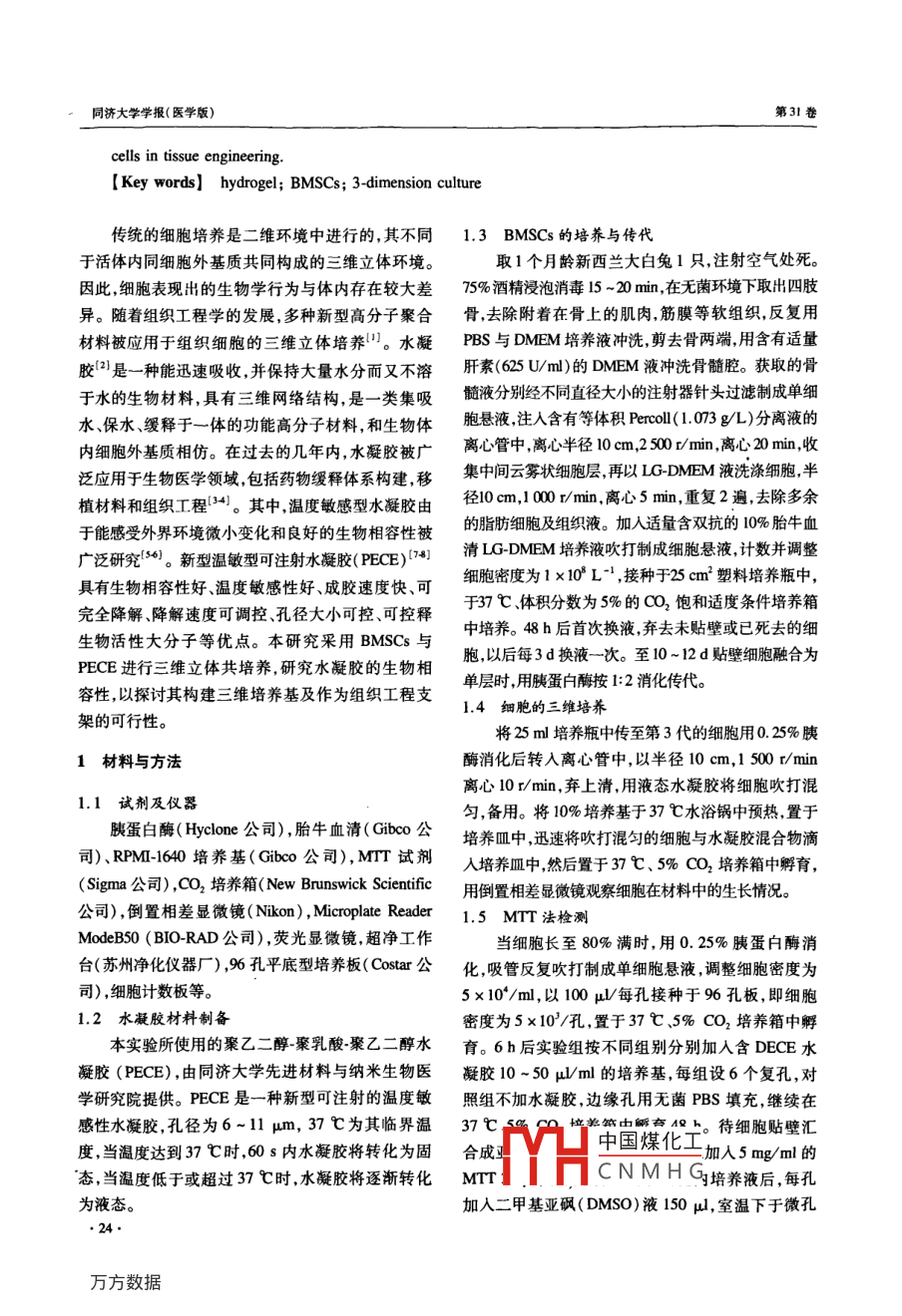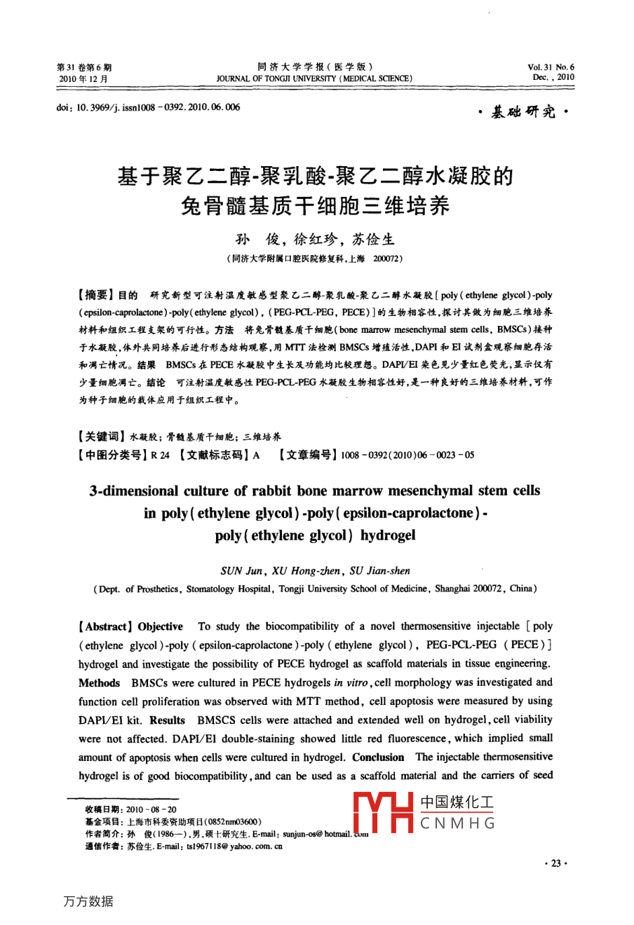第31卷第6期同濟(jì)大學(xué)學(xué)報(bào)(醫(yī)學(xué)版)Vol.31 No.62010年12月JOURNAL OF TONGJI UNIVERSITY (MEDICAL SCIENCE)Dec.。2010doi: 10. 3969/j iss108 -0392. 2010.06. 006, 基礎(chǔ)研究●基于聚乙二醇-聚乳酸-聚乙二醇水凝膠的兔骨髓基質(zhì)干細(xì)胞三維培養(yǎng)孫俊,徐紅珍,蘇儉生(同濟(jì)大學(xué)附屬口腔醫(yī)院修復(fù)科,上海2002)[摘要]目的研究新型可注射溫度敏感型聚乙二醇聚乳酸-聚乙二醇水凝膠[ poly ( ethylene glycol )-poly(psilon-caprolactone)-poly( ethylene glycol), (PEG-PCL-PEG, PECE)]的生物相容性,探討其做為細(xì)胞三維培養(yǎng)材料和組織工程支架的可行性。方法將 兔骨髓基質(zhì)干細(xì)胞( bone marow mesenchymal stem cells, BMSCs)接種于水凝膠,體外共同培養(yǎng)后進(jìn)行形態(tài)結(jié)構(gòu)觀察,用MTT法檢測(cè)BMSCs增殖活性,DAPI和EI試劑盒觀察細(xì)胞存活和凋亡情況。結(jié)果BMSCs 在PECE水凝膠中生長(zhǎng)及功能均比較理想。DAPVEI染色見(jiàn)少量紅色熒光,顯示僅有少量細(xì)胞凋亡。結(jié)論可注射溫度敏感性 PEG-PCL-PEG水凝膠生物相容性好,是一種良好的三維培養(yǎng)材料,可作為種子細(xì)胞的載體應(yīng)用于組織工程中。[關(guān)鍵詞]水凝膠;骨髓基質(zhì)干細(xì)胞;三維培蕎[中圖分類號(hào)]R24 [文獻(xiàn)標(biāo)志碼] A[文章編號(hào)] 1008 -0392(2010)06 -0023 -053-dimensional culture of rabbit bone marrow mesenchymal stem cellsin poly ( ethylene glycol ) -poly ( epsilon-caprolactone)-poly ( ethylene glycol) hydrogelSUN Jun, XU Hong -zhen, SU Jian-shen(Dept. of Prosthetics, Stomatology Hospital, Tongji University School of Medicine , Shanghai 200072, China)[ Abstract] Objective To study the biocompatibility of a novel thermosensitive injectable [ poly(ethyene glycol )-poly ( epsilon-caprolactone )-poly ( ethylene glycol), PEG-PCL-PEG ( PECE)]hydrogel and investigate the possibility of PECE hydrogel as scaffold materials in tsse engineering.Methods BMSCs were cultured in PECE hydrogels in vitro , cell morphology was investigated andfunction cell proliferation was observed with MTT method, cell apoptosis were measured by usingDAPI/EI kit. Results BMSCS cells were attached and extended well on hydrogel , cell viabilitywere not affected. DAPI/EI double staining showed litle red fluorescence , which implied smallamount of apoptosis when cells were cultured in hydrogel. Conclusion The injectable thermosensitivehydrogel is of good biocompatibility, and can be used as a scaffold material and the carriers of seed中國(guó)煤化工收稿日期: 2010-08 -20基金項(xiàng)目:上海市科委資助項(xiàng)日(0852m03600)CHCNMHG作者簡(jiǎn)介:孫俊( 1986- ). 男,碩土:研究生. E-mail; sunjun-os@ hotmail. cou通信作者:蘇儉生. E-mail: ts197118@ yahoo. com. cn●23.同濟(jì)大學(xué)學(xué)報(bào)(醫(yī)學(xué)版)第31卷cells in tissue engineering.[Key words] hydrogel; BMSCs; 3-dimension culture傳統(tǒng)的細(xì)胞培養(yǎng)是二維環(huán)境中進(jìn)行的,其不同1.3 BMSCs的培養(yǎng)與傳代于活體內(nèi)同細(xì)胞外基質(zhì)共同構(gòu)成的三維立體環(huán)境。取1個(gè)月齡新西蘭大白兔1只,注射空氣處死。因此,細(xì)胞表現(xiàn)出的生物學(xué)行為與體內(nèi)存在較大差75%酒精浸泡消毒15 ~20 min,在無(wú)菌環(huán)境下取出四肢異。隨著組織工程學(xué)的發(fā)展,多種新型高分子聚合骨,去除附著在骨上的肌肉,筋膜等軟組織,反復(fù)用材料被應(yīng)用于組織細(xì)胞的三維立體培養(yǎng)"。水凝PBS與DMEM培養(yǎng)液沖洗,剪去骨兩端,用含有適量膠[2是一種能迅速吸收,并保持大量水分而又不溶肝素(625 U/ml)的DMEM液沖洗骨髓腔。獲取的骨于水的生物材料,具有三維網(wǎng)絡(luò)結(jié)構(gòu),是- -類集吸髓液分別經(jīng)不同直徑大小的注射器針頭過(guò)濾制成單細(xì)水保水、緩釋于一體的功能高分子材料,和生物體胞懸液,注人含有等體積Percoll(1.073 g/L)分離液的內(nèi)細(xì)胞外基質(zhì)相仿。在過(guò)去的幾年內(nèi),水凝膠被廣離心管中,離心半徑10 cm,2 500 r/min,離心20 min,收泛應(yīng)用于生物醫(yī)學(xué)領(lǐng)域,包括藥物緩釋體系構(gòu)建,移集中間云霧狀細(xì)胞層,再以LG-DMEM液洗滌細(xì)胞,半植材料和組織工程(34)。其中,溫度敏感型水凝膠由徑10 cm,1000 r/min,離心5 min,重復(fù)2遍,去除多余于能感受外界環(huán)境微小變化和良好的生物相容性被的脂肪細(xì)胞及組織液。加人適量含雙抗的10%胎牛血廣泛研究[56)。新型溫敏型可注射水凝膠( PECE)[7+]清LG-DMEM培養(yǎng)液吹打制成細(xì)胞懸液,計(jì)數(shù)并調(diào)整具有生物相容性好、溫度敏感性好、成膠速度快、可細(xì)胞密度為1x10* L-' ,接種于25 cm2塑料培養(yǎng)瓶中,完全降解降解速度可調(diào)控、孔徑大小可控、可控釋于37 C、體積分?jǐn)?shù)為5%的CO2飽和適度條件培養(yǎng)箱生物活性大分子等優(yōu)點(diǎn)。本研究采用BMSCs與中培養(yǎng)。48 h后首次換液,棄去未貼璧或已死去的細(xì)PECE進(jìn)行三維立體共培養(yǎng),研究水凝膠的生物相胞,以后每3d換液- ~次。至10~12 d貼壁細(xì)胞融合為容性,以探討其構(gòu)建三維培養(yǎng)基及作為組織工程支單層時(shí),用胰蛋白酶按1:2消化傳代。1.4 細(xì)胞的三維培養(yǎng)架的可行性。將25 ml培養(yǎng)瓶中傳至第3代的細(xì)胞用0. 25%胰1材料與方法酶消化后轉(zhuǎn)人離心管中,以半徑10 cm,1 500 r/min離心10r/min,棄上清,用液態(tài)水凝膠將細(xì)胞吹打混1.1 試劑及儀器