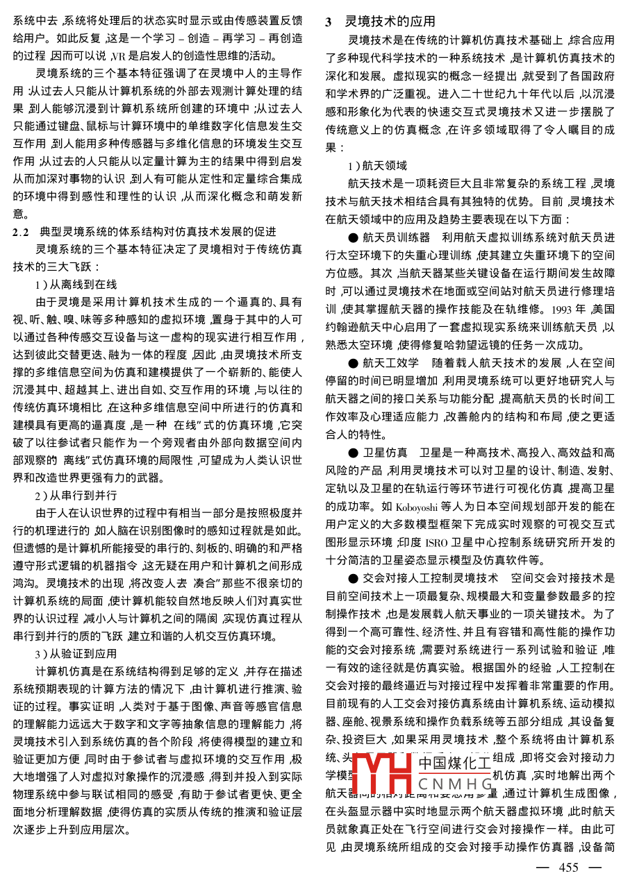 2003全國仿真技術(shù)學術(shù)會議論文集靈境仿真與應(yīng)用張珩歐珊瑚中國科學院力學研究所北京100080)擿要靈境技術(shù)是繼多媒體技術(shù)之后的新一代人機接口技術(shù)及高級仿真技術(shù)它突破了傳統(tǒng)的基于二維的人機界面模式和交互方式旳局限性極大地增強了人的主動性和仿真方法的靈活性是目前計算機科學和信息科學中最熱門的研究領(lǐng)域該文介紹了靈境技術(shù)產(chǎn)生的背景論述了靈境技術(shù)的特征和基本構(gòu)成并綜述了靈境技術(shù)在航天、軍事、遙科學、機器人等領(lǐng)域的應(yīng)用最后對目前研究中存在的問題及可能的對策和研究方向進行了討論關(guān)鍵詞靈境虛擬現(xiàn)實癘真沉浸中圖分類號:TP391文獻標識碼:A1引言2.1靈境系統(tǒng)的基本特征伴隨著第一臺電子管電子計算機的誕生和以相似理論在傳統(tǒng)的仿真和建模環(huán)境中雖然主觀上一直在強調(diào)要為基礎(chǔ)的模擬技術(shù)的應(yīng)用真作為一種研究、發(fā)展新產(chǎn)品、發(fā)揮人的主動作用但由于在客觀上計算機只能在處理數(shù)字新技術(shù)的科學手段在航空、航天、造船、兵器等與國防科研化信息時才發(fā)揮出強大的威力人不得不去湊合”當時的計相關(guān)的行業(yè)中首先發(fā)展起來并顯示出巨大的社會效益和經(jīng)算機所能提供的技術(shù)條件人和機器的關(guān)系是不甚和諧的濟效益。就仿真的本質(zhì)而言它是對真實物理系統(tǒng)在某一層而靈境系統(tǒng)的最大優(yōu)勢在于能夠充分發(fā)揮在由計算機和人次上的抽象與實際的物理系統(tǒng)相比用戶在這一抽象模型構(gòu)成的系統(tǒng)中人的主觀能動性即把人的感知能力、認知能上可以更高效、更節(jié)省、更靈活、更安全地對物理系統(tǒng)進行了力和心理狀態(tài)在計算機系統(tǒng)中得到體現(xiàn)。由此可見靈境概解和設(shè)計念的出現(xiàn)使得以往以數(shù)字描述或符號等抽象表達的對象開最近數(shù)十年來隨著計算機、自動化和系統(tǒng)工程等技術(shù)始以完全形象化的模式體現(xiàn)同時由于計算機的飛速發(fā)展的飛速發(fā)展仿真和建模的水平也得到了相應(yīng)的提高,人與又使得這種形象化的表達在動態(tài)上幾乎可以與人的形象認計算機之間的隔閡大大減小但這些技術(shù)尚未從根本上解決知相同步?,F(xiàn)有計算機在應(yīng)用上的局限性和不合理性尤其是在逼真性通常靈境系統(tǒng)的特征和虛擬性等方面還不能滿足用戶的需求。參試者不僅要求可以用一個靈境技術(shù)三角MMERSION能通過打印輸出或顯示屏幕上的窗口從系統(tǒng)外部去觀察信形”來加以描述,即:3個息處理和仿真的結(jié)果而且要求能通過參試者的視覺、聽覺、“,它們是 Immersion-in-觸覺、嗅覺以及形體、手勢或口令,參與到仿真系統(tǒng)中去從 teraction- Imagnation(沉浸而取得身臨其境的體驗。這種信息處理和仿真系統(tǒng)已不再交互-構(gòu)想)如圖1所四要(k是建立在一個單維的數(shù)字化的信息空間上了而是建立在一示個多維化的信息空間之中建立在一個定性和定量相結(jié)合1)沉浸 Immersion)這圖1三1圖感性認識和理性認識相結(jié)合的綜合集成環(huán)境中而靈墳VR:是wR系統(tǒng)的核心指使用Virtual Reality又譯為虛擬現(xiàn)實肢術(shù)正是支撐這個建立在多戶投入到由計算機生成的虛擬場景中的能力。ⅤR的沉浸感維信息空間 CyberSpace)上的仿真系統(tǒng)的關(guān)鍵技術(shù)。它的興特征與一般的交互式三維計算機圖形有較大的不同用戶可起為人機交互和仿真系統(tǒng)的發(fā)展開辟了新的研究領(lǐng)域為以沉漫于數(shù)據(jù)空間也可以從數(shù)據(jù)空間向外觀察從而可以智能工程的應(yīng)用提供了新的界面工具,為復(fù)雜系統(tǒng)訓練仿使用戶能以更自然、更直接的方式與數(shù)據(jù)交互。真特別是人參與的系統(tǒng)仿真、生物和醫(yī)學系統(tǒng)仿真以及思2)交互( Interaction)指用戶與虛擬場景中各對象相互作維、邏輯推理系統(tǒng)的仿真開辟了新天地也為各類工程的數(shù)用的自據(jù)可視化提供了新的描述方法是仿真技術(shù)發(fā)展的里程碑。中國煤性因素。交互性包含對象的可饋的自然程度以及虛擬場景CNMH程度等。2靈境的結(jié)構(gòu)特征及其對仿真技術(shù)發(fā)展的促進3)構(gòu)想( Imagination)虛擬現(xiàn)實不僅僅是一個用戶與終端的接口而且可使用戶沉浸于此環(huán)境中獲取新的知識提高感收稿日期2003-04-07性和理性認識從而產(chǎn)生新的構(gòu)思。將這種構(gòu)思結(jié)果輸入到454系統(tǒng)中去系統(tǒng)將處理后的狀態(tài)實時顯示或由傳感裝置反饋3靈境技術(shù)的應(yīng)用給用戶。如此反復(fù)這是一個學習-創(chuàng)造-再學習-再創(chuàng)造靈境技術(shù)是在傳統(tǒng)的計算機仿真技術(shù)基礎(chǔ)上綜合應(yīng)用的過程因而可以說MR是啟發(fā)人的創(chuàng)造性思維的活動了多種現(xiàn)代科學技術(shù)的一種系統(tǒng)技術(shù)是計算機仿真技術(shù)的靈境系統(tǒng)的三個基本特征強調(diào)了在靈境中人的主導作深化和發(fā)展。虛擬現(xiàn)實的概念一經(jīng)提出就受到了各國政府用認過去人只能從計算機系統(tǒng)的外部去觀測計算處理的結(jié)和學術(shù)界的