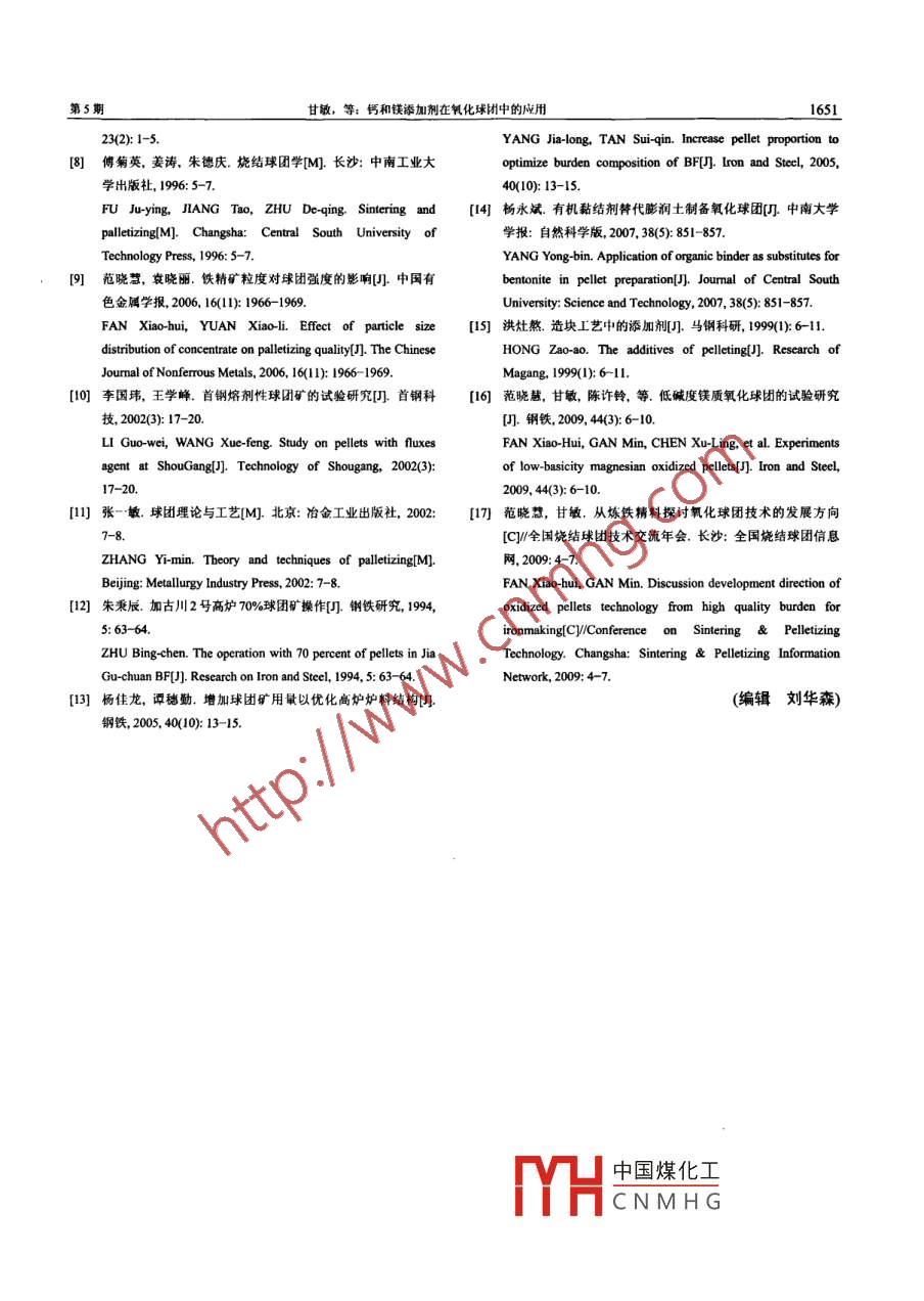 第41卷第5期中南大學(xué)學(xué)報(自然科學(xué)版)Vol.41 No.52010年10月Journal of Central South University (Science and Technology)Oct.2010鈣和鎂添加劑在氧化球團(tuán)中的應(yīng)用甘敏,范曉慧,陳許玲,袁禮順,姜濤,趙忠花(中南大學(xué)資源加工與生物工程學(xué)院,湖南長沙,410083)摘要:對石灰石、菱鎂石和白云石3種鈣、鎂添加劑對球團(tuán)性能、TFe 品位以及生產(chǎn)工藝的影響進(jìn)行研究。研究結(jié)果表明:添加劑降低了生球落下強(qiáng)度和預(yù)熱球抗壓強(qiáng)度,但提高了生球燦裂溫度;添加劑中的CaO使焙燒球抗壓強(qiáng)度先升高后降低,MgO使得焙燒球抗術(shù)強(qiáng)度降低;加入鈣、鎂添加劑會降低球團(tuán)礦TFe品位,通過添加生石灰或有機(jī)黏結(jié)劑取代膨潤土,可以提高球團(tuán)的TFe品位:鈣、鎂添加劑在干燥預(yù)熱段分解吸熱會影響鏈篦機(jī)的熱平衡,通過在球團(tuán)中內(nèi)配無煙煤,由無煙煤燃燒放熱來提供鈣、鎂添加劑熱分解所需的熱量,可以維持鏈篦機(jī)的熱平衡制度:通過添加生石灰或有機(jī)黏結(jié)劑和內(nèi)配適量的無煙煤,可解決鈣、鎂添加劑在氧化球H中應(yīng)用的關(guān)鍵詞:鈣添加劑;鎂添加劑:氧化球團(tuán);球團(tuán)礦鐵品位中圖分類號: TF046.2文獻(xiàn)標(biāo)志碼: A文章編號: 1672- -7207(2010)05-1645-07Application of Ca, Mg additives in oxidized pelletsGAN Min, FAN Xiao-hui, CHEN Xu-ling, YUAN Li-shun, JIANG Tao, ZHAO Zhong-hua(School of Minerals Processing & Bioenginering, Central South University, Changsha 410083, China)Abstract: The effects of adding Ca and Mg-additives, such as limestone, magnesite and dolomite on the properties ofpellets, and the content of Fe and the production process were studied. The resuts show that adding aditives decreasethe drop strength of green pellets and the compressive strength of preheated pellets, improve the crack temperature, andCaO in additives can increase the compressive strength of fired pellets firstly but then decrease, and MgO can decreasethe compressive strength of fired pellets. The content of Fe will drop when adding additives, but it can be increased byadding lime or organic binder to replace bentonite. Decalescence of the Ca and Mgadditives decomposition in drying andprcheating will afct the thermal equilibrium of grate. The combustion heat that offered by adding anthracite can providethe heat of decomposition of Ca and Mg additives, which can keep the thermal equilibrium of grate. So, the difficulty ofapplying Ca and Mgadditives into oxidized pellets can be resolved by adding lime or organic binder suitable anthracite.Key words: Ca-additives; Mg additives; oxidized pellets; iron content of pellets鈣和鎂添加劑作為熔劑在燒結(jié)造塊中得到了較好究較少,這主要與我國高爐爐料結(jié)構(gòu)有關(guān)101。在我的應(yīng)用"- 41,為改善燒結(jié)礦產(chǎn)質(zhì)量以及強(qiáng)化高爐冶煉起國,高爐爐料中球團(tuán)礦配比普遍偏低,而瑞典、美國到了重要的作用15-6。而對于球團(tuán)造塊,鈣和鎂添加劑等球團(tuán)礦 配比較高,有的采用100%的球團(tuán)礦 入爐煉在各個國家的應(yīng)用程度不一樣,現(xiàn)階段我國以生產(chǎn)酸鐵。當(dāng)球團(tuán)礦配比高時,高爐造渣所需的鈣和鎂若僅性球團(tuán)礦為主”91,對鈣和鎂添加劑在球團(tuán)中的應(yīng)用研靠燒結(jié)礦提供是不足的,因此,國外在20世紀(jì)60年中國煤化工收稿日期: 2009 09-15;修回日期: 2009-12-03基金項(xiàng)目:國家“t-i”科技支撐訃劃項(xiàng)H(2008BAB32B06)6新世紀(jì)優(yōu)秀人才C N M H G人學(xué)優(yōu)秀博士學(xué)位論文扶植項(xiàng)目(2009ybf20);湖南省研究生學(xué)位論文創(chuàng)新項(xiàng)(3437/74330014)通信作者:范曉慧(1969-),女,河北呂黎人,博上:教授,從事鐵礦石造塊與燒結(jié)球團(tuán)人工智能研究;電話: 13508480582; E-mnail:csufanxiaohui@126.com1646中南大學(xué)學(xué)報(白然科學(xué)版)第41卷代就開始研究白云石、石灰石、鎂橄欖石等在球團(tuán)造本文部分試驗(yàn)還在球團(tuán)中內(nèi)配無煙煤,其固定碳塊中的應(yīng)用12-15)。近年來,我國大力發(fā)展球團(tuán)工業(yè),質(zhì)量分?jǐn)?shù)為77.6%,無煙煤粒度細(xì),比表面積高達(dá)產(chǎn)量突飛猛進(jìn),給高爐的爐料結(jié)構(gòu)帶來了重大的變化,3 365 cm/go球團(tuán)礦入爐比例增加,若仍生產(chǎn)酸性球團(tuán)礦,將導(dǎo)致1.2 試驗(yàn)方法部分廠家的燒結(jié)礦R(二元堿度,即CaO與SiO2的質(zhì)試驗(yàn)包括生球制備、千燥、預(yù)熱和焙燒等過程,量比)和MgO含量提高161。為平衡高爐爐渣堿度,需對生球、預(yù)熱球、焙燒球的球團(tuán)指標(biāo)進(jìn)行檢測。造球要將一部分鈣和鎂添加劑添加到球團(tuán)中。添加適量的試驗(yàn)是在圓盤造球機(jī)中進(jìn)行的,其主要技術(shù)參數(shù)為:鈣和鎂添加劑可以改善球團(tuán)礦冶金性能已經(jīng)得到證圓盤直徑為1 000 mm,轉(zhuǎn)速為22 r/min,邊高為150實(shí)10-1,但在應(yīng)用過程中出現(xiàn)的問題還較少報道,為mm,傾角為47%。生球爆裂溫度測定是參照美國AC此,本文作者主要研究鈣和鎂添加劑對球團(tuán)礦生產(chǎn)質(zhì)公司的動態(tài)測定法,在d650X1 000 mm的豎式管爐量以及生產(chǎn)工藝的影響,以解決鈣和鎂添加劑應(yīng)用到中進(jìn)行。在臥式管爐中進(jìn)行預(yù)熱、焙燒試驗(yàn),它由兩球團(tuán)中存在的問題。個管爐對接而成,鐵鉻鋁絲電阻爐作預(yù)熱用,硅