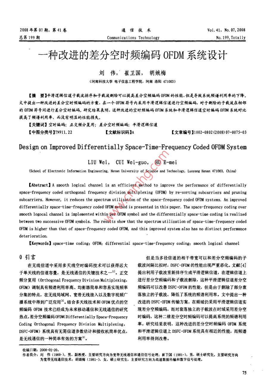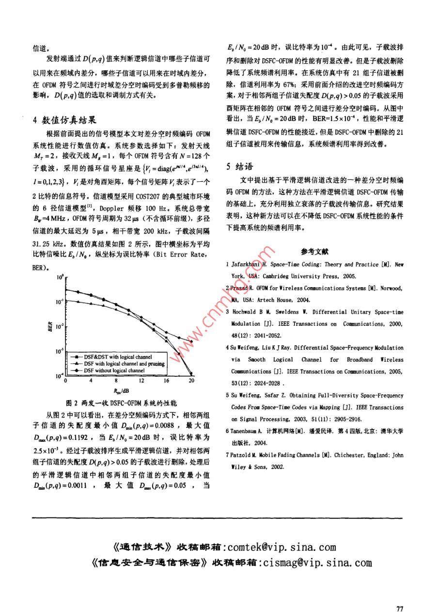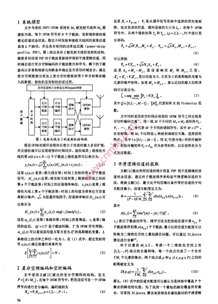 2008年第07期,第41卷通信技術(shù)Vol.41,No.07,2008總第199期Communications TechnologyNo. 199, Totally種改進(jìn)的差分空時(shí)頻編碼OFDM系統(tǒng)設(shè)計(jì)劉偉,崔衛(wèi)國,胡娥梅(河南科技大學(xué)電子信息工程學(xué)院,河南洛陽471003)擴(kuò)要】平滑邏輯信道子載波排序和子載波刪除可以提高差分空頻編碼θF甽M的性能,但是導(dǎo)致系統(tǒng)頻譖利用率的下降文中提出一種改進(jìn)的差分空時(shí)頻編碼的方案,在一個(gè)F硎M符號(hào)內(nèi)采用平滑邏輯信道進(jìn)行空頻編碼,對(duì)于刪除的子載滅在相鄰的0F甽M符號(hào)間進(jìn)行差分空時(shí)編碼。研究結(jié)果袤明,這種改進(jìn)的空時(shí)頻編碼θFM系統(tǒng)和平滑邏輯信道空時(shí)編碼0FD系統(tǒng)對(duì)比提高了頻譜利用率,而沒有明顯的性能損失關(guān)鍵詞】空時(shí)編碼;正交頻分復(fù)用;差分空時(shí)頻編碼;平滑邏輯信道【中圖分類號(hào)】TN911.22【文獻(xiàn)標(biāo)識(shí)碼】A【文章編號(hào)】1002-0802(2008)07-0075-03Design on Improved Differentially Space-Time-Frequency Coded OFDM SystemLIU Wei, CUI We i(School of Electronic Information Engineering, Henan University of Science and Technology, Luoyang Henan 471003, China)(] A smooth logical channel is an efficient method to improve the performance of differentialpace-frequency coded orthogonal frequency division multiplexing(OFDM) by re-sorting subcarriers and pruningsubcarriers. However it reduces the spectrum utilization of the space-frequency coded OFDM systems. an improvdifferentially space-time-frequency coded OFDM method is presented in this paper The space-frequency coding oversmooth logocal channel is implemented within per OFDM symbol and the differentially space-time coding is realizedbetween two successive OFDM symbols. The results show that the spectrum utilization of space-time-frequency codedOFDM is higher than that of space-frequency coded OFDM, and this improved system also has no distinct performancedeterioration(Keywords] space-time coding: OFDM; differential space-time-frequency coding: smooth logical channel0引言但是當(dāng)多徑信道的相干帶寬可以和差分空頻編碼的子在無線信道中采用多天線空時(shí)編碼技術(shù)可以獲得遠(yuǎn)大載波間隔比擬時(shí), DSFC-OFDM的性能出現(xiàn)嚴(yán)重惡化。文獻(xiàn)[4]于單天線的信道容量,是無線通信的關(guān)鍵技術(shù)之一。正交提出利用子載波重新排序生成平滑邏輯信道,在邏輯信道上頻分復(fù)用( Orthogonal Frequency Division駟 multiplexing,進(jìn)行差分空頻編嗎和子載波刪除,這種平滑邏輯信道差分空0FDM)調(diào)制具有頻譜利用率高、均衡器簡單和容易實(shí)現(xiàn)頻率頻編碼可以改善 DSFC-OFDM的性能,但是由于刪除了部分衰分集的特點(diǎn),在無線局域網(wǎng)、寬帶無線接入以及數(shù)字視頻廣落獨(dú)立的子載波,降低了系統(tǒng)的頻譜利用率。文中提出一種播系統(tǒng)中得到廣泛應(yīng)用。結(jié)合多天線技術(shù)和0FDM優(yōu)點(diǎn)的空改進(jìn)的 SFC-OFDM傳輸方案,在頻域仍采用平滑邏輯信道實(shí)頻編碼0FDM技術(shù)已經(jīng)成為未來移動(dòng)通信和無線通信的研究現(xiàn)差分空頻編碼,而對(duì)衰落獨(dú)立的子載波在時(shí)域采用差分空熱點(diǎn),差分空頻編碼0 FDM(Differentially Space-Frequency時(shí)編碼,這種二維差分空時(shí)頻編碼可以提高系統(tǒng)的頻譜利用Coding Orthogonal Frequency Division Multiplexing,率。研究結(jié)果表明,這種改進(jìn)的差分空時(shí)頻編碼QFDM系統(tǒng)DSFC-OFDM)系統(tǒng)具有無需信道參數(shù)估計(jì)和接收機(jī)簡單優(yōu)點(diǎn),和平滑邏輯信道上 DSFC-OFDM系統(tǒng)具有相近的性能,而頻譜是無線通信的一種簡單有效的方案。利用率得到改善收稿期:2008-02-20作者簡介:劉偉(1969-),男,副教授,主要研究方向?yàn)閷拵o線通信和通信信號(hào)處理:崔衛(wèi)國(1981-),男,碩土研究生,主要研究方向?yàn)閷拵o線通信技術(shù):胡娥梅(1981-),女,碩士研究生,主要研究方向?yàn)楦咚贁?shù)據(jù)傳輸和數(shù)字信號(hào)處理1系統(tǒng)模型這里X1=x,V是從循環(huán)信號(hào)星座中選擇的酉對(duì)角矩考慮的 DSFC-OFDM系統(tǒng)有M根發(fā)射天線和M,根陣,包含發(fā)送的信息,循環(huán)星座的大小為L。在每個(gè)0FDM接收天線,每個(gè)OFDM符號(hào)有N個(gè)子載波,發(fā)射端和接收端符號(hào)中,從兩個(gè)接收矩陣y和y:(D=23…,P中進(jìn)行差都無信道狀態(tài)信息。假定不同發(fā)射和接收天線間的衰落信道分譯碼:具有L個(gè)路徑,并且具有相同的功率延遲圖( power- delayY,=vpV X-p +Z,,Y,-=vpX,He- +Z,-profile,PDP尸)。圖1給出具有2根發(fā)射天線的發(fā)射機(jī)結(jié)構(gòu)(5)根據(jù)多徑信道PDP對(duì)子載波重新排序得到平滑邏輯信道,同可以得到時(shí)確定進(jìn)行差分空頻編碼的子載波數(shù)目和序號(hào),剩下的子載波再以多普勒頻移為判斷條件確定是否采用時(shí)域差分。滿足這里△,=H-H是信道響應(yīng)H,和H。之差差分空頻數(shù)據(jù)分組加上差分空時(shí)數(shù)據(jù)塊等于串并轉(zhuǎn)換塊輸z。=Z。-VZn是以均值為0,方差為2的高斯隨機(jī)變量為入的數(shù)據(jù)。接收機(jī)是發(fā)射機(jī)的逆過程。元素的噪聲矩陣。如果H≈H·那么近似的最大似然譯多徑信道統(tǒng)計(jì)功率延遲和 Doppler頻移碼可以表示為:,=arg min I,-vY I,(7)空頻}叫空頻OFDM其中Q∈{q,,…,M-號(hào),‖X,代表