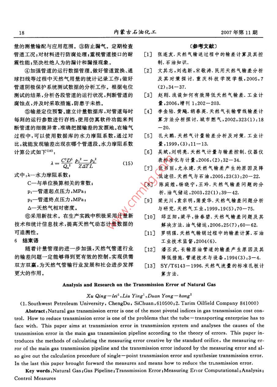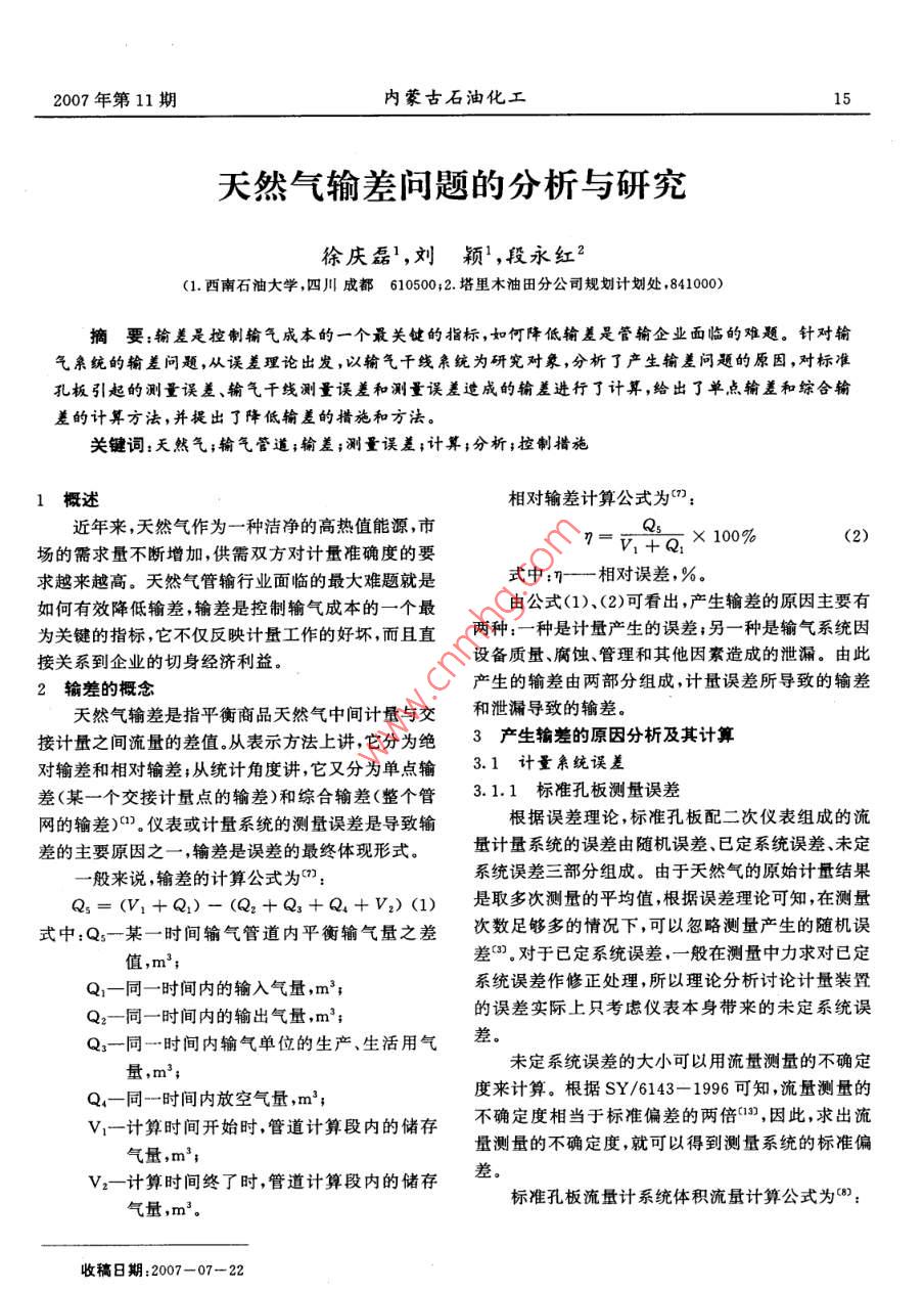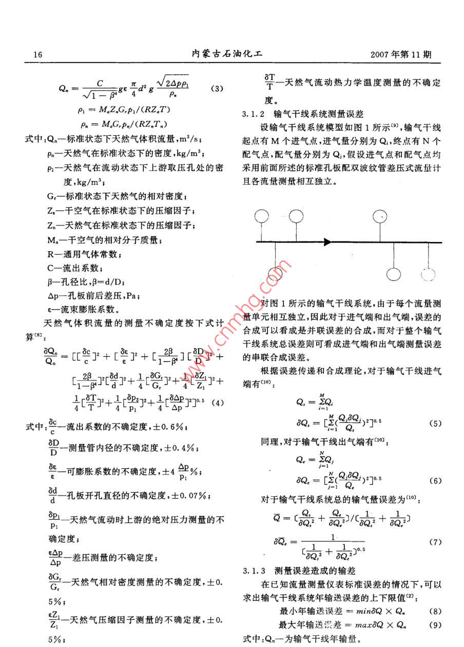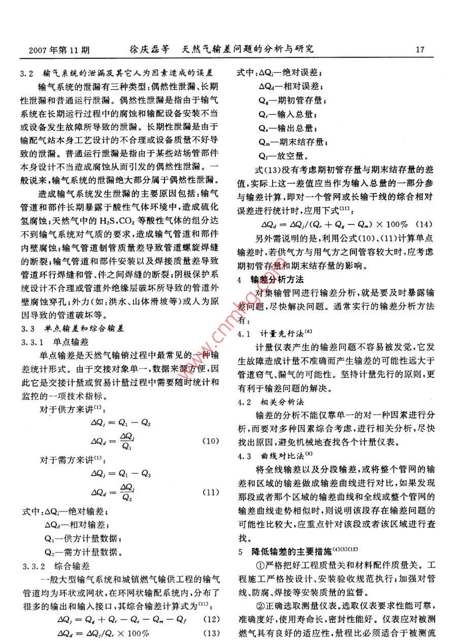 2007年第11期內(nèi)蒙古石油化工天然氣輸差問題的分析與研究徐慶磊,劉穎,段永紅2(1.西南石油大學(xué)四川成都610500;2.塔里木油田分公司規(guī)劃計劃處,841000)摘要:輸差是控制輸氣成本的一個最關(guān)鍵的指標(biāo),如何降低輸差是管輸企業(yè)面臨的難題。針對輸氣親統(tǒng)的輸差問題,從誤差理論出發(fā),以輸氣干線親統(tǒng)為研究對象,分析丁產(chǎn)生輸差問題的原因,對標(biāo)準(zhǔn)孔板引起的測量誤差、輸氣干線測量誤差和測量誤差造成的輸差進(jìn)行了計算,給出了單點輸差和綜合輸差的計算方法,并提出了降低輸差的措施和方法關(guān)鍵詞:天然氣;輸氣管道;輸差;測量誤差;計算;分析;控制措施概述相對輸差計算公式為()近年來,天然氣作為一種潔凈的高熱值能源,市場的需求量不斷增加,供需雙方對計量準(zhǔn)確度的要7=v1+a×10%(2)求越來越高。天然氣管輸行業(yè)面臨的最大難題就是式中:相對誤差,%。如何有效降低輸差,輸差是控制輸氣成本的一個最由公式(1)、(2)可看出,產(chǎn)生輸差的原因主要有為關(guān)鍵的指標(biāo),它不僅反映計量工作的好壞而且直兩種:一種是計量產(chǎn)生的誤差;另一種是輸氣系統(tǒng)因接關(guān)系到企業(yè)的切身經(jīng)濟(jì)利益。設(shè)備質(zhì)量、腐蝕、管理和其他因素造成的泄漏。由此輸差的概念產(chǎn)生的輸差由兩部分組成,計量誤差所導(dǎo)致的輸差天然氣輸差是指平衡商品天然氣中間計量與交和泄漏導(dǎo)致的輸差。接計量之間流量的差值從表示方法上講,它分為絕3產(chǎn)生輸差的原因分析及其計算對輸差和相對輸差;從統(tǒng)計角度講,它又分為單點輸31計量親統(tǒng)誤差差(某一個交接計量點的輸差)和綜合輸差(整個管3.1.1標(biāo)準(zhǔn)孔板測量誤差網(wǎng)的輸差)0)儀表或計量系統(tǒng)的測量誤差是導(dǎo)致輸根據(jù)誤差理論,標(biāo)準(zhǔn)孔板配二次儀表組成的流差的主要原因之一,輸差是誤差的最終體現(xiàn)形式。量計量系統(tǒng)的誤差由隨機(jī)誤差、已定系統(tǒng)誤差、未定一般來說,輸差的計算公式為m:系統(tǒng)誤差三部分組成。由于天然氣的原始計量結(jié)果Q3=(v1+Q)-(Q2+Q3+Q+V2()是取多次測量的平均值,根據(jù)誤差理論可知,在測量式中:Q一某一時間輸氣管道內(nèi)平衡輸氣量之差次數(shù)足夠多的情況下,可以忽略測量產(chǎn)生的隨機(jī)誤值,m3;差(對于已定系統(tǒng)誤差,一般在測量中力求對已定Q1-同一時間內(nèi)的輸入氣量,m3系統(tǒng)誤差作修正處理,所以理論分析討論計量裝置Q2-同一時間內(nèi)的輸出氣量,m3;的誤差實際上只考慮儀表本身帶來的未定系統(tǒng)誤Q3-同一時間內(nèi)輸氣單位的生產(chǎn)、生活用氣差量未定系統(tǒng)誤差的大小可以用流量測量的不確定Q4-同一時間內(nèi)放空氣量,m3;度來計算。根據(jù)SY/6143-1996可知,流量測量的V1計算時間開始時管道計算段內(nèi)的儲存不確定度相當(dāng)于標(biāo)準(zhǔn)偏差的兩倍,因此求出流氣量,m3;量測量的不確定度,就可以得到測量系統(tǒng)的標(biāo)準(zhǔn)偏v,計算時間終了時,管道計算段內(nèi)的儲存差。氣量,m3。標(biāo)準(zhǔn)孔板流量計系統(tǒng)體積流量計算公式為(:收稿日期:2007-07—-2216內(nèi)蒙古石油化工2007年第11期TT度天然氣流動熱力學(xué)溫度測量的不確定PI=M,Z,GPi/(RZaT)31.2輸氣干線系統(tǒng)測量誤差P.= MG-P.(RZ, T)設(shè)輸氣干線系統(tǒng)模型如圖1所示”,輸氣干線式中:Q一標(biāo)準(zhǔn)狀態(tài)下天然氣體積流量,m3/s起點有M個進(jìn)氣點,進(jìn)氣量分別為Q,終點有N個P一天然氣在標(biāo)準(zhǔn)狀態(tài)下的密度,kg/m3;配氣點,配氣量分別為Q,假設(shè)進(jìn)氣點和配氣點均P2-天然氣在流動狀態(tài)下上游取壓孔處的密采用前面所述的標(biāo)準(zhǔn)孔板配雙波紋管差壓式流量計度,kg/m3;且各流量測量相互獨(dú)立G一標(biāo)準(zhǔn)狀態(tài)下天然氣的相對密度;Z。一干空氣在標(biāo)準(zhǔn)狀態(tài)下的壓縮因子;Zn天然氣在標(biāo)準(zhǔn)狀態(tài)下的壓縮因子;M。一干空氣的相對分子質(zhì)量;R一通用氣體常數(shù);C一流出系數(shù);B一孔徑比,B=d/D;△p-孔板前后差壓,Pa;E一流東膨脹系數(shù)。對圖1所示的輸氣干線系統(tǒng),由于每個流量測天然氣體積流量的測量不確定度按下式計量單元相互獨(dú)立,因此對于進(jìn)氣端和出氣端,誤差的算合成可以看成是并聯(lián)誤差的合成,而對于整個輸氣干線系統(tǒng)總誤差則可看成進(jìn)氣端和出氣端測量誤差=[]+[]+[2][0y+的串聯(lián)合成誤差。2[y+4c:y+乙y+端有根據(jù)誤差傳遞和合成理論,對于輸氣干線進(jìn)氣4y+4y+9]5(4)Q,= 2Q式中:一流出系數(shù)的不確定度,士0.6%;Q,Q(5)D-測量管內(nèi)徑的不確定度,士0.4%同理,對于輸氣干線出氣端有(0:e可膨脹系數(shù)的不確定度,士42%Q, dQ(6)一孔板開孔直徑的不確定度,士0.07%;對于輸氣干線系統(tǒng)總的輸氣量誤差為0天然氣動葉上游的絕對壓力測量的不0-器+品(+h確定度;(7)E△P一差壓測量的不確定度;31.3測量誤差造成的輸差天然氣相對密度測量的不確定度,士0.在已知流量測量儀表標(biāo)準(zhǔn)誤差的情況下,可以5%;求出輸氣干線系統(tǒng)年輸送誤差的上下限值(2):2-天然氣壓縮因子測量的不確定度,士0最小年輸送誤差=minQ×Q(8)最大年輸送識差=maxQ×Qn(9)5%式中:Qn-為輸氣干線年輸量