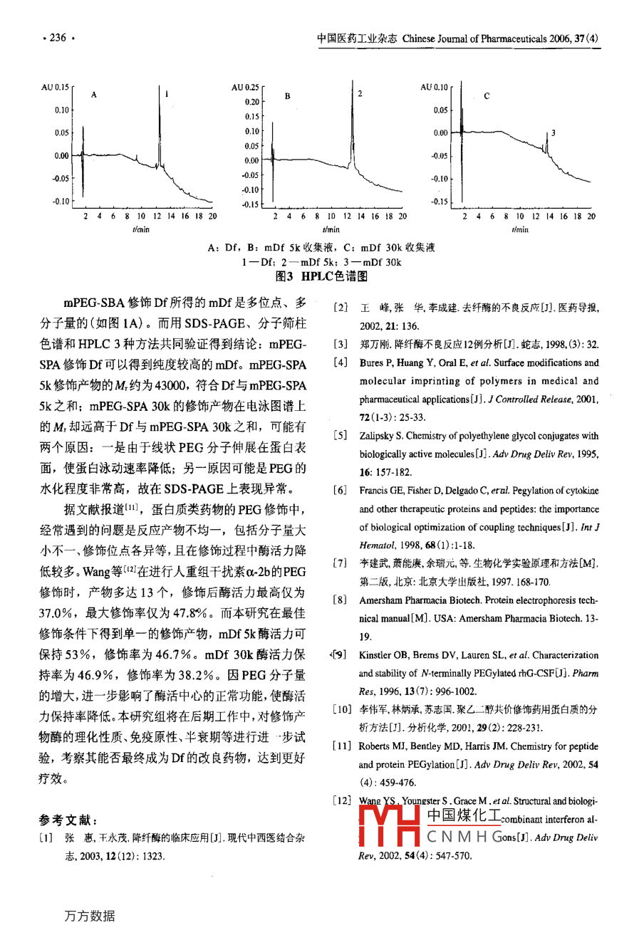 中國醫(yī)藥工業(yè)雜志 Chinese Journal of Pharmaceuticals2006,37(4)微生物藥物與生物技術(shù)《噬《《《《《《《《《《司降纖酶的聚乙二醇修飾及產(chǎn)物的純化研究武霞,馮軍,趙文杰上海醫(yī)藥T業(yè)研究院,上海20004摘要:研究了降纖酶的聚乙二醇修飾及純化方法。采用正交法考察影響修飾的4個因素,確定了最佳條件。利用分子篩柱色譜得到了較高酶活力保留的修飾產(chǎn)物, SDS-PAGE檢測為單一條帶。關(guān)鍵詞:降纖酶;聚乙二醇:正交實驗:純化中圖分類號:TQ464:8文獻(xiàn)標(biāo)識碼:A文章編號:1001-8255(2006)04-023404降纖酶( defibrase,Df已在臨床廣泛應(yīng)用,如分子篩柱色譜分離:色譜柱 Superdex75柱;流去纖、抗凝、降脂、擴張血管和改善微循環(huán)等。但動相005 mol/L NazHPO- NaH2PC2緩沖液(pH7.0A作為異源蛋白,Df在使用中不可避免地具有蛋白質(zhì)檢測波長215m;流速0.3ml/min。收集0.5m管。類藥物的共同缺點,如具免疫原性、半衰期短、穩(wěn)定HPLC測定:色譜柱 Waters Symmetry300c性差等23。聚乙二醇(PEG)修飾技術(shù)4是近年來發(fā)柱(39mm×150mm,5um);流動相A:0.1%三展的用于改進蛋白質(zhì)類約物體內(nèi)藥物動力學(xué)性質(zhì)的氟乙酸、B:乙腈-0.1%三氟乙酸(9:1);梯度洗新技術(shù),它將單甲氧基PEG分子(mPEG)鍵合到蛋脫:0~18min,流動相B20%~70%,18白質(zhì)分子表面改變蛋白質(zhì)的空間結(jié)構(gòu),進而改變其20min,流動相B70%~50%;檢測波長215nm;生化性質(zhì)。此法可有效降低蛋白質(zhì)的免疫原性,延長柱溫37℃;流速1.0ml/mins半衰期,減少給藥次數(shù)56。本研究考察了PEG修SDS-PAGE電泳:參考文獻(xiàn)1。分離膠125%飾Df的條件及目標(biāo)產(chǎn)物的純化。濃縮膠4%。1儀器與試藥22Df的修飾反應(yīng)10AKTA explorer蛋白質(zhì)分離純化儀、 SDS-PAGE儀均取1mg/ml的Df溶液2ml與02 mol/L NaH2POAmersham Pharmacia Biotech公司產(chǎn)品;高效液相色譜儀 Na2HPO緩沖液(pH6.5)4m混合,加入 mPEG-SPA( Waters公司); AllegraMX22 R Centrifuge冷凍離心機5k固體6mg溶解,混勻,37℃反應(yīng)60min。反應(yīng)( Beckman Coulter Th公司):超濾器( Millipore公司)。前后分別取適量混合液以pH74的Tris溶液稀釋,Df(M138k,河南省中泰藥業(yè)有限公司)mPEG-SPA測定酶活力,計算酶活力保持率。加入甘氨酸3g終M5k、30k,丙酸甲氧基聚乙二醇琥垍酰亞胺酯)、mPEG止反應(yīng)。超濾(截留分子量10000至05m,待分離SBA(酸甲氧基聚乙二醇琥酰亞胺酯)均為美國 Shearwater純化,產(chǎn)物記作mDf5k。公司產(chǎn)品另以 mPEG-SPA30k、 mPEG-SBA分別進行D2方法與結(jié)果的修飾反應(yīng),方法同上。產(chǎn)物分別記作mDf30k和21主要測定方法MmDf-SBA蛋白質(zhì)濃度測定:采用 Lowry法[。23Df的PEG修飾條件選擇Df活性測定:參照衛(wèi)生部約典委員會頒布標(biāo)準(zhǔn)將影響修飾結(jié)果的4個影響因素:反應(yīng)緩沖液(試行)測定。pH(A)、Df與PEG的摩爾比(B)、反應(yīng)時間(C)和反應(yīng)行3水平正交實驗,其體設(shè)計見作者簡介,武霞(197),女,碩士研究生,專業(yè)方向:微生表1中國煤化工持率和修飾率來確物與生化藥學(xué)。定最CNMH3)量通過分子篩柱Tel:021-62479808×426E-mail:wuxia202@@163.com色譜圖中的面積計算。中國醫(yī)藥工業(yè)雜志 Chinese journal of pharmaceuticals2006,37(4)表1L(3)的因素水平表產(chǎn)物為混合物,故未進行修飾反應(yīng)條件的篩選。因素24修飾產(chǎn)物的純化D/℃A5052.41SDS-PAGE電泳驗證修飾產(chǎn)物l:10分別對各修飾反應(yīng)產(chǎn)物進行 SDS-PAGE電泳輸證,見圖1A~C。mPEG-SBA修飾Df的產(chǎn)物電泳試驗結(jié)果表明,在pH65、Df與PEG摩爾比圖上出現(xiàn)數(shù)條M增大的條帶; mPEG-SPA5k修飾為1:20、反應(yīng)時間h、溫度37℃的條件下,產(chǎn)Df的電泳圖上則有一條M1增大的條帶,M,約為物可保持較高酶活力,且修飾率最高。產(chǎn)物mDf43k;mPEG-SPA30k修飾Df的電泳圖上有條Mr5k的酶活力保持率53%、修飾率46.7%。mDf30k增幅更明顯的條帶(圖1C),M約為97k的酶活力保持率469%、修飾率38.2%。因 mDE- SBA323497.4k43.0k97.4k43.0k3l.0k31.0k20.lk20.lk4.4k20.lk14.4k二14.4k1—Df:2一標(biāo)準(zhǔn)分子量蛋白1一標(biāo)準(zhǔn)分子量蛋白;2-Df;1-標(biāo)準(zhǔn)分子量蛋白;2-Df3—修飾反應(yīng)液3修飾反應(yīng)液;4-mDf5k3-修飾反應(yīng)液圖1Df與 mPEG-SBA(A)、 mPEG-SPA5k(B)、 mPEG-SPA30k(C)的修飾反應(yīng)電泳圖242 Superdex75分子篩柱色譜應(yīng)液經(jīng)分子篩柱色譜分離后,所得色譜圖見圖2。Df的 mPEG-SPA5k和mPEG-SPA30k修飾反MAU 4000A:mPEG-SPA5k修飾反應(yīng)液,B:mPEG-SPA30k修飾反應(yīng)液Df: 2--mDf 5k: 3--mDf 30k圖2修飾反應(yīng)液的分子篩柱色譜圖譜24.3HPLC分析取柱色譜分離后收集的單一峰濃縮,再進行分別取Df、柱色譜分離后收集的mDfk、 mDf SDs中國煤化工4.1”項下類似:30k純品適量,按照“2.1”項下條件進行 HPLC mPlCNMH Gk修飾Df分別得到分析,色譜圖見圖3。M約內(nèi)4500U、y/UU的廣砌mDf5k、mDf30k。244SDS-PAGE電泳驗證純化產(chǎn)物3討論236中國醫(yī)藥工業(yè)雜志 Chinese Joumal of Pharmaceuticals200,37(4)AU0.2510.058101214|618204681012141618208101214161820A:Df,B:mDf5k收集液,C:mDf30k收集液1--Df: 2-mDf 5k: 3--mDf 30k圖3HPLC色譜圖mPEG-SBA修飾Df所得的mD是多位點、多(2王峰,張華李成建去纖酶的不良反應(yīng)]圖藥導(dǎo)報,分子量的(如圖1A)。而用SDS-PAGE、分子篩柱2002,21:136.色譜和HPLC3種方法共同驗證得到結(jié)論:mPEG-[3]鄭萬剛降纖酶不良反應(yīng)12例分析蛇志,199(3):32SPA