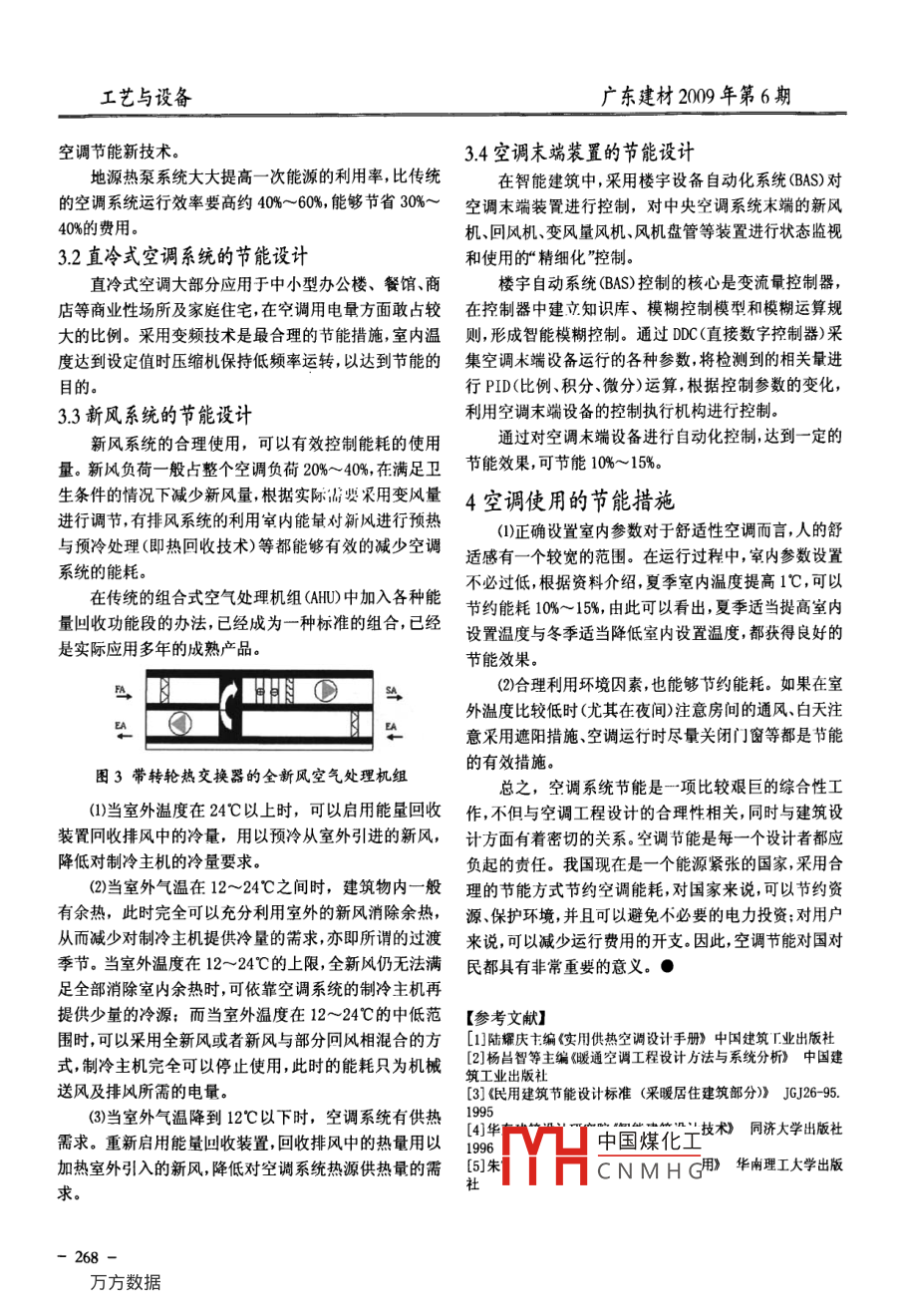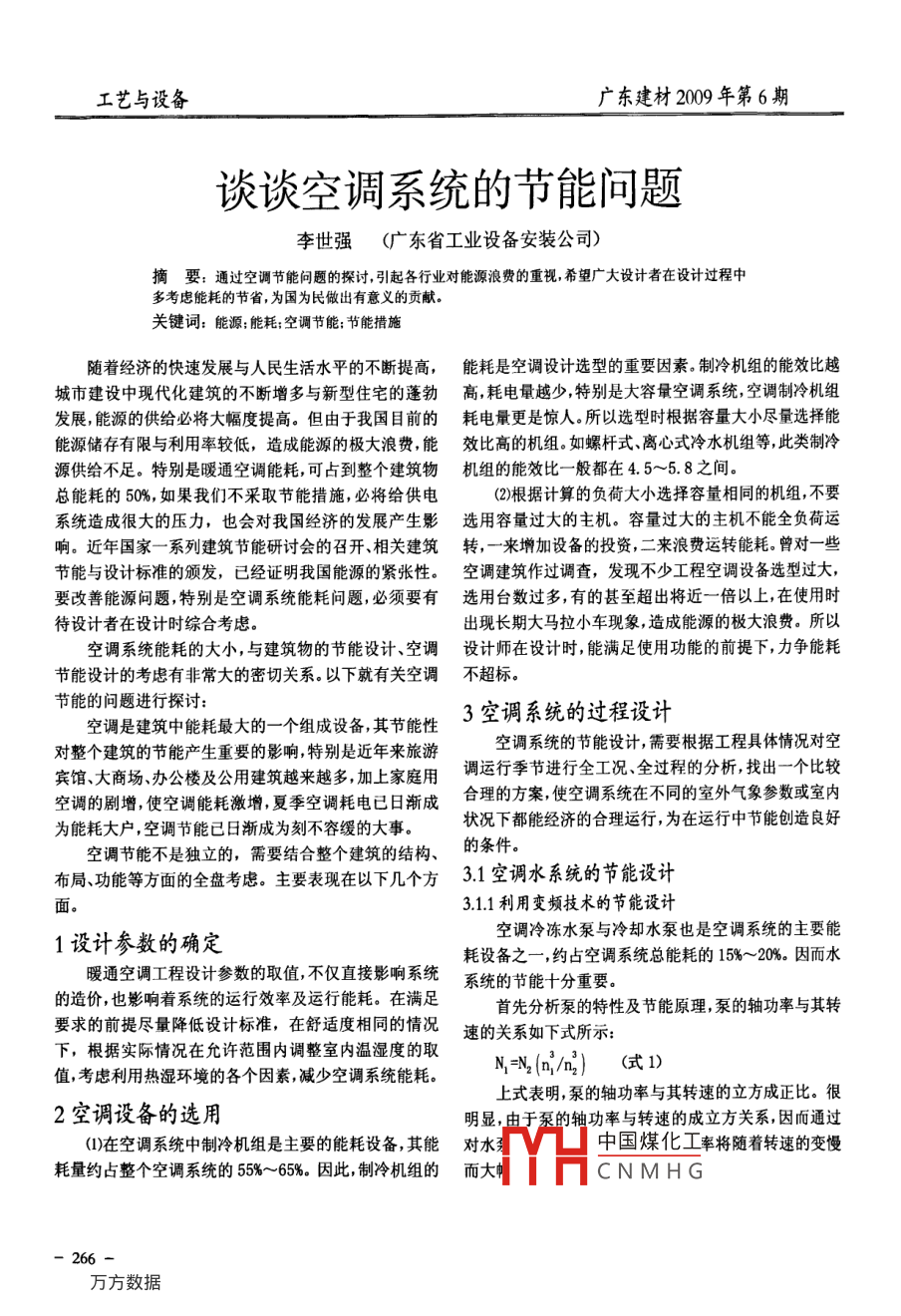 工藝與設(shè)備廣東建材2009年第6期談?wù)効照{(diào)系統(tǒng)的節(jié)能問題李世強(廣東省工業(yè)設(shè)備安裝公司)摘要:通過空調(diào)節(jié)能問題的探討引起各行業(yè)對能源浪費的重視希望廣大設(shè)計者在設(shè)計過程中多考慮能耗的節(jié)省,為國為民做出有意義的貢獻(xiàn)。關(guān)鍵詞:能源;能耗;空調(diào)節(jié)能;節(jié)能措施隨著經(jīng)濟的快速發(fā)展與人民生活水平的不斷提高,能耗是空調(diào)設(shè)計選型的重要因素。制冷機組的能效比越城市建設(shè)中現(xiàn)代化建筑的不斷增多與新型住宅的蓬勃高耗電量越少,特別是大容量空調(diào)系統(tǒng)空調(diào)制冷機組發(fā)展能源的供給必將大幅度提高。但由于我國目前的耗電量更是驚人。所以選型時根據(jù)容量大小盡量選擇能能源儲存有限與利用率較低,造成能源的極大浪費能效比高的機組。如螺桿式、離心式冷水機組等此類制冷源供給不足。特別是暖通空調(diào)能耗,可占到整個建筑物機組的能效比一般都在4.5~5.8之間總能耗的50%,如果我們不采取節(jié)能措施,必將給供電(2)根據(jù)計算的負(fù)荷大小選擇容量相同的機組,不要系統(tǒng)造成很大的壓力,也會對我國經(jīng)濟的發(fā)展產(chǎn)生影選用容量過大的主機。容量過大的主機不能全負(fù)荷運響。近年國家一系列建筑節(jié)能研討會的召開、相關(guān)建筑轉(zhuǎn),一來增加設(shè)備的投資,二來浪費運轉(zhuǎn)能耗。曾對一些節(jié)能與設(shè)計標(biāo)準(zhǔn)的頒發(fā),已經(jīng)證明我國能源的緊張性??照{(diào)建筑作過調(diào)查,發(fā)現(xiàn)不少工程空調(diào)設(shè)備選型過大,要改善能源問題特別是空調(diào)系統(tǒng)能耗問題,必須要有選用臺數(shù)過多,有的甚至超出將近一倍以上,在使用時待設(shè)計者在設(shè)計時綜合考慮。出現(xiàn)長期大馬拉小車現(xiàn)象造成能源的極大浪費。所以空調(diào)系統(tǒng)能耗的大小,與建筑物的節(jié)能設(shè)計、空調(diào)設(shè)計師在設(shè)計時,能滿足使用功能的前提下,力爭能耗節(jié)能設(shè)計的考慮有非常大的密切關(guān)系。以下就有關(guān)空調(diào)不超標(biāo)。節(jié)能的問題進(jìn)行探討:空調(diào)是建筑中能耗最大的一個組成設(shè)備,其節(jié)能性3空調(diào)系統(tǒng)的過程設(shè)計對整個建筑的節(jié)能產(chǎn)生重要的影響特別是近年來旅游空調(diào)系統(tǒng)的節(jié)能設(shè)計,需要根據(jù)工程具體情況對空賓館、大商場辦公樓及公用建筑越來越多加上家庭用調(diào)運行季節(jié)進(jìn)行全工況、全過程的分析,找出一個比較空調(diào)的劇增,使空調(diào)能耗激增夏季空調(diào)耗電已日漸成合理的方案,使空調(diào)系統(tǒng)在不同的室外氣象參數(shù)或室內(nèi)為能耗大戶,空調(diào)節(jié)能已日漸成為刻不容緩的大事狀況下都能經(jīng)濟的合理運行,為在運行中節(jié)能創(chuàng)造良好空調(diào)節(jié)能不是獨立的,需要結(jié)合整個建筑的結(jié)構(gòu)、的條件布局、功能等方面的全盤考慮。主要表現(xiàn)在以下幾個方3.1空調(diào)水系統(tǒng)的節(jié)能設(shè)計面。3.11利用變頻技術(shù)的節(jié)能設(shè)計1設(shè)計參數(shù)的確定空調(diào)冷凍水泵與冷卻水泵也是空調(diào)系統(tǒng)的主要能耗設(shè)備之一,約占空調(diào)系統(tǒng)總能耗的15%~20%。因而水暖通空調(diào)工程設(shè)計參數(shù)的取值,不僅直接影響系統(tǒng)系統(tǒng)的節(jié)能十分重要。的造價,也影響著系統(tǒng)的運行效率及運行能耗。在滿足首先分析泵的特性及節(jié)能原理,泵的軸功率與其轉(zhuǎn)要求的前提盡量降低設(shè)計標(biāo)準(zhǔn),在舒適度相同的情況速的關(guān)系如下式所示下,根據(jù)實際情況在允許范圍內(nèi)調(diào)整室內(nèi)溫濕度的取值,考慮利用熱濕環(huán)境的各個因素,減少空調(diào)系統(tǒng)能耗。N2{n1/n2)(式1)上式表明,泵的軸功率與其轉(zhuǎn)速的立方成正比。很2空調(diào)設(shè)備的選用明顯,由于泵的軸功率與轉(zhuǎn)速的成立方關(guān)系,因而通過(1)在空調(diào)系統(tǒng)中制冷機組是主要的能耗設(shè)備,其能對水中國煤化工率將隨著轉(zhuǎn)速的變慢耗量約占整個空調(diào)系統(tǒng)的55%-65%,因此制冷機組的而大中CNMHG266廣東建材200年第6期工藝與設(shè)備當(dāng)電動機驅(qū)動泵時,電動機的軸功率可按下式計用定轉(zhuǎn)速變流量方法與變頻調(diào)速變流量方法都可以達(dá)算:到節(jié)能的目的。根據(jù)水泵運轉(zhuǎn)性分析,定轉(zhuǎn)速變流量方P=pQH/ncnF×102(式2)法節(jié)能不明顯變頻調(diào)速變流量是水系統(tǒng)能量調(diào)節(jié)的最式中:合理方法。變頻調(diào)速可使水泵工作效率提高,能源利用P一電動機的軸功率(KW);合理,可大幅度節(jié)約水泵的電耗。p一液體的密度(Kg/m隨著變頻技術(shù)的日益成熟,利用變頻器、PLC數(shù)模Q流量m/s;轉(zhuǎn)換模塊、溫度傳感器溫度模塊等器件的有機結(jié)合,構(gòu)H泵的揚程(m成溫差閉環(huán)自動控制系統(tǒng),自動調(diào)節(jié)水泵的輸出流量nc一傳動裝置效率為達(dá)到節(jié)能目的提供可靠的技術(shù)條件。nF一泵的效率。水泵變頻控制原理:PLC控制器通過溫度模塊及溫調(diào)節(jié)泵流量的方法: