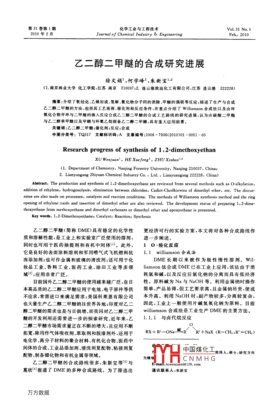 第31卷第1期化學(xué)工業(yè)與工程技術(shù)Vol. 31 No. 12010年2月Journal of Chemical Industry &engineering乙二醇二甲醚的合成研究進展徐文娟,何學(xué)峰2,朱新寶12(1.南京林業(yè)大學(xué)化工學(xué)院江蘇南京210037;2.連云港致遠化工有限公司,江蘇連云港222228摘要:介紹了氧烴化、乙烯加成氫解、氯化物分子間的消除、甲醚的偶聯(lián)等反應(yīng),綜述了生產(chǎn)與合成乙二醇二甲醚的方法,包括其工藝流程催化劑和反應(yīng)條件,并重點介紹了 Williamson合成法以及由環(huán)氧化合物開環(huán)與二甲醚的插入反應(yīng)合成乙二醇二甲醚的合成工藝路線的研究進展,認為由碳酸二甲酯與乙二醇單甲醚以及甲醚與環(huán)氧乙烷制備乙二醇二甲醚,具有重大應(yīng)用前景。關(guān)鍵詞:乙二醇二甲醚;催化劑;反應(yīng);合成中圖分類號:TQ317文獻標(biāo)識碼:A文章編號:1006-7906(2010)01-0051-05Research progress of synthesis of 1, 2-dimethoxyethanXU Wenjuan, HE Xuefeng', ZHU Xinbao.(1. Department of Chemistry, Nanjing Forestry University, Nanjing 210037, China;2. Lianyungang Zhiyuan Chemical Industry Co, Ltd, Lianyuangang 222228, China)Abstract: The production and synthesis of 1, 2-dimethoxyethane are reviewed from several methods such as O-alkylationaddition of ethylene, hydrogenolysis, elimination between chlorides, Cadiot-Chodkiewicz of dimethyl ether, etc. The discussions are also made on processes, catalysts and reaction conditions. The methods of williamson synthesis method and the ringopening of ethylene oxide and insertion of dimethyl ether are also reviewed. The development status of preparing 1, 2-dime-thoxyethane from methoxyethane and dimethyl carbonate or dimethyl ether and epoxyethane is presentedKey words: 1, 2-Dimethoxyethane: Catalyst; Reaction: Synthesis乙二醇二甲醚(簡稱DME)具有穩(wěn)定的化學(xué)性更經(jīng)濟可行的實驗方案,本文將對各種合成路線作質(zhì)和溶解性能,是工業(yè)上和實驗室廣泛使用的溶劑,進一步闡述。同時也可用于醫(yī)藥抽提劑和有機中間體山。此外,1O-烴化反應(yīng)它是良好的表面涂料溶劑和軍用噴氣式飛機燃料抗1.1 williamson合威法凍添加劑;也可作金屬和玻璃的清洗劑;還可用于化DME長期以來被作為極性情性溶劑。Wil-妝品工業(yè)、香料工業(yè)、醫(yī)藥工業(yè)、油田工業(yè)等多領(lǐng) lamson法合成DME已在工業(yè)上應(yīng)用,該法由于消域(,應(yīng)用非常廣泛耗氯和堿,以及反應(yīng)后氯化鈉的分離而具有低經(jīng)濟目前國外乙二醇二甲醚的使用越來越廣泛,在日性。原料堿為Na與NaOH等。利用金屬鈉時操作本高品質(zhì)的乙二醇二甲醚應(yīng)用于電池、電子原件等供簡單,產(chǎn)品易得,但工藝要求高,且金屬鈉昂貴使成不應(yīng)求常需進口來滿足需求;美國科萊恩有限公司本升高。利用NaOH時,副產(chǎn)物較多,分離較復(fù)雜,也大量生產(chǎn)乙二醇二甲醚銷往世界各地;印度對乙二因此,工業(yè)上一般使用片堿氫氧化鈉為原料。目前醇二甲醚的需求也是與日俱增。而我國對乙二醇二甲 williamson合成法是工業(yè)生產(chǎn)DME的主要方法。醚的開發(fā)利用還需要進一步的探索研究近年來,乙1.1.1與鹵代烷反應(yīng)二醇二甲醚市場需求量正在不斷的增大,且應(yīng)用不斷拓寬除用作氣體吸收劑、萃取劑和脫漆劑外,還用于RX+R-ONa afORR+NaX (R-Ch,:R=CH,電化學(xué)、高分子材料的聚合材料、有機化合物、醫(yī)藥中間體的合成、工業(yè)品添加劑清洗劑復(fù)配物粘接劑復(fù)中國煤化工配物制備硼化物和有機金屬等領(lǐng)域。菏澤人,碩士,研究方向為輔紙CNMHG乙二醇二甲醚的合成路線很多,朱新寶等與葛欣“報道了DME的多種合成路線。為了篩選出通訊聯(lián)系人:朱新寶化學(xué)T業(yè)與工程技術(shù)2010年第31卷第1期在堿性條件下,醇鈉與鹵代烴發(fā)生反應(yīng)生成率與選擇性,發(fā)明了一種新型的復(fù)合催化劑1,該大部分為不對稱醚。鹵代烴可用氯甲烷氯丁烷氯化催化劑組成為:HBF/BF3與H2SO4、HNO芐等,合成不同的醚。該法已應(yīng)用于工業(yè)化生產(chǎn),但副H3PO4的質(zhì)量比優(yōu)選1:(0.3~5)。特別優(yōu)選的酸產(chǎn)物多需要大量的有機介質(zhì)增大了能耗。中國專利是H2SO4和H3PO4。利用這種催化劑體系,形成報道了以氯甲烷為甲基化劑合成DME的方法。較低量的副產(chǎn)物如二烷或三甘醇二甲醚,和較高1.1.2與烷基的無機酸酯的反應(yīng)比例的有價值物質(zhì)DME和二甘醇二甲醚。2RONa+(R)2 CO3--2ROR+Na2 cO1.3分子間的縮合反應(yīng)2RONa+(r)2 SOs1.3.1縮醛還原法式中:R=CH3,R=CH3單醚與甲醛反應(yīng)生成縮醛化合物,后還原縮醛即用Na與乙二醇單甲醚(EM)在適當(dāng)配比下反可得到雙醚類化合物常用的還原劑有金屬氫化物應(yīng),再加入硫酸二甲酯為催化劑,在85~90℃時恒溫金屬氫化物與三氯化鋁的混合物、三烷基硅烷、格式15min可得到DME。雖然硫酸二甲酯活性高、易控化試劑與催化氫化還原。金屬催化劑一般較昂貴,實制但毒性大。碳酸二甲酯是一種反應(yīng)活性高、無毒又際生產(chǎn)應(yīng)用較少,已有二甘醇醚縮甲醛氫化的廉價的甲基化劑,日本專利報道了以碳酸二甲酯為甲報道0基化劑,將乙二醇單甲醚與(MeO)2CO,NaOH,NaI文獻[19-22]報道利用Al2O3-SiO2為載體負及MeOH一起加入到高壓釜中,在240℃時反應(yīng)5h載Ni,Co,Cu催化劑氫化,DME收率可達89.2%得到DME;收率78.4%,選擇性61.9%。也可負載Ni-Mo作為催化劑,并在上