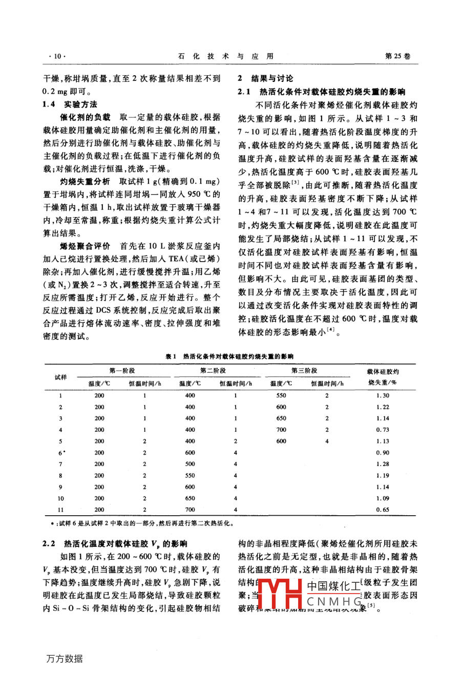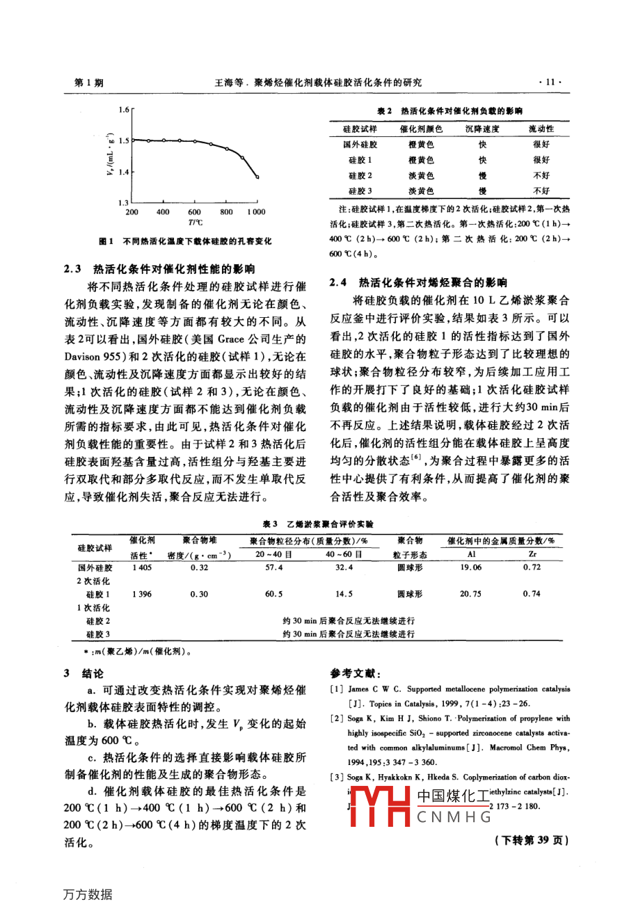 第25卷第1期石化技術(shù)與應(yīng)用Vol.25 No.12007年1月Petrochemical Technology & ApplicationJan.2007研究與開發(fā)(9~11)聚烯烴催化劑載體硅膠活化條件的研究王海,曲其昌,姚培洪(中國石油蘭州石化分公司石油化工研究院,甘肅蘭州730060)摘要:研究了不同活化條件對聚烯烴催化劑載體硅膠的灼燒失重、表面形態(tài)、孔容以及催化劑的活性、聚合物形態(tài)的影響。實驗結(jié)果表明:對聚烯烴催化劑載體硅膠表面特性的調(diào)控可通過改變熱活化條件實現(xiàn);熱活化條件的選擇直接影響載體硅膠所制備催化劑的性能及生成的聚合物形態(tài);載體硅膠熱活化時,發(fā)生孔容變化的起始溫度為600C;聚烯烴催化劑載體硅膠的最佳熱活化條件是200C(1h)→400 C(1 h)- +600 C(2 h)和200 C(2 h)- -+600 C(4 h)的梯度溫度下的二次活化。關(guān)鍵詞:聚烯烴;催化劑載體;硅膠;熱活化;灼燒失重中圈分類號:TQ 426. 65文獻標(biāo)識碼:B文章編號:1009 -0045(2007)01 -0009 -03目前聚烯烴工業(yè)催化劑以負載型催化劑為 式電阻爐,遼寧省沈陽市長城工業(yè)電爐廠產(chǎn)品;主,硅膠是氣相法工藝中應(yīng)用較廣的催化劑載101 A-2型干燥箱,上海市實驗儀器廠產(chǎn)品;普體',由于其能對聚合物粒子具有良好的形態(tài)控通玻璃干燥器,浙江省臺州市中谷科技有限公司制,近年來,在聚乙烯催化劑和茂金屬催化劑負產(chǎn)品;HJ-3型數(shù)碼恒溫磁力攪拌器,江蘇省常州載化領(lǐng)域中的應(yīng)用更為廣泛口。中國石油蘭州市國華電器有限公司產(chǎn)品;F-101型反應(yīng)釜,容石化分公司(以下簡稱為蘭州石化)石油化工研積為3.8m',甘肅銀光化學(xué)工業(yè)公司化工機械廠究|院經(jīng)過多年的探索與研究,成功開發(fā)出具有自產(chǎn)品;烯烴聚合評價裝置,容積10 L,美國Xytel公主知識產(chǎn)權(quán)的載體硅膠(LSG-1),并進行了工業(yè)司產(chǎn)品;AE 240型電子分析天平,精度為0.1 mg,化應(yīng)用,打破了國外長期在催化劑載體硅膠領(lǐng)域瑞士Mettler公司產(chǎn)品。對市場的壟斷。載體硅膠在催化劑制備過程中.1.3實驗準(zhǔn) 備首先必須進行高溫活化,而不同的活化條件將產(chǎn)催化劑載體硅膠的制備采用 晶核粒子增生形態(tài)、活性及性能不同的催化劑。本工作主要長凝膠方法在反應(yīng)釜中進行硅膠產(chǎn)品制備,要求考察了熱活化條件對聚烯烴催化劑載體硅膠的產(chǎn)品形態(tài)為球狀粉末,比表面積為400.0 m2/g左灼燒失重量、孔容(V,)、表面形態(tài)、催化劑的活性右,V。為1.50 mL/g,平均孔徑為1.98x10 -°m,平及聚合物形態(tài)的影響。均粒徑為40μm,堆密度為0.29~0.31g/cm'。不同初含水量硅膠試樣的制備在箱式電1實驗部分阻爐內(nèi),分批次進行硅膠試樣于一定溫度梯度和1.1 原材料保溫時間的活化,然后將干燥好的硅膠試樣放置水玻璃,工業(yè)級,其模數(shù)[n(SiO2)/于干燥器內(nèi),以備第二天進行灼燒失重實驗的n(Na,0)]為3.1 ~3.4,蘭州石化催化劑廠生產(chǎn);測試。硫酸(H2SO,) ,分析純,甘肅省白銀市銀環(huán)化學(xué)制坩堝恒重的測試將 瓷坩堝放在干燥箱內(nèi)劑廠生產(chǎn);已烷,蘭州石化石油化工廠生產(chǎn);三乙干燥,稱坩堝質(zhì)量,再將坩堝放在干燥箱內(nèi)進行基鋁(TEA) ,中國石油遼陽化工公司生產(chǎn)。1.2 設(shè)備與儀器中國煤化工SX2-5 - 12型箱式電阻爐,天津市天驕工C NMH G06-11-13作看國燈:王博(1919- -),另,酮孔囊夾人,助理工程師,主要業(yè)有限公司實驗電爐廠產(chǎn)品;SX 2-4-10型箱從事催化劑載體的研究工作。已發(fā)表論文1篇?!?0.石化技術(shù)與應(yīng)用第25卷干燥. ,稱坩堝質(zhì)量,直至2次稱量結(jié)果相差不到2結(jié)果與討論.0.2 mg即可。2.1熱活 化條件對載體硅膠灼燒失重的影響1.4實驗方法不同活化條件對聚烯烴催化劑載體硅膠灼催化劑的負載取- 一定量的載體硅膠,根據(jù)燒失重的影響,如圖1所示。從試樣1~3和載體硅膠用量確定助催化劑和主催化劑的用量,7~10可以看出,隨著熱活化階段溫度梯度的升然后分別進行助催化劑與載體硅膠、助催化劑與高,載體硅膠的灼燒失重降低,說明隨著熱活化主催化劑的負載過程;在低溫下進行催化劑的負溫度升高,硅膠試樣的表面羥基含量在逐漸減載;對催化劑進行恒溫,洗滌,干燥。少,熱活化溫度高于600C時,硅膠表面羥基幾灼燒失重分析取試樣 1 g(精確到0.1 mg)乎全部被脫除「)],由此可推斷,隨著熱活化溫度置于坩堝內(nèi),將試樣連同坩堝一同放人950 C的的升高,硅膠表面羥基密度不斷下降;從試樣干燥箱內(nèi),恒溫1 h,取出試樣放置于玻璃干燥器1 ~4和7 ~11可以發(fā)現(xiàn),活化溫度達到700 C內(nèi),冷卻至常溫,稱重;根據(jù)灼燒失重計算公式計時,灼燒失重大幅度降低,說明硅膠在此溫度可算出結(jié)果。烯烴聚合評價首先在10L淤漿反應(yīng)釜內(nèi)能發(fā)生了局部燒結(jié);從試樣1 ~11可以發(fā)現(xiàn),不加入已烷進行置換處理,然后加人TEA(或已烯)僅活化溫度對硅膠試樣表面羥基有影響,恒溫除雜;再加入催化劑,進行緩饅攪拌升溫;用乙烯時間不同也對硅膠試樣表面羥基含量有影響,(或N2)置換2~3次,調(diào)整攪拌至適合轉(zhuǎn)速,升至但影響不大。由此可見,硅膠表面基團的類型、反應(yīng)所需溫度;打開乙烯,反應(yīng)開始進行。整個數(shù)目及分布情況主要取決于活化溫度,因此可.反應(yīng)過程通過DCS系統(tǒng)控制,