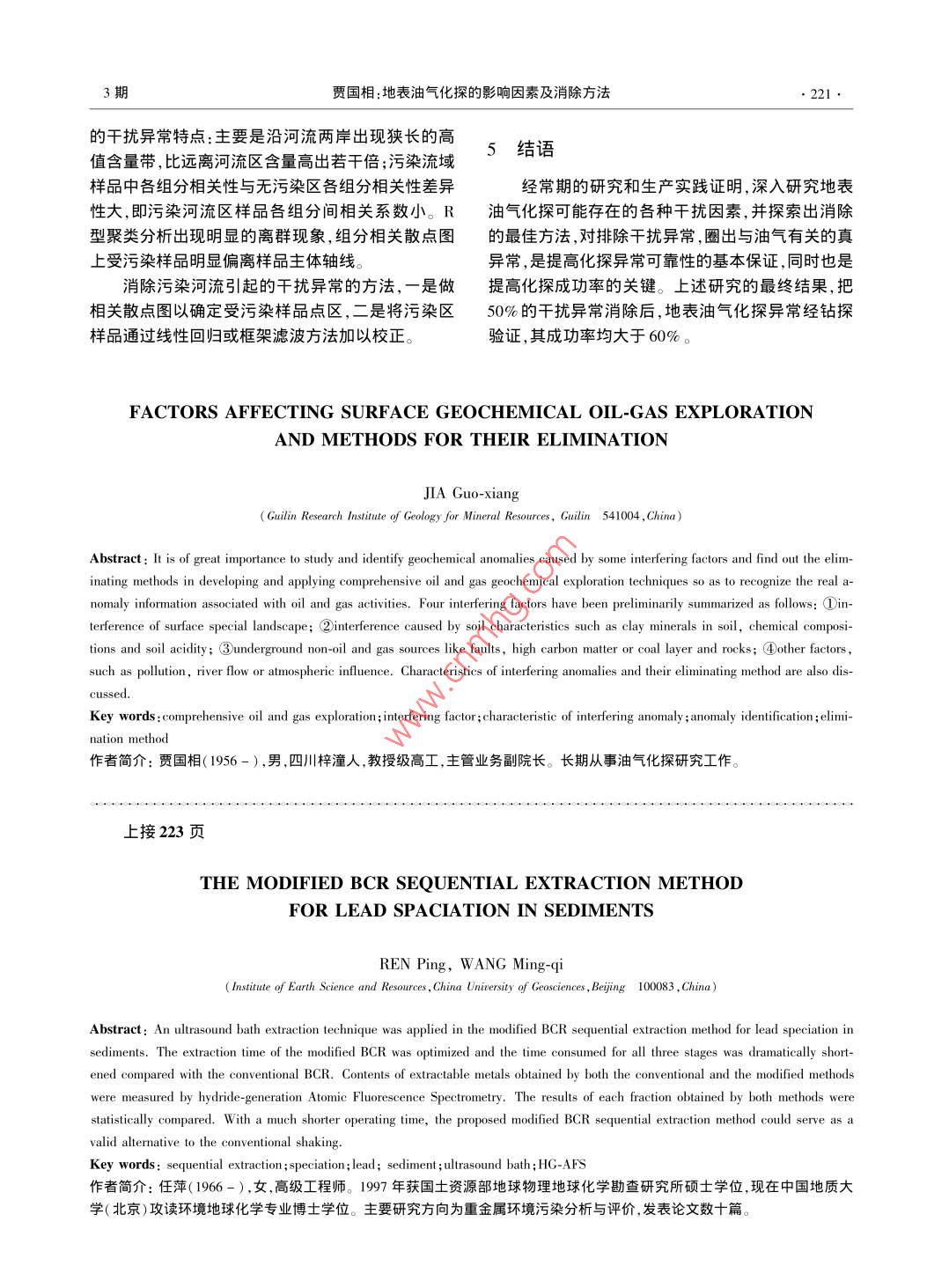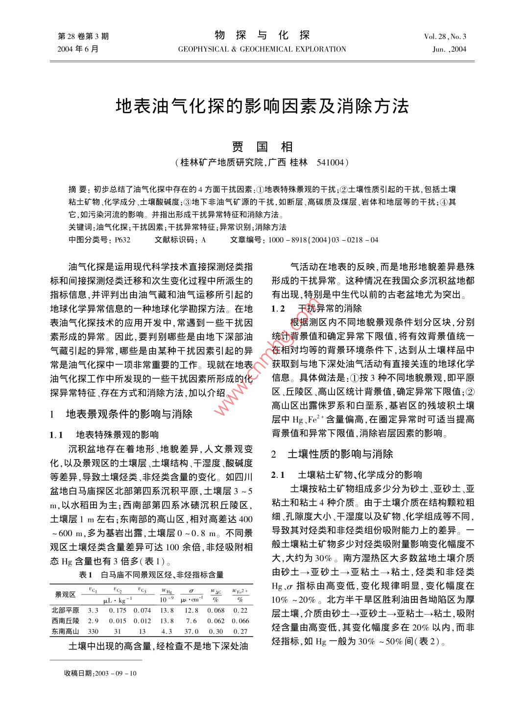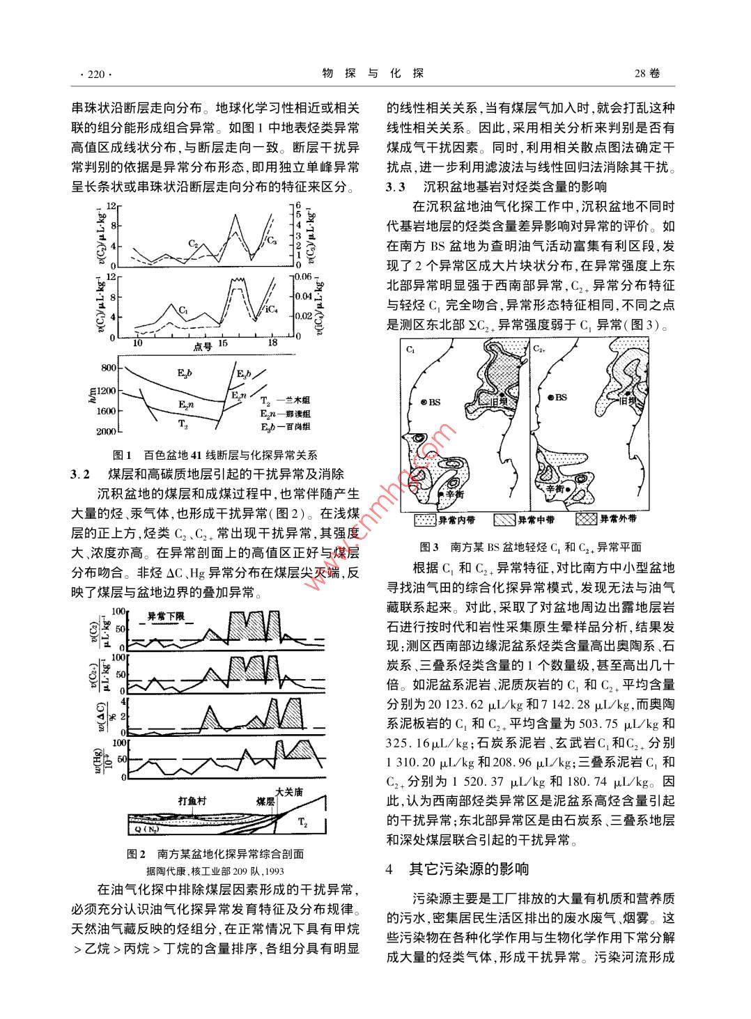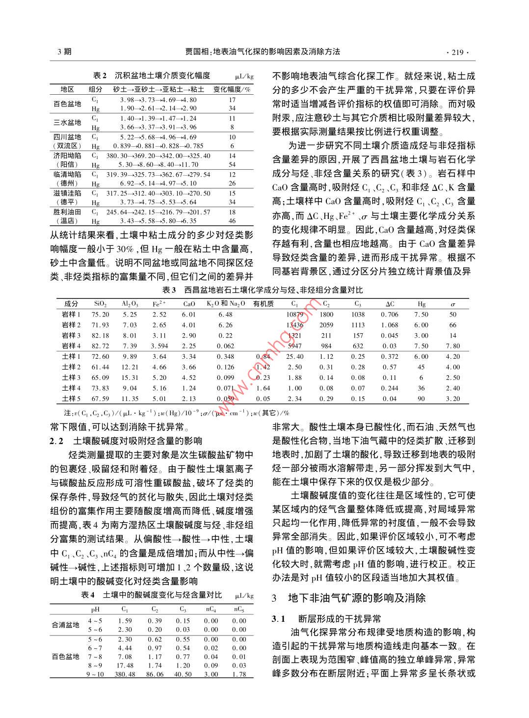 第28卷第3期物探與化探Vol. 28 ,No.32004年6月GEOPHYSICAL & GEOCHEMICAL EXPLORATIONJun. ,2004地表油氣化探的影響因素及消除方法賈國相(桂林礦產(chǎn)地質(zhì)研究院,廣西桂林541004)摘要:初步總結(jié)了油氣化探中存在的4方面千擾因素:①地表特殊景觀的干擾;②土壤性質(zhì)引起的干擾,包括土壤粘士礦物、化學成分、土壤酸堿度;③地下非油氣礦源的干擾,如斷層高碳質(zhì)及煤層、巖體和地層等的干擾;④其它,如污染河流的影響。并指出形成干擾異常特征和消除方法。關(guān)鍵詞:油氣化探;干擾因素;干擾異常特征;異常識別;消除方法中圖分類號: P632文獻標識碼: A文章編號: 1000 - 8918(2004)03 -0218 -04油氣化探是運用現(xiàn)代科學技術(shù)直接探測烴類指氣活動在地表的反映,而是地形地貌差異懸殊標和間接探測烴類遷移和次生變化過程中所派生的形成的干擾異常。這種情況在我國眾多沉積盆地都指標信息,并評判出由油氣藏和油氣運移所引起的有出現(xiàn),特別是中生代以前的古老盆地尤為突出。地球化學異常信息的一種地球化學勘探方法。在地1.2干擾異 常的消除表油氣化探技術(shù)的應用開發(fā)中,常遇到-些干擾因根據(jù)測區(qū)內(nèi)不同地貌景觀條件劃分區(qū)塊,分別素形成的異常。因此,要判別哪些是由地下深部油統(tǒng)計背景值和確定異常下限值,將有效背景值統(tǒng)一氣藏引起的異常,哪些是由某種干擾因素引起的異在相對均等的背景環(huán)境條件下,達到從土壤樣品中常是油氣化探中一項非常重要的工作?,F(xiàn)就在地表獲取到與地下深處油氣活動有直接關(guān)連的地球化學油氣化探工作中所發(fā)現(xiàn)的一些干擾因素所形成的化信息。具體做法是:①按3種不同地貌景觀,即平原探異常特征、存在方式和消除方法,加以介紹。區(qū)、丘陵區(qū)、高山區(qū)統(tǒng)計背景值,確定異常下限值;②高山區(qū)出露侏羅系和白堊系,基巖區(qū)的殘坡積土壤1地表 景觀條件的影響與消除層中Hg、Fe2+ 含量偏高,在圈定異常時可適當提高1.1地表特 殊景觀的影響背景值和異常下限值,消除巖層因素的影響。沉積盆地存在著地形、地貌差異,人文景觀變2土壤性質(zhì)的影響與消除化,以及景觀區(qū)的土壤層、土壤結(jié)構(gòu).干濕度、酸堿度等差異,導致土壤烴類、非烴類含量的變化。如四川2.1土壤粘土礦物、化學成分的影響盆地白馬廟探區(qū)北部第四系沉積平原,土壤層3 ~5土壤按粘土礦物組成多少分為砂土亞砂土、亞m,以水稻田為主;西南部第四系冰磧沉積丘陵區(qū),粘土和粘土4種介質(zhì)。由于土壤介質(zhì)在結(jié)構(gòu)顆粒粗土壤層1m左右;東南部的高山區(qū),相對高差達400細、孔隙度大小、干濕度以及礦物、化學組成等不同,~600 m,多為基巖出露,土壤層0~0.8 m。不同景導致其對烴類和非烴類組份吸附能力上的差異。一觀區(qū)土壤烴類含量差異可達100余倍,非烴吸附相般土壤粘土礦物多少對烴類吸附量影響變化幅度不態(tài)Hg含量也有3倍多(表1)。大,大約為30%。南方濕熱區(qū)大多數(shù)盆地土壤介質(zhì)表1白馬廟不同景觀區(qū)烴、非烴指標含量由砂土-→亞砂土- >亞粘土-→粘土,烴類和非烴類Hg.σ指標由高變低,變化規(guī)律明顯,變化幅度在180p2+景觀區(qū)_μL. kg-110-9 pus .om-+10%~20%。北方半干旱區(qū)勝利油田各坳陷區(qū)為厚北部平原3.3 0. 1750.074 13.8 12.8 0.068 0.22層土壤,介質(zhì)由砂土- +亞砂土- >亞粘土-粘土,吸附西南丘陵2.9 0.015 0.012 13.8 7.6 0.062 0.066烴含量由高變低,其變化幅度多在20%以內(nèi),而非東南高山330 31 13 4.3 37.0 0.30 0. 27土壤中出現(xiàn)的高含量,經(jīng)檢查不是地下深處油烴指標,如Hg一般為30%~50%間(表2)。收稿日期:2003 -09-103期賈國相:地表油氣化探的影響因素及消除方法●219.表2,沉積盆地土壤介質(zhì)變化幅度μL/kg不影響地表油氣綜合化探工作。就烴來說,粘土成地區(qū)組分砂土-亞砂士一亞粘土→粘土變化幅度/%分的多少不會產(chǎn)生嚴重的干擾異常,只要在評價異百色盆地3.98-+3.73- >+4.69- +4.8012常時適當增減各評價指標的權(quán)值即可消除。而對吸1.90- +2.61-+2.14- +2.9034三水盆地1.40- +1.39- +1.47- +1.2411附汞,應注意砂土與其它介質(zhì)相比吸附量差異較大,3.66- +3.37- +3.91- +3.968要根據(jù)實際測量結(jié)果按比例進行權(quán)重調(diào)整。四川盆地C5.22- +5.68-+4.96- +4.6910(雙流區(qū)) Hg 0.839- +0.881- -0.828- +0.7856為進-步研究不同土壤介質(zhì)造成烴與非烴指標濟陽坳陷C 380.30-+369.20-+342.00-+325.4014含量差異的原因,開展了西昌盆地土壤與巖石化學(陽信) Hg 5.30- +8.60- >8.40-11.7054臨清坳陷C 319.39-+325.73-+362.67-279.54成分與烴、非烴含量關(guān)系的研究(表3)。巖石樣中. (德州) H6.92-+5.14-4.97-5. 10 _26CaO含量高時,吸附烴C,、C2、C3和非烴△C、K含量.滋鎮(zhèn)洼陷C 317.25- -312.40 -303. 10- -270. 501:(德平) Hg 3.73- >4.75- +5.53- +5.64 _高;土壤樣中CaO含量高時,吸附烴C,、C2、C3含量勝利油田C 245.64- →242. 15- +216. 79- -201.5718亦高,而SC、Hg Fe2+、σ與土壤主要化學成分關(guān)系(溫店)__ H3.43-+5.58-+5.80- +6.3546從統(tǒng)計結(jié)果來看,土壤中粘土成分的多少對烴類影的變化規(guī)律不明顯。因此,CaO含量越高,對烴類保響幅度一般小于30%,但Hg一般在粘土中含量高,存越有利,含量也相應地越高。由于CaO含量差異砂土中含量低。說明不同盆地或同盆地不同探