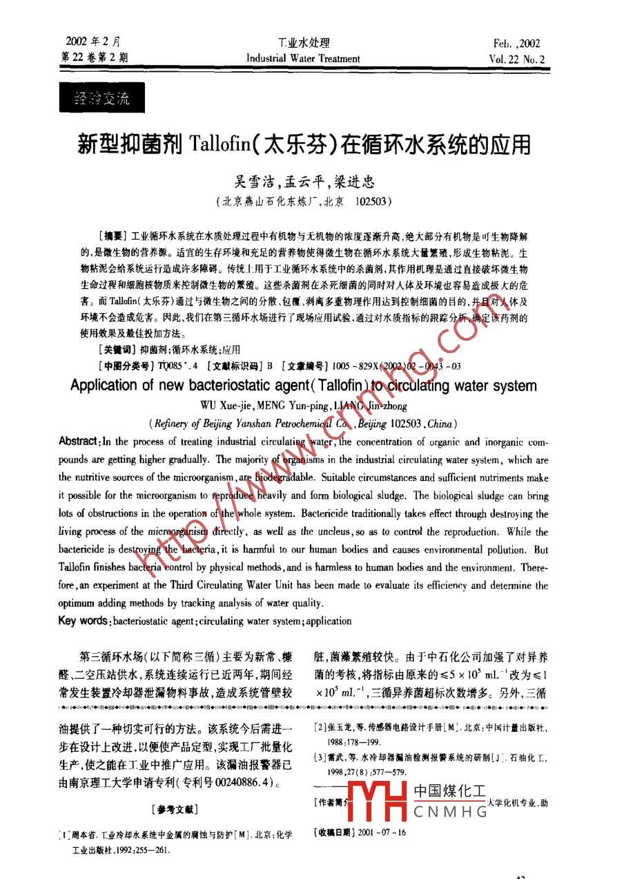 2002 年2月T業(yè)水處理Feb. ,2002第22卷第2期Industrial W alter TreatmentVol. 22 No.2經(jīng)驗交流新型抑菌劑Tallofin(太樂芬)在循環(huán)水系統(tǒng)的應(yīng)用吳雪潔,孟云平,梁進(jìn)忠(北京燕山石化東煉廠,北京102503)[摘要]工業(yè)循環(huán)水系統(tǒng)在水質(zhì)處理過程中有機物與無機物的濃度逐漸升高,絕大部分有機物是明生物降解的,是微生物的營養(yǎng)源。適宜的生存環(huán)境和充足的營養(yǎng)物使得微生物在循環(huán)水系統(tǒng)大量繁殖,形成生物粘泥。生物粘泥會給系統(tǒng)運行造成許多障礙。傳統(tǒng)l:用于工業(yè)循環(huán)水系統(tǒng)中的殺菌劑,其作用機理是通過直接破壞微生物生命過程和細(xì)胞核物質(zhì)來控制微生物的繁殖。這些殺菌劑在殺死細(xì)菌的同時對人體及環(huán)境也容易造成極大的危害:而Taloin(太樂芬)通過與微生物之間的分散、包覆、剝離多重物理作用達(dá)到控制細(xì)菌的目的,并且對人體及環(huán)境不會造成危害。因此.我們在第三循環(huán)水場進(jìn)行了現(xiàn)場應(yīng)用試驗.通過對水質(zhì)指標(biāo)的跟蹤分析.確定該藥劑的使用效果及最佳投加方法。[關(guān)鍵詞]抑菌劑;循環(huán)水系統(tǒng);應(yīng)用[中團分類號] T0085*.4 [文獻(xiàn)標(biāo)識碼]B [文章編號] 1005 -829X(2002)02 -0043 -03Application of new bacteriostatic agent( Tallofin)to circulating water systemWU Xue-jie , MENG Yun-ping, LIANG Jin-zhong(Refinery of Beijing Yanshan Petrochemical Co. , Bejing 102503 ,China)Abstract:In the process of treating industrial eirculaing water , the concentration of organie and inorganic com-pounds are gtting higher gradully. The majority of organisms in the industrial eirculating water system, which arethe nutritive sources of the microorganism, are biodegradable. Suitable circumstances and sufficient nutriments makeit possible for the miroorganism l0 reproduce heavily and form biological sludge. The biological sludge can bringlots of obstructions in the operation of the whole system. Bactericide traditinally lakes efect through destroying theliving process of the microorganism directly, as well as the uncleus, so as to control the reproduction. While thebactericide is destroying the bacleria, it is harmful to our human bodies and causes environmental pollution. ButTallofn finishes bacteria control by physical methods , and is harmless to human bodies and the environment. There-fore , an experiment at the Third Circulating Water Unit has been made to evaluate its eficiency and determine theoptimum adding methods by tracking analysis of water quality.Key words :baceriostatic agent;circulating water system;pplication第三循環(huán)水場(以下簡稱三循)主要為新常、楝臟,菌藻繁殖較快。由于中石化公司加強了對異養(yǎng)醛、二空壓站供水,系統(tǒng)連續(xù)運行已近兩年,期間經(jīng)菌的考核,將指標(biāo)由原來的≤5x10' mL"'改為≤1常發(fā)生裝置冷卻器泄漏物料事故,造成系統(tǒng)管壁較x10° ml.-I ,三循異養(yǎng)菌超標(biāo)次數(shù)增多。另外,三循|●制+1|1+[1l1I◆HI +l1+1+1+1號+10+1號1+|]1)1]|+| 1川+|1川川|◆11=1|+|+1|+1|◆1)◆+副+◆l:◆+|◆l國◆1+|◆+ +1判油提供了一-種切實可行的方法。該系統(tǒng)今后需進(jìn)一[2]張玉龍,等傳憾器電路設(shè)計手冊[ M].北京:中國計量出版社,步在設(shè)計上改進(jìn)以便使產(chǎn)品定型,實現(xiàn)工廠批量化1988:178-199.生產(chǎn).使之能在工業(yè)中推廣應(yīng)用。該漏油報警器已[3]雷武,等水冷卻器漏油檢測報警系統(tǒng)的研制[J].石油化L.1998 ,27(8) :577-579.由南京理工大學(xué)申請專利(專利號00240886. 4)。[作者簡中國煤化工大學(xué)化機專業(yè).助[參考文獻(xiàn)]YHCNMHGI周本省.工業(yè)冷卻水系統(tǒng)中金屬的腐蝕與防護[M].北京:化學(xué)[收稿日期] 2001 -07-16 .工業(yè)出版社199255-261.43 -工業(yè)水處理2002 -02 ,22(2)經(jīng)驗交流沖擊性投加非氧化性殺菌劑造成系統(tǒng)水質(zhì)不平穩(wěn),60 kg/d,每月沖擊性投加非氧化性殺菌劑2次,每置換水量較大,生產(chǎn)成本增加。針對這種情況,我們次500 kg.采用新型抑菌劑Tllolin(太樂芬)在三循進(jìn)行現(xiàn)場1.3 試驗數(shù)據(jù).應(yīng)用試驗。現(xiàn)場加藥及補水情況見表|,水質(zhì)分析見表2,Tllo是德國斯托克豪森公司開發(fā)的一-種新監(jiān)測換熱器試驗數(shù)據(jù)見表 3,掛片腐蝕數(shù)據(jù)見表4。-代全新機制的用于工業(yè)水處理和水循環(huán)過程中的表1現(xiàn)場加藥及補水粘泥和沉積物挖制劑。據(jù)介紹, Tllofio是從生物中時間補水量Tllofio投加量藥劑質(zhì)量濃度提取的復(fù)雜化合物,分子中含有很強表面活性的基/(kg.h')/(ag”)團和高吸附性能的基團。這種產(chǎn)品的作用機理與傳基礎(chǔ)投加3020統(tǒng)殺菌劑的作用機理完全不同,傳統(tǒng)殺菌劑是通過06-23-07-13連續(xù)投加30~40 ..20直接破壞徽生物的生命過程和細(xì)胞核物質(zhì),從而降07-14-40-50:0低其繁殖速度,而Tlofon則不同,它之所以能控制08-11和消除水系統(tǒng)的微生物滋生弊病是基于以下三種作從表2數(shù)據(jù)可以看出.投加Tlloion以后,各項用原理:水質(zhì)指標(biāo)均較平穩(wěn),異養(yǎng)菌數(shù)從10* ~10* mL‘降至(1)分散作用。Talofn的表面活性組分可以滲10~ 10* mL"',基本控制在指標(biāo)范圍內(nèi),后期受換透到單個細(xì)胞的細(xì)胞璧之間,從而破壞其致密結(jié)構(gòu),熱器泄漏或其他原因,濁度較高.在這種情況下仍能粘泥