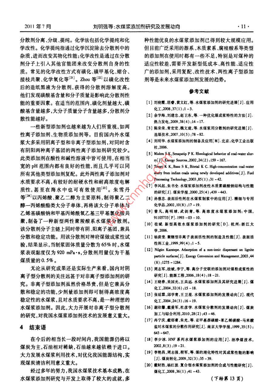 July 201I現(xiàn)代化工第3卷第7期Morem Chemical Industry2011年7月士水煤漿添加劑研究及發(fā)展動(dòng)向劉明強(qiáng),劉建忠,王傳成,高夫燕,王睿坤,周俊虎,岑可法浙江大學(xué)能源清潔利用國(guó)家重點(diǎn)實(shí)驗(yàn)室,浙江杭州310027摘要:簡(jiǎn)述了水煤漿技術(shù)在我國(guó)發(fā)展的背景及其基本性能分析了水煤漿分散劑和穩(wěn)定劑的作用機(jī)理及現(xiàn)在常用的添加劑種類和性能介紹了國(guó)內(nèi)外水煤漿添加劑的研究現(xiàn)狀和成果,重點(diǎn)闡述了復(fù)配、改性等新技術(shù)的應(yīng)用,以及兩性離子型等新型添加劑的開發(fā)情況結(jié)合前存在的些向題展望了裕加劑的發(fā)展趨勢(shì)。關(guān)鍵詞:水煤漿;添加劑;分散劑;穩(wěn)定劑中圖分類號(hào):TQ423;TQ536文獻(xiàn)標(biāo)識(shí)碼:A文章編號(hào):0253-4320(2011)07-0008-04Research and development of coal water slurry additivesLIU Ming-giang, LIU Jian-zhong, WANG Chuan-cheng, GAO Fu-yan, WANG Rui-kunZhou Jun-hu, CEN Ke-faState Key Laboratory of Clean Energy Utilization, Zhejiang University, Hangzhou 310027, China)Abstract: The development background of coal water slurry( CWS)and its basic performance are briefly reviewedThe mechanism of the Cws dispersants and stabilizers is analyzed in detail. Some commonly used additives and theirperformance are introduced as well. The research status and achievements of CWS at home and abroad are summarizedThe application of new technologies and the development of new additives such as amphoteric ionic additives are focusedThe development trends of the new additives are put forwards finally.Key words: coal water slurry; additive; dispersant; stabilizer煤炭作為一次能源消耗約占我國(guó)總能源消耗的表面性質(zhì),使煤顆粒能夠在水中分散使煤漿具有良72%左右,在相當(dāng)長(zhǎng)的時(shí)間內(nèi),我國(guó)的能源消費(fèi)結(jié)構(gòu)好的流動(dòng)性和穩(wěn)定性。根據(jù)作用不同,添加劑可分仍將以煤炭為主。由于傳統(tǒng)的燃煤方式存在環(huán)境污分散劑穩(wěn)定劑和輔助添加劑3類。分散劑是最染大燃料利用率低等問題,隨著構(gòu)建資源節(jié)約型、重要的水煤漿添加劑環(huán)境友好型社會(huì)目標(biāo)的提出,迫切需要一種清潔的煤炭利用方式。1分散劑的作用機(jī)理和分類水煤漿是一種高濃度煤水混合物,由質(zhì)量分?jǐn)?shù)1.1作用機(jī)理6%~70%的煤粉、30%~38%的水和約1%的添水煤漿分散劑是一種表面活性劑,由疏水基和加劑組成。它既保持了煤炭原有的一些特性,又具親水基2部分構(gòu)成。制漿時(shí)加入少量的分散劑可改有石油一樣的流動(dòng)性,并具有一定的穩(wěn)定性,可以貯變煤粒的表面性質(zhì),使煤粒表面被添加劑分子和水存、泵送、霧化與穩(wěn)定燃燒。水煤漿由于含硫率和粉化膜所包圍,讓煤粒均勻分散在水中,從而提高水煤塵量都較低,在燃燒過程中火焰溫度比油和煤粉低,漿的流動(dòng)性。分散劑的作用機(jī)理可從3個(gè)方面加以排放的污染物相對(duì)較少,是一種比較理想的代油潔解釋:潤(rùn)濕分散作用、靜電斥力分散作用及空間位阻凈燃料效應(yīng)。煤為疏水性物質(zhì),且煤漿中的煤粒很細(xì),具有很(1)分散劑一端是非極性的親油基,即疏水基大的比表面積容易自發(fā)地聚結(jié)因而煤粒與水不能另端是親水的極性基,即親水基。在水煤漿中分密切結(jié)合成為一種漿體,很容易產(chǎn)生煤水分離。良散劑分子的疏水基和煤表面結(jié)合,親水基朝水定向好的流變性和穩(wěn)定性是水煤漿最為重要的性能,要排列,把水分子吸附在煤粒表面形成一層水化膜使水煤漿具有良好的流體特性,加入化學(xué)添加劑必變疏水性為親水性。同時(shí)水化膜可將煤粒隔離開,不可少。水煤漿添加劑的主要作用在于改變煤粒的減少煤粒間的阻力,達(dá)到降黏的作用。收稿日期:2011-01-24;修回日期:2011-04-02作者簡(jiǎn)介:劉明強(qiáng)(1988-),男,碩士生,從事水煤漿添加劑方面研究1876813390,463591981@qcm;劉建忠(1965-)男博士教授博士生導(dǎo)師,主要從事煤高效清潔燃燒與轉(zhuǎn)化、燃燒源污染物形成與控制、新能源與可再生能源等方面的研究和教學(xué)工作,通訊聯(lián)系人,13605708085,jiu@zju.edu.cn.20ll年7月劉明強(qiáng)等:水煤漿添加劑研究及發(fā)展動(dòng)向(2)溶膠的經(jīng)典穩(wěn)定(DLVO)理論認(rèn)為,膠體顆Span80和壬基酚聚氧乙烯(30)醚NP-30與木質(zhì)素粒穩(wěn)定存在的先決條件是顆粒間的靜電斥力大于范磺酸鈉按2:3的質(zhì)量比復(fù)配制漿煤漿質(zhì)量分?jǐn)?shù)可德華引力。煤粒在很寬的pH范圍內(nèi)表面均帶負(fù)電達(dá)70%,表觀黏度990mPa…s,穩(wěn)定性大于20d荷。在水煤漿內(nèi)加人陰離子型分散劑可以提高煤粒(3)聚烯烴系列。使用這類分散劑制得的水煤表面的負(fù)電位值增強(qiáng)煤粒表面的靜電斥力,使煤粒漿黏度和穩(wěn)定性都很理想,用量約為干煤質(zhì)量的間不易接近,難以聚集,從而增強(qiáng)水煤漿的分散穩(wěn)0.5%,但價(jià)格昂貴,對(duì)煤種要求嚴(yán)格,一般多用于低定性。灰分煤種。實(shí)際應(yīng)用時(shí)需嚴(yán)格控制分子質(zhì)量及其分(3)水化膜中的水因受到表面電場(chǎng)的吸引而呈布否則會(huì)大大降低分散劑的功效。日本Limn公司定向排列。當(dāng)煤粒相互靠近時(shí),水化膜受擠壓變形,20世紀(jì)90年代初期開發(fā)