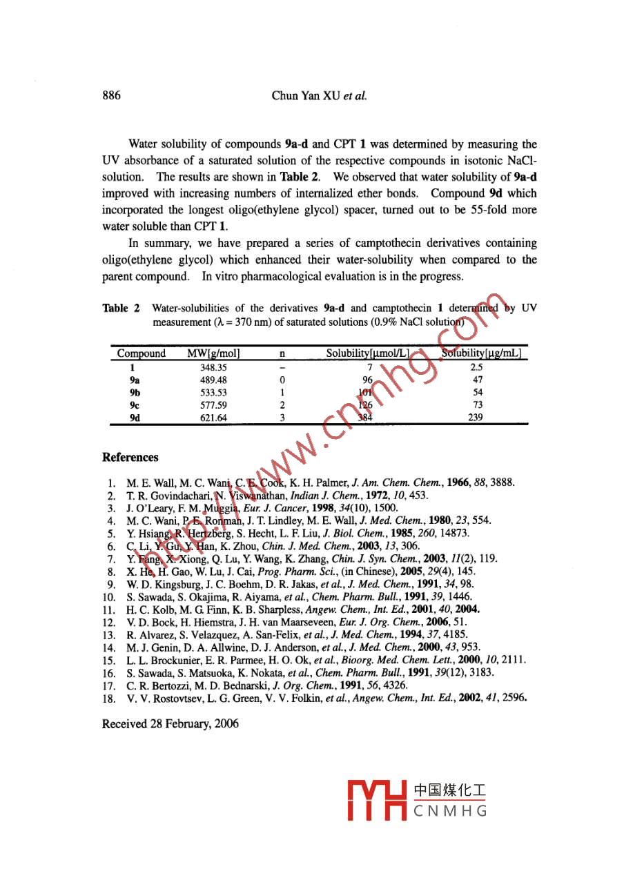 Chinese Chemical Letters Vol. 17, No.7, pp 883-886, 2006883http://www.imm.ac.cn/jouma/ccl.htmlAn Approach to New Water-soluble Oligo(ethylene glycol)Camptothecin Analogues by 1,3-Dipolar CycloadditionChun Yan XU*, Ming Zhi HUANGCollege of Materials Science and Technology, Beijing Uniersity of Chemical Technology,Beijing 100029Abstract: Combined with an effective copper-catalyzed triazole-forming reaction, a series of novelcamptothecin derivatives were synthesized. Incorporaing oligo(ethylene glycol) chains into thederivatives enhanced their water-solubility when compared to the parent compound (up to 55-fold).Keywords: Click chemistry, 20(S)-camptothecin, water-soluble derivatives.20(S)-Camptothecin (CPT) 1 (Figure 1) is an antitumor alkaloid which was first isolatedfrom the Chinese tree Camptotheca acuminata by Wall and coworkers in 1966' andlately also from the Indian tree Nothapodytes foetida by Govindachari and Viswanathan*.This alkaloid has showed significant inhibitory activity toward a variety of tumor typesboth in pre clinical and early phase I clinical studies'. However, poor solubility of CPT1 precluded its development as a clinical agent and the water-soluble sodiumcamptothecin 2 (Figure 1) demonstrated antitumor activity in animal models comparableto that of CPT 1, it was about 10-fold less potent with respect to therapeutic dosagerange* and severe toxicity of the salt to the bone marrow and bladder led to suspension ofthe clinical trials.In the late 1980s, the discovery that the primary cellular target for CPT 1 is DNAtopoisomerase r has created renewed interest in the compound. Therefore, manycamptothecin analogues through a number of approaches have been prepared to improvethe antitumor efficiency of the CPT family48. For example, topotecan 3' and irinotecan40 (Figure 1) have been successfully used in some countries for the treatment of ovarianand small-cell lung cancers and for colorectal cancer, respectively.At least 10additional CPT analogues are in various phases of clinical trials and the synthesis andidentification of new water soluble CPT analogues are still to be of great interest.1,3-Dipolar cycloaddition reactions are powerful methods for the preparation of avariety of cyclic compounds. It is well-known that the 1,3-dipolar cycloaddition of anazide with an alkyne leads to the formation of 1,2,3-tri中國煤化工/orkersdeveloped a copper (1)-catalyzed version, termnedCNMHGoceedsreadily at physiological temperatures and in richly functuonalizea blological environs.'E- mail: xucy0643@ 126.com884Chun Yan XU et al.Figure 1 Chemical structures of 20(S)-camptothecin 1, sodium camptothecin 2,topotecan 3 and irinotecan 4//1/HNaHO 0HO012N.HO、0、9/"Ho o1, 2, 3-Triazoles may display a wide range of biological activity, such as anti-HIV'5 andantimicrobial agents'4, as well as selective β3 adrenergic receptor agonists'We are conducting a study on chemical modification of CPT 1 as a starting materialto obtain more water-soluble and less toxic derivatives. In this report we described thesynthesis of derivatives of 10-hydroxycamptothecin bearing 1, 2, 3-triazoles with intactlactone ring which is believed to be essential for the antitumor activity.The synthetic route is outlined in Scheme 1. 5 and 6 were prepared according tothe literaturel6. The hydroxyl group of 6 was converted into a propargyl ether usingK2CO3 and propargyl bromide to afford the required alkyne 7 for click reaction. Weassumed that employing linkers with an oligo(ethylene glyco) backbone would enhancethe water solubility of the camptothecins. With azides 8a-d in hand'", we next tried toincorporated them with 7 to form oligo(ethylene glycol) camptothecins 9a-d for furtherbioassay studies. Our first attempt of click chemistry was carried out by treatment of 7with 8a using Cul/TEA as catalyst in CHzCN at r.t. for 48 h (entry 1, Table 1). Nreaction took place. However, when the reaction was stirred for 12 h under theconditions of CuSO,/Sodium ascorbate in t-BuOHx8, 9a was obtained in 30% yield (entry2, Table 1). To optimize the reaction conditions, the effect ratio of alkyne/azide/catalyst and solvents were studied. As showed in Table 1, the reaction gives asatisfactory yield in the ratio of 1:1.25:0.1 in 1:1 H2O: DMF. Under very similarconditions, the other azides 8b d underwent click chermistry to yield corresponding 1,2,3-triazoles 9b-d in 70%-77%. All compounds were characterized and identified by IR, H,'3C and ESI-MS as well as elemental analysis,中國煤化工ement withthe proposed structures. The representativeollows: 'HMHCNMHG2H,J=42NMR (400MHz, CDCl3, δ ppm): 0.95 (t, 3H, J= 7.J.1),1.0 (4ll, ,Hz), 3.66(t, 2H, J= 4.2 Hz), 3.85(, 2H, J= 4.8 Hz), 4.54(1, 2H, J= 4.8 Hz), 5.13(, 2H),5.18(s, 2H), 5.24(s, 2H), 7.20(s, 1H), 7.34(d, 1H, J= 2.4 Hz), 7.52(dd, 1H, J= 9.2, 2.4Hz), .An Approach to New Water-soluble Oligo(ethylene glycol) Camptothecin 885AnaloguesScheme 1 Synthesis of compounds 9a-dHO、0HCHO oHO6= 0./"OH 0n=0,1,23to~OH9a-d8a-d N3n=0,1,2,3(a) H2O2, HAc, 61%; (b) H2SO4 H2O, Hv, 54%; (c) Propargyl bromide, K2CO3, DMAc, 62%; (d)8a-d, CuSO/Sodium ascorbate, H2O/DMF7.86(s, 1H), 7.98(d, 1H, J= 9.2), 8.13(s, 1H); BC NMR (400MHz, CDCI], δ, ppm): 6.81,28.68, 30.60, 49.06, 49.41, 60.63, 61.29, 65.31, 68.21, 71.77, 96.47, 105.83, 117.10,122.67, 123.18, 128.08, 128.33, 128.61, 130.22, 142.28, 144.09, 145.56, 149.20, 149.27,156.41, 156.61, 172.90; ESI-MS found m/z 534.25[M+1]*, 534.53 (calcd).Table 1 Reaction conditions and resultsEntryAlkyne(eq,)Azide(eq.)Catalyst system(eq.)solventYield(%)7(1)8a(2)CuI (0.05)/TEA(1.0)CHzCNNo reaction8a (2)CuSO4 (0.05)/pyidineSodium ascorbate (0.1)CuSOs (0.05)/H20/1-BuOH2:CuSO4 (0.05)11:1 H2O:DMF545CuSO4 (0.1)11:1 H20:DMF84Sodium ascorbate (0.2)8a (1)78a(1.25)CuSO, (0.1)1/838b (1.25)8c (1.25)中國煤化工0Sodium ascorbate (88d (1.25)YHCNMHG7Sodium ascorbate (0.2886Chun Yan XU et al.Water solubility of compounds 9a-d and CPT 1 was determined by measuring theUV absorbance of a