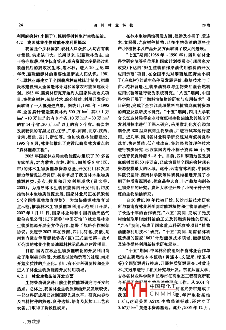 第28卷第6期四川林業(yè)科技2007年12月Journal of Sichuan Forestry Science and Technolog林業(yè)生物質(zhì)能及其研發(fā)進(jìn)展費世民1,錢能志2,陳秀明,蔡小虎1,何亞平,徐嘉13(1.四川省林業(yè)科學(xué)研究院,四川成都610081;2國家林業(yè)局生物質(zhì)能源辦公室,北京1007143四川農(nóng)業(yè)大學(xué),四川雅安625014)擴(kuò)要:本文概逑了生物質(zhì)能源的相關(guān)概念及其分類,提出了林業(yè)生物質(zhì)能源的概念及其類別,詳蟈綜述了國內(nèi)外林業(yè)生物質(zhì)能源研發(fā)進(jìn)展,對推動目前林業(yè)生物質(zhì)能源開發(fā)利用具有重要意義。關(guān)鍵詞:生物質(zhì);生物質(zhì)能源;林業(yè)生物質(zhì);林業(yè)生物質(zhì)能源;研發(fā)中圖分類號:S7932文獻(xiàn)標(biāo)識碼:A文章編號:1003-5508(2007)06-0018-09Advances in Researches and exploitationof Forestry Bio-energy ResourcesFEI Shi-min QIAN Neng-zhi Chen Xiu-mingCAI Xiao-hu HE Ya-ping XU Jia,3(1. Sichuan Academy of Forestry, Chengdu, 610081: 2. National Bureau of Forestry, Beijing, 10007143. Sichuan Agricultural University, Ya-an, 625014)Abstract: In this article, a summary description is given of the related concepts and the classification ofthe bio-energy resources. The concepts and the category of the forestry bio-energy resources are put forward, and advances in researches and exploitation of the forestry bio-energy resources in domestic and a-broad are summed up in detail, theerefore having a great significance to exploiting and using the forestryKey words: Biomass, Bio-energy resource, Forestry biomass, Forestry bio-energy resource, Researches andExploitation有把“樹木整體及其一部分加工以后形成的物質(zhì)”等作為生物質(zhì)定義的,故而沒有嚴(yán)格的定義。根據(jù)1生物質(zhì)和生物質(zhì)能能量資源的觀點,采用“一定積累量的動植物資源和來源于動植物的廢棄物的總稱(但不包括化石資生物質(zhì)( Biomass=bi+mass)原本是生態(tài)學(xué)上源)”作為生物質(zhì)的定義。直到20世紀(jì)末,生物質(zhì)用來表示生物量(即生物現(xiàn)存量)的專業(yè)詞匯,生物才作為一個專門概念提出和開始進(jìn)行系統(tǒng)的產(chǎn)業(yè)化質(zhì)超越生態(tài)學(xué)用語范圍,變成含有“作為能源的生開發(fā),因而在提出的角度、概念和內(nèi)涵上不盡一致。物資源”意義是在石油危機(jī)以后,由于當(dāng)時大力提般認(rèn)為,生物質(zhì)( biomass9主要是指可再生或循環(huán)倡替代能源,生物質(zhì)的定義也變成“蓄有太陽能的的有機(jī)物質(zhì),包括農(nóng)作物、樹木和其他植物及其殘體各種生物體的總稱”,“用質(zhì)量或能量表示的生物體(re目前學(xué)術(shù)上比較認(rèn)可的生物質(zhì),主要是的量,或可以看作是能源或工業(yè)原料的生物體”,也指中國煤化工中CO2,把太陽光能CNMHG收稿日期:20070731基金項目:“十一五”國家科技支撐項目“西南地區(qū)麻瘋樹良種選育及規(guī)?;嘤C合利用關(guān)鍵技術(shù)研究與示范作者簡介:費世民(196-),男,博士,研究員,從事生物能源及森林生態(tài)等研究。費世民,等:林業(yè)生物質(zhì)能及其研發(fā)進(jìn)展轉(zhuǎn)變成化學(xué)能并以(CH2O)n(碳水化合物)形式存產(chǎn)品形態(tài)可分為氣體、液體和固體燃料等;按行業(yè)可儲的有機(jī)物質(zhì)。生物質(zhì)具有可再生性,生物質(zhì)資源分為林業(yè)生物質(zhì)能源農(nóng)業(yè)生物質(zhì)能源、畜牧業(yè)生物極其豐富世界上每年生物質(zhì)產(chǎn)量約1460億t。質(zhì)能源等,但目前尚未有正式的定義。生物質(zhì)能( Biomass energ或 bio-energ)是以生2.1生物生態(tài)學(xué)上的生物質(zhì)分類物質(zhì)為載體的能量或從生物質(zhì)獲得的能量,是人類根據(jù)地球生態(tài)循環(huán)系統(tǒng)中的生存狀態(tài),一般分使用的最古老的能源。但常見到“生物能”、“生物為:生產(chǎn)者為植物,大型消費者(攝食營養(yǎng)者)為動質(zhì)能”等混雜使用來表示這一相同含義,聯(lián)合國糧物微型消費者(腐生營養(yǎng)者)為微生物。這種分類農(nóng)組織(FAO)現(xiàn)在以“生物能”代替“生物質(zhì)能”。不涉及對生物質(zhì)能源的利用。根據(jù)物種生物形態(tài)分通過光合作用,綠色植物和海洋藻類每年可貯存6為陸生生物質(zhì)包括林業(yè)生物質(zhì)農(nóng)業(yè)生物質(zhì),水生生1017kcal的能量,其有效利用率約為入射太陽能物質(zhì)及廢棄物生物質(zhì)。的0.1%,合成的有機(jī)物(生物質(zhì))約2200億t(折陸生生物質(zhì):包括糖質(zhì)類(甘蔗、甜菜、甜高粱合1100億t標(biāo)準(zhǔn)煤),相當(dāng)于人類當(dāng)前每年全部能等)淀粉類(玉米木薯、紅薯等含淀粉類農(nóng)作物和耗的10倍。櫟、栗類等含淀粉類樹種)、纖維類(農(nóng)林植物)、烴生物質(zhì)能源( Biomass energy resource或 bio-en-類(桉樹、青珊瑚等)和油脂類(油菜、大豆、麻瘋樹ergy resource是指直接或間接來源于生物質(zhì)的能油桐等)??赏ㄟ^各種不同的轉(zhuǎn)化途徑,將這些取之不盡、水生生物質(zhì):包括淡水類、海洋類和微生物類用之不竭的生物質(zhì)能量轉(zhuǎn)化為電、熱以及其它各種(如綠藻、光合細(xì)菌等)。形式的能源。其中包括木材、薪柴及森林工業(yè)廢棄廢棄物生物質(zhì):包括農(nóng)業(yè)廢棄物(麩皮、秸稈、物,農(nóng)林作物,尤其是為了生產(chǎn)能源而種植的能源植食品加