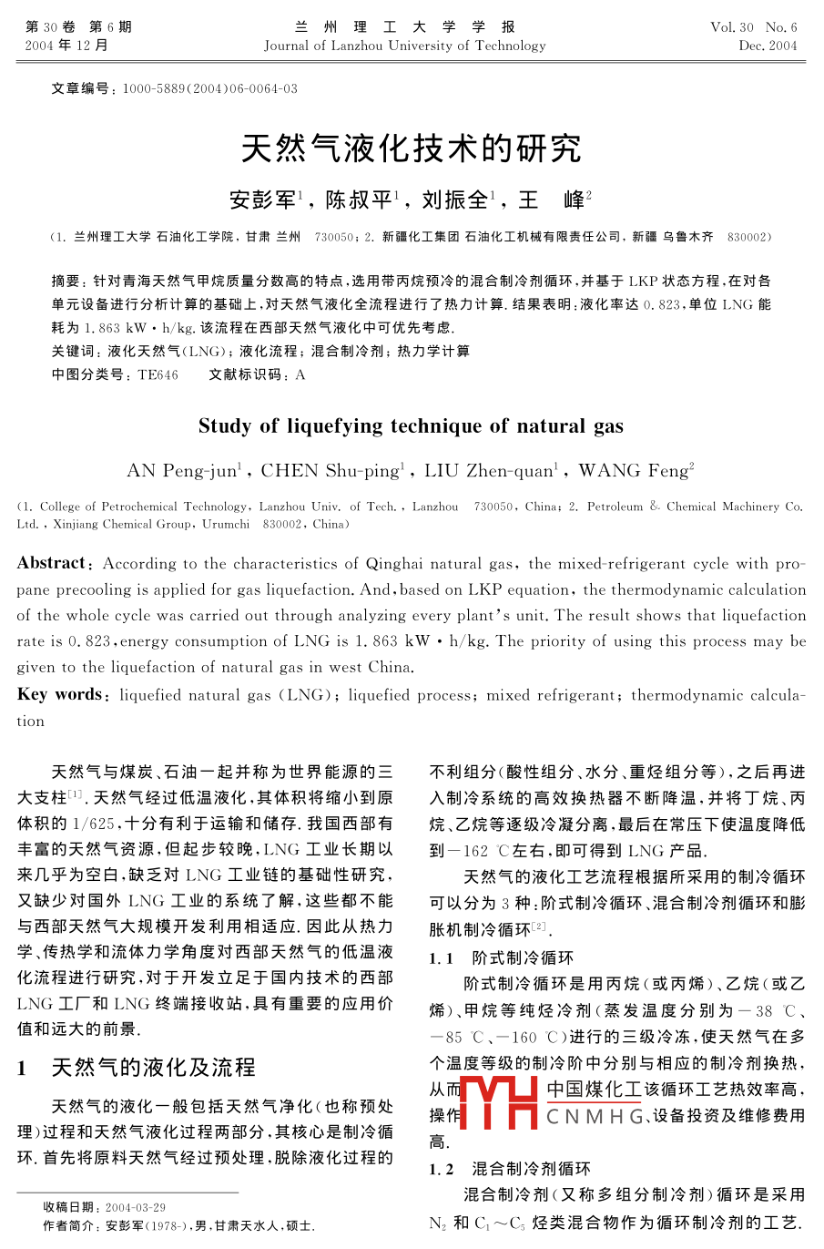 第30卷第6期蘭州理工大學(xué)學(xué)報(bào)Vol 30 No 62004年12月Journal of Lanzhou University of TechnologyDec.2004文章編號(hào):1000-5889(2004)06-0064-03天然氣液化技術(shù)的研究安彭軍1,陳叔平,劉振全1,王峰1.蘭州理工大學(xué)石油化工學(xué)院,甘肅蘭州730050;2.新疆化工集團(tuán)石油化工機(jī)械有限責(zé)任公司,新疆烏魯木齊830002)摘要:針對(duì)青海天然氣甲烷質(zhì)量分?jǐn)?shù)高的特點(diǎn),選用帶丙烷預(yù)冷的混合制冷劑循環(huán),并基于LKP狀態(tài)方程,在對(duì)各單元設(shè)備進(jìn)行分析計(jì)算的基礎(chǔ)上,對(duì)天然氣液化全流程進(jìn)行了熱力計(jì)箅.結(jié)果表明:液化率達(dá)0.823,單位LNG能耗為1.863kW·h/kg.該流程在西部天然氣液化中可優(yōu)先考慮關(guān)鍵詞:液化天然氣(ⅠNG);液化流程;混合制冷劑;熱力學(xué)計(jì)算中圖分類號(hào):TE646文獻(xiàn)標(biāo)識(shí)碼:AStudy of liquefying technique of natural gasAN Peng-jun, CHEN Shu-ping, LiU Zhen-quan, WANG Feng(1. College of Petrochemical Technology, Lanzhou Univ. of Tech, Lanzhou 730050, China: 2. Petroleum &. Chemical Machinery Co.Ltd, Xinjiang Chemical Group, Urumchi 830002, China)Abstract: According to the characteristics of Qinghai natural gas, the mixed-refrigerant cycle with pro-pane precooling is applied for gas liquefaction. And, based on LKP equation, the thermodynamic calculationof the whole cycle was carried out through analyzing every plant,s unit The result shows that liquefactionrate is 0. 823, energy consumption of LNG is 1. 863kw. h/kg. The priority of using this process may begiven to the liquefaction of natural gas in west China.Key words: liquefied natural gas(LNG); liquefied process; mixed refrigerant; thermodynamic calculation天然氣與煤炭、石油一起并稱為世界能源的三不利組分(酸性組分、水分、重?zé)N組分等),之后再進(jìn)大支柱η.天然氣經(jīng)過低溫液化,其體積將縮小到原入制冷系統(tǒng)的高效換熱器不斷降溫,并將丁烷、丙體積的1/625,十分有利于運(yùn)輸和儲(chǔ)存.我國西部有烷、乙烷等逐級(jí)冷凝分離,最后在常壓下使溫度降低豐富的天然氣資源,但起步較晚,LNG工業(yè)長(zhǎng)期以到一162C左右,即可得到LNG產(chǎn)品來幾乎為空白,缺乏對(duì)LNG工業(yè)鏈的基礎(chǔ)性研究,天然氣旳液化工藝流程根據(jù)所采用的制冷循環(huán)又缺少對(duì)國外LNG工業(yè)的系統(tǒng)了解,這些都不能可以分為3種:階式制冷循環(huán)混合制冷劑循環(huán)和膨與西部天然氣大規(guī)模開發(fā)利用相適應(yīng).因此從熱力脹機(jī)制冷循環(huán)」學(xué)、傳熱學(xué)和流體力學(xué)角度對(duì)西部天然氣的低溫液1.1階式制冷循環(huán)化流程進(jìn)行研究,對(duì)于開發(fā)立足于國內(nèi)技術(shù)的西部階式制冷循環(huán)是用丙烷(或丙烯)、乙烷(或乙LNG工廠和LNG終端接收站,具有重要的應(yīng)用價(jià)烯)、甲烷等純烴冷劑(蒸發(fā)溫度分別為-38℃值和遠(yuǎn)大的前景85℃、-160℃)進(jìn)行的三級(jí)冷凍,使天然氣在多1天然氣的液化及流程個(gè)溫度等級(jí)的制冷階中分別與相應(yīng)的制冷劑換熱,從中國煤化工該循環(huán)工藝熱效率高,天然氣的液化一般包括天然氣凈化(也稱預(yù)處操作CNMHG、設(shè)備投資及維修費(fèi)用理)過程和天然氣液化過程兩部分,其核心是制冷循高環(huán).首先將原料天然氣經(jīng)過預(yù)處理,脫除液化過程的1.2混合制冷劑循環(huán)混合制冷劑(又稱多組分制冷劑)循環(huán)是采用收稿日期:2004-03-29作者簡(jiǎn)介:安彭軍(1978-),男,甘肅天水人,碩士N2和C1~C3烴類混合物作為循環(huán)制冷劑的工藝第6期安彭軍等:天然氣液化技術(shù)的研究65混合制冷劑的制冷原理與純組分制冷劑的制冷原理3膨脹機(jī)制冷循環(huán)大致相同,即都是通過冷劑液體的汽化,并與被冷介以膨脹機(jī)制冷循環(huán)為基礎(chǔ)的天然氣液化工藝流質(zhì)進(jìn)行熱交換使其降溫.與純組分制冷劑不同的是,程是通過采用透平膨脹杋進(jìn)行等熵膨脹而達(dá)到降溫混合制冷劑產(chǎn)生的冷量是在一個(gè)連續(xù)的溫度范圍之目的的過程.根據(jù)進(jìn)入膨脹機(jī)的介質(zhì)的不同,膨脹機(jī)內(nèi),純組分冷劑產(chǎn)生的冷量是在一個(gè)固定的溫度上.制冷循環(huán)分為2種混合制冷劑制冷循環(huán)工藝流程的特點(diǎn)是在制冷循環(huán)1)天然氣膨脹機(jī)工藝是采用天然氣膨脹制冷中采用混合制冷劑,其加熱曲線可與被冷卻介質(zhì)的的循環(huán),又稱開式膨脹機(jī)循環(huán)冷卻曲線很好地匹配,有效地增加了兩者的一致性2)循環(huán)膨脹機(jī)工藝是采用氮(或氮甲烷混合可見,混合制冷劑制冷循環(huán)即保留了階式制冷循環(huán)物)膨脹制冷(閉式)的工藝流程.的優(yōu)點(diǎn),而且只用了一臺(tái)壓縮機(jī),使流程大大簡(jiǎn)化降低了造價(jià)2工藝流程混合制冷劑工藝可以分為全混合制冷劑工藝選用丙烷預(yù)冷的混合冷劑液化循環(huán)(見圖1)(FMR)和預(yù)冷十混合制冷劑工藝.目前有多家公司原料天然氣經(jīng)由燃?xì)庖鎺?dòng)的壓縮機(jī)兩級(jí)壓縮,開發(fā)出了各具特色丙烷預(yù)冷的混合制冷劑循環(huán)工藝經(jīng)冷卻后,通過MEA單元除去酸性組分(CO2、硫(APCⅠ公司的C3/ MCRTM工藝、 TECHNIP公司組分等),然后進(jìn)入分子篩干燥系統(tǒng)進(jìn)行深度脫水的 Tealarc工藝、 JF Prichard8Co.的 PRICO工藝、(水
