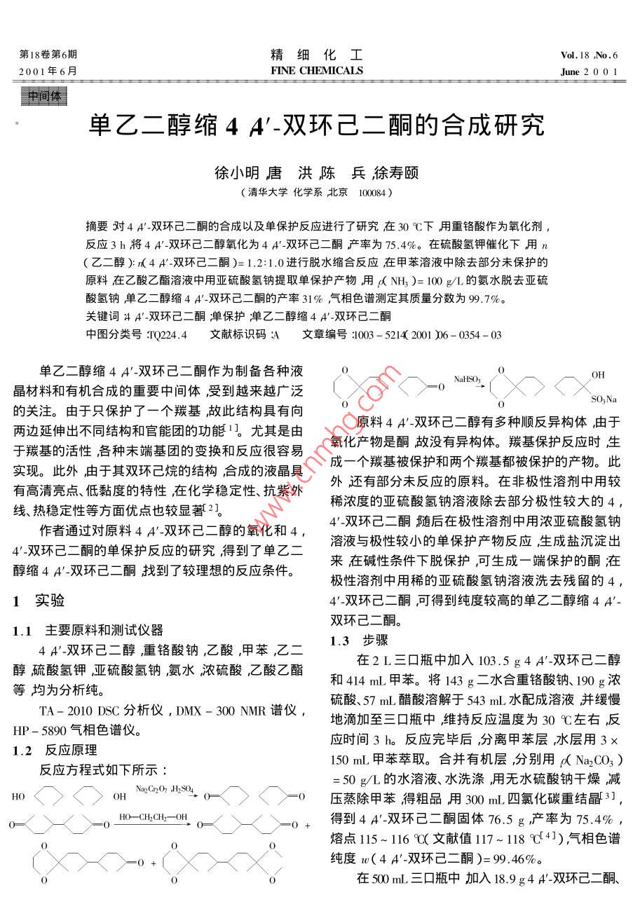 第18卷第6期精細(xì)化工Vol 18. No 62001年6月FINE CHEMICALSJune 200 I單乙二醇縮4A′雙環(huán)己二酮的合成研究徐小明唐洪陳兵徐壽頤(清華大學(xué)化學(xué)系北京100084)摘要對(duì)4A′雙環(huán)己二酮的合成以及單保護(hù)反應(yīng)進(jìn)行了研究在30℃下用重鉻酸作為氧化劑,反應(yīng)3h將44-雙環(huán)己二醇氧化為44′-雙環(huán)己二酮產(chǎn)率為75.4%。在硫酸氫鉀催化下用n乙二醇)κ4A雙環(huán)己二酮)=1.2:1.0進(jìn)行脫水縮合反應(yīng)在甲苯溶液中除去部分未保護(hù)的原料在乙酸乙酯溶液中用亞硫酸氫鈉提取單保護(hù)產(chǎn)物用NH3)=100g/L的氨水脫去亞硫酸氫鈉單乙二醇縮4A雙環(huán)己二酮的產(chǎn)率31%氣相色譜測定其質(zhì)量分?jǐn)?shù)為99.7%。關(guān)鍵詞斗μ雙環(huán)己二酮單保護(hù)憚乙二醇縮4A′-雙環(huán)己二酮中圖分類號(hào)Q24.4文獻(xiàn)標(biāo)識(shí)碼文章編號(hào):003-52142001)6-0354-03單乙二醇縮4A-雙環(huán)己二酮作為制備各種液NaHSO3晶材料和有機(jī)合成的重要中間體受到越來越廣泛的關(guān)注。由于只保護(hù)了一個(gè)羰基故此結(jié)構(gòu)具有向0兩邊延伸出不同結(jié)構(gòu)和官能團(tuán)的功能1。尤其是由原料44′-雙環(huán)己二醇有多種順反異構(gòu)體由于于羰基的活性各種未端基團(tuán)的變換和反應(yīng)很容易氧化產(chǎn)物是酮故沒有異構(gòu)體。羰基保護(hù)反應(yīng)時(shí)生實(shí)現(xiàn)。此外由于其雙環(huán)己烷的結(jié)構(gòu)合成的液晶鳯成一個(gè)羰基被保護(hù)和兩個(gè)羰基都被保護(hù)的產(chǎn)物。此有高清亮點(diǎn)、低黏度的特性在化學(xué)穩(wěn)定性、抗紫外外還有部分未反應(yīng)的原料。在非極性溶劑中用較線、熱穩(wěn)定性等方面優(yōu)點(diǎn)也較顯蓍2桸濃度的亞硫酸氫鈉溶液除去部分極性較大的44′雙環(huán)己二酮葹后在極性溶劑中用濃亞硫酸氫鈉作者通過對(duì)原料4A′-雙環(huán)己二醇的氧化和4,溶液與極性較小的單保護(hù)產(chǎn)物反應(yīng)生成鹽沉淀出4′雙環(huán)己二酮的單保護(hù)反應(yīng)的研究得到了單乙二醇縮44′-雙環(huán)己二酮找到了較理想的反應(yīng)條件。來在堿性條件下脫保護(hù)可生成一端保護(hù)的酮在極性溶劑中用稀的亞硫酸氬鈉溶液洗去殘留的4,1實(shí)驗(yàn)4′雙環(huán)己二酮,可得到純度較高的單乙二醇縮4A1.1主要原料和測試儀器雙環(huán)己二酮。4μ-雙環(huán)己二醇,重鉻酸鈉,乙酸,甲苯,乙二1.3步驟醇硫酸氫鉀亞硫酸氬鈉,氨水濃硫酸乙酸乙酯在2L三口瓶中加入103.5g4A′雙環(huán)己二醇等均為分析純。和414m甲苯。將143g二水合重鉻酸鈉、190g濃硫酸、57μL醋酸溶解于543mL水配成溶液并緩慢TA-2010DSC分析儀,DMX-300MMR譜儀,地滴加至三囗瓶中維持反應(yīng)溫度為30℃左右反HP-5890氣相色譜儀1.2反應(yīng)原理應(yīng)時(shí)間3h。反應(yīng)完畢后分離甲苯層水層用3反應(yīng)方程式如下所示150mL甲苯萃取。合并有機(jī)層分別用NaCO3)50g/L的水溶液、水洗滌用無水硫酸鈉干燥減OH Na2 Cr2O,H2>0壓蒸除甲苯得粗品用300m四氯化碳重結(jié)晶3],O一CH2CH2-OH得到44′-雙環(huán)己二酮固體76.5g產(chǎn)率為75.4%o=0+熔點(diǎn)115~116(文獻(xiàn)值117~118%41),氣相色譜純度v(4A-雙環(huán)己二酮)=99.46%。在500m三口瓶中加入18.9g44-雙環(huán)己二酮、第6期徐小明等憚乙二醇縮4A′-雙環(huán)己二酮的合成研究3550.05g硫酸氫鉀、7.2g乙二醇和97m甲苯。加熱回2.3保護(hù)反應(yīng)過程中各產(chǎn)物含量變化流3h將40g亞硫酸氫鈉的8m水溶液加入上述表2中列出了反應(yīng)過程中各個(gè)階段各種反應(yīng)產(chǎn)反應(yīng)液中維持反應(yīng)溫度25~30℃攪拌0.5h濾除物含量的變化。固體棄去分離出濾液中的有機(jī)層并蒸干加入110mL乙酸乙酯攪拌使固體溶解。將10.5g亞硫酸氫鈉表2各階段產(chǎn)物氣相色譜含量的變化的丌0mL水溶液加入上述乙酸乙酯溶液中維持反應(yīng)溫a(4A-雙環(huán)(44雙環(huán)己二酮的n(44-雙環(huán)己二酮的己二酮y%單保護(hù)產(chǎn)物y%保護(hù)產(chǎn)物y度25~30℃攪拌0.5h過濾出固體并用3×30mL脫水反應(yīng)剛結(jié)束時(shí)4乙酸乙酯溶液洗滌濾餅。將濾餅加入到152mL,N第一次洗后劉ANH3)=100g/L的氨水中攪拌0.5h加入75m甲075gMH為洗后苯繼續(xù)攪拌0.5h。分離出有機(jī)層水層用3×40mL由表2可見在非極性溶劑甲苯中由于44-雙甲苯萃取。合并有機(jī)相用NHBO)=40g1L的亞硫環(huán)己二酮極性較大更傾向于與亞硫酸氫鈉反應(yīng)而酸氫鈉水溶液和水洗滌用無水硫酸鈉干燥蒸除溶單保護(hù)產(chǎn)物則相對(duì)穩(wěn)定。在極性較大溶劑乙酸乙酯劑得粗品8g用0n油醚和20mdZ酸乙酯的中極性較小的單保護(hù)產(chǎn)物則更容易與水層中的亞混合洛劑重結(jié)晶得無色晶體2g產(chǎn)率31%烙點(diǎn)1D硫酸氫鈉反應(yīng)生成羰基加成物。1B8文獻(xiàn)值104)氣相色譜純度單乙二醇2.4溫度對(duì)氧化反應(yīng)的影響縮44雙環(huán)己二酮)=99.7%在不同的溫度下進(jìn)行氧化反應(yīng)得到不同的收2結(jié)果與討論率因而選擇合適的反應(yīng)溫度是很重要的。表3列出了在不同反應(yīng)溫度下4A雙環(huán)己二酮的收率。2.1單乙二醇縮4A′-雙環(huán)己二酮的結(jié)構(gòu)鑒定表3不同反應(yīng)溫度下44-雙環(huán)己二酮的收率在樣品的 IHNMR圖中,δ=3.96處的單峰歸屬t/