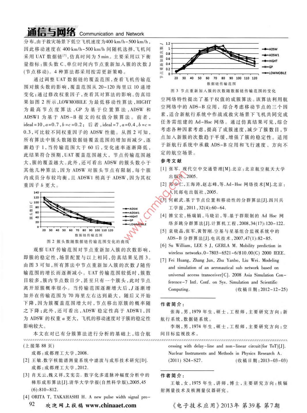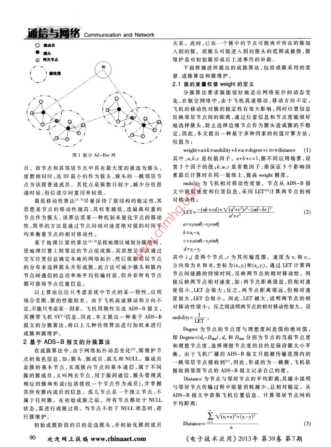 a Communication and Network基于ADS-B報文的航空自組網(wǎng)分簇算法張海',李綱,陳廣曉2,李靜林2(1.空軍裝備研究院雷達與電子對抗研究所,北京100876;2.北京郵電大學網(wǎng)絡與交換技術國家重點實驗室,北京100876)摘要∶在大規(guī)模Ad-loc網(wǎng)絡中,有效的層次架構(gòu)是實現(xiàn)路由和資源管理的關鍵技術。針對航空網(wǎng)絡中因飛機數(shù)量增加、網(wǎng)絡規(guī)模増大而導致網(wǎng)絡中飛機通信質(zhì)量下降的問題,提出了一種基于ADS-B報文的航空Ad-Hoc網(wǎng)絡分簇算法。該算法利用ADS-B報文提供的飛機速度、位置信息、連同節(jié)點度,進行簇的形成和維護。設計了大量的仿真實驗,結(jié)果表明該算法可以減少簇的個數(shù)和節(jié)點切換率,從而有效提高了簇的穩(wěn)定性和航空通信的效率。關鍵詞:航空電信網(wǎng);ADS-B;Ad-Hoc;分簇算法中圖分類號:TM929.5文獻標識碼:A文章編號:0258-7998(2013)07-0089-04An ADS-B based clustering algorithm in aviation Ad-Hoc networksLi jinglin(1. Radar and EW Institute, Equipment Academy of Air Force, Beijing 100876,China2. Beijing University of Posts and Telecommunications, State Key Laboratory of Networking andSwitching Technology, Beijing 100876, ChinaAbstract: An effective architecture is the key technology of routing and resource managing in large Ad-Hoc networks. In theaviation network, the quality of communication between aircrafts declines with the increasing number of aircrafts.Todeal with thisproblem, an ADS-B message based novel clustering algorithm is presented for aviation Ad-Hoc networks. The piuses the mobility and location of aircraft, provided by ADS-B messages and node degree for cluster formation and maintenanceSome simulations are performed and the results indicate that the proposed algorithm can lower the number of clusters and the rateof switching nodes, and it can effectively improve the cluster stability and efficiency of aeronautical communicationsKey words: aeronautical telecommunication network: ADS-B: Ad-Hoc: clusterADS-B技術是未來航空監(jiān)視的主要手段之一,它點競爭有限的無線信道,增加了發(fā)生碰撞的概率。為減以地空/空空數(shù)據(jù)鏈為通信手段,以導航系統(tǒng)及其他機少共享相冋信道的節(jié)點數(shù)目、降低碰撞概率、提高信道載設備產(chǎn)生的信息為數(shù)據(jù)源,由具有ADS-B功能的飛利用率須對移動節(jié)點進行分簇14,以提高通信質(zhì)量。機將自身的位置、速度等SV( State Vector)信息周期性對本文提出了一種基于ADS-B報文,綜合移動性、位外廣播,地面站和其他飛機接收這些報文,進行飛機間置、節(jié)點度特點,采用權值進行評估的分簇算法的通信和監(jiān)控。圖1為航空Ad-Hoc網(wǎng),簇內(nèi)飛機可直接通信,簇間隨著飛機性能和數(shù)量的提高,ADS-B應用不斷升級,飛機通過網(wǎng)關通信,相隔太遠的簇對其覆蓋范圍有了更高要求。移動自組網(wǎng)(Ad-Hoc)技術能通信,為增強信道利用率,通過簇頭將信息轉(zhuǎn)發(fā)給基站有效解決這一問題。Ad-Hoc是一種自組織的無線多跳網(wǎng),1傳統(tǒng)分簇算法組網(wǎng)無需固定路由器,所有節(jié)點均移動,并能以任意方式目前存在很多分簇算法,算法直接影響簇的穩(wěn)定動態(tài)地與其他節(jié)點保持聯(lián)系。在航空Ad-Hoc網(wǎng)絡中,由性、大小以及節(jié)點擔任簇頭的時間,從而影響生成簇和于數(shù)據(jù)鏈覆蓋范圍有限導致兩個無法通信的飛機可借助維護簇所需開銷12-51。其他節(jié)點轉(zhuǎn)發(fā)進行通信,擴大了ADS-B的覆蓋范圍最大連接度算法1盡可能減少了路由器的數(shù)目。其由于Ad-Hoc采用共享無線信道方式工作,過多節(jié)思想是,節(jié)點間通過交換控制信息得到鄰居節(jié)點的數(shù)《電子技術應用》2013年第39卷第7期通信與網(wǎng)絡Communication and NetworkO簇成員關系。此時,已在一個簇中的節(jié)點可能離開所在的簇加簇頭入別的簇,而簇頭可能進入別的簇頭的范圍或被毀,簇⊙網(wǎng)關節(jié)點維護是對初始簇形成后上述事件的補救。下面將描述所提出的成簇算法,包括成簇采用的度1簇范圍量、成簇算法和簇維護。2.1簇的度量權值 weight的定義分簇算法要求簇能很好地適應網(wǎng)絡拓撲的動態(tài)變化,在航空網(wǎng)絡中,由于飛機高速移動,移動方向不定08地選擇族頭防止選擇邊緣節(jié)點作為族頭造成的不穩(wěn)飛機的移動性對簇的穩(wěn)定性有很大影響。同時位置信息反映鄰居節(jié)點間的距離,通過位置信息和節(jié)點度能很好定。因此,本文提出一種基于多種因素的權值計算方法,權值為weight=axk x mobility +6 xwxdegree+cxrxdistance (1)圖1航空Ad-Hoc網(wǎng)其中,a,b,c是權值因子,a+b+c=1,據(jù)不同應用場景,設目,該節(jié)點和其鄰居節(jié)點中具有最大度的被選為簇頭,置3個因子的值;k,,r是常數(shù)因子,需保證3個影響因度數(shù)相同時,選D最小的作為簇頭,簇頭的一跳鄰居節(jié)素最后計算時在同一量級上,提高wit精度點為該簇普通成員。其優(yōu)點是簇數(shù)目較少,減少分組投mobility為飛機相對移動性度量,節(jié)點從ADs-B報遞時延,但信道空間重用率較低。文中提取速度和位置信息,采用LET計算兩節(jié)點的相最低移動性算法2-3盡量保持了簇結(jié)構(gòu)的穩(wěn)定性,其對移動性思想是節(jié)點的移動性越高,其權重越低,選最高權重的LET=-(ab+cd)+va+e2)r-(ad-bc 2(2)節(jié)點作為簇頭。該算法需要一種機制來量化節(jié)點的